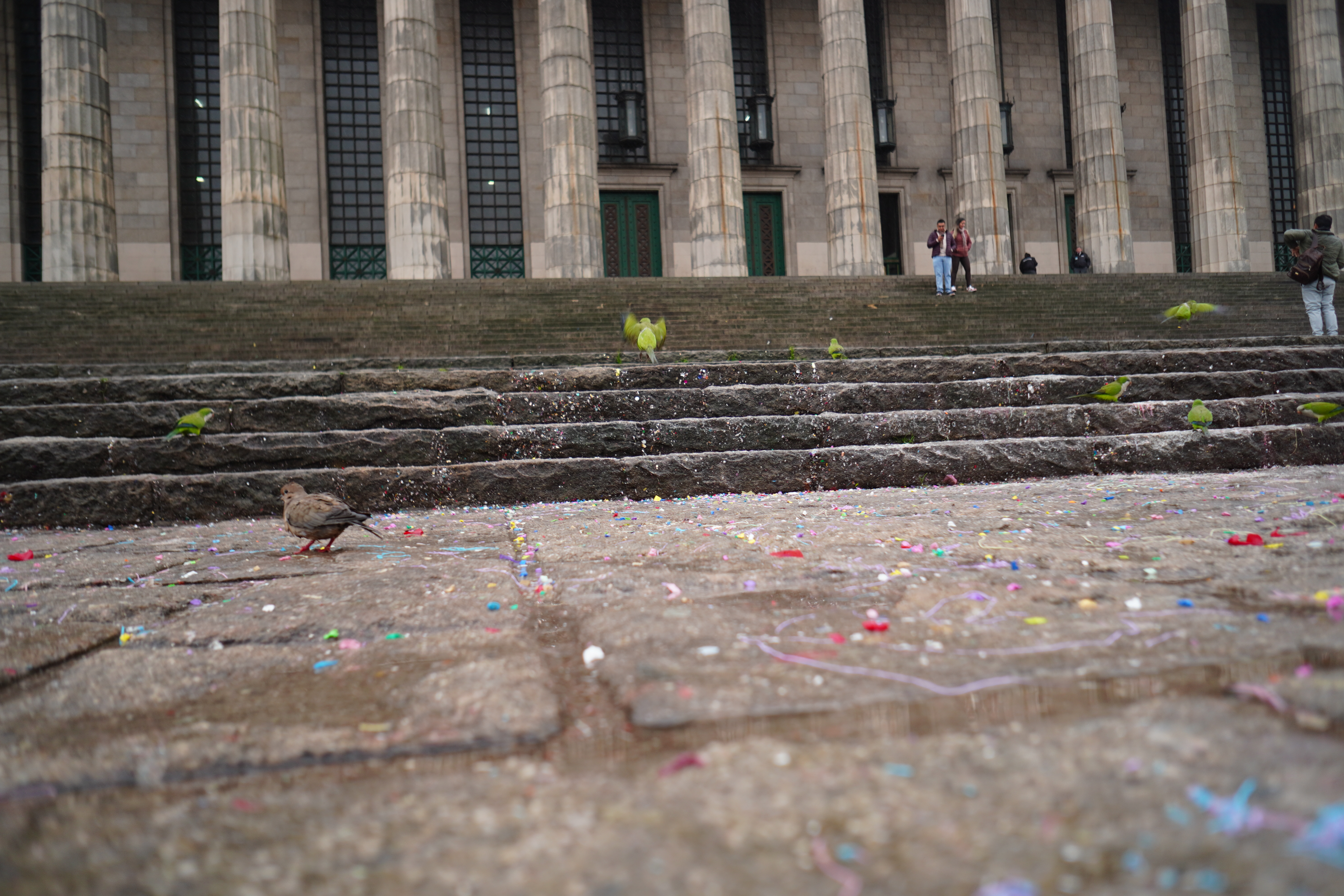In the streets, you can hear many birds. The pigeons coo in an Argentine way, different from those in Germany. There are tiny little pigeons and regular-sized ones. You mostly hear starlings and blackbird-like birds with orange bellies. Small green parrots (monk parakeets) have also settled in the city, possibly due to the Ecoparque.