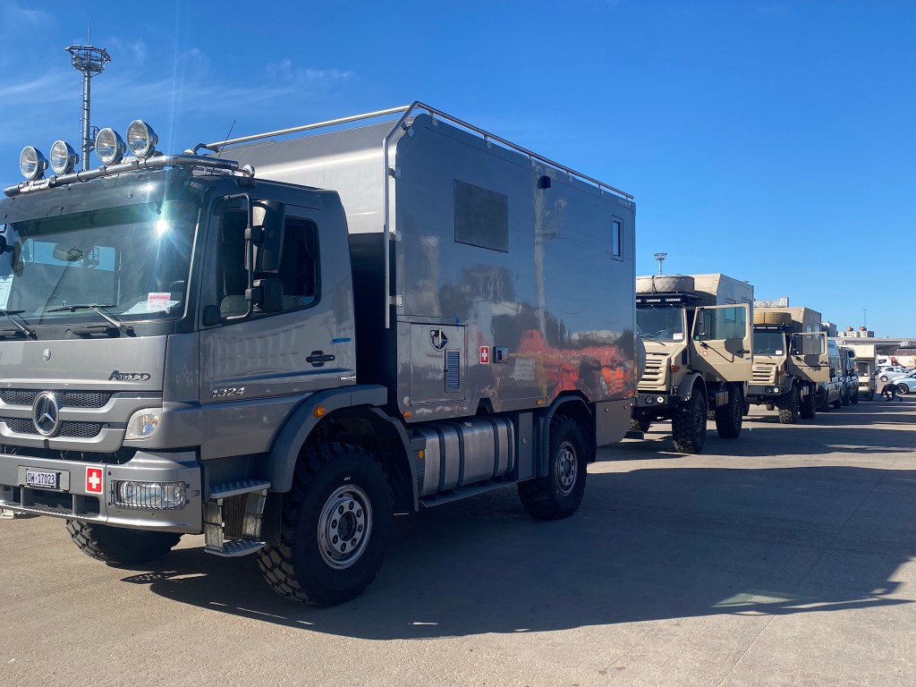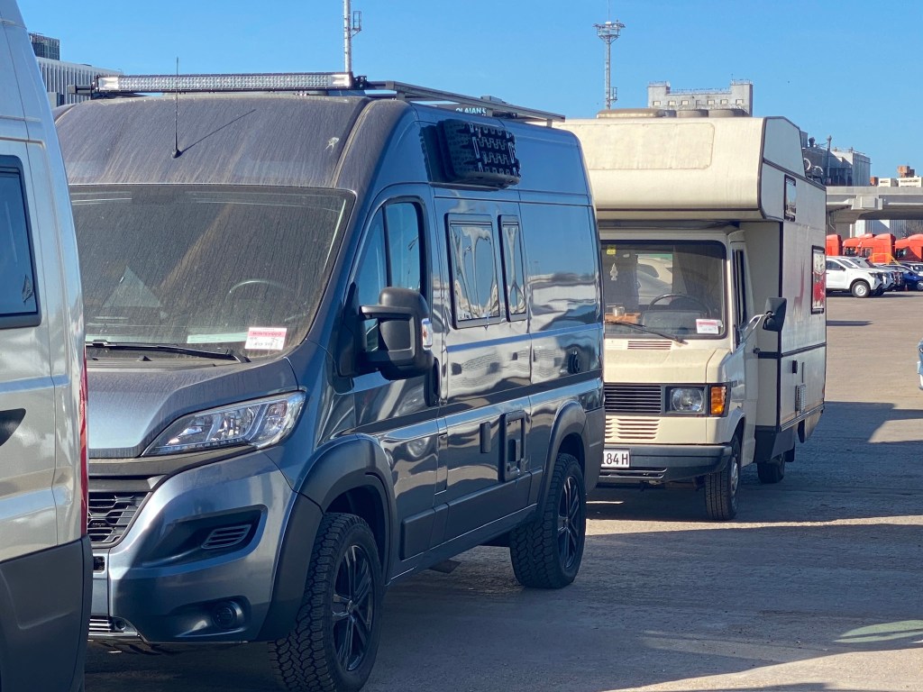 Next step was to go inside. Therefore, I tried the doors. All of them were closed. „Weird, closed doors and the keys shall be insight“, I thought and opened the van with a spare key. I looked inside and could not see any key, while I already heard the question from the others: „Did you find your keys?“, so I turned around and we asked Eduardo. He told us, that he was wrong and we would get the keys soon… Back to the inside of the van: Also, here we heard so many stories about stolen stuff. We had all our valuables with us, but there was still sooo much items with a sentimental value for us inside Rosi. The first thing I saw was an open cabinet door, but it seemed to be full. The surfboard and the bicycle were still on the bed and than I check every cabinet door and compared it with the pictures I had made when I had dropped of the van. Every single drawer looked exactly the same! I opened the back door and checked the garage under the bed. Same here! Nothing was gone! Everything was there! I cannot describe the feeling I had at that second. I felt so relieved that I had to fight my tears. I quickly wrote to Linda:  „I’m am with Rosi“ „Everything tiptop“ „Everything here“ „Not a single scratch“. Than I looked again in all the cabinets. I was so hyped. Turning around I looked to the others and could only see smiling faces. Every vehicle was without a scratch and nothing was stolen. We were all so happy. Than we got our keys and signed that the vehicles were ok and than slowly drove out of the parking lot, which was not so easy because the cars are all parked very very close to each other. We parked all the vans in a long line (funnily sorted by size): The Ateco in front of(a huge truck), two very similar Unimogs, a 6m Fiat Ducato, Rosi and a pretty old Mercedes camper. Like this we drove over the harbour back to the customs building were the others waited. During this short drive next to the cranes lifting containers, I realised that all was fine and yelled out multiple times „Yess, Yess, F*** Yess“ I was soooo happy.