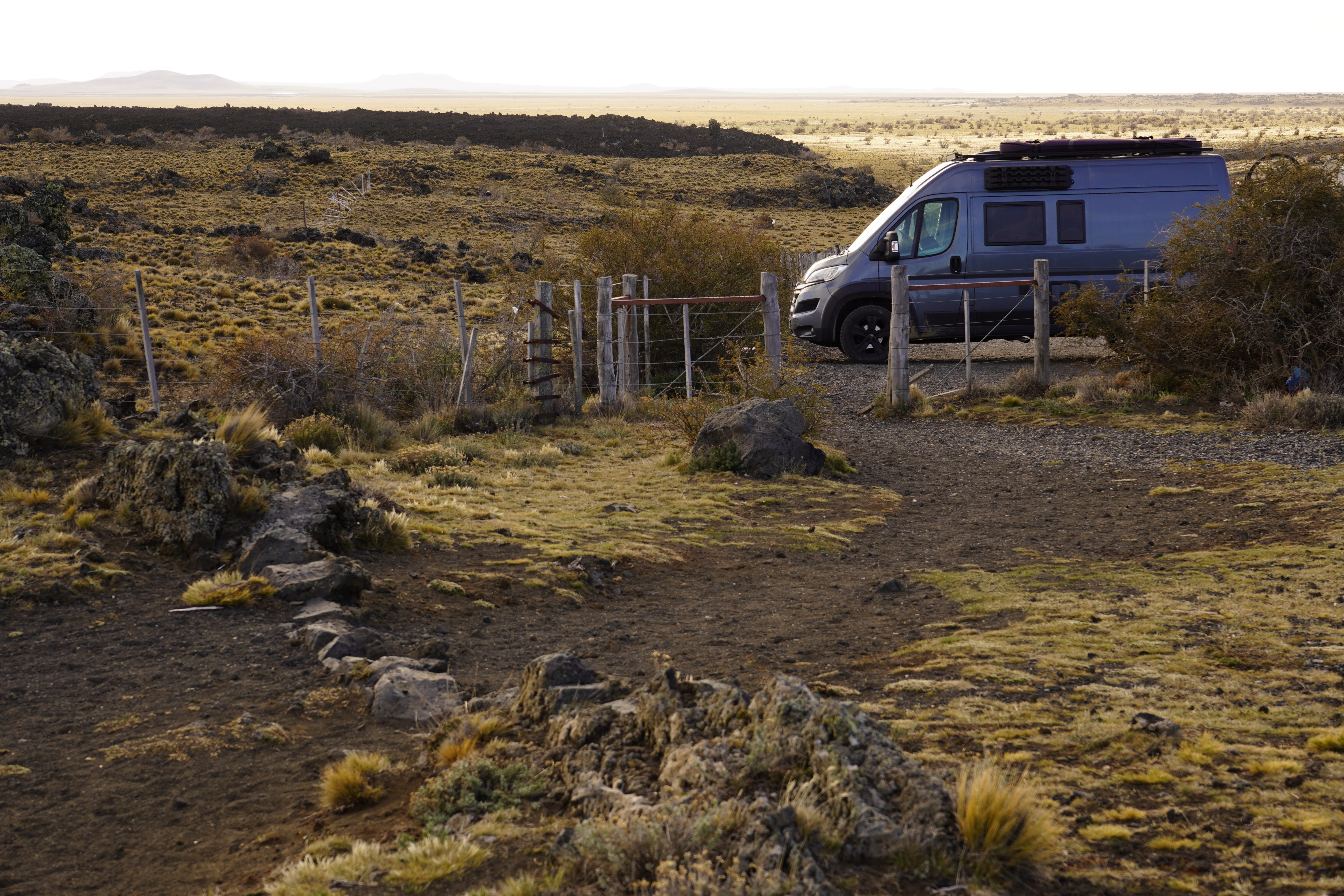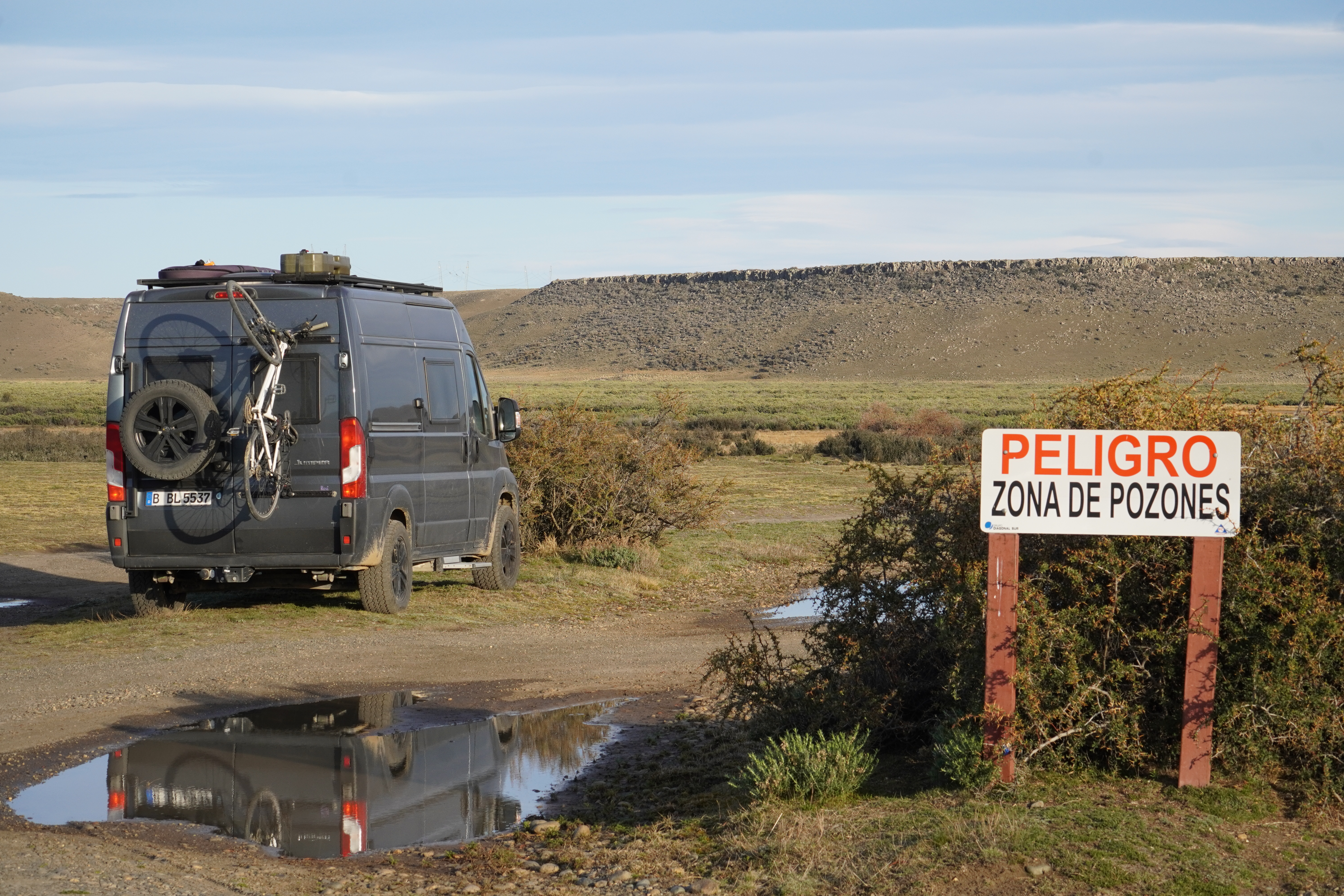 On Tierra del Fuegö, the weather changed dramatically, and the blue sky turned gray. At the second border crossing, after 4 hours in Chile, it was time to re-enter Argentina. We crossed the border quickly in San Sebastián. We moved on to Rio Grande, went through a somewhat unfriendly police checkpoint (they inspected Rosi’s tires and spoke something unintelligible in Spanish), took a long hot shower at a gas station, made a sort of tortilla with the potatoes for dinner, and slept there in the parking lot. The next morning, it was 3°C in the van. Welcome to Tierra del Fuego.