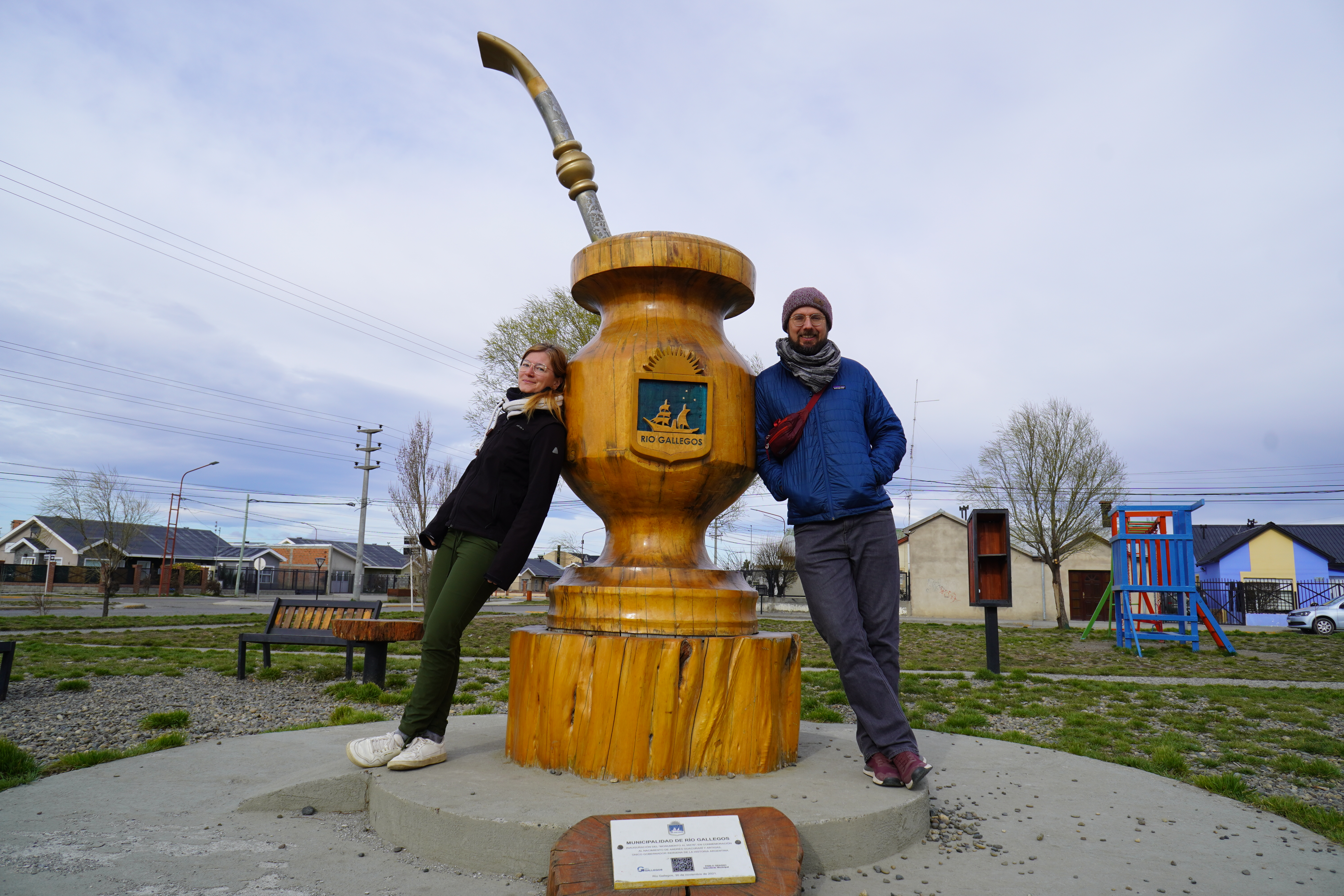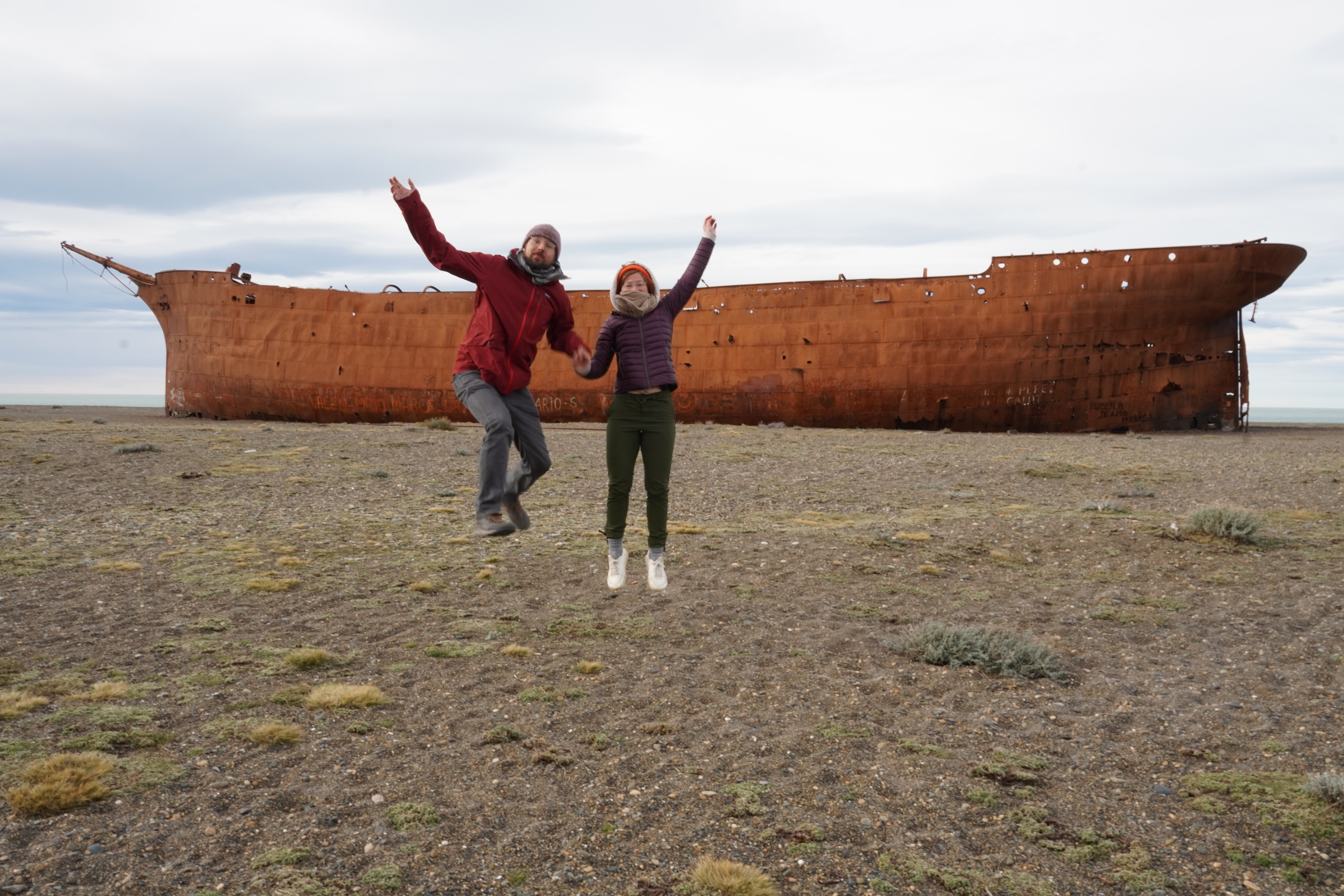 We stopped at a riverside in Aike Guer for the night, completely isolated. Magellanic geese were everywhere, always in pairs. The male is white, and the female is brown. She usually pecks at the ground while he chatters and keeps watch. We did some small vän upgrades (attached strips and stuck things on) and enjoyed a warming potato soup – we needed to use up the huge sacks of potatoes and carrots. Even though the sun was shining, it was windy, and the cold quickly came into Rosi. The next morning, we visited the city of Rio Gallegos. We parked Rosi in a monitored parking lot and spent the morning in the city. It was nice to be among people again. We bought a local gin, bamboo toothbrushes, wandered around, and finally found good coffee after weeks in Argentina. The coffee so far had been drinkable but not enjoyable. In Argentine supermarkets, ground coffee always has added sugar. Why? We first noticed this in Uruguay. But on the road, there aren’t many options. At Artylatte Café, we spoke with the owner, Kevin, who knew some German from having lived in Hamburg. He beamed with excitement. I wanted to speak Spanish, he wanted to practice German, and English slipped in between. We had a funny conversation with the barista in three languages. We bought super expensive Colombian coffee, which they freshly ground for us, and we also grabbed a double espresso to go. We left the city and drove out to the Atlantic coast to see the Marjory Glen shipwreck.