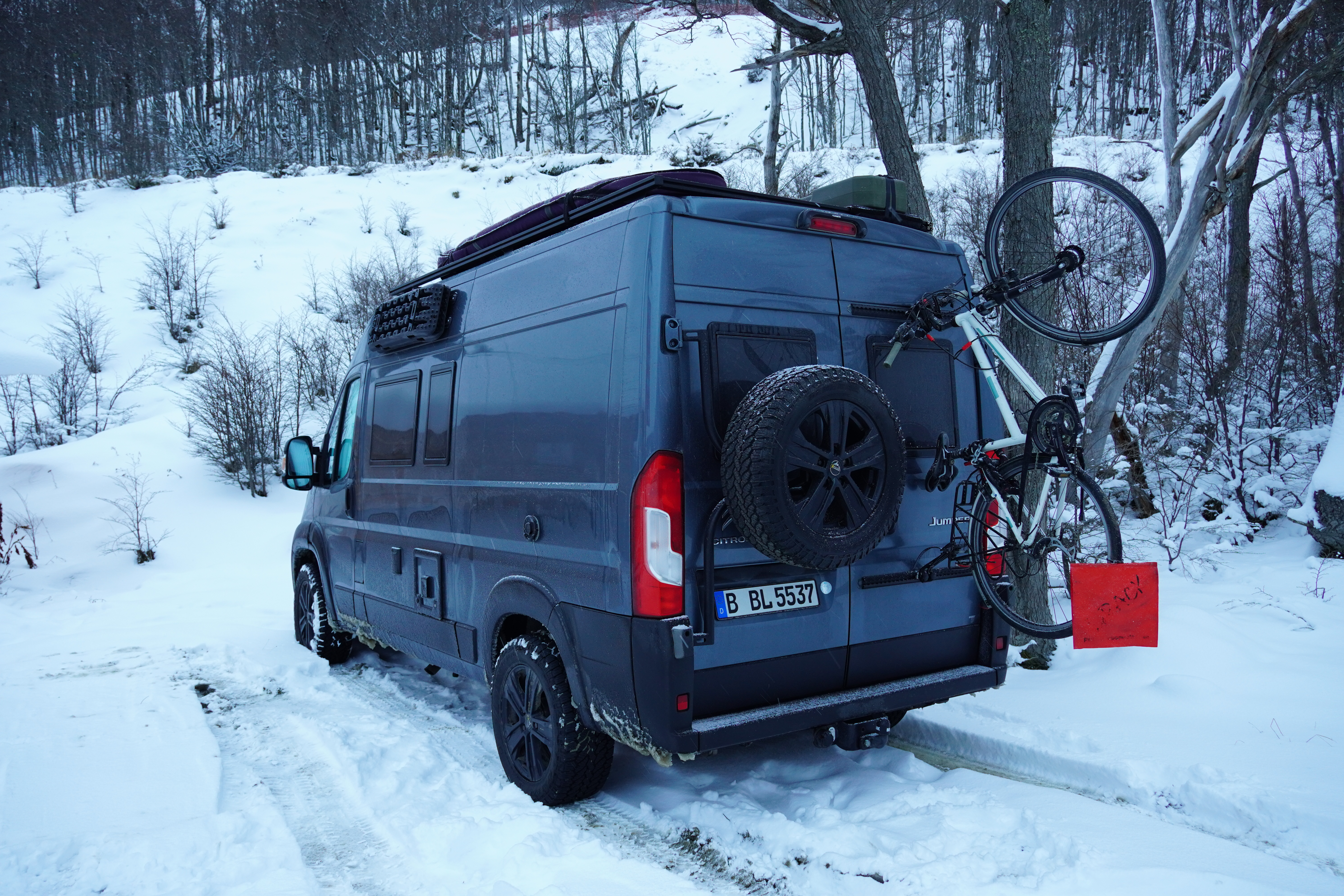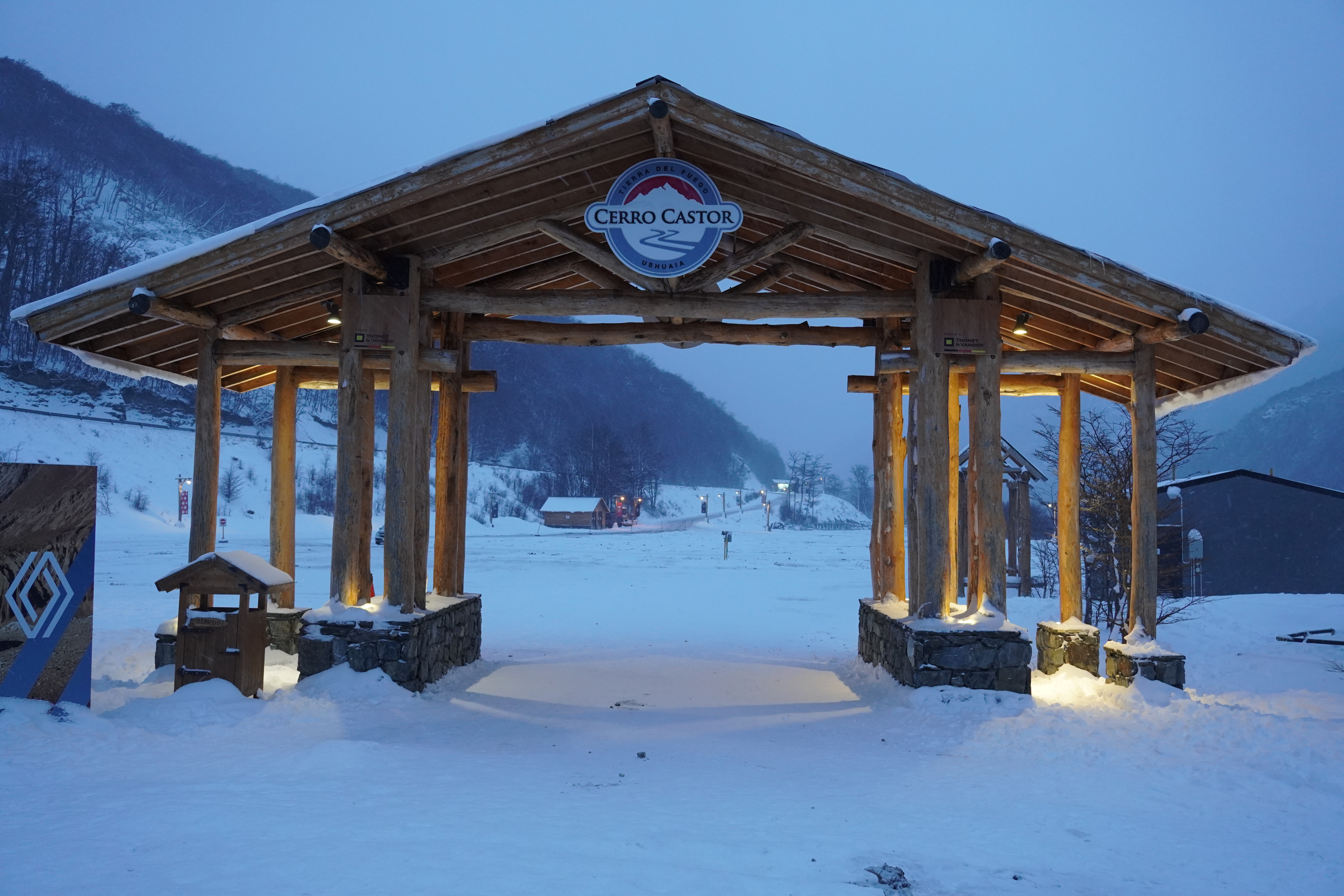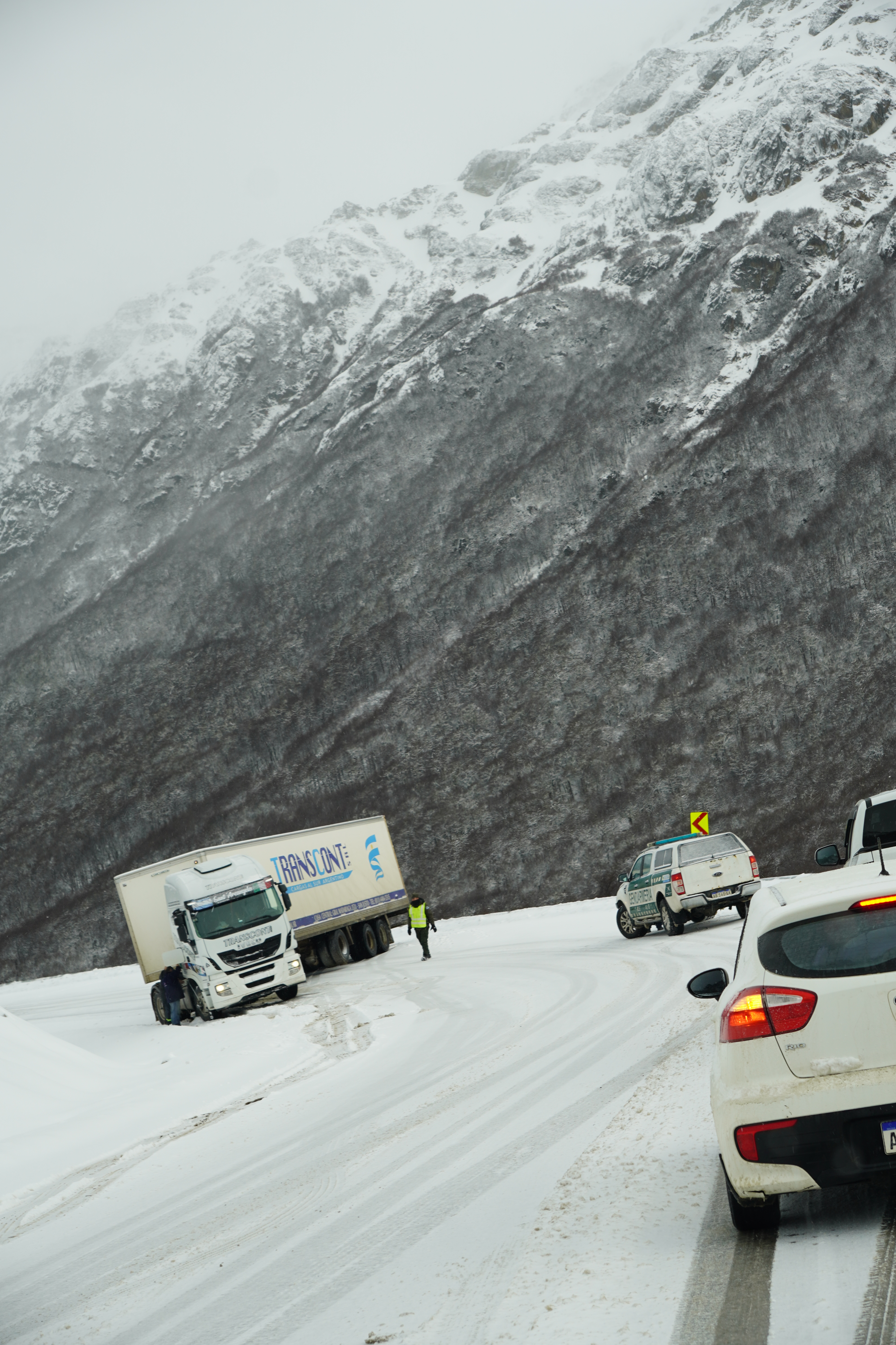 We passed through several police checkpoints, where they always inspected Rosi’s tires. We learned that snow chains were only mandatory for trucks, so with the snowflake on the off-road tires and the fact that we had 4×4, they let us continue. It started snowing slowly, and Google Maps suddenly showed traffic. Strange, considering the road was empty. The last warning for trucks: last chance to put on snow chains. The Garibaldi Pass at 450 m above sea level was ahead of us. For comparison, Üshuaia lies between 0-30 m above sea level. I drove through increasingly thick snow up the pass until, suddenly, everything came to a halt. A truck was standing across both lanes and hadn’t put on snow chains. The police were there, and the truck driver was trying to put on the chains but to no avail. However, he managed to clear one lane for traffic. So, we squeezed past the stranded truck and some others on the Ruta 3 and arrived a little late, around 7 p.m., at the ski lift in the beautiful crunching new snow at dusk. We asked if we could stay the night, and there was no problem. The parking lot was empty, and there wasn’t anything going on. No aprés ski. We were the only ones there. It was beautiful, and we were excited to gö skiing.