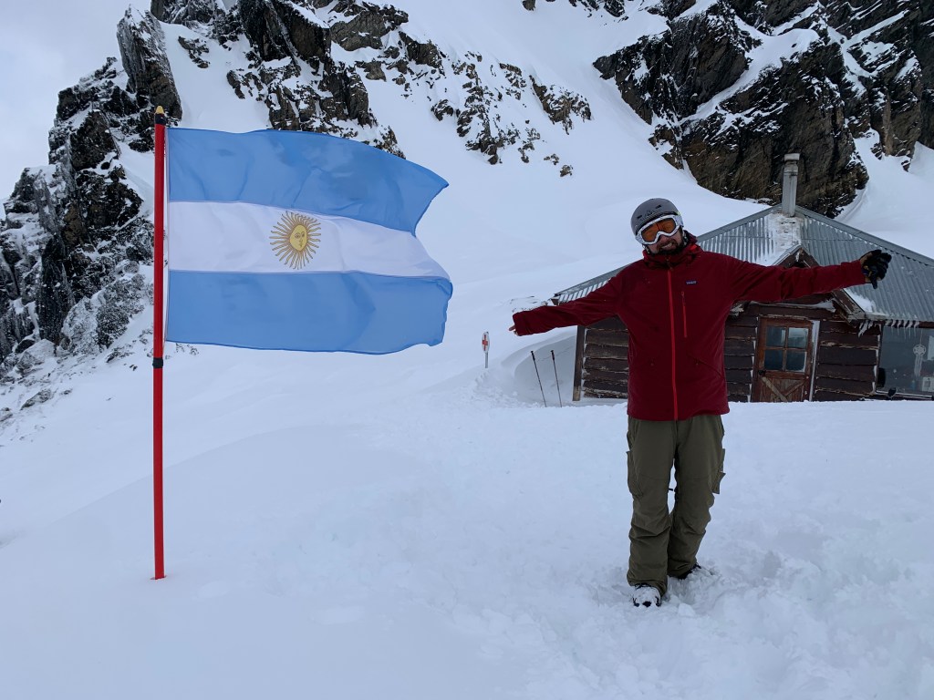 As good ski bums we slept at the lift. The next morning the alarm rang at 7:00 so we could be at time at the rental station and in the lift. After moving Rosi to the first spot in line we prepared in the van. Linda put in her contact lenses, while I was on our little toilet for No2. AT EXACTLY THAT MOMENT a guy came to the van to ask us… something. I was sitting on the toilet while Linda was half blind with only one contact lens in her eyes trying to open the frozen door and understand what the friendly guard was rapid firing in Spanish. After whiping pretty fast, I came from the toilet and tried to solve the situation, but I did not wash my hand and therefore refused the friendly indicated handshake from the guy and offered him a fist bump through the opened window. After a short chat it was clear, that Rosi was too long with the bicycle and we had to re-park to the side of the big car park, then (of course I washed my hands first) we made a coffee and got all geared up for a proper ski day. We had our ski trousers and goggles with us and warm underwear was packed anyway. Linda got my warm ski hoodie (and looked like a professional ski girl) and I wore my winter jacket. The rental process was pretty fast and after we got our -for rental gear normal- uncomfortable boots and ski and snowboard we went directly to the lift line and … waited. The lift opened at 9:45…. That is soo much later that in the alps, but whatever. Whether was good and anticipation was high. So we got in the lift, greeted the lift boy and… WHACK… got hit by the old chairlift in our calves. „Ok, this is going to be different“, we thought. No heated chair lifts and no slower lift while sitting down. I got instantly reminded of Japan, but at least the seats here were cushioned and we did not have to lift on wood bench lifts (@Chabo I still loved it with you in Japan :-*). So up it went, and we were both totally stoked. Everything was white and we were going to ski….in a winter wonderland….Next to us in the lift was a young Argentinan guy who instantly asked us in almost perfect english were we were from and than started to talk…non-stop… It was a surreal moment. Linda and me were both stunned by the fact that we were going to ski in almost perfect conditions in the most southern ski resort of the world and at the same time this young dude told us how much he liked to study in Denmark and that he really enjoyed the KitKat club in Berlin and how crazy it was to travel to Antarctica and and and….Somehow I tried to interrupt him to just shut up, somehow he just wanted to be nice and somehow we could not handle this moment… At the top he said a friendly goodbye and relieved us. We lifted one more to the top and than it started…The snow was fresh, it was grippy and next to the slopes there were about 10 cm of fresh snow. It is hard to put the feeling it words, if you don’t enjoy skiing or snowboarding, but at the end of the first slope, I could just smile…