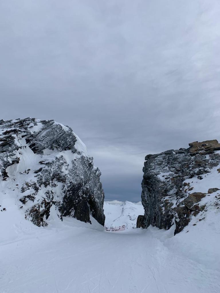 We took another lift to the top and turned left, to pass through the typical „gate“ of this resort: Two huge stones with the slope passing through as if you pass this huge gate into a view of the mountains around. It was beautiful. We said to each other multiple times how crazy it is to be here and have a „normal“ ski day, just as we have it in the alps.