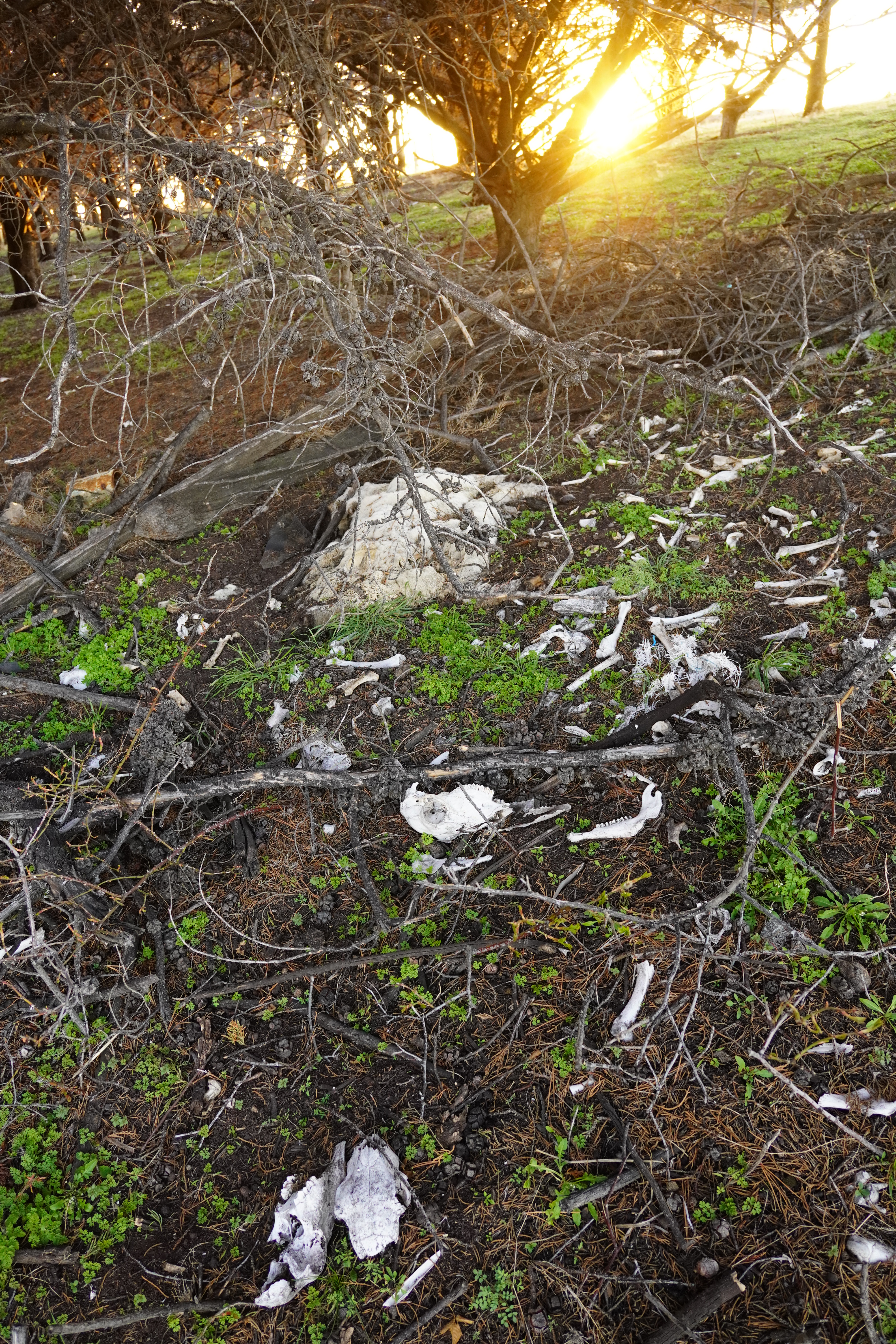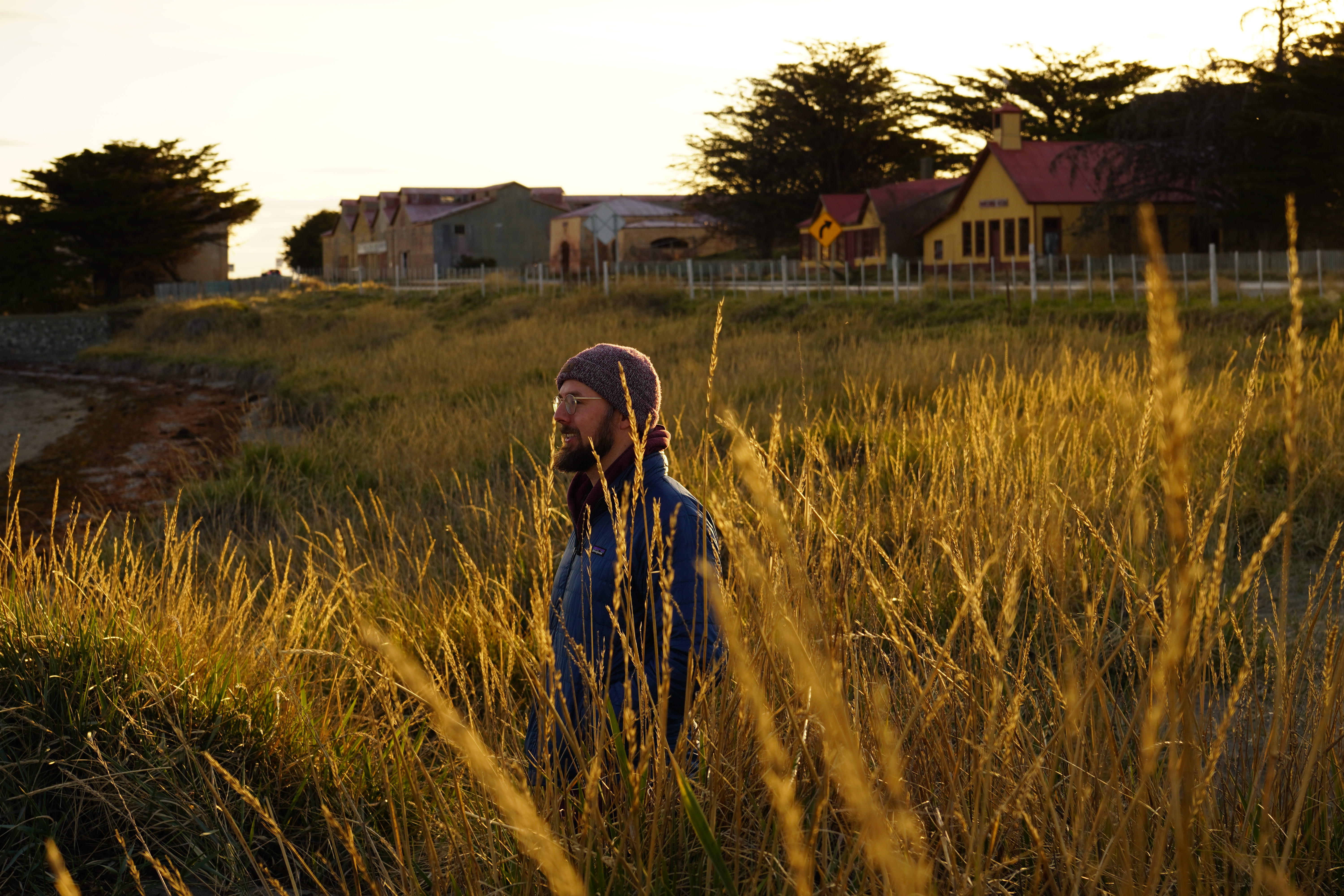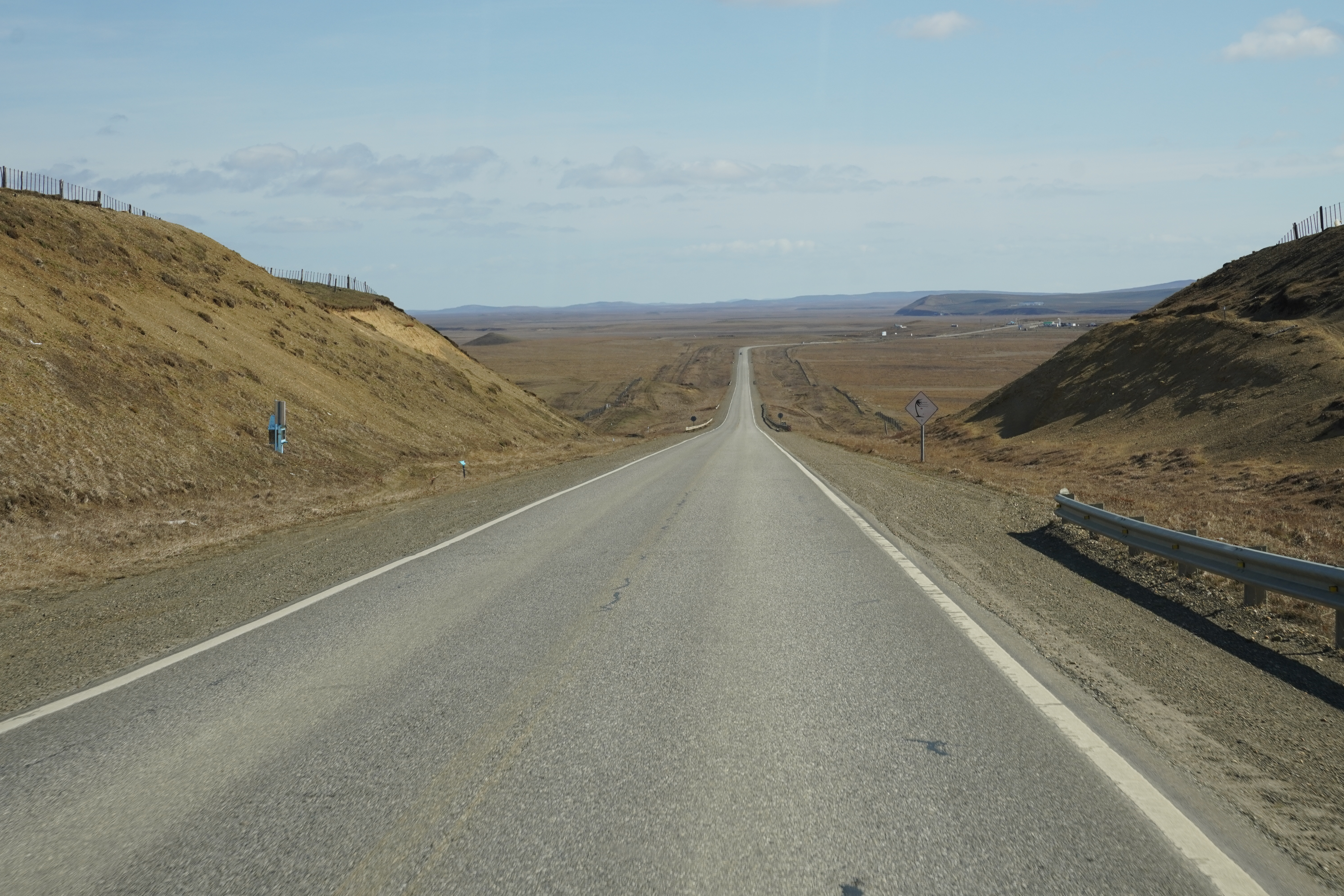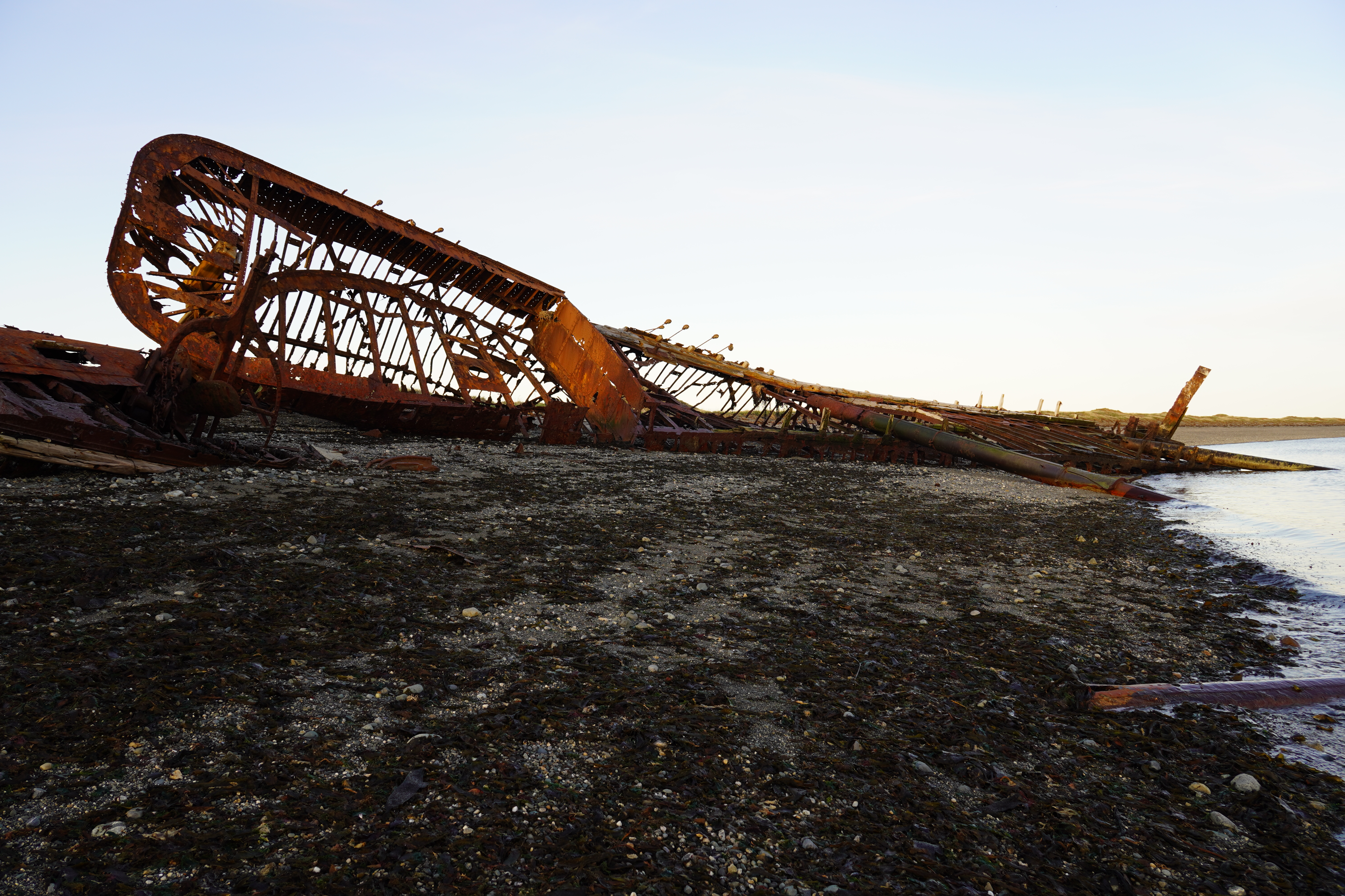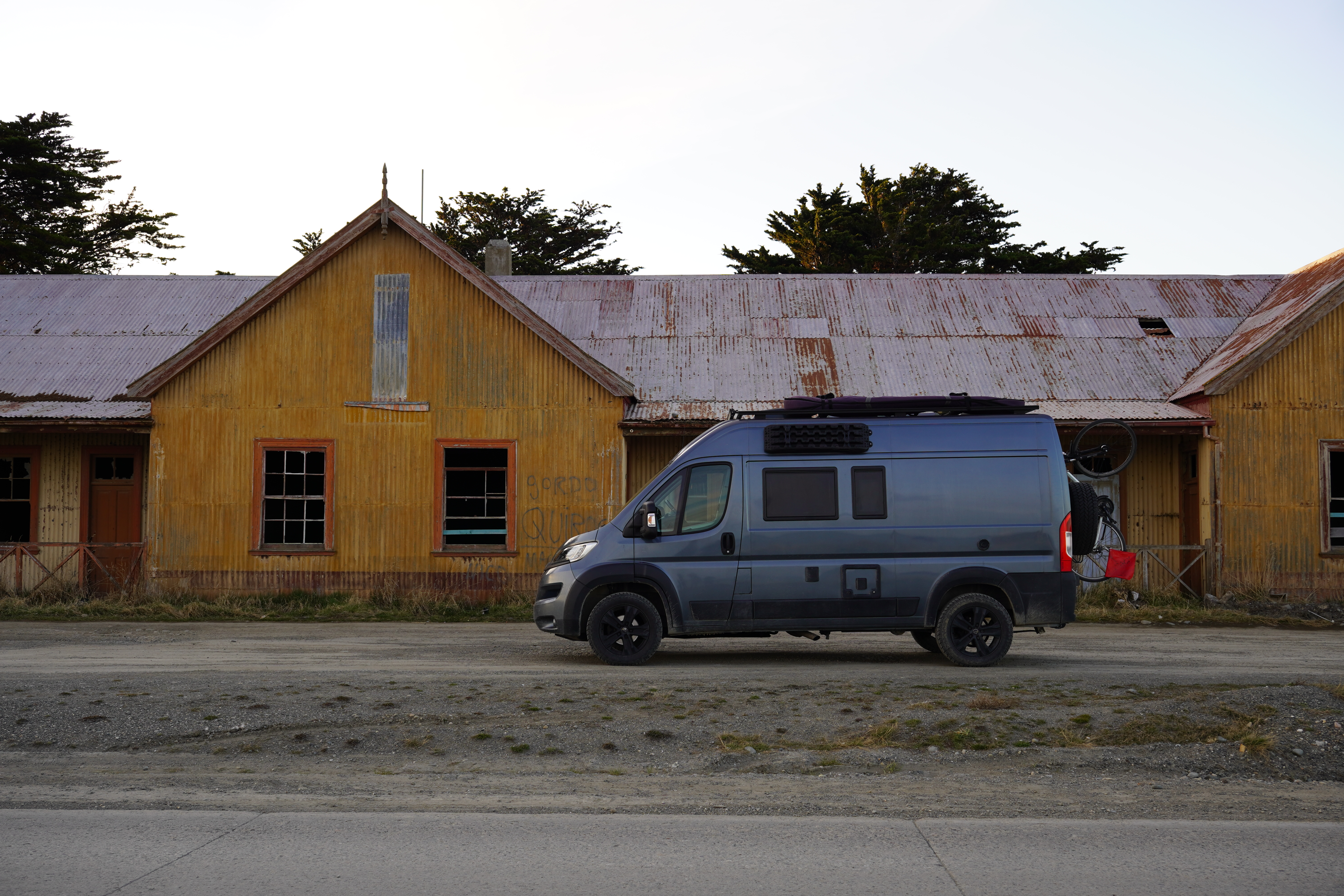 As it was already evening, it was time to find a place to spend the night. We didn’t feel like staying on the other side of the ferry terminal next to the waiting cars and trucks (many of them leave their engines running for heating). So, we continued driving but not north; instead, we turned west onto Ruta 255. We stopped at sunset by two old shipwrecks and a ghost town called Cabo Raso. Cabo Raso was abandoned in the mid-20th century after its fishing industry and port operations declined, leaving behind crumbling buildings and a sense of desolation. The shipwrecks of Steamboat Amadeo and Barge Ambassador, rusting near the shore. The rusty shipwrecks looked fascinating once again. We considered staying here for the night, but after exploring the area a bit, we didn’t want to stay in the ghost town. One house was full of sheep skins, with bones and sheep carcasses lying everywhere. A horse leg was lying in a pasture with a horse. I wanted to leave. So, we continued driving at dusk, spotted a skunk in the distance, and stopped at the next gas station, consisting of a container. The gas station attendant was very friendly and told us where we could park; he himself was spending the night in the container next to the gas station. Since we were in Chile and had no SIM cards, and therefore no internet, we were happy to have found something for the night. It was a long day of driving, and we were tired. Happy first night in Chile.