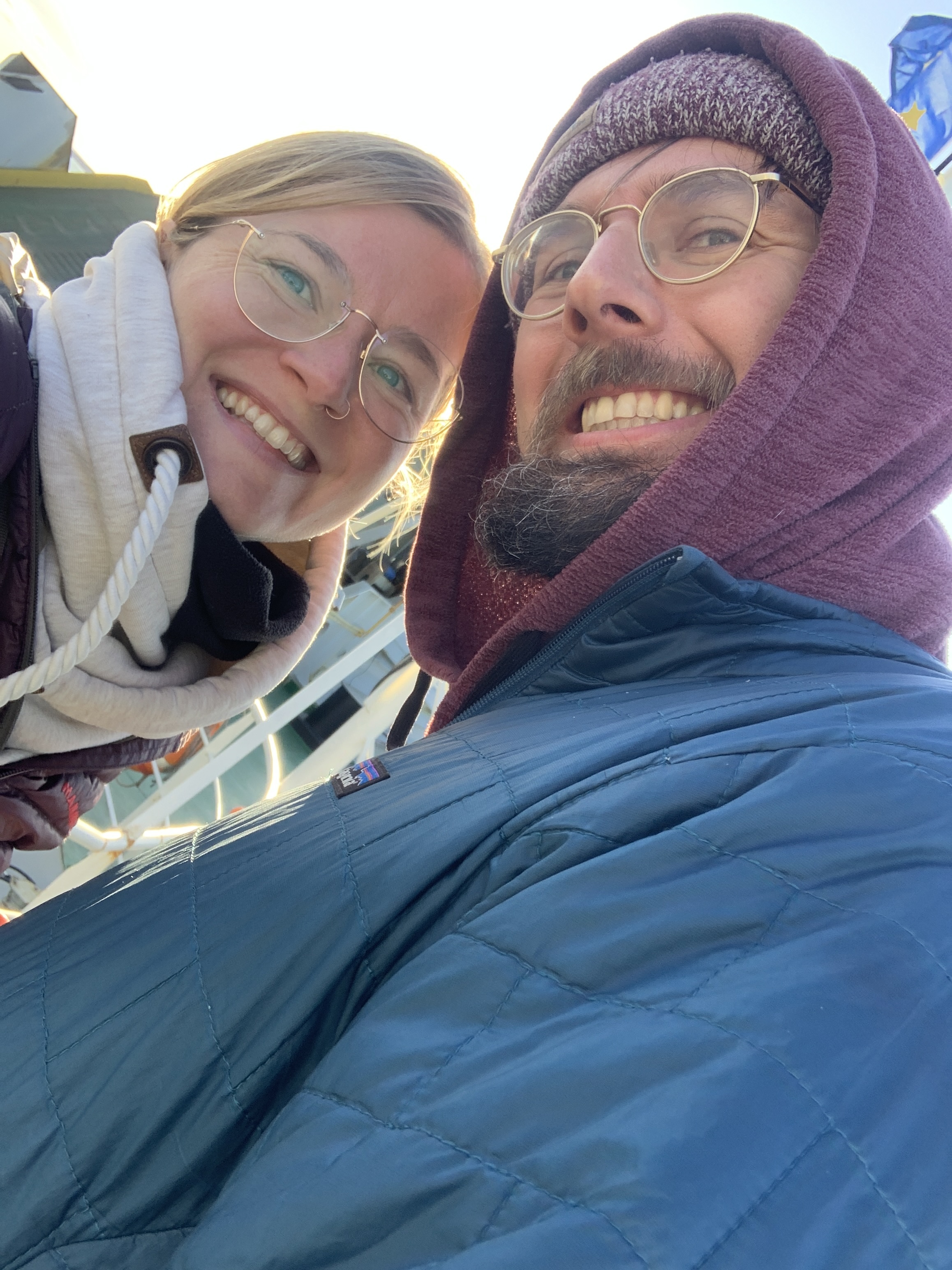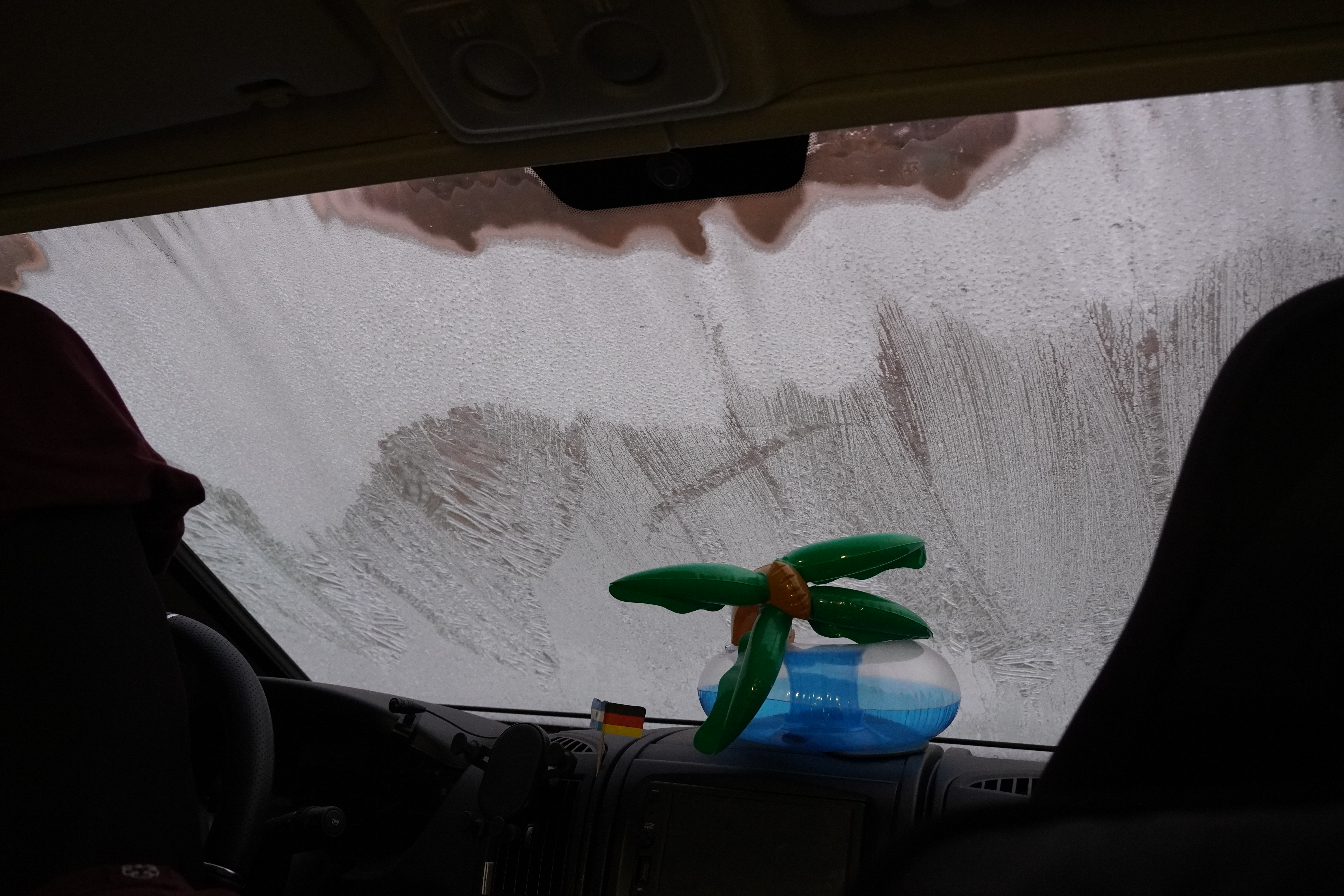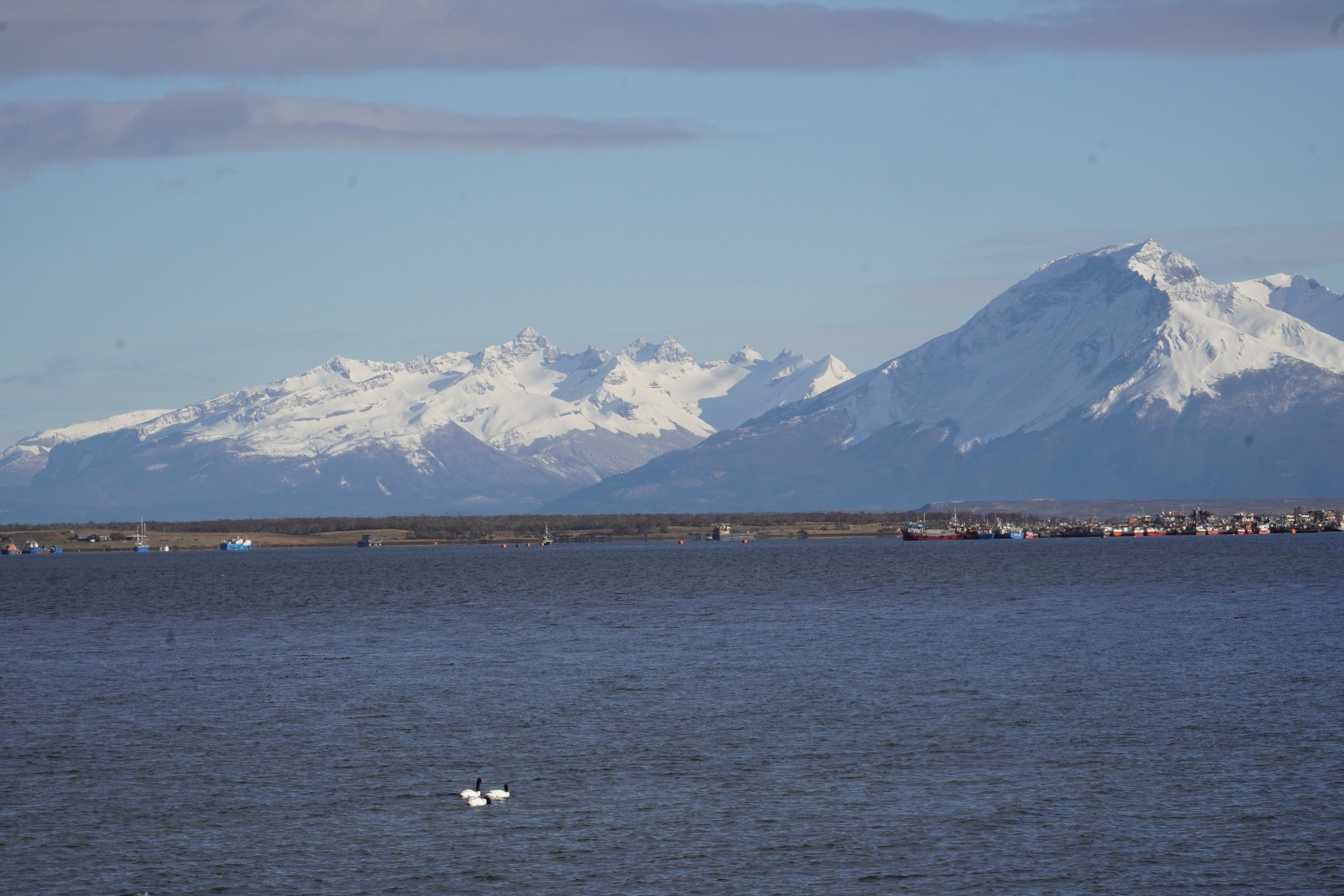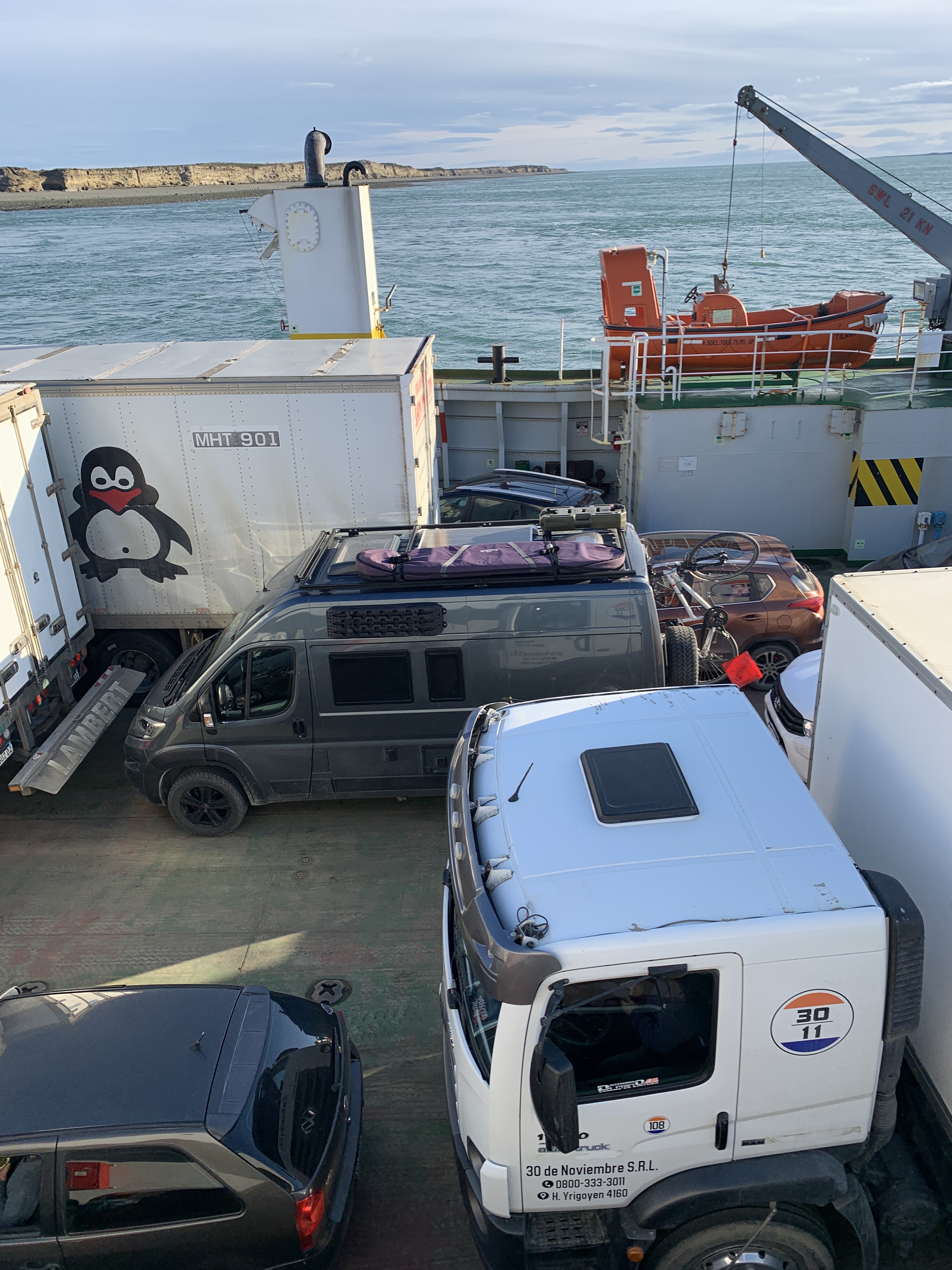 After we left Tolhuin with hot water and the prepared Mate, we reached Rio Grande after about 1.5 hours. We passed through the place and continued driving; nothing spectacular happened – no police control, no refueling – except that we broke the 5000 km mark. Under a bright blue sky and strong wind, we reached the border crossing to Chile. Everything went smoothly and very quickly. Surprisingly, there were many trucks there today. However, today there was only one border crossing, as we would stay in Chile for the next days. We continued driving north. The same windy and curvy roads, the same as on the way to Ushuaia. The trick to avoid getting bored while driving: we switched drivers during the stages so that no one drove the same section twice. Then a small stone chip on the windshield from a truck ahead of us marked the first of the trip. It probably won’t be the last. In the morning, we had set ourselves the goal of driving to the ferry terminal to cross the Magellan Strait and staying there overnight to catch the Wi-Fi, to take the first ferry early the next morning. When we got there, we had PBJ baguette and no Wi-Fi. It was very windy, and we spontaneously decided to take the ferry after all. Since there was space for two more cars and us on the ferry, the decision was made for us. Björn rolled off with Rosi while I held onto the peanut butter and jam jars and buckled up on the backseat. This way, we were able to drive past the several hundred-meter-long line of trucks and high-fived. The ferry ride was completely different from the way there: the sea was very calm, with hardly any waves. We could stand on deck and enjoy the sun. The ride was also twice as fast, probably due to the strong winds.