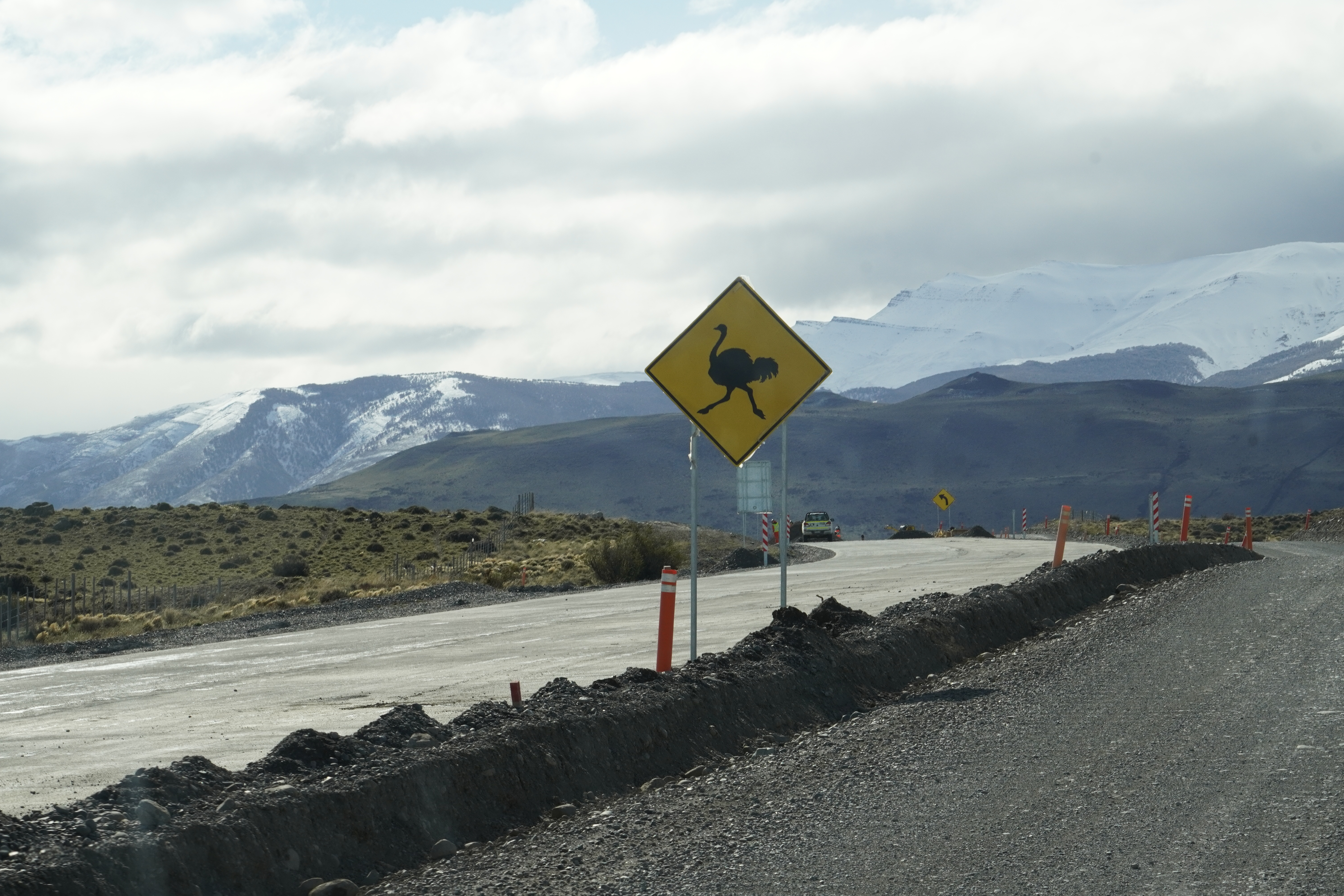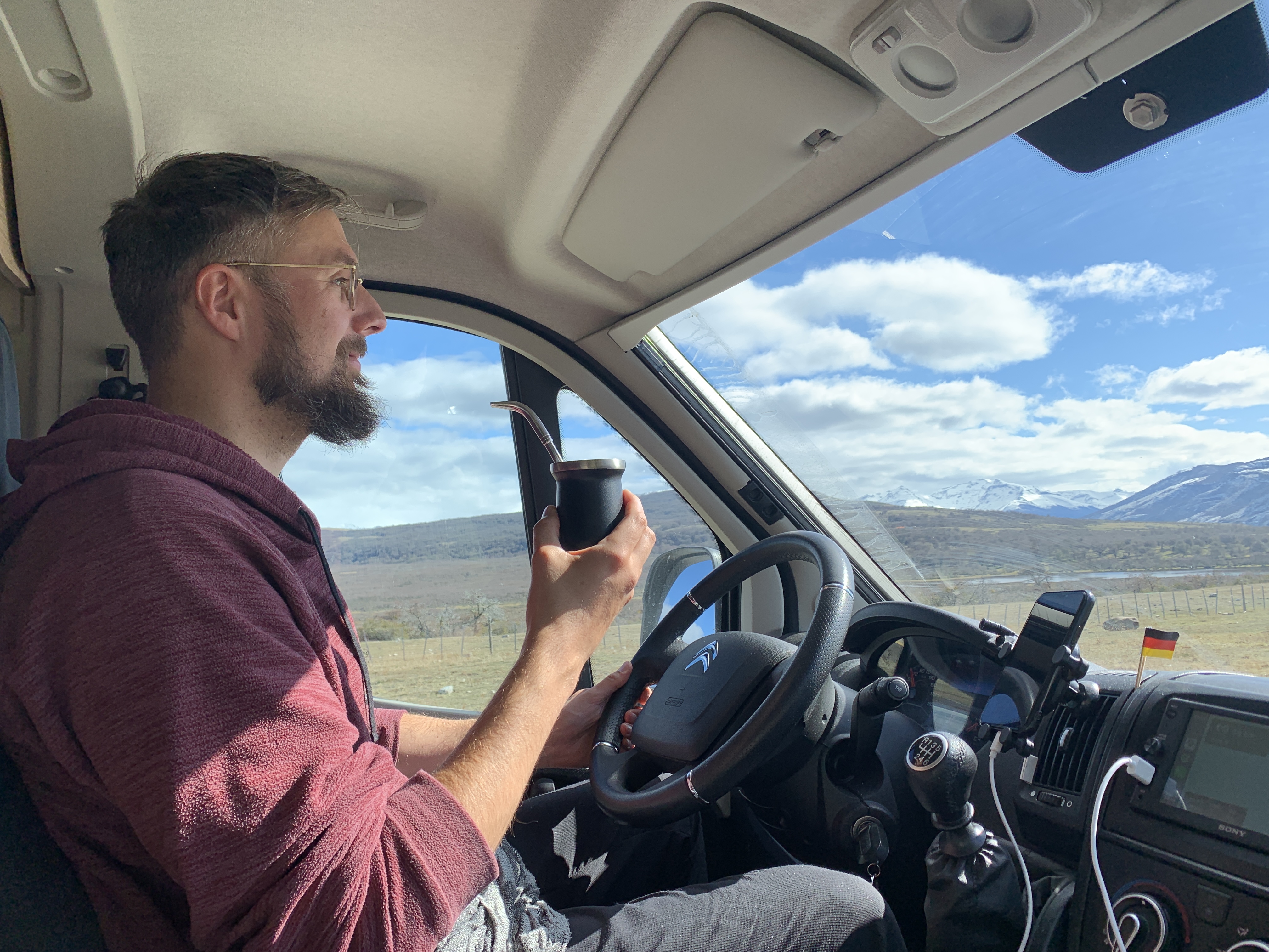 Many of the shops were also closed the next day. Probably because it was the Friday after the holidays. We bought fruits and vegetables, coffee, tried mate, stood in front of the closed tourist information, and finally found stores where we could get 2 pairs of spikes (silicone covers) and an alibi trekking pole for me for about 15€. I wouldn’t use it, but otherwise, I wouldn’t be allowed to go hiking. Björn uses his anyway. With a mate in hand, we drove north on Ruta 9, towards Torres del Paine National Park. The closer we got, the more we could see the snow-capped mountain range Cordillera del Paine rising more prominently in the landscape. We couldn’t get enough of the scenery.
