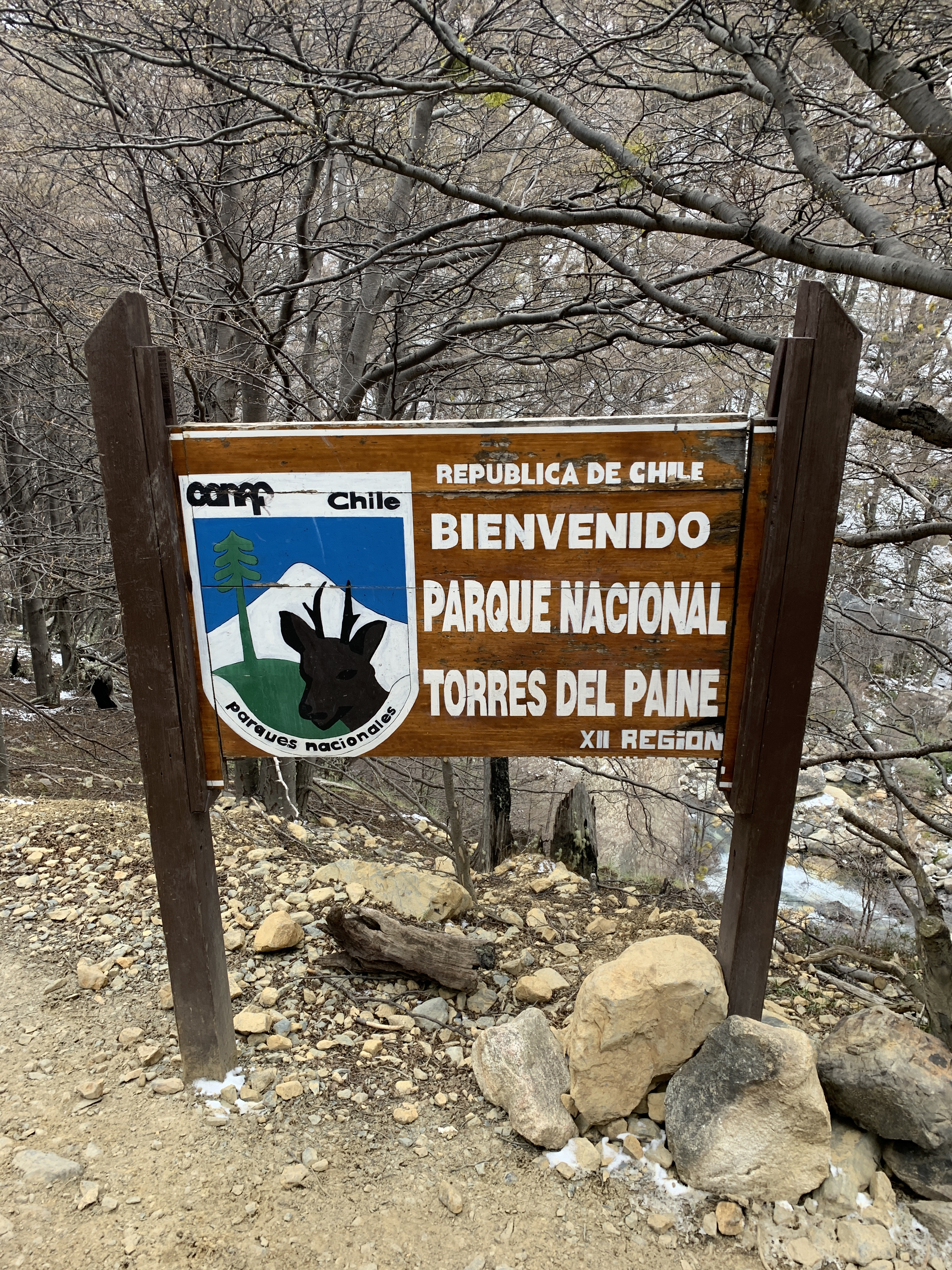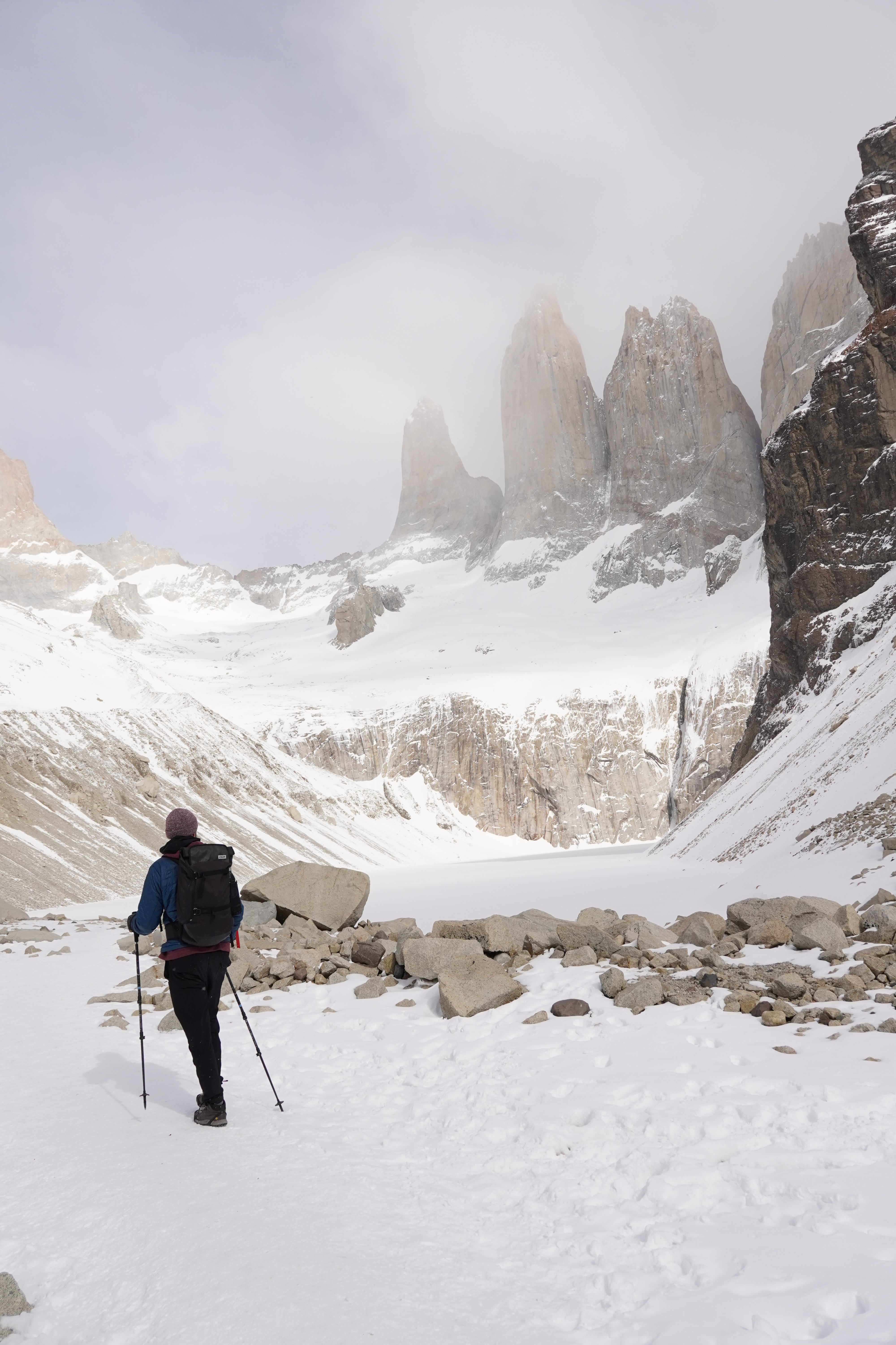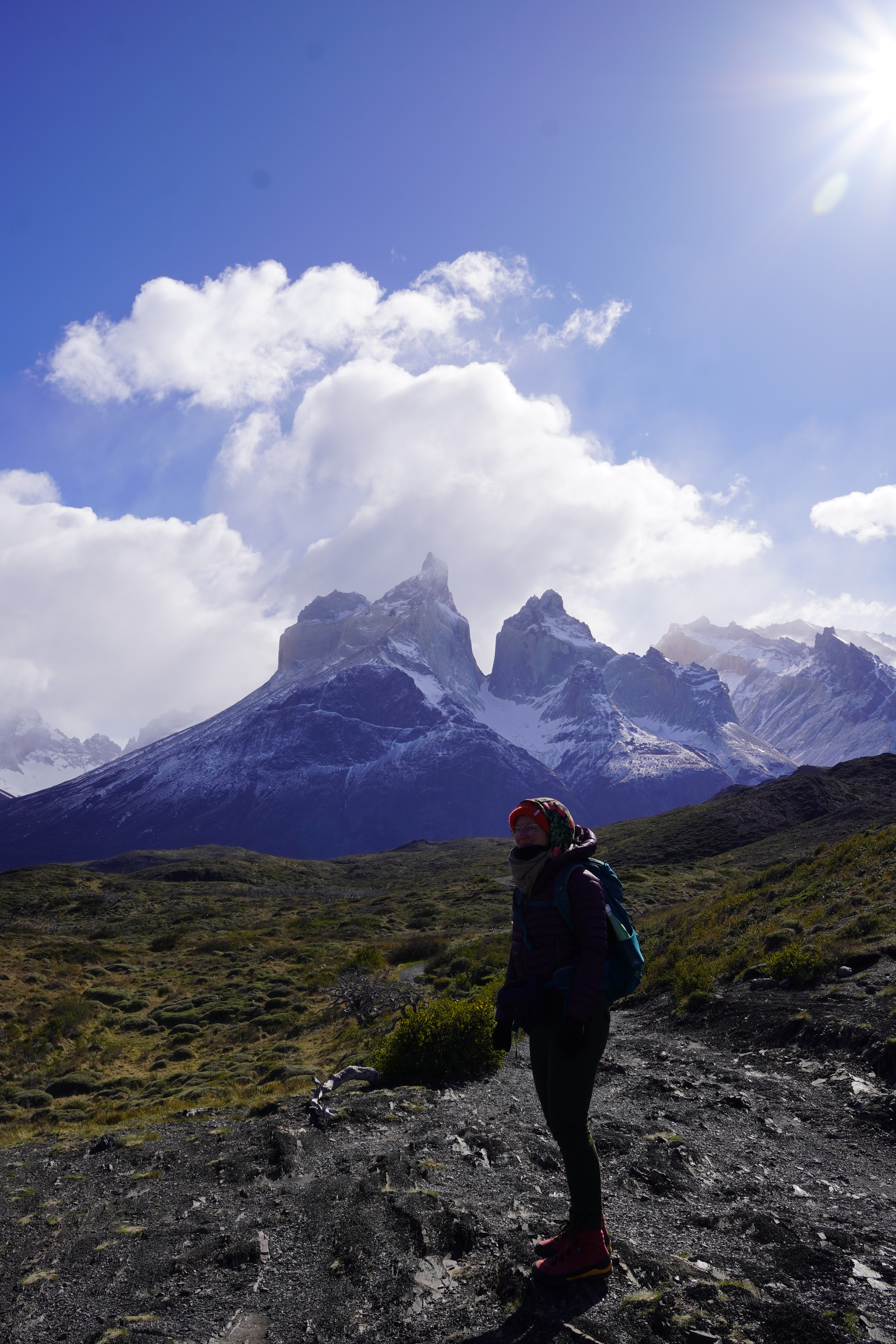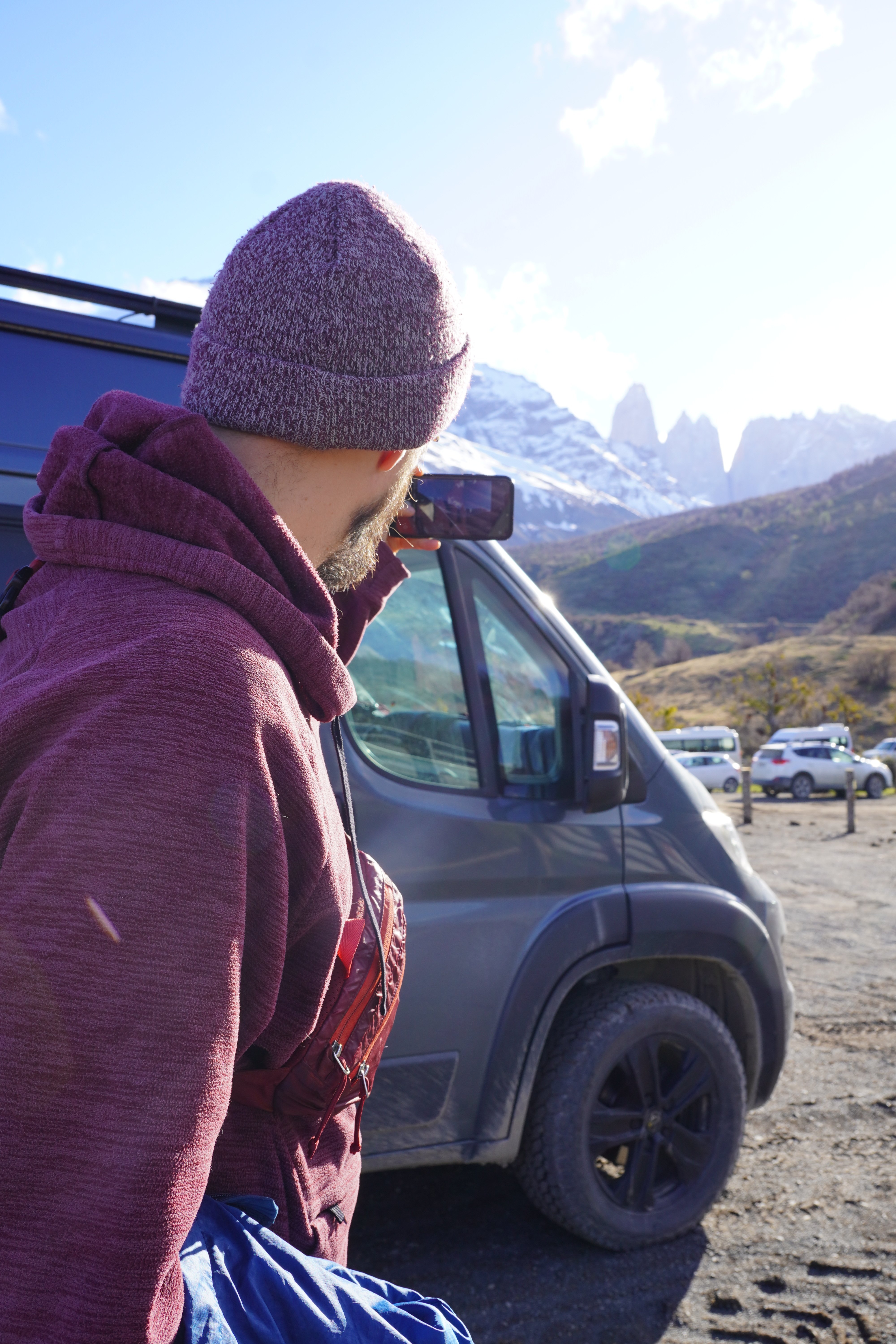 The night was probably the coldest so far, and everything around us was frozen in the morning. Around 8 a.m., we set off, warmly bundled up in sub-zero temperatures. Before us lay a good 8 hours with 20.4 km of distance and 880m of elevation gain and loss. After 20 minutes of warming up, the ascent began. The hiking trail had turned into a riverbed, completely frozen. You had to be very careful not to slip. We warmed up, and the cold temperatures were no problem at all. About 1.5 hours before the endpoint, someone from the national park came towards us and checked our equipment. She wanted to see our crampones (spikes), which we dug out of our backpack and without which we would not have been allowed to proceed. We would need them half an hour later. The last hour before the highest point, it was very steep and icy, and some sections consisted of steep snow-covered paths on the slope. When we finally arrived around noon, we were rewarded with a breathtaking view of the Torres and the frozen lake, as well as an icy strong wind. We drank warm tea, ate some bread, and took a few photos before we set off on the 4-hour descent. You couldn’t stay up there much longer because it was simply too cold. (Thank you Björn, for the USB hand warmers last Christmas that can also serve as a power bank). On the way back, you still had to be careful, as sections of the path were either frozen or muddy. Additionally, we encountered many hikers coming up the same path, which made the descent more difficult. We – and our knees – were very, very glad when we were back at Rosi in the early evening and had warm pumpkin-potato-coconut soup (prepared the day before). Unfortunately, the nice feeling of a warm shower was missing, but we made ourselves cozy and warm in the van, massaged ourselves with the Terragun, and stayed another night there.