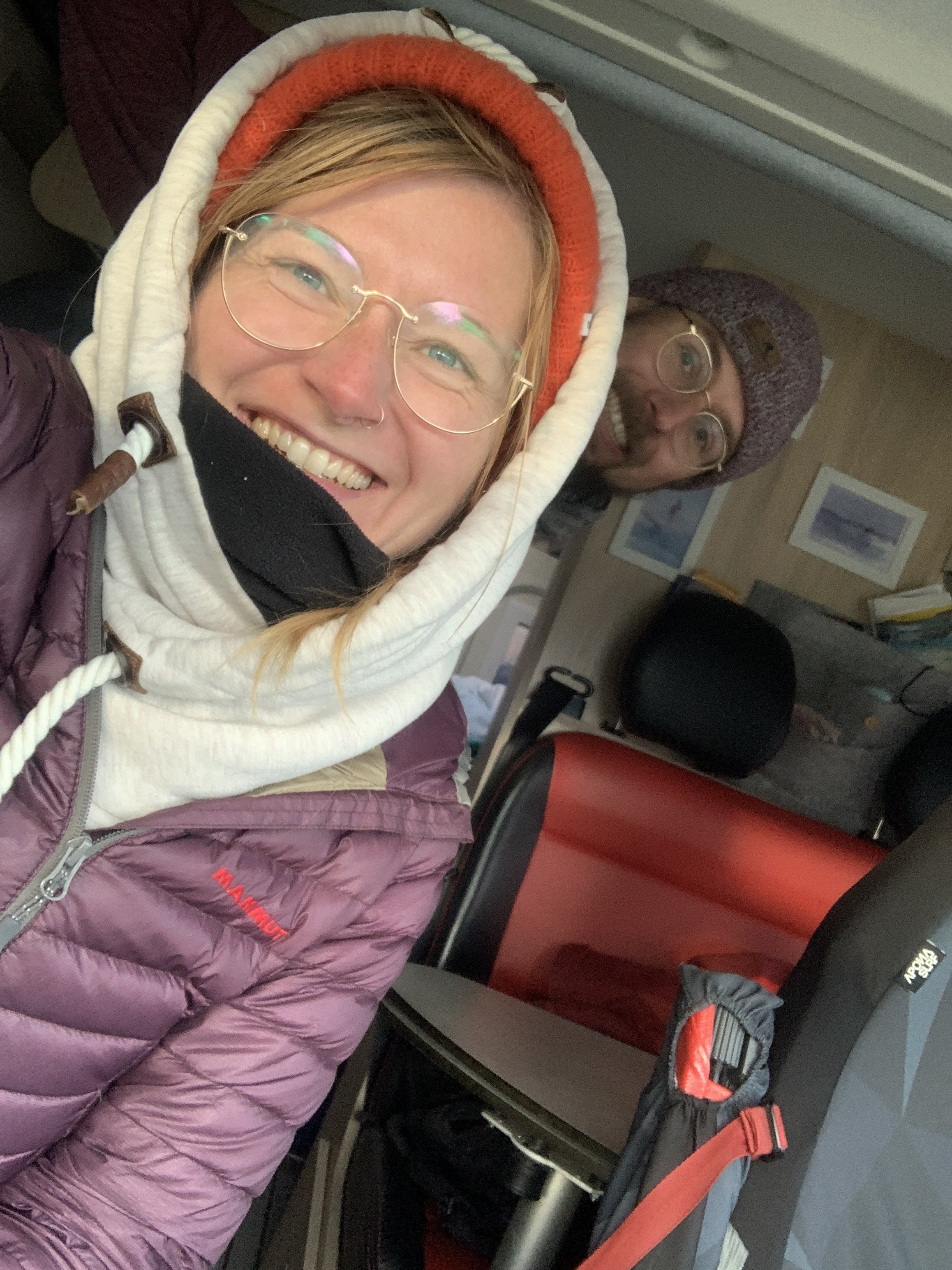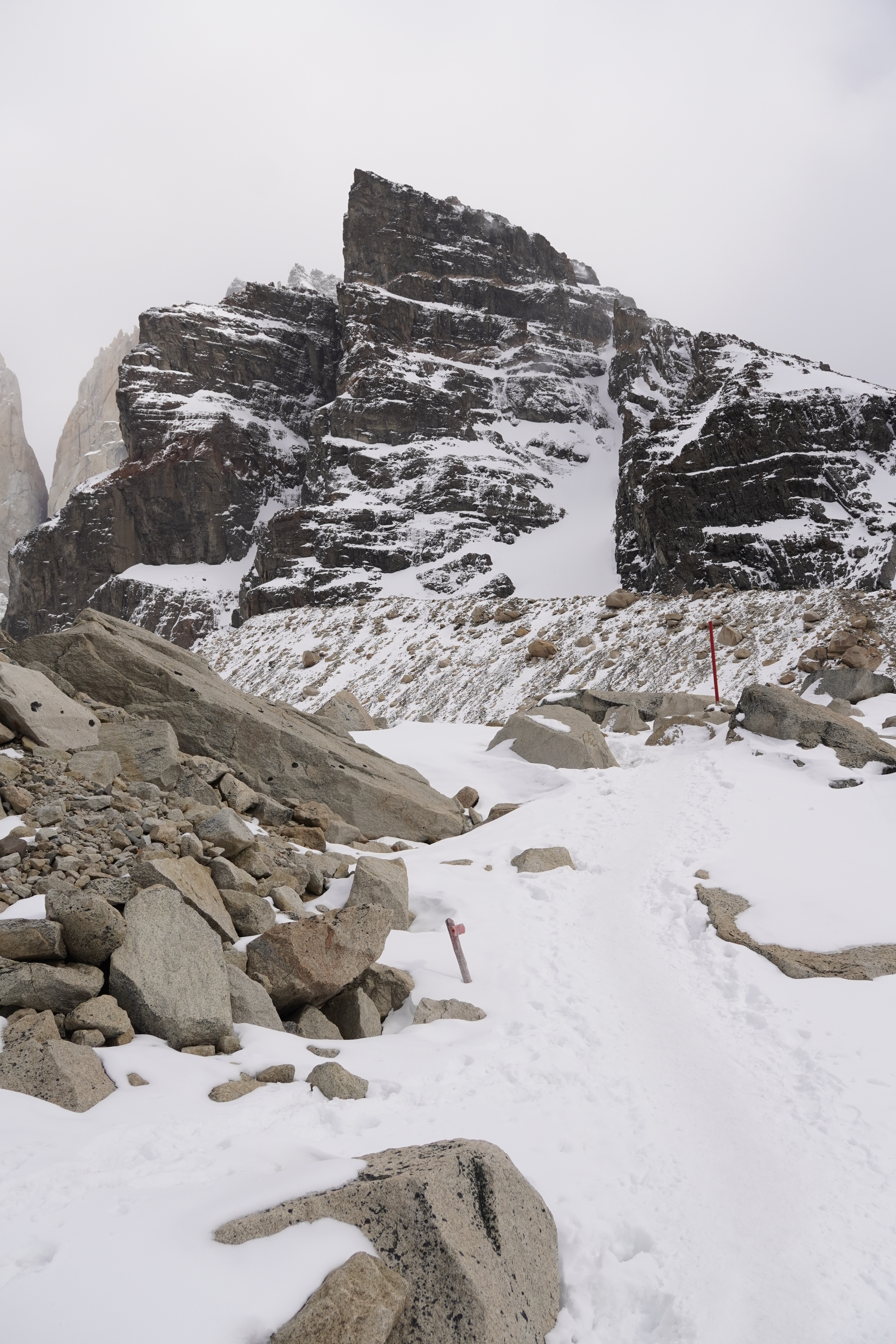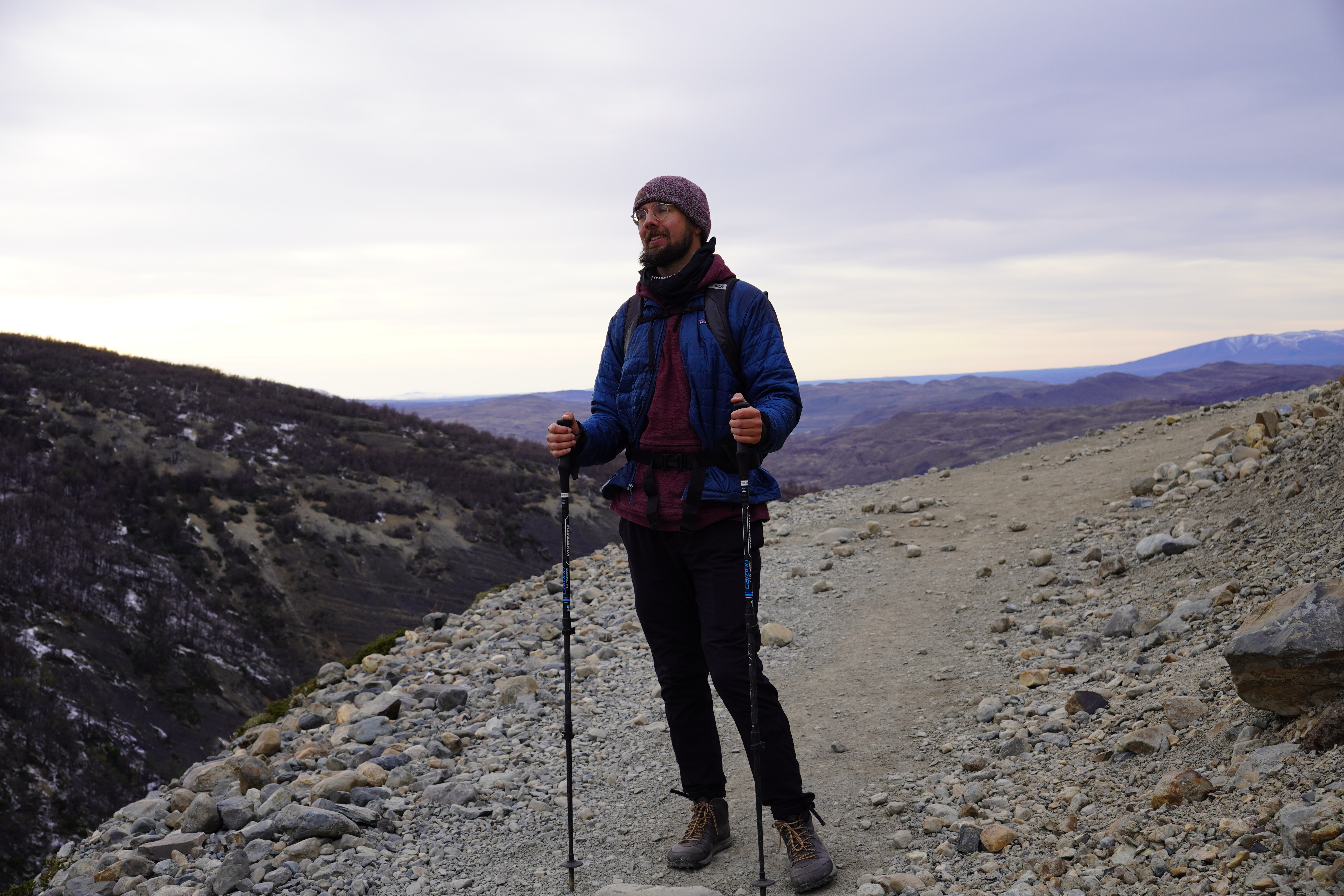 The night was probably the coldest so far, and everything around us was frozen in the morning. Around 8 a.m., we set off, warmly bundled up in sub-zero temperatures. Before us lay a good 8 hours with 20.4 km of distance and 880m of elevation gain and loss. After 20 minutes of warming up, the ascent began. The hiking trail had turned into a riverbed, completely frozen. You had to be very careful not to slip. We warmed up, and the cold temperatures were no problem at all. About 1.5 hours before the endpoint, someone from the national park came towards us and checked our equipment. She wanted to see our crampones (spikes), which we dug out of our backpack and without which we would not have been allowed to proceed. We would need them half an hour later. The last hour before the highest point, it was very steep and icy, and some sections consisted of steep snow-covered paths on the slope. When we finally arrived around noon, we were rewarded with a breathtaking view of the Torres and the frozen lake, as well as an icy strong wind. We drank warm tea, ate some bread, and took a few photos before we set off on the 4-hour descent. You couldn’t stay up there much longer because it was simply too cold. (Thank you Björn, for the USB hand warmers last Christmas that can also serve as a power bank). On the way back, you still had to be careful, as sections of the path were either frozen or muddy. Additionally, we encountered many hikers coming up the same path, which made the descent more difficult. We – and our knees – were very, very glad when we were back at Rosi in the early evening and had warm pumpkin-potato-coconut soup (prepared the day before). Unfortunately, the nice feeling of a warm shower was missing, but we made ourselves cozy and warm in the van, massaged ourselves with the Terragun, and stayed another night there.
