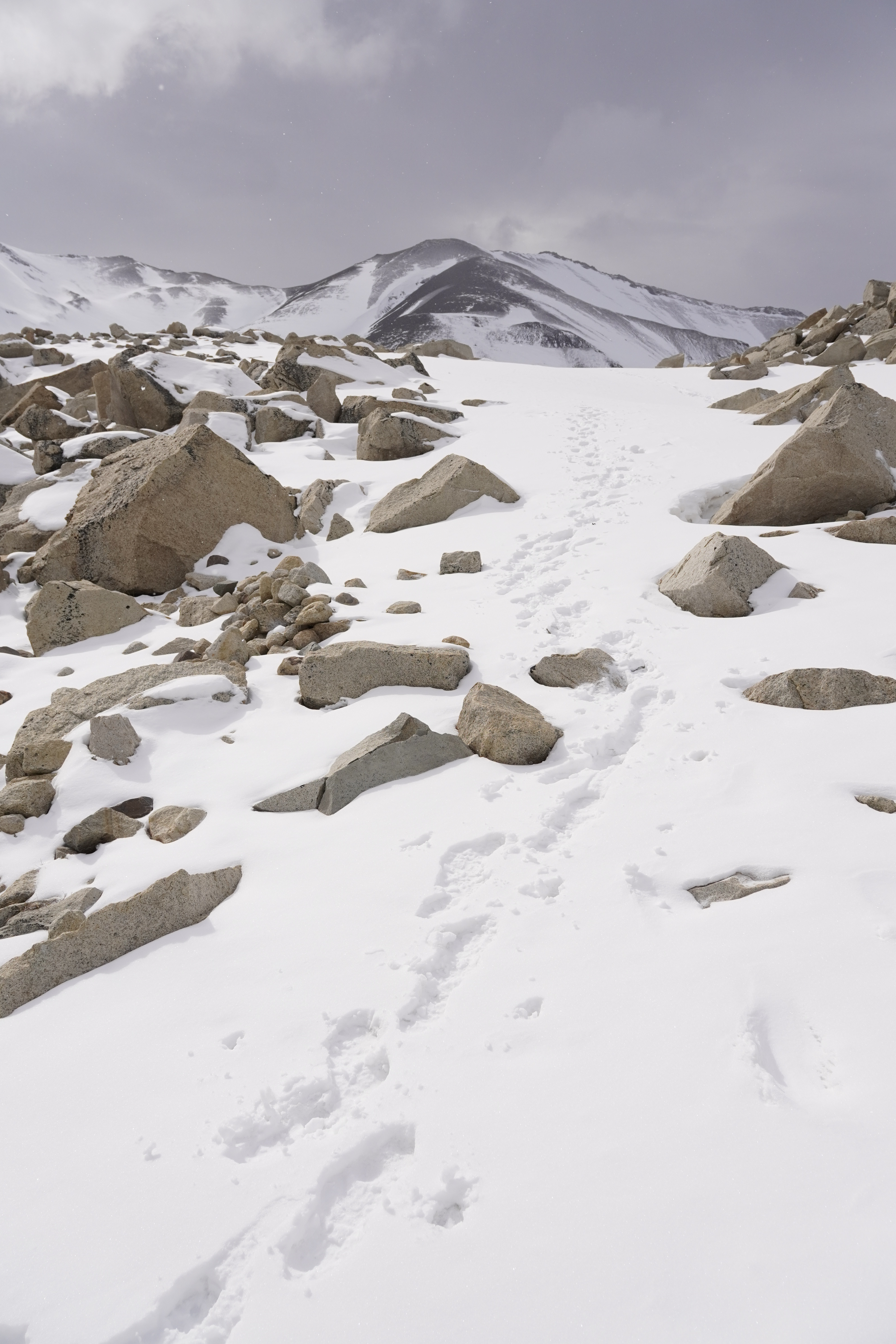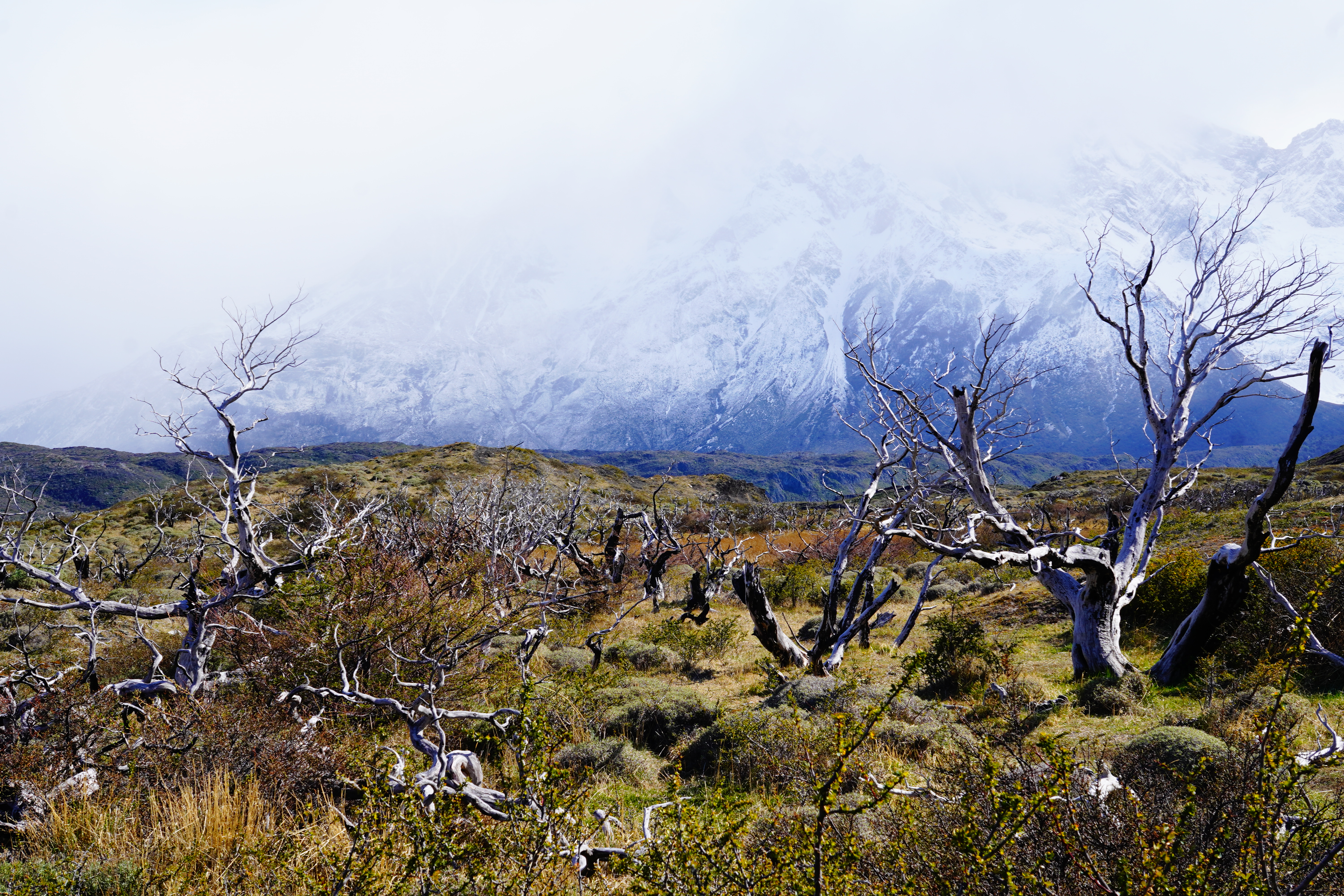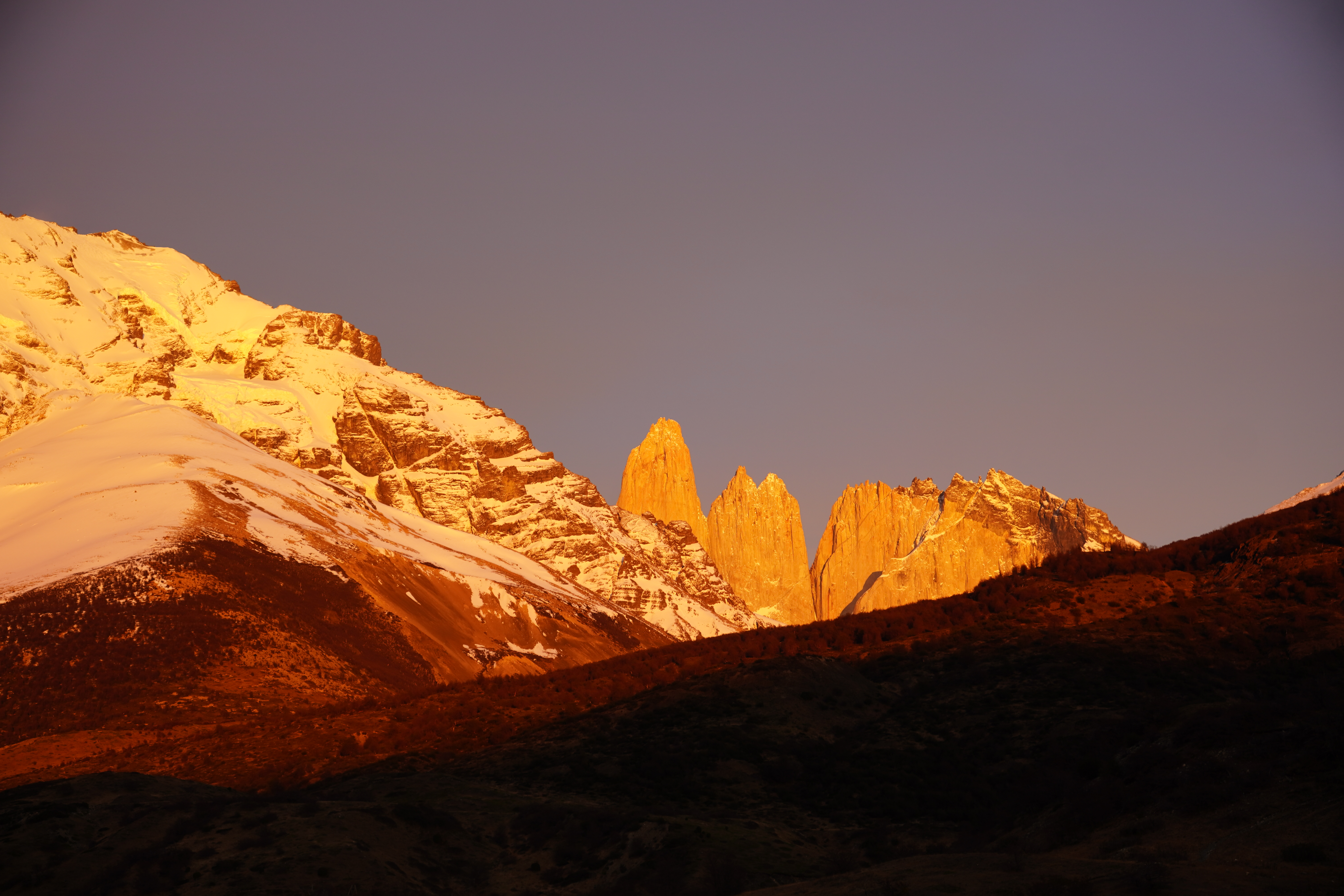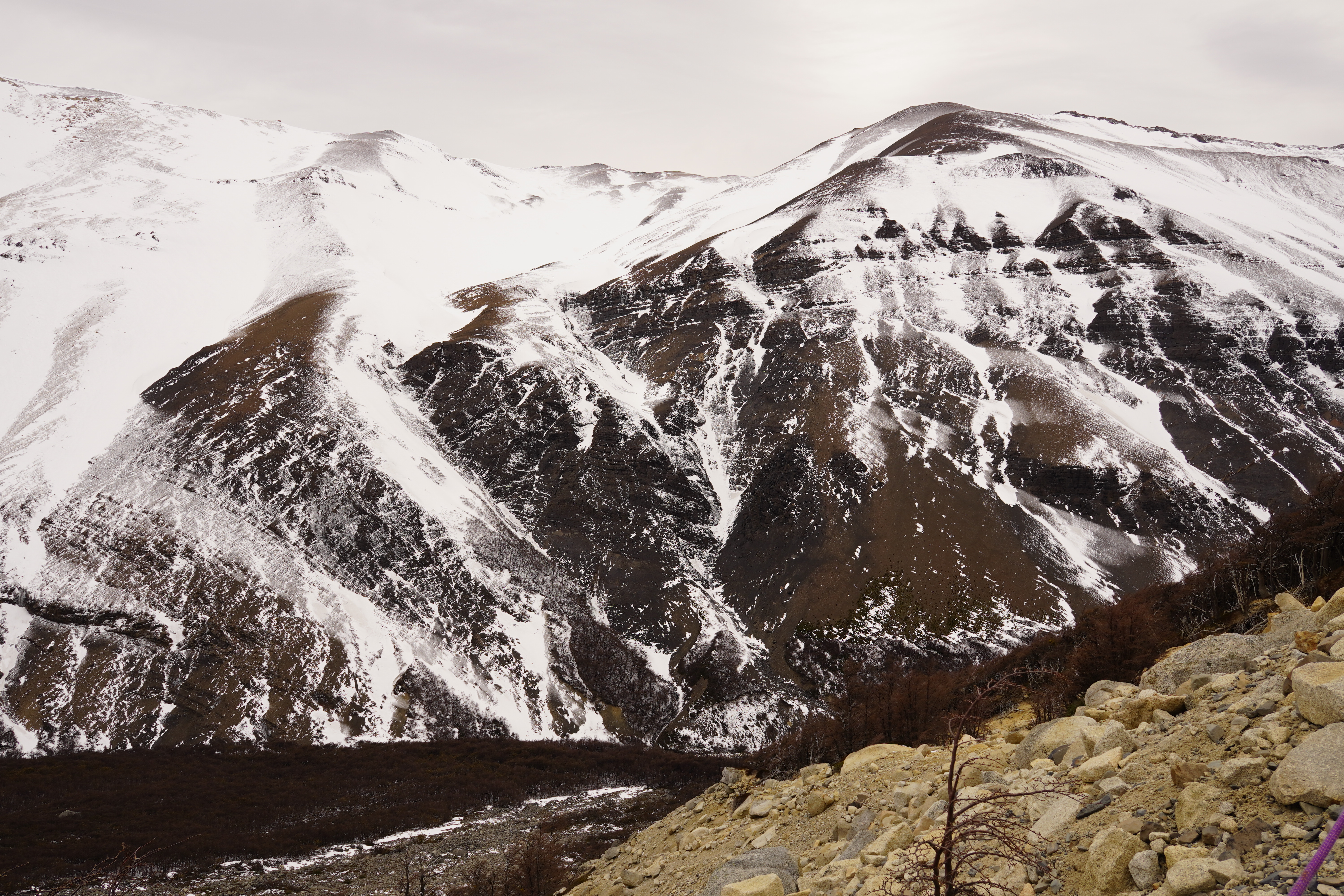 The night was probably the coldest so far, and everything around us was frozen in the morning. Around 8 a.m., we set off, warmly bundled up in sub-zero temperatures. Before us lay a good 8 hours with 20.4 km of distance and 880m of elevation gain and loss. After 20 minutes of warming up, the ascent began. The hiking trail had turned into a riverbed, completely frozen. You had to be very careful not to slip. We warmed up, and the cold temperatures were no problem at all. About 1.5 hours before the endpoint, someone from the national park came towards us and checked our equipment. She wanted to see our crampones (spikes), which we dug out of our backpack and without which we would not have been allowed to proceed. We would need them half an hour later. The last hour before the highest point, it was very steep and icy, and some sections consisted of steep snow-covered paths on the slope. When we finally arrived around noon, we were rewarded with a breathtaking view of the Torres and the frozen lake, as well as an icy strong wind. We drank warm tea, ate some bread, and took a few photos before we set off on the 4-hour descent. You couldn’t stay up there much longer because it was simply too cold. (Thank you Björn, for the USB hand warmers last Christmas that can also serve as a power bank). On the way back, you still had to be careful, as sections of the path were either frozen or muddy. Additionally, we encountered many hikers coming up the same path, which made the descent more difficult. We – and our knees – were very, very glad when we were back at Rosi in the early evening and had warm pumpkin-potato-coconut soup (prepared the day before). Unfortunately, the nice feeling of a warm shower was missing, but we made ourselves cozy and warm in the van, massaged ourselves with the Terragun, and stayed another night there.