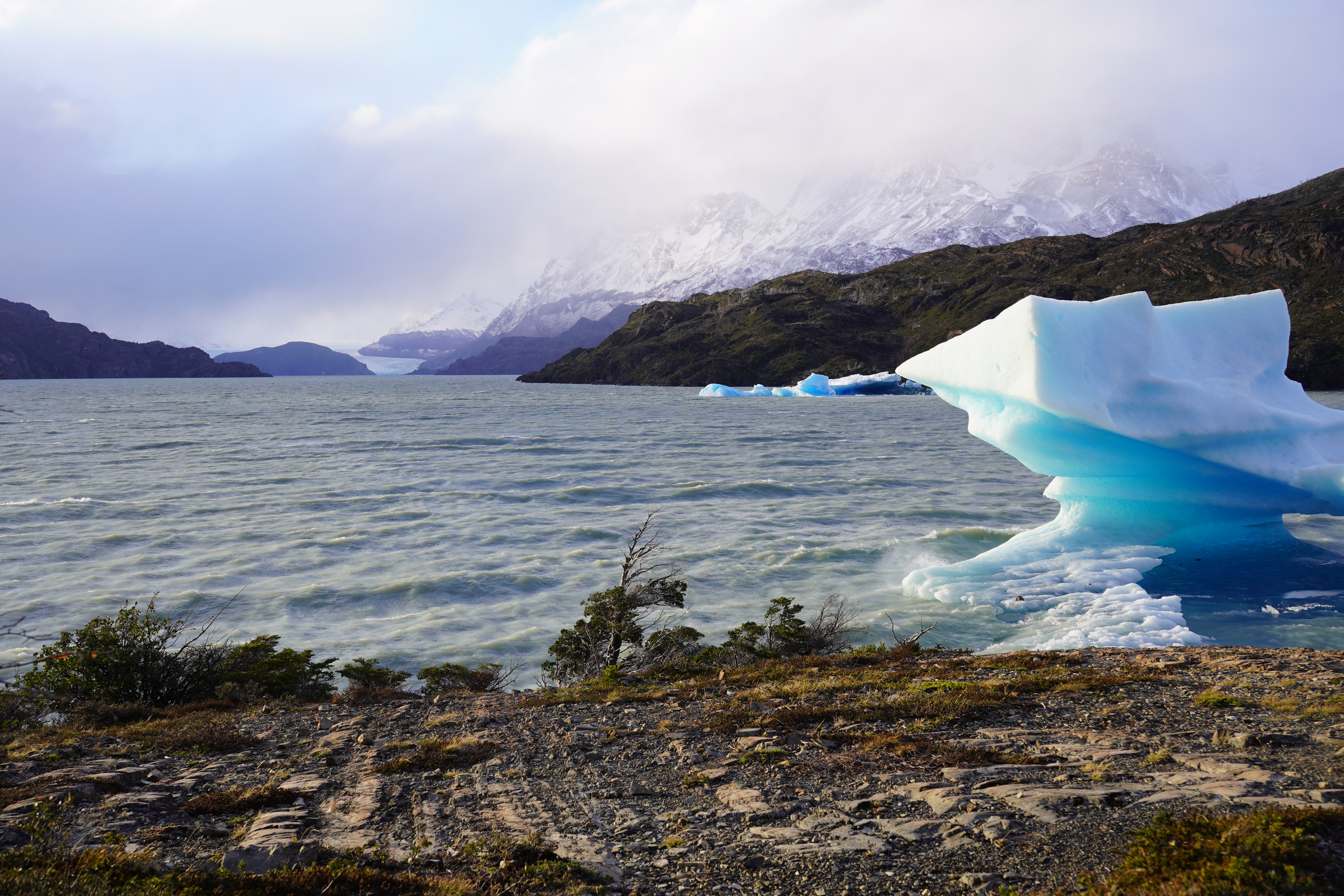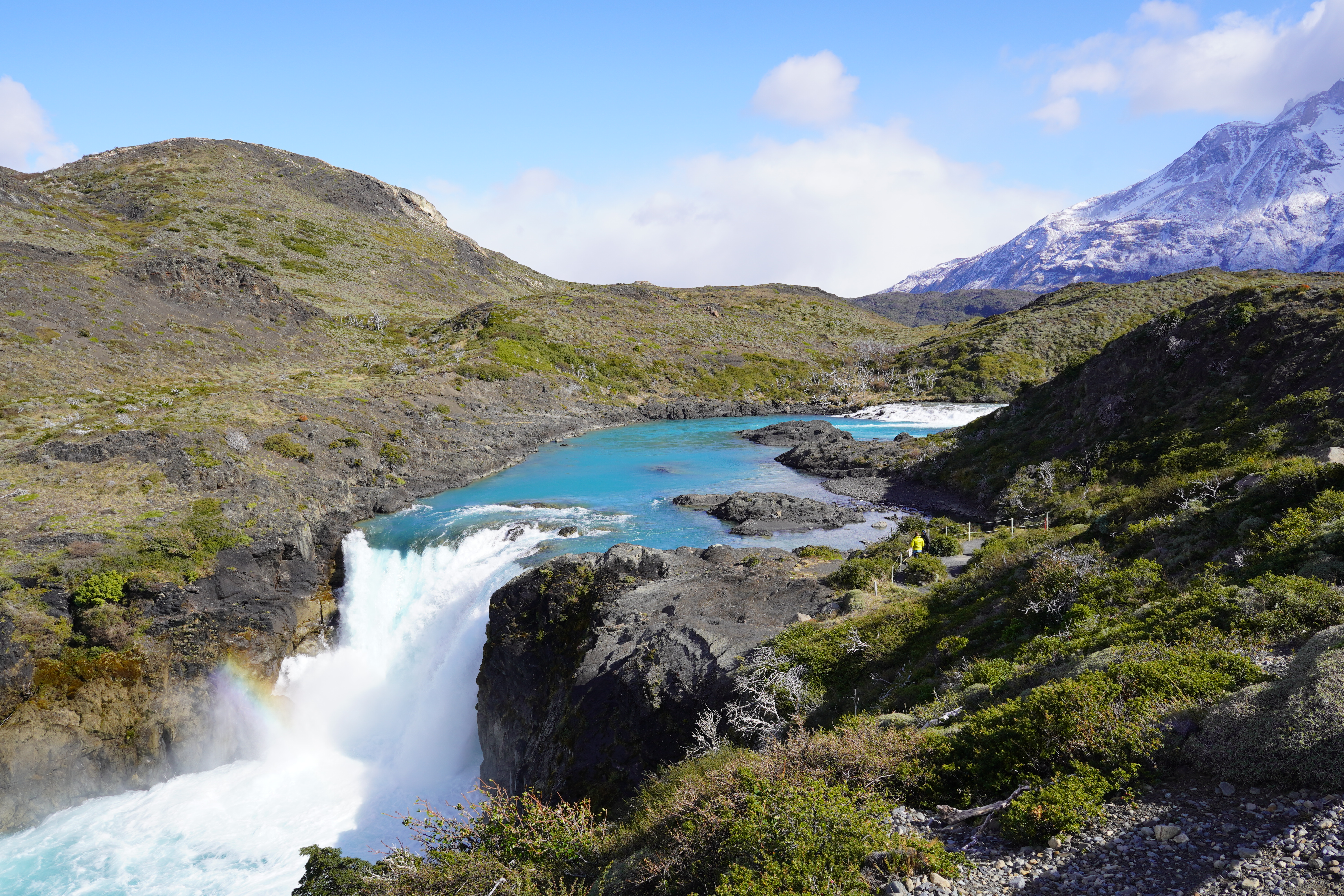 The next day, we actually wanted to hike another part of the W-Track, but it was not possible due to the off-season ferry schedules. The starting point of the hike was only reachable by boat. The first and last ferries ran 6 hours apart, making an 8-hour hike impossible for us. We decided on two short 6 km hikes with wonderful views of the mountains, lakes, a waterfall, and the Grey Glacier – for the first glacier on our journey, we enjoyed a really good Pisco Sour at Hotel Lago Grey, where we briefly stopped by the hotel bar. We were so grateful for all these insights in Torres del Paine National Park, in Chilean Patagonia, which are so different from everything we had seen so far. Everything was just beautiful, like in a picture book. Except for the wind, which we could have done without. Unfortunately, it never left our side. The last night in Torres del Paine we encountered the heaviest wind gusts so far. After having read that camper vans have been flipped over by the wind before, we reparked Rosi twice that night to get some protection from the wind. Thus, we willingly accepted high admission fees and several hundred kilometers of gravel roads (the entire roads in the national park consist of gravel roads in varying conditions). On the last day we left the park, it rained. We hadn’t seen rain in weeks.