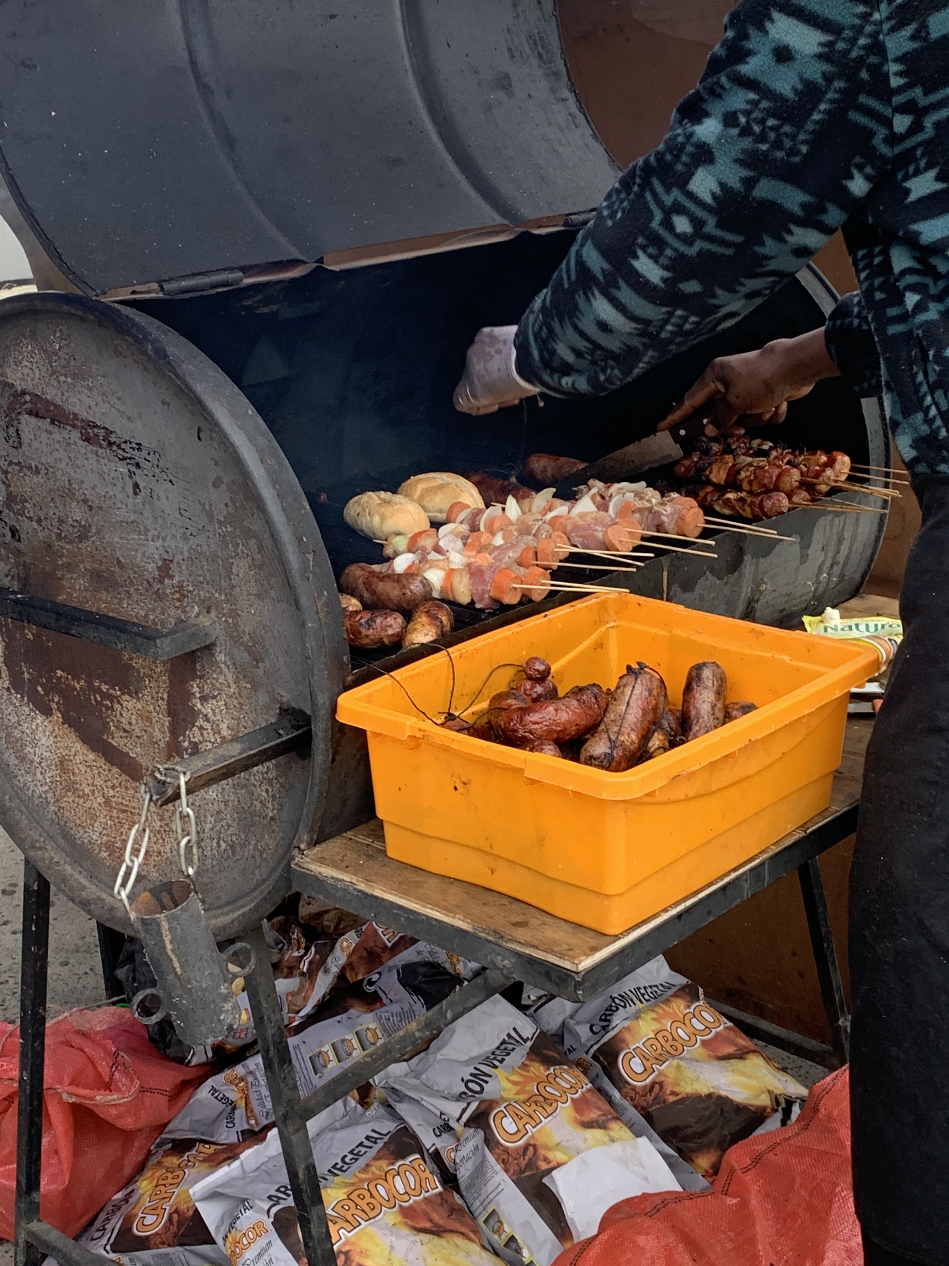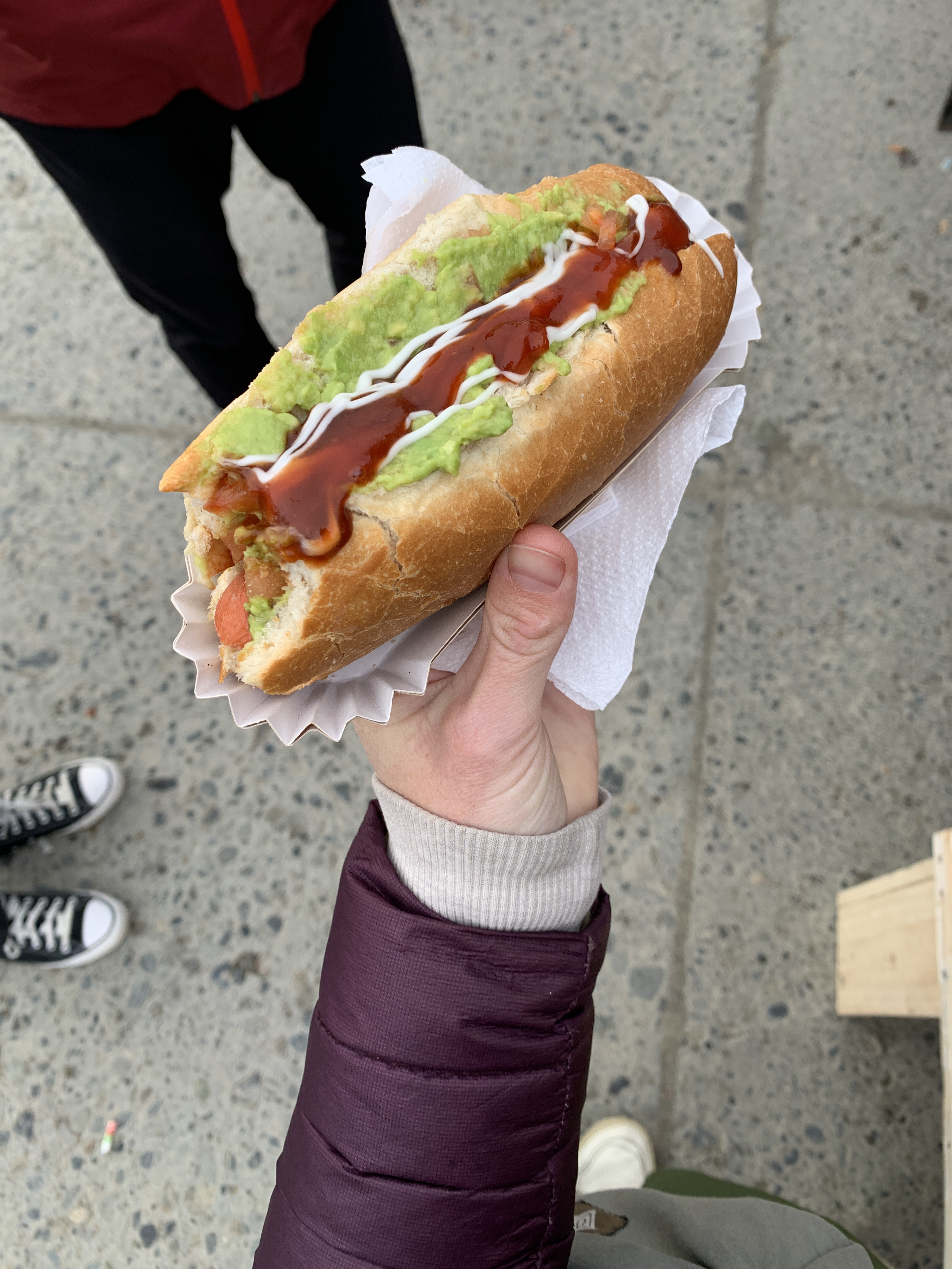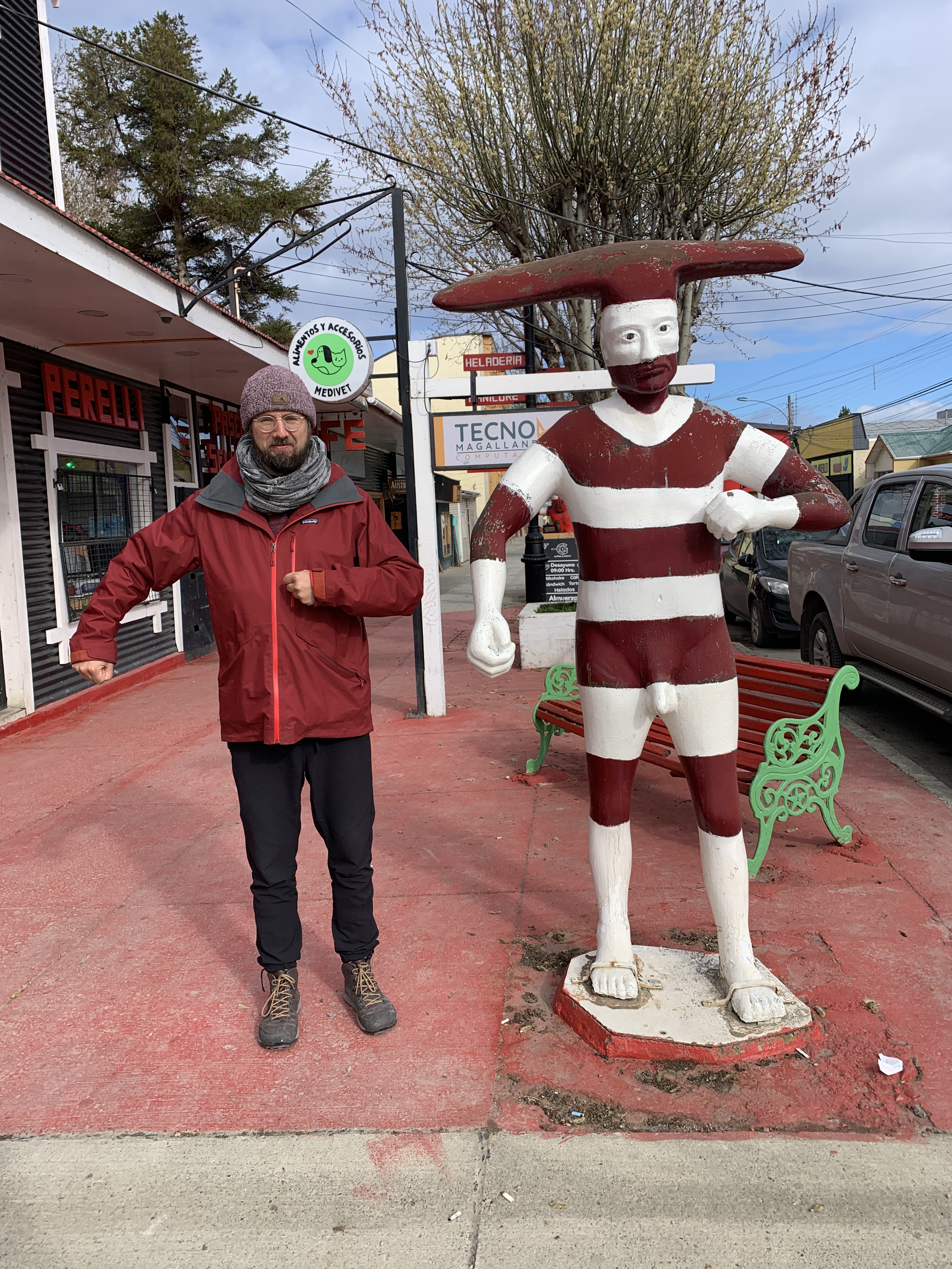 We explored the town a bit more, a pretty harbor town with an outdoor character, which we liked very much. Since not only the tourist information but also all the supermarkets were closed, and we had used up all the fresh food before the border crossing to Chile, we went back to the market and the festivities. The atmosphere was wonderful. We felt very comfortable there and had more Chilean specialties for dinner: veggie Choclo with mushrooms (corn dish), Completo (Chilean hot dog with avocado), and Choripan (Chilean bratwurst in a bun), and had a nice chat with the locals, from whom we received very very important information about Torres del Paine. We definitely needed spikes and hiking poles for the trek. Otherwise, we wouldn’t be able to enter the park. We then looked for a sleeping spot on the shore of Golfo Almte Montt and planned to take care of things the next day, as the two holidays would be over.