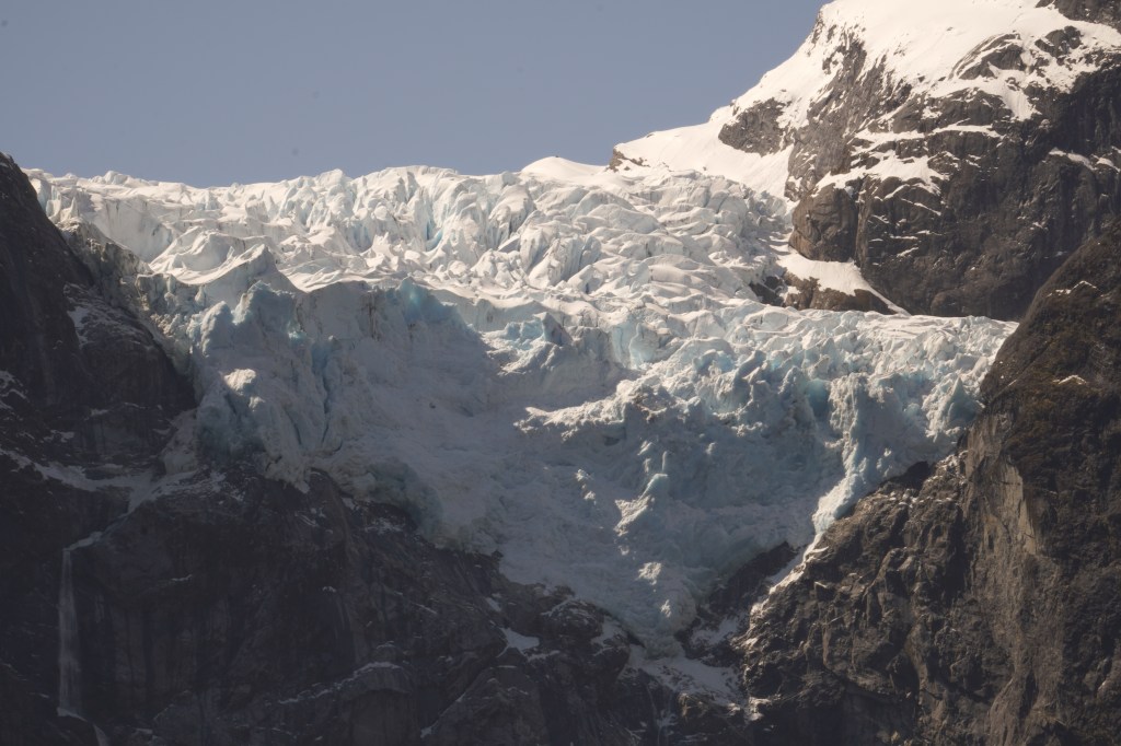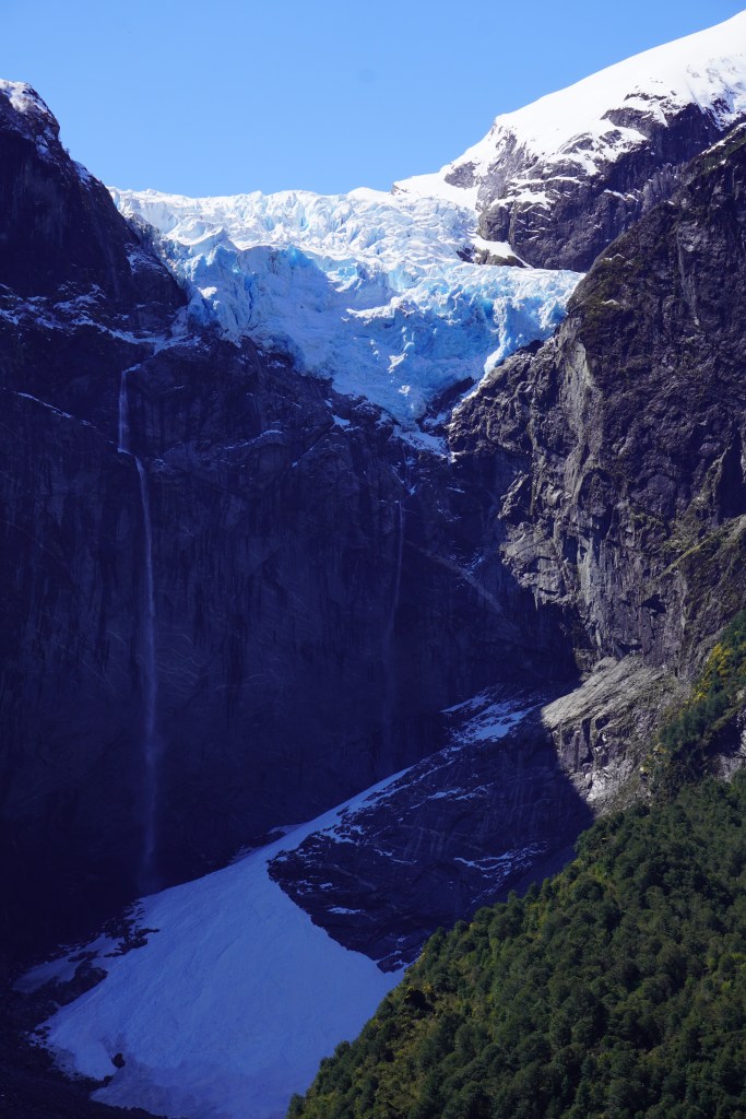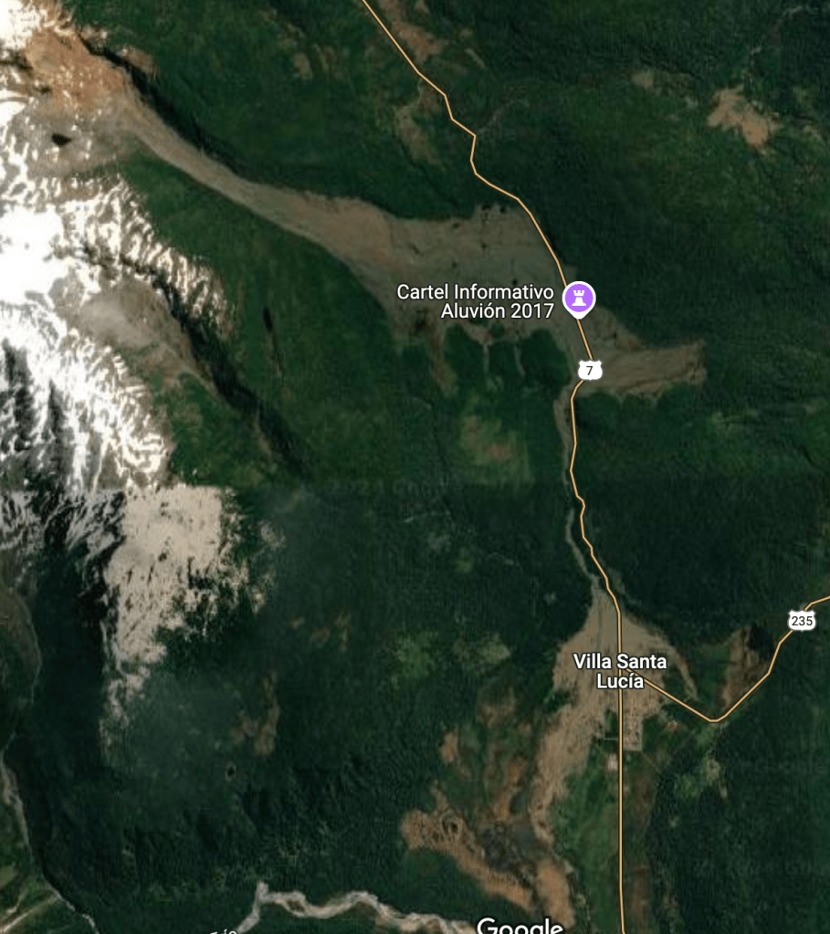 The next morning we started earlier, because we had planned a few stops. The first one (a highly recommended cafe) was closed so we continued to the National Parque Queulat. There we made a three hour hike to the view point of Ventisquero Colgante. In my opinion the toothpaste-like name is not doing it justice. The Ventisquero Colgante is a glacier that is hanging over a huge cliff. Time by time pieces fall off and you constantly see multiple waterfalls coming out of the glacier. This alone would be mind blowing. But after hiking 1,5 hours through lush green forrest with humming birds around you, it is just breath taking when you see the glacier for the first time through the green leaves of the jungle around you. Linda and me were amazed by the thick and green forest, since we have not seen such a forest so far on this trip. I did not even know that this glacier exists, but the view of it could as well be the background in a movie. After hiking down we found a 10 cm long crack in our windshield, which must have come from a stone of the cars on the long dirt road. We marked it from the inside with a pen to analyse if it gets bigger. Than we continued to drive north, since we wanted to make it as far as possible to reach a ferry the next day. On the way we passed through a strip of land that looks completely different than everything else we have seen on the Carretera Austral. It was a wasteland. All the trees were gone, but not chopped off, because you could not see any tree stump. Also the road was gone in that sector. Back when we had wifi, we found out, that this was due to a devastating avalanche that had wiped out half the village Villa Santa Luca in 2017. The screenshot of google maps shows how much force this avalanche had and hoe big the area is. Also it was crazy to see that neither nature nor the town had recovered from this avalanche even though it was over 6 years ago.