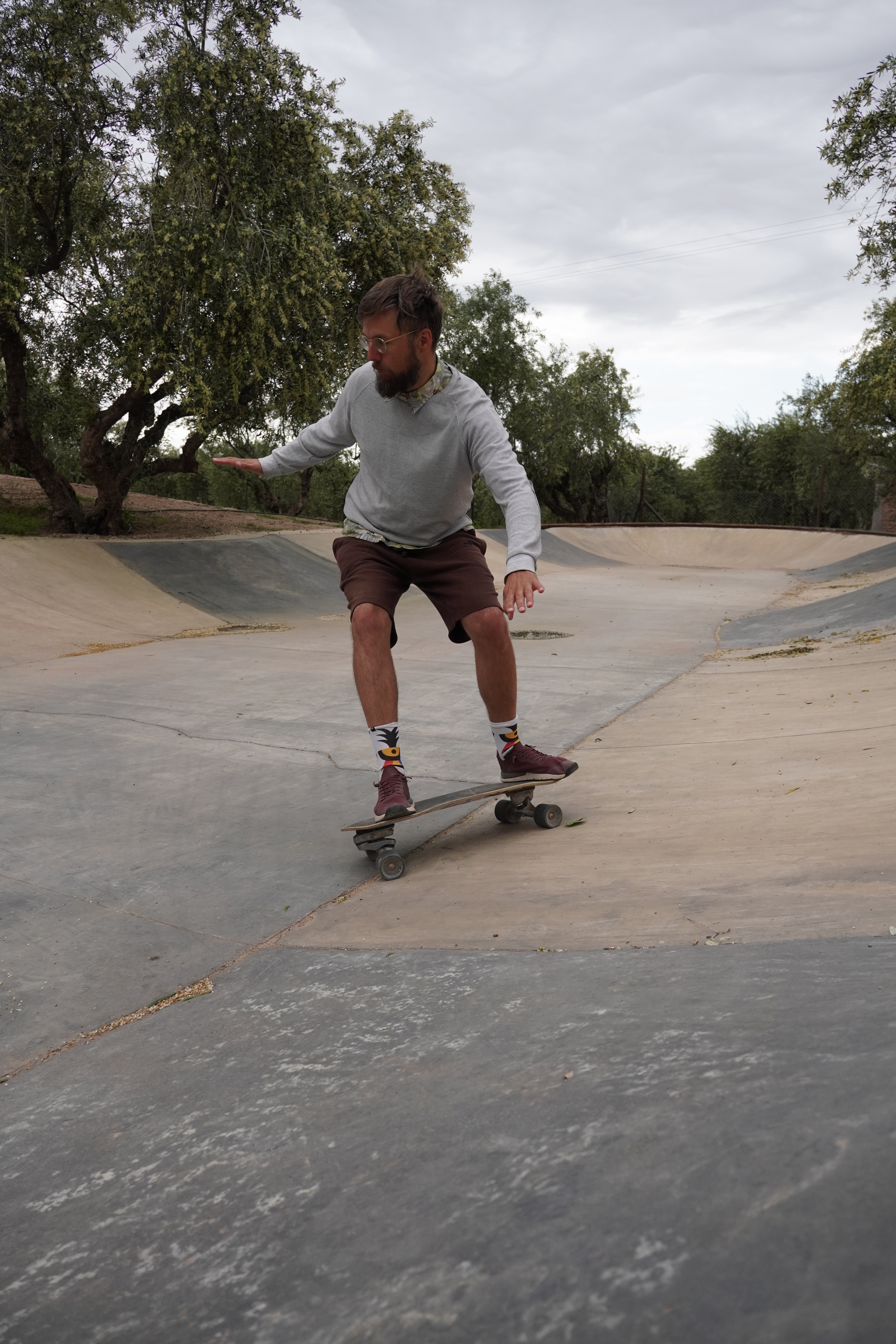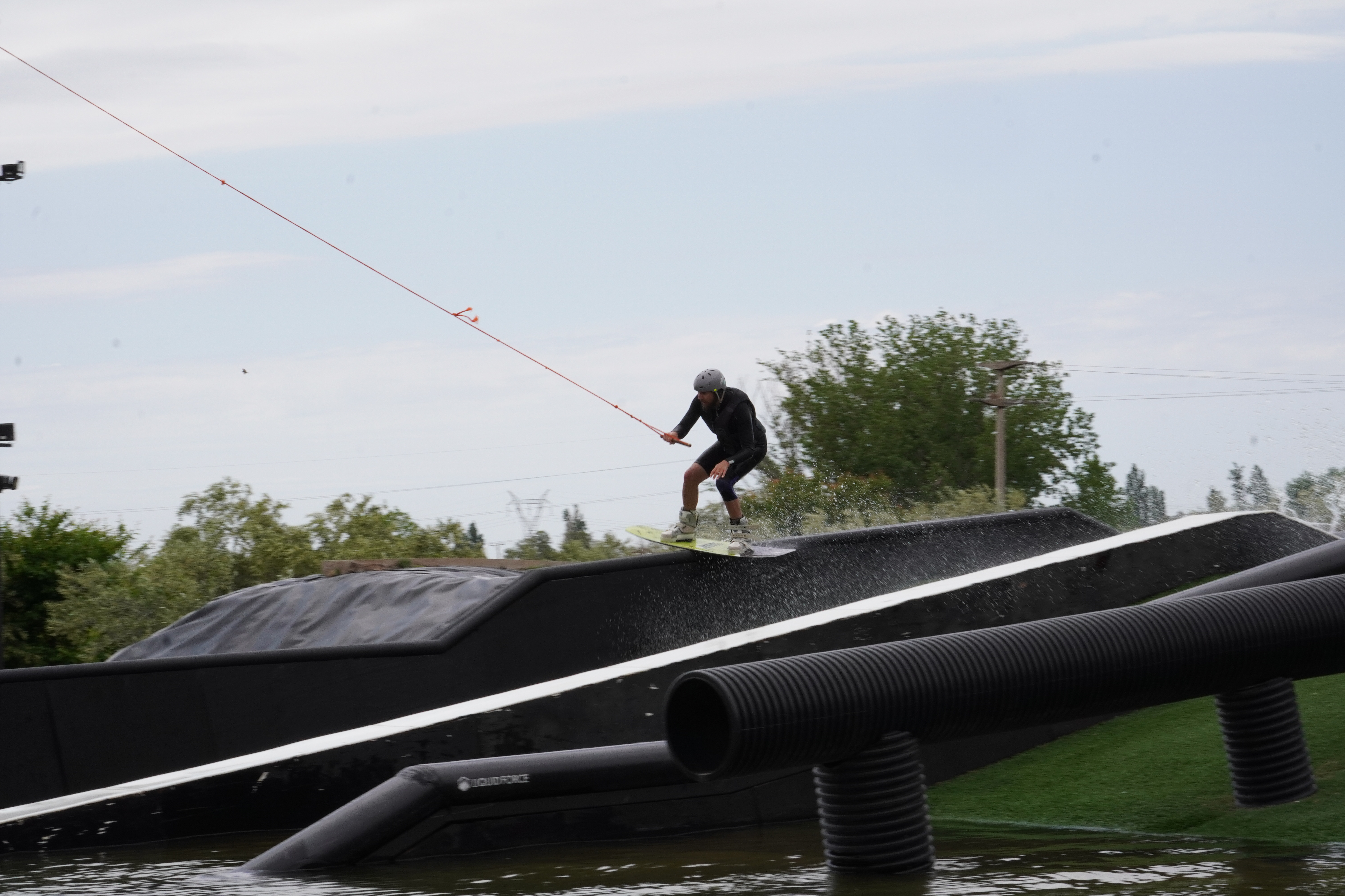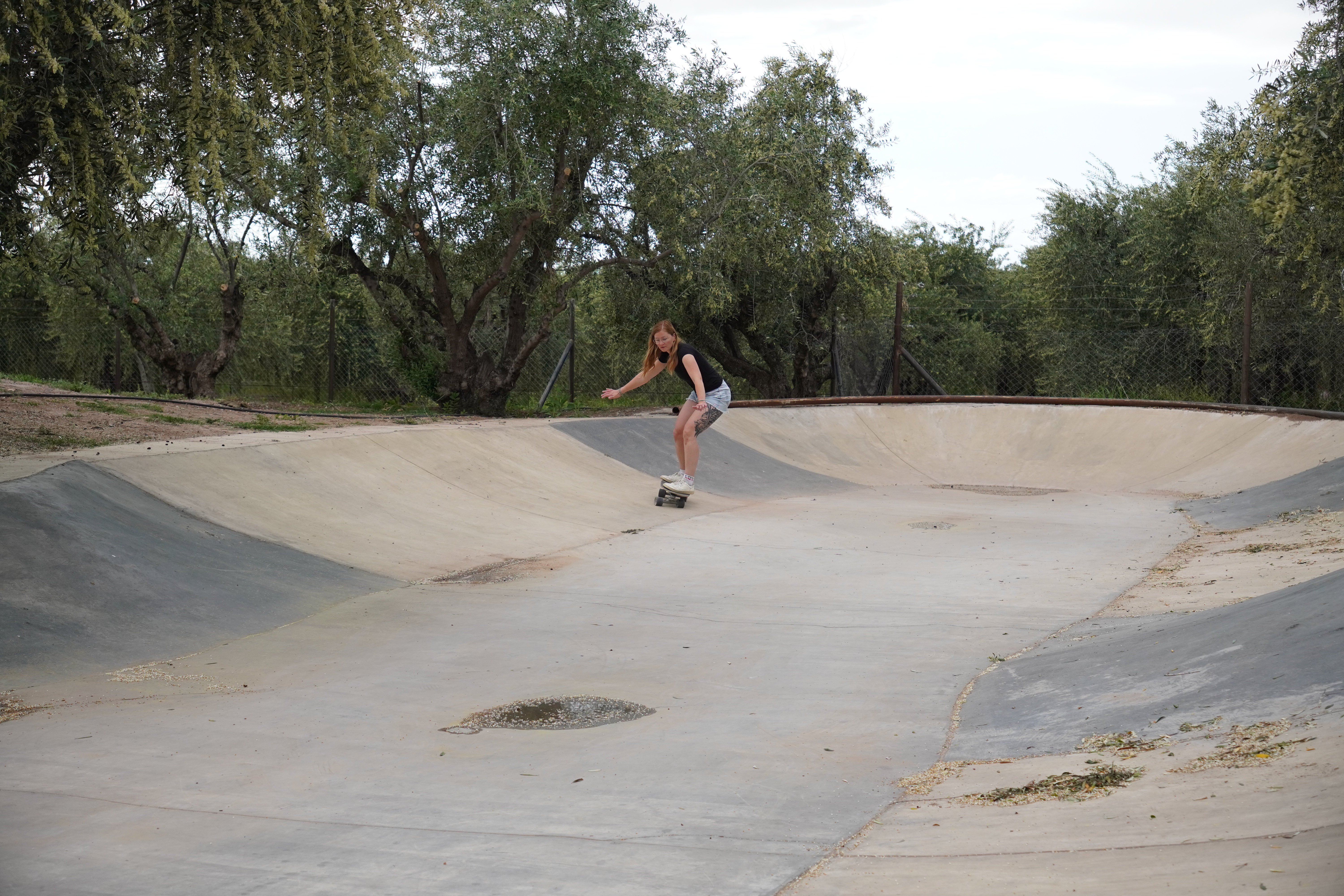 In the morning, a gardener was trimming the olive trees around us, and we were warmly greeted. After coffee, we went to Gino, who gave us his surfskate for the park’s private surfskate ramp. It felt so good. You had to be careful though, because there were olives on the ramp. The pits could get stuck in the wheels like little stones. Luckily, no one broke any bones. Now it was time for wakeboarding!!! It was too warm for a wetsuit for me, Björn put on his shorty. Gino sat relaxed on the couch, controlling the system while Björn rode. “Man, he’s sick,” he said. The obstacles were all homemade and a bit wild. Gino encouraged Björn to do some really cool stuff on the board, and in my opinion, he rode really well and safely over all the obstacles and the B-level setup. It was just fun to watch. When it was my turn, I had a lot of respect, as always, especially after my knee injury. The water was warm, and you could see the Andes on the horizon. It was just awesome, and everything went well. Once again, no one broke any bones. After our session, we had a Corona beer (Gino’s sponsor) and said our heartfelt goodbyes after a warm shower. We were in a bit of a hurry, even though we would have loved to stay longer. It felt incredible to get physically exhausted, and Gino is such a warm-hearted person. It was great to get to know him.
