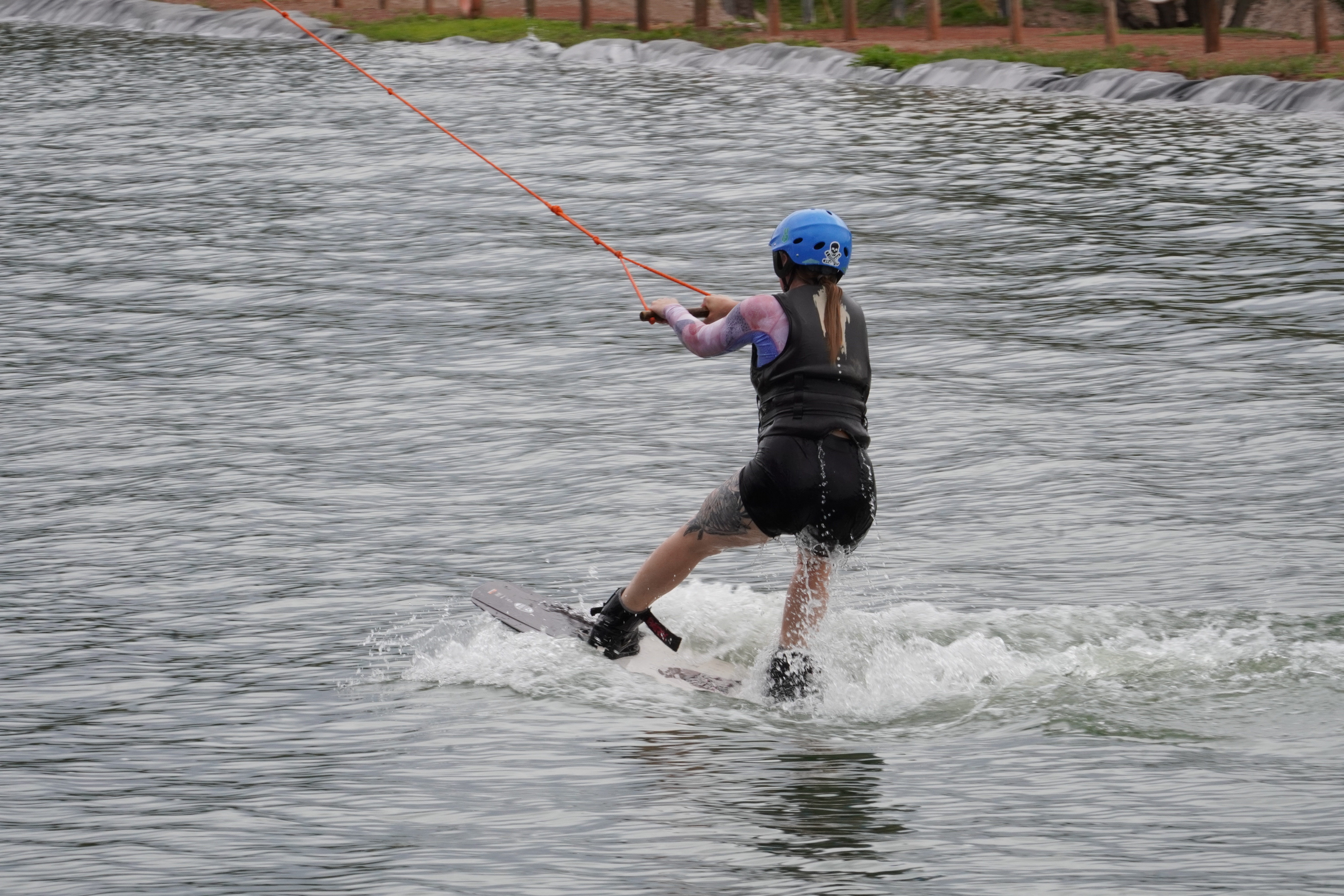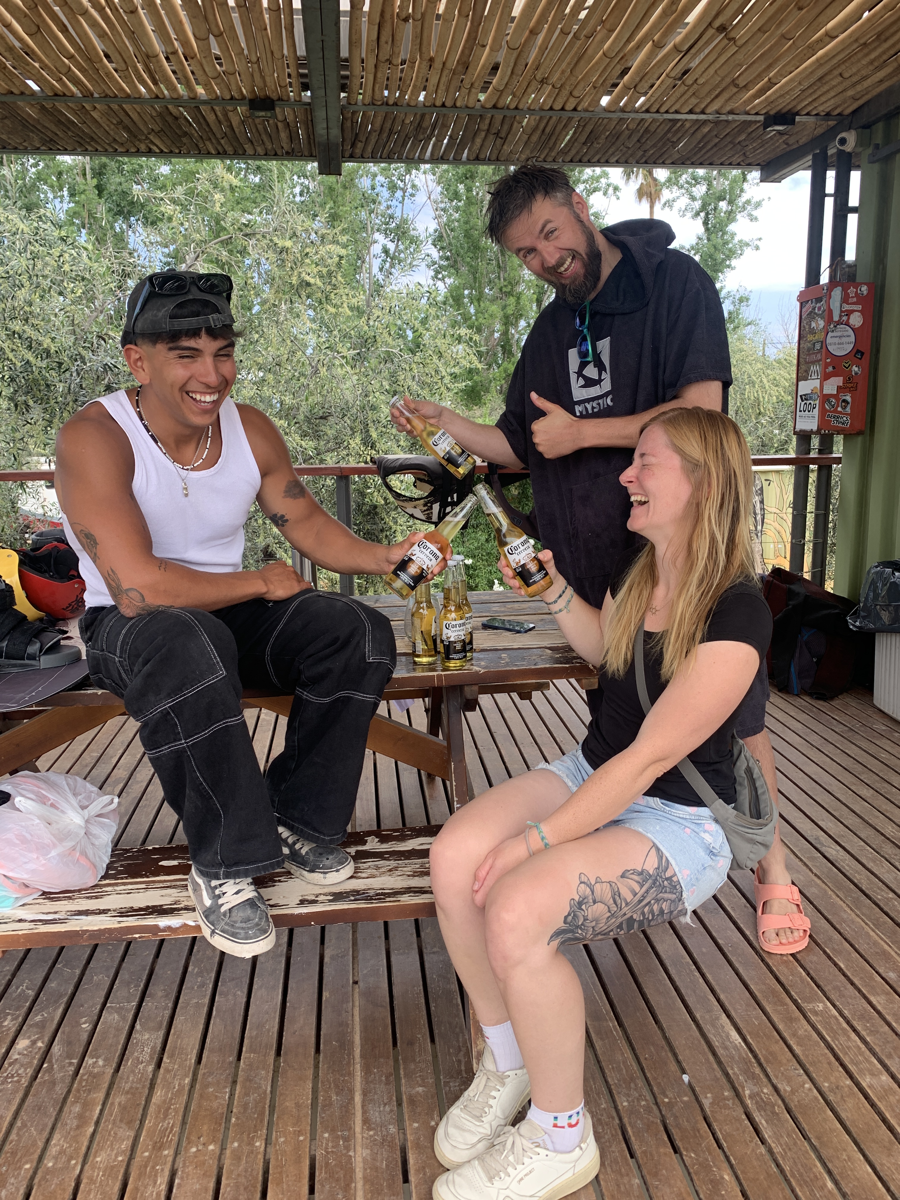 With fast food in our bellies (we didn’t finish it all, so we saved some for a midnight snack) and a repaired windshield, we headed to the Maipú district. Maipú is not only known for its wines, but also for having a wakeboard park. We couldn’t find much information online about its hours or whether it was open during the week – as always – so we just went there and were thrilled by the atmosphere. It was a beautiful summer evening, still warm, and we were greeted by olive trees and palms as we drove in. The El Roble Wake Complex has a two-tower cable system, meaning you always ride back and forth between two masts. There were people riding, and we managed to book a session for the next day at 2 p.m. When we politely asked if we could spend the night there, they told us it was no problem and that we would have a neighbor. Our camping neighbor in a container was Gino, the operator, who gave us a warm welcome. The last wakeboarders were riding until 9 p.m., when it was already quite dark, using illuminated boards. Since there was an event the next day, with a big party, they were checking if the lights in the water would hold up. It was a special full moon, unusually large. Once everyone had left, we chatted late into the night with Gino, shared our gin with him, and were very grateful for the nice company with our “Hebler”. We exchanged our dreams and life goals, and the guys talked a lot about wakeboarding. Gino (24) is from Buenos Aires and has been living in a container at the park since this season. His dream is to go to Italy next year and eventually get a wakeboarding sponsor. We had great conversations and were excited for the next day, as we would be the first to ride. We were told just to come by and let him know. It felt like we had known each other for ages. When we went to bed in the middle of the night, it wasn’t dark at all due to the moonlight. The place was surrounded by a fence and locked, with two huge dogs on the complex. We felt very comfortable and safe, and were extremely happy.