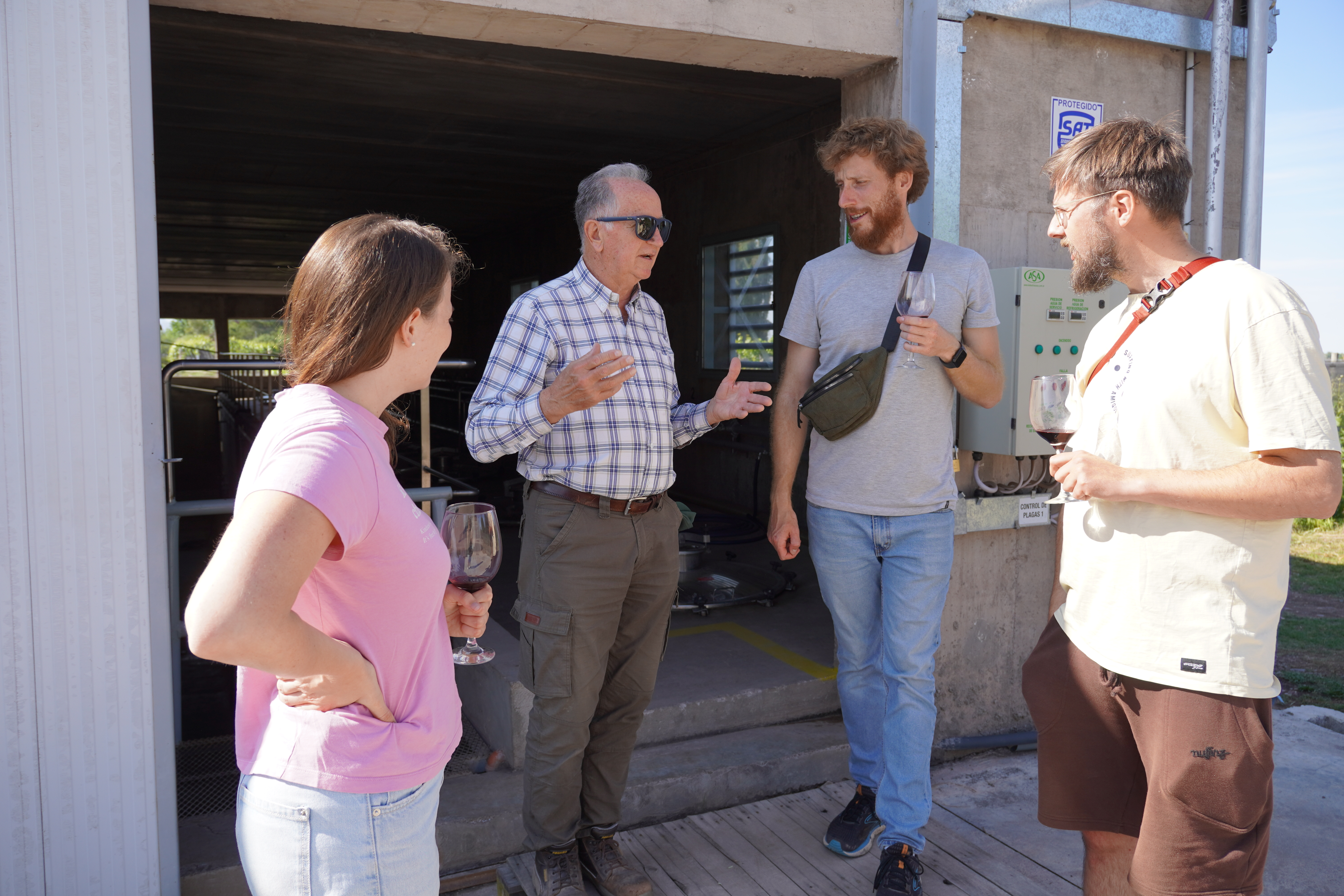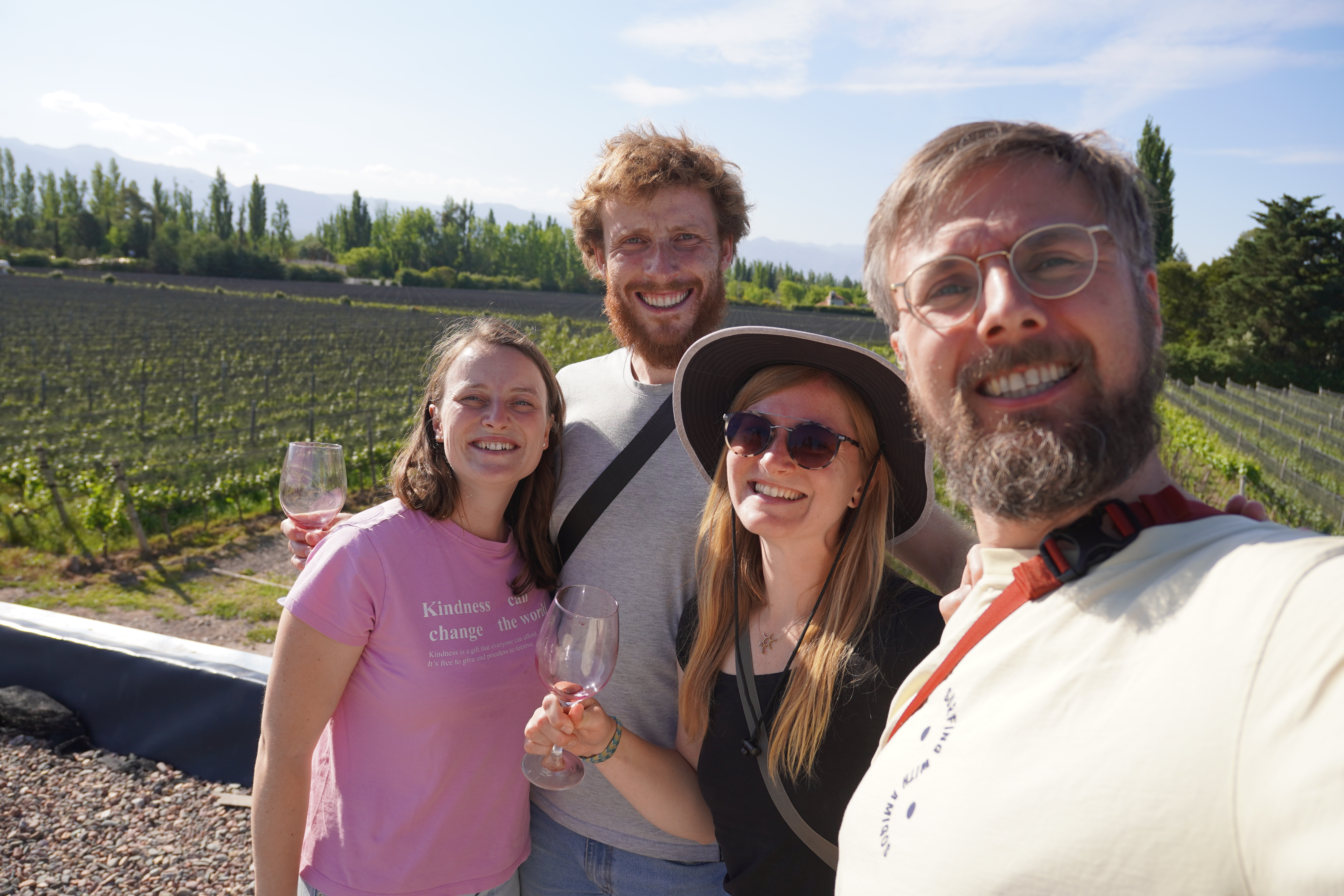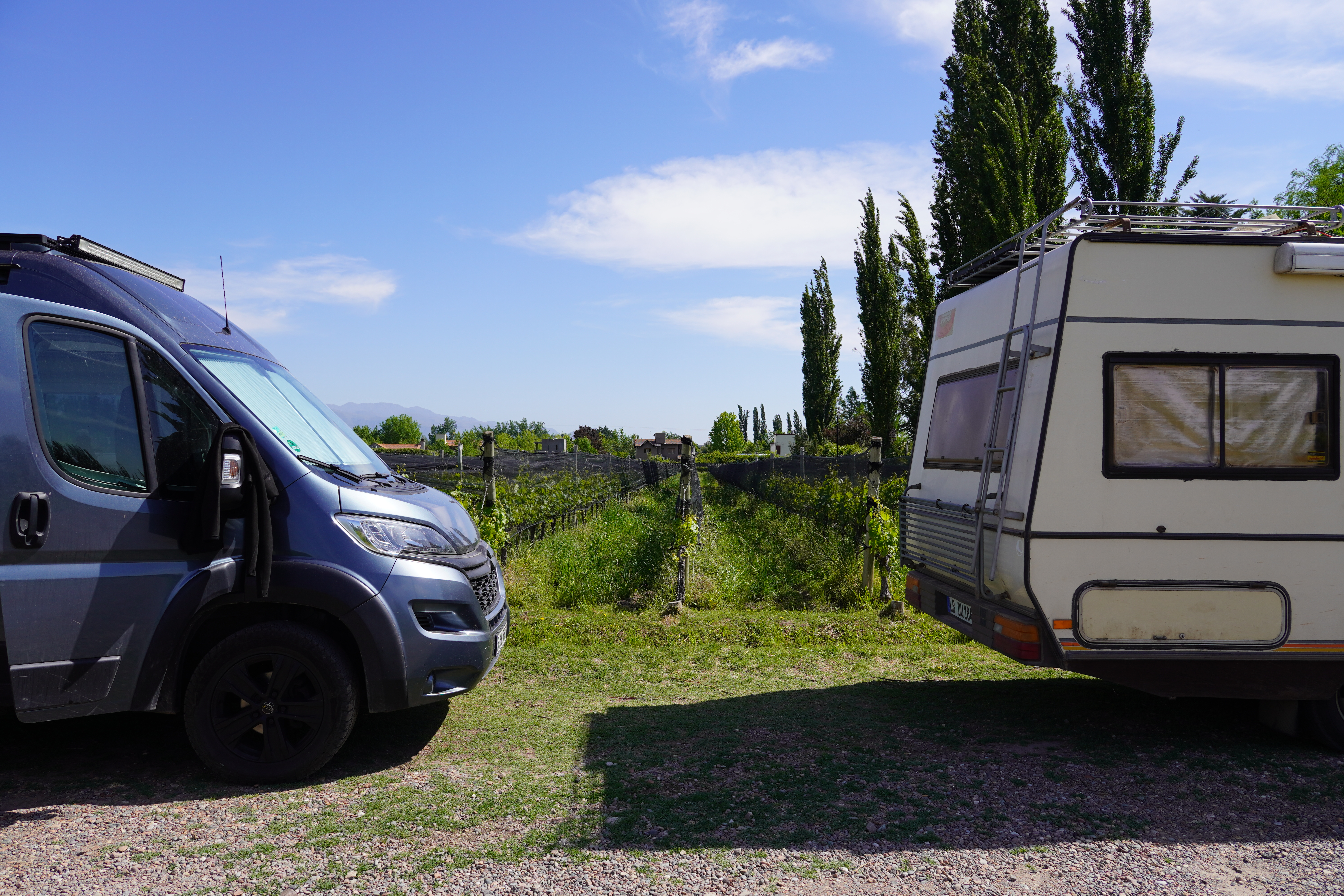 Since Montevideo, we had been in close contact with Dominik and Saskia (durchsuniversum.de), who Björn met at the harbor. The two of them shipped their camper, a 42-year-old Mercedes, on the same container ship as Rosi. Since they’re taking a different route, we always hoped we would cross paths during our 12-month journey. Mendoza worked out and fit perfectly into our travel plans. We arrived in a rush, 5 minutes late (basically still wet from our wakeboarding shower), at the Bodega Gieco and managed to join the last wine tour through the vineyard. Technically, it’s not a vineyard with hills, but a flat field with special animals: We saw humming birds. The red wines (also Malbec) we got to taste during the tour was delicious, and we treated ourselves to a few more bottles in the sunshine, right by the vineyard afterwards. They kindly allowed us to stay overnight with our campers, and no one was able to drive anymore. We spent the evening in Saskia and Dominik’s camper – where they have a proper living area – and had a great time together. We made Spätzle with lentils, cooked together, drank way too much wine, and had a wonderful evening.