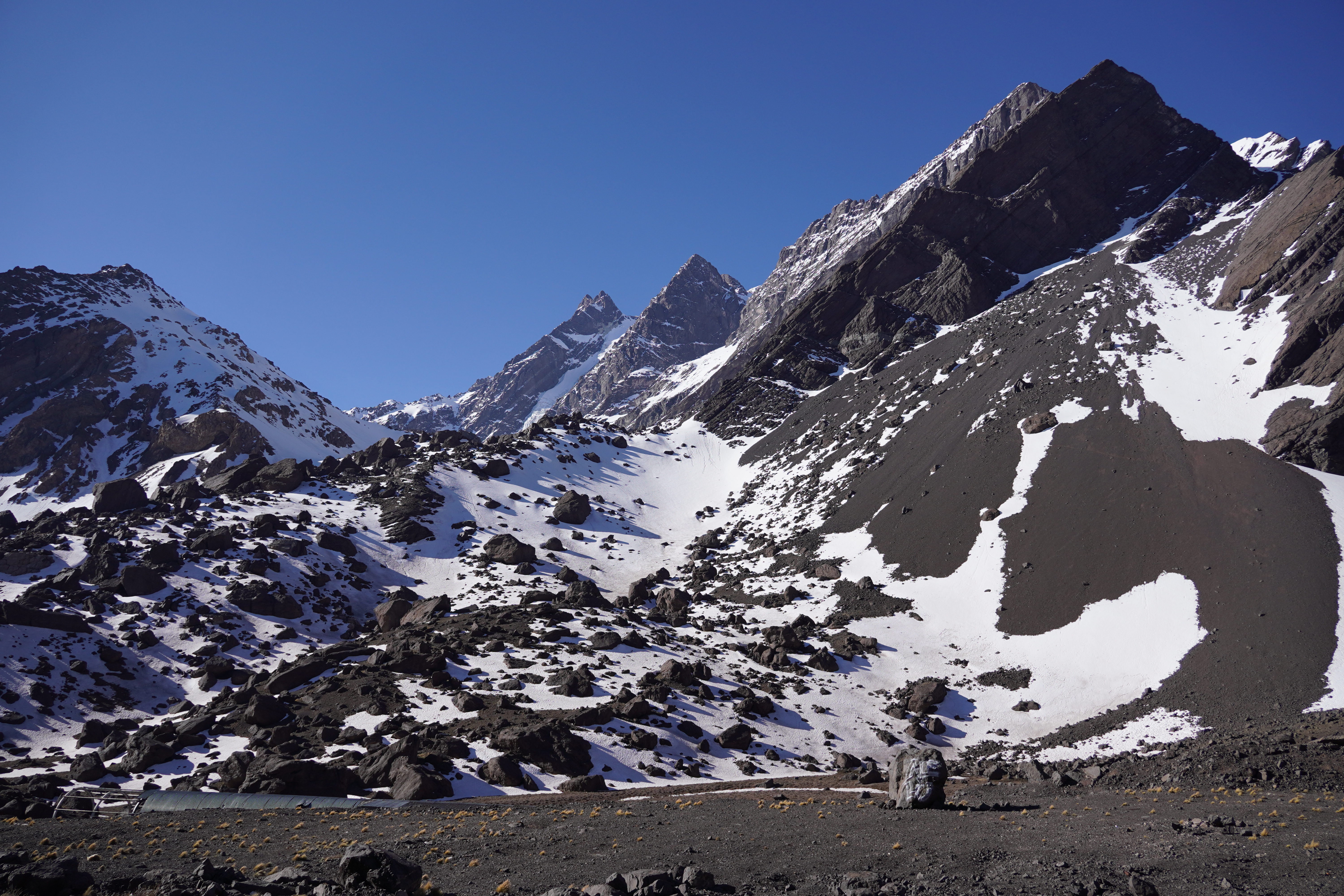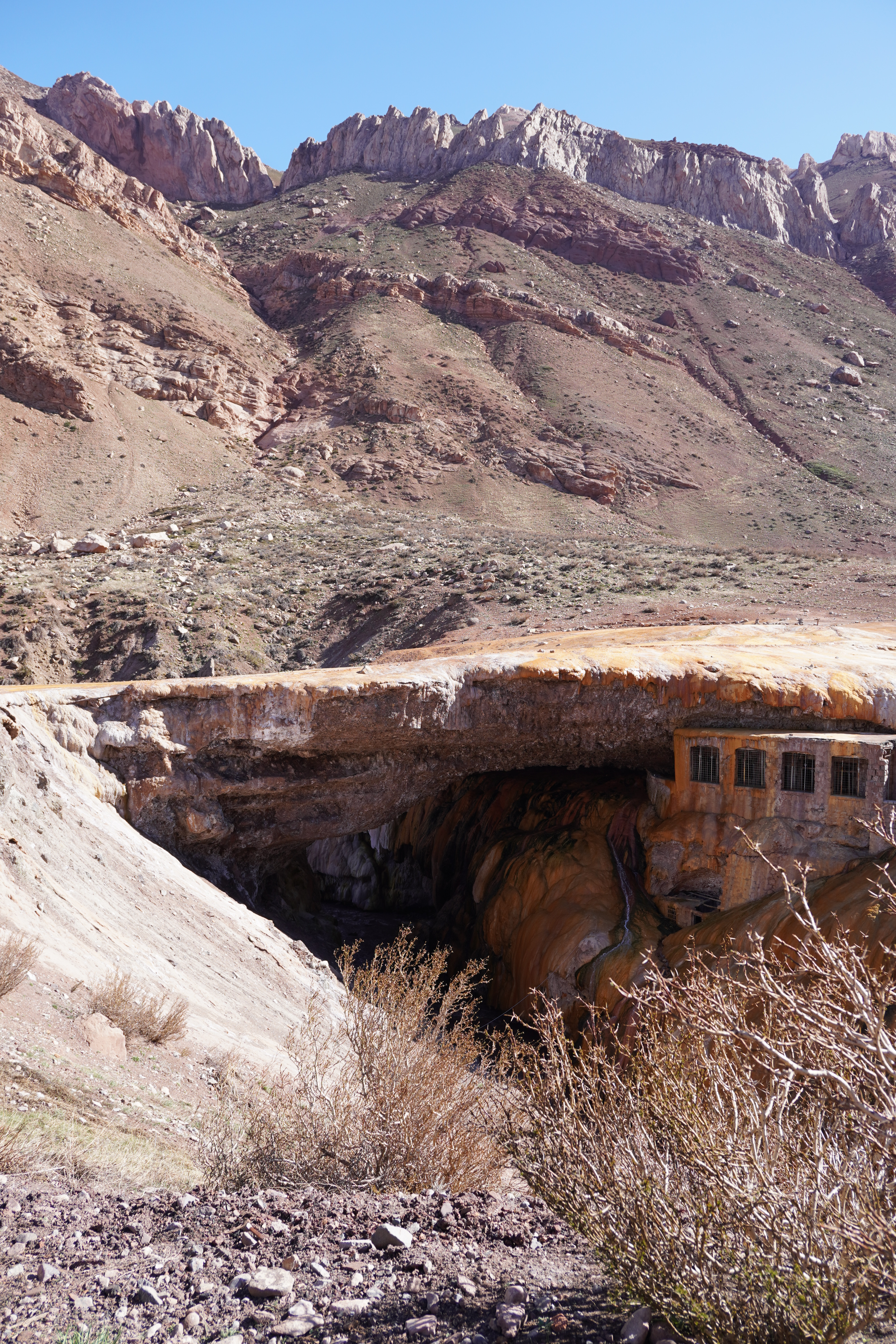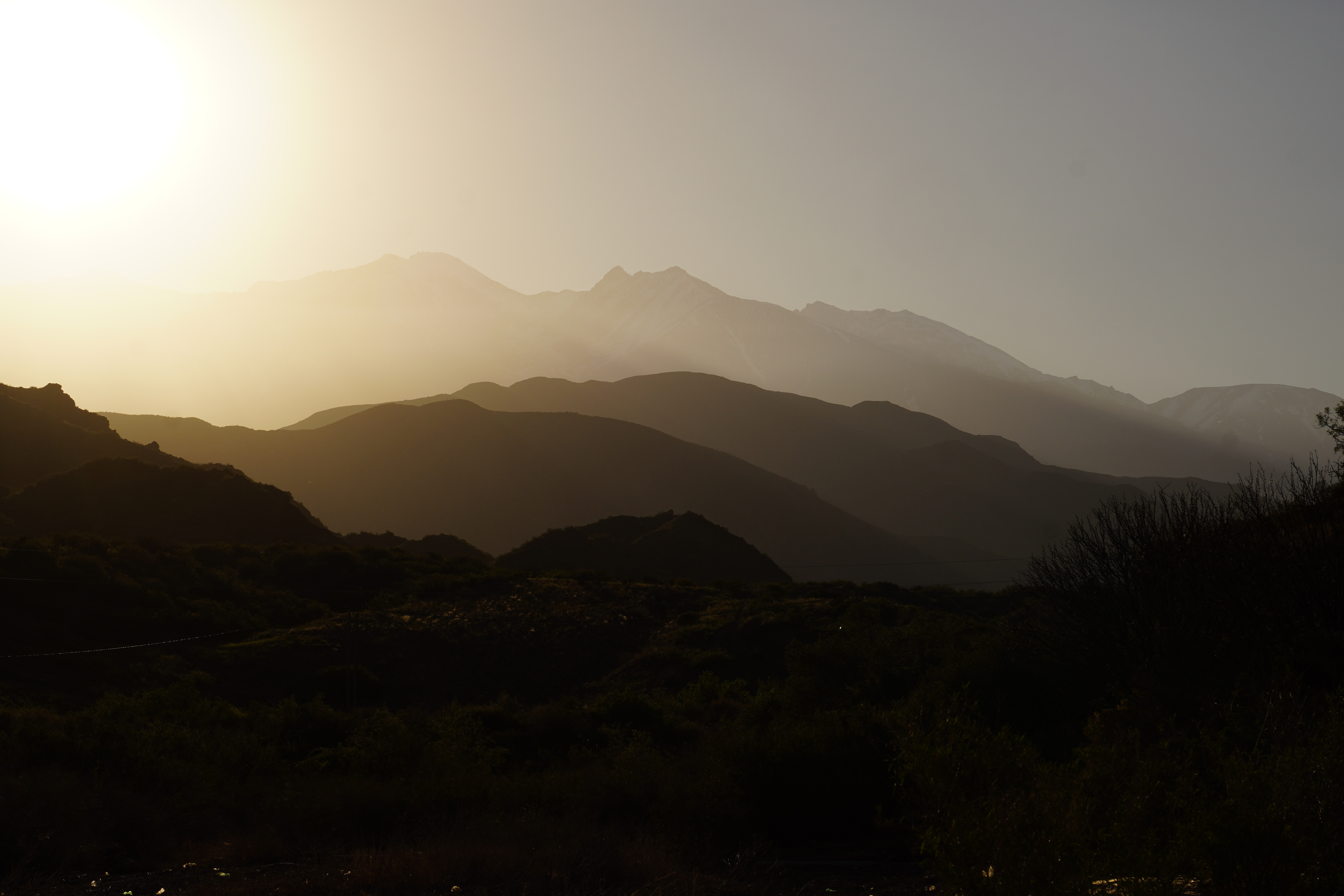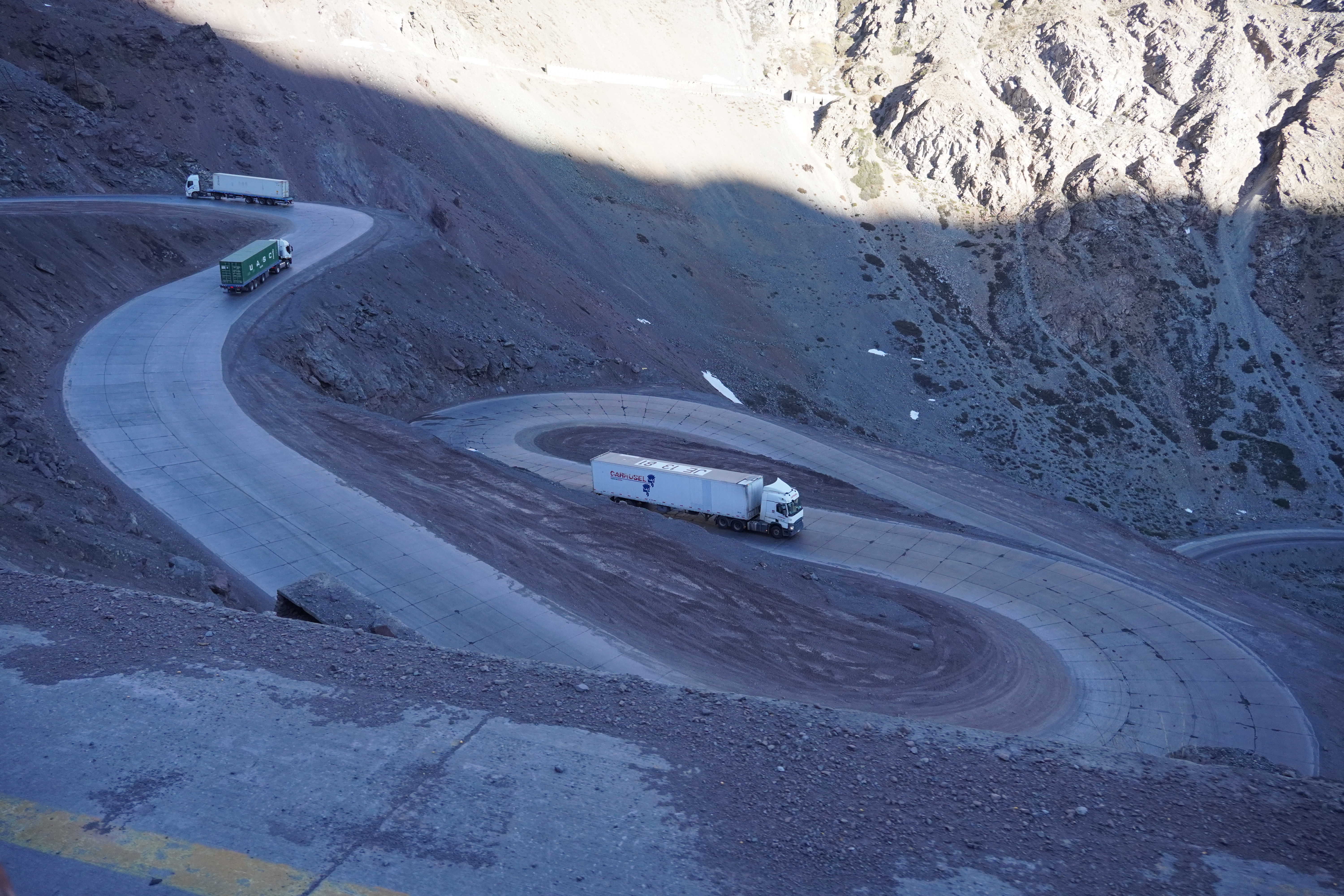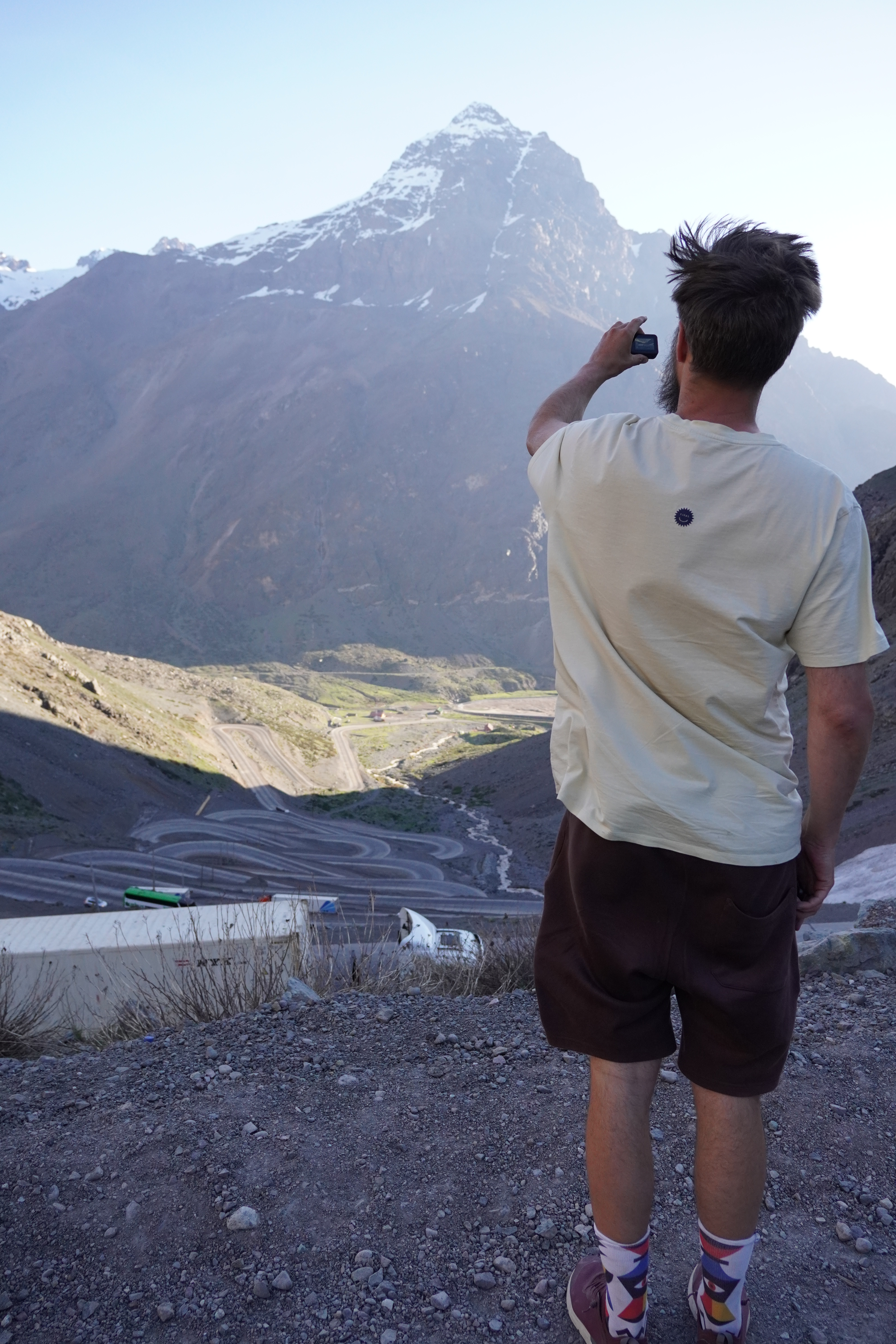 In the morning, we had jams from four countries with homemade bread, pancakes, coca tea, and the little bit of coffee we had left for breakfast. In Chile, we would finally get some decent coffee (so far, Argentina had the worst coffee, tied with Uruguay). Soon, our paths would separate. We exchanged the coconut milk we’d found in Chile (which isn’t available in Argentina) for coca leaves (to help with altitude sickness) and set off for Chile. Saskia and Dominik were heading south toward Ushuaia. We made a quick stop in Uspallata for a coffee and cinnamon roll at a Swiss café and drove past the highest mountain in the Americas. Aconcagua, at 6,961 meters, is the highest peak in South America and the tallest outside the Himalayas. It’s located in the Andes, on the border between Argentina and Chile. On the way to the border, we stopped by Puente del Inca. It’s a fascinating natural rock formation that spans the Rio de las Cuevas, known for its bright yellow and orange colors caused by mineral-rich springs. This impressive geological formation was once a popular spa before the mineral springs were closed. A young boy tried to charge us for parking, but we didn’t fall for it. We have to admit, though, that at just 8 years old, he was quite good at negotiating. However, there were no signs stating we had to pay for parking. It was probably worth a try – many tourists probably fall for it. Now, we were about to drive on the most challenging road yet. Paso del Aconcagua is a mountain pass at around 3,800 meters that connects Argentina and Chile. It’s only passable in summer and had been closed for weeks before due to heavy snowfall. Today you can take a short tunnel on top and don’t have to go all the way up. Rosi could barely accelerate in third gear, but she handled it without complaint. We didn’t feel the altitude. The landscape was barren, it was chilly, and we could see some snowfields. It was already afternoon, and we weren’t really looking forward to the border crossing, as we’d heard that Los Libertadores is very strict. The customs building was futuristic. It felt like being in a computer game as we drove through a tube-like road into the round building. A completely covered border crossing, very modern, with individual booths. We were lucky, and the older Chilean border officer, who was planning to move to Switzerland soon, was more interested in making small talk than checking our car. Still, a sniffer dog was brought in, which left some cute paw prints on our floor. About 20 minutes later, we were through and could focus on the second part of the pass: the descent. Los Caracoles, the road on the Chilean side of Paso del Aconcagua, is famous for its 29!!!!!!! tight hairpin turns. These steep, serpentine curves make the route both challenging and spectacular, overcoming around 1,200 meters of altitude. Slowly, with some photo stops, we drove down the road until we reached Rio Blanco, where we stopped for the night. I had read on iOverlander that it was a good spot to park near the fire station. We asked the firefighter boys there, and they said it was fine. However, when I tried to take a photo for my nephew Justus, the situation quickly escalated.