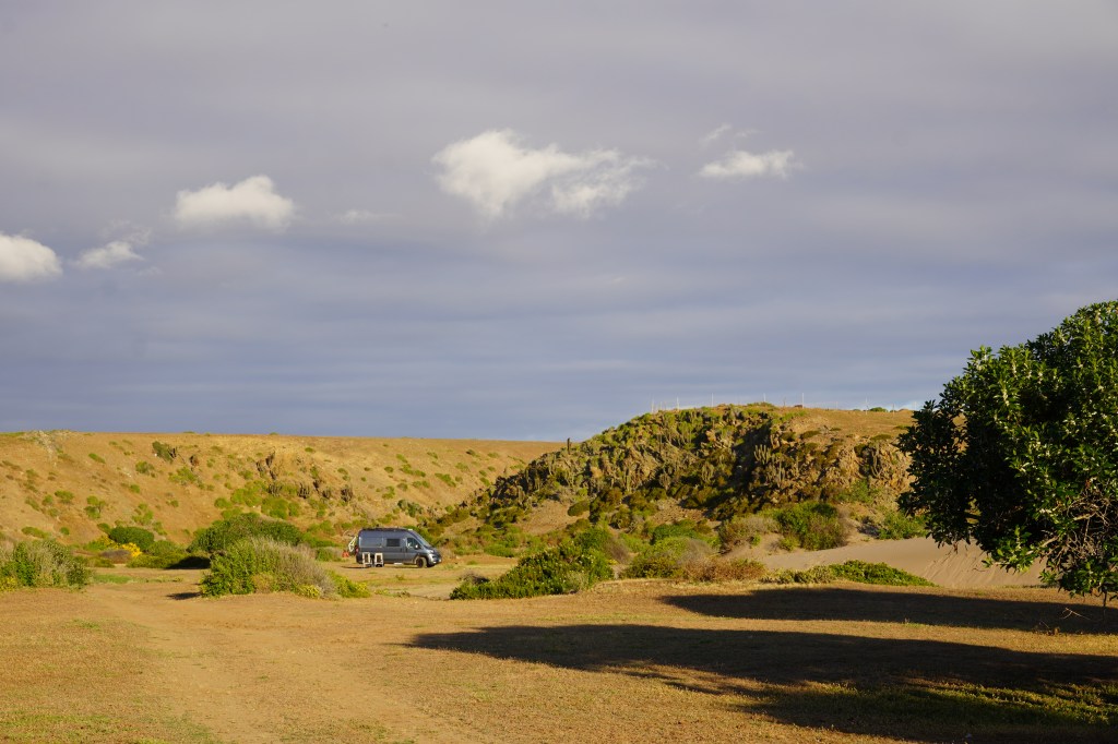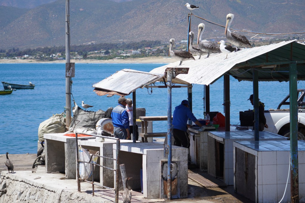 Back on the highway we wanted to make some kilometres and drove further North where we wanted to stay on a camp ground in Huntelauquen. When we arrived, we had to pass an official checkpoint to a protected area where the camp ground was and had to call it to find out that it was not yet open. But the lady at the gate told us we could stay for one night in the area, if we pay the entrance (which was less than the expected camp ground costs), so we paid and passed through the bad unpaved road into a small valley with a steep rocky path down to find a beautiful camp spot behind a massive sand dune. It was surreal and we made a little hike to the ocean and over the dune. The next morning we had to use the 4X4 to get back up the road and continued our way up North. In the little village Guanaquero we admired the huge pelicans that were waiting for free fish next to the fishermen and in Totoralillo we looked for the surfers in the water but without swell there was no surf.