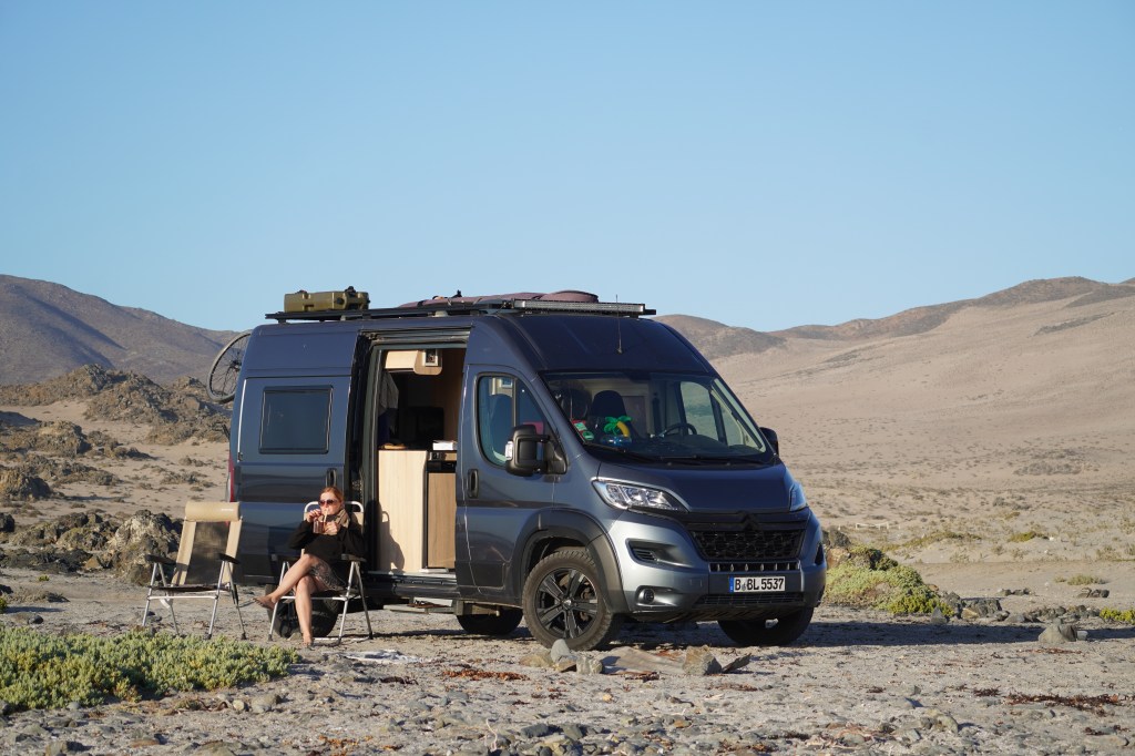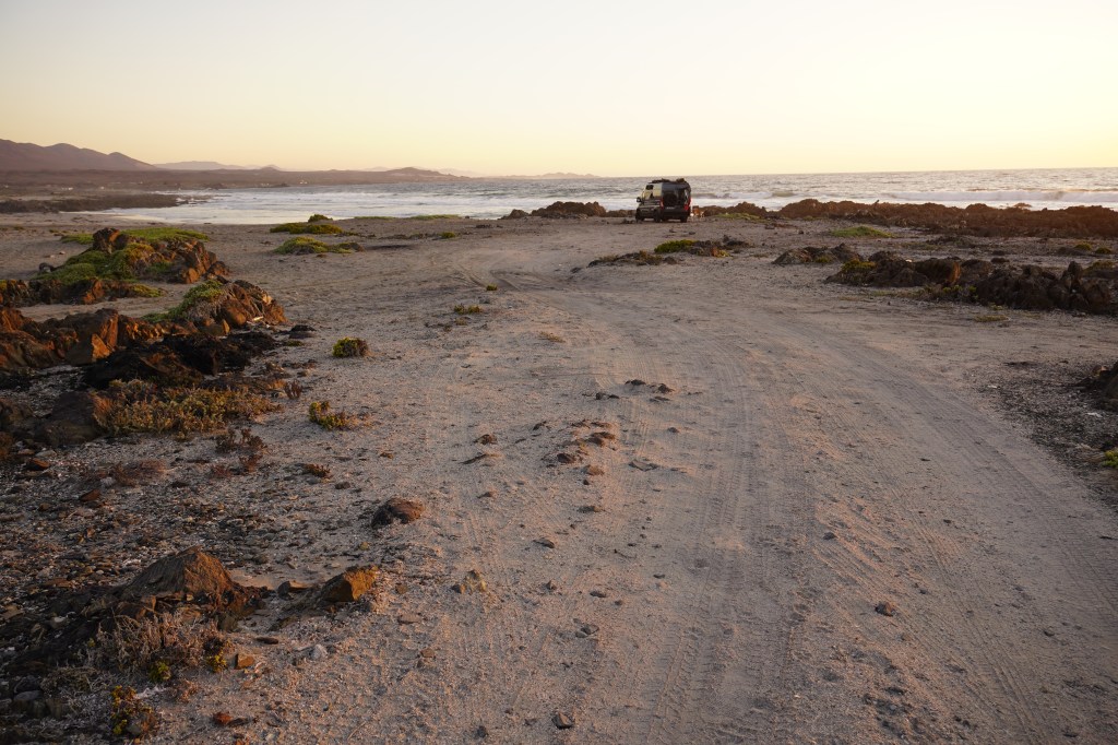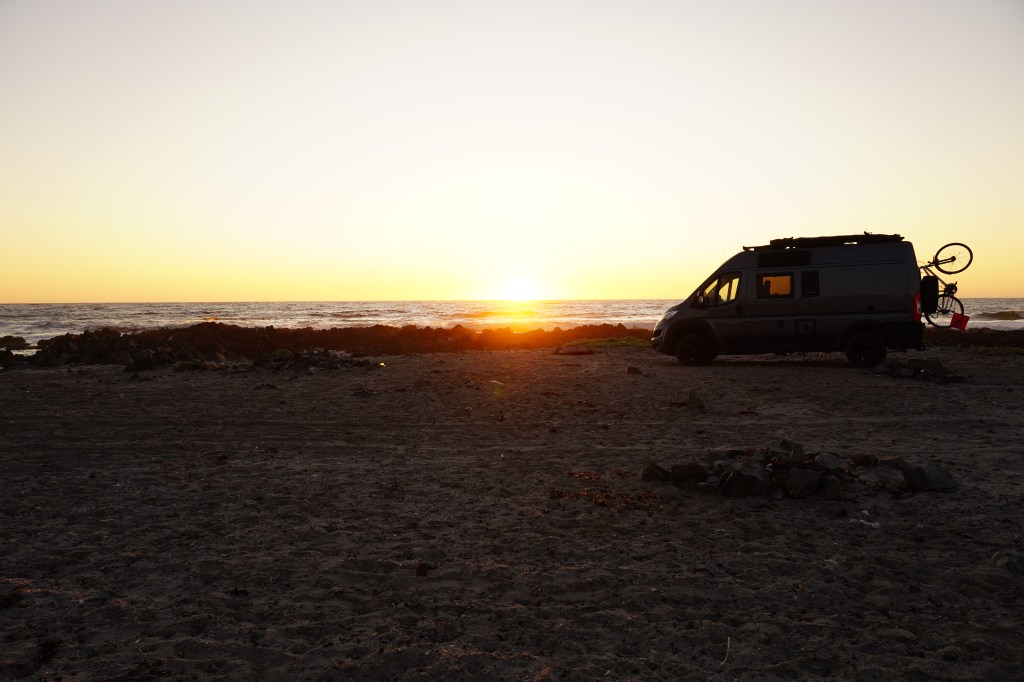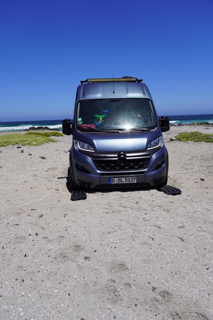 There we were 30m away from the perfectly paved road but stuck on the beach. Rosis 4×4 is a visco clutch, that means that the back wheels only engage when the front wheels slip. Sand seems to give enough resistance that the back wheels did not engage. So we started digging and used the sand trays, that we carry with us, to put under the front wheels. I pushed the gas and Rosi moved…. for about 2 meters. At the same time a tiny little chess figure flew out of the sand. Ever since this little chess figure is glued to our dashboard and is our lucky charm. We touch it before every difficult road section and it already has a greasy head. So we had to dig again after 2 meter, and again and again and again. After a while we built a way of stones after the sand tracks and that helped a lot. After 30 min we managed to be back on the road and I was relieved and happy and proud, that we both kept calm. Looking back at it we should have taken one of the other two ways and I also learned that we forgot one very important part to get out of the sand: We did not let air out of the wheels, which is normally the first thing you do. But nevertheless we managed to get out on our own and that felt good.