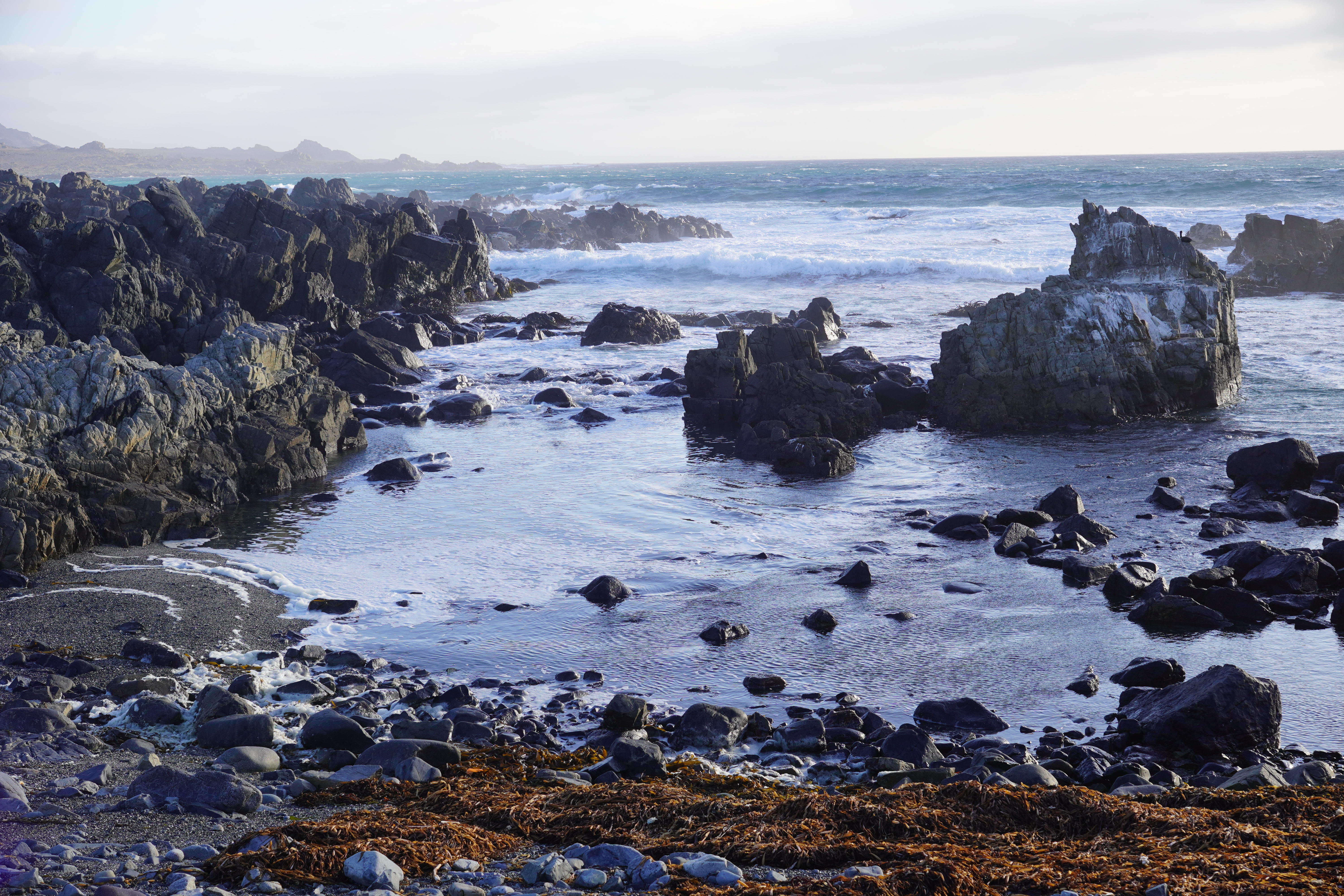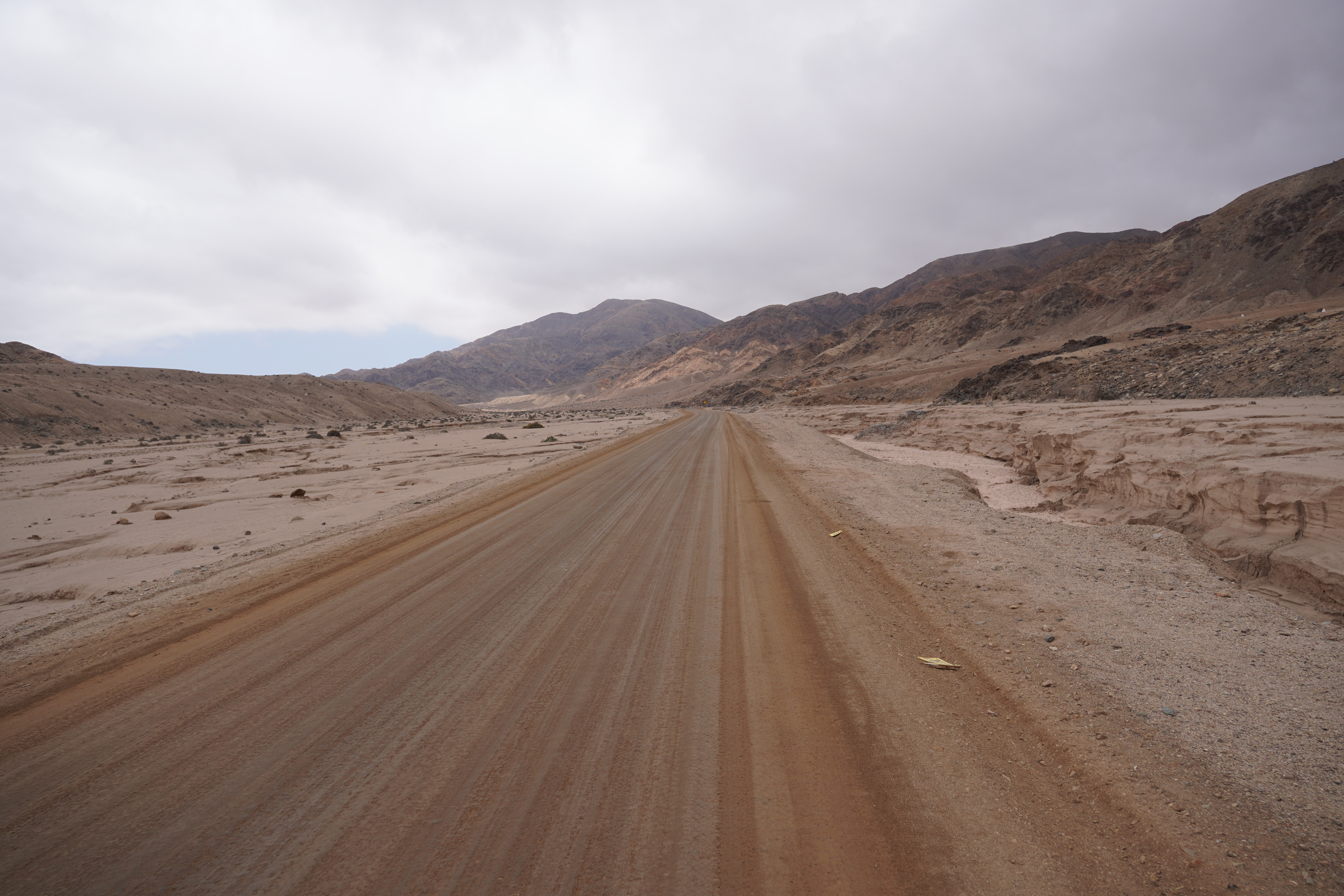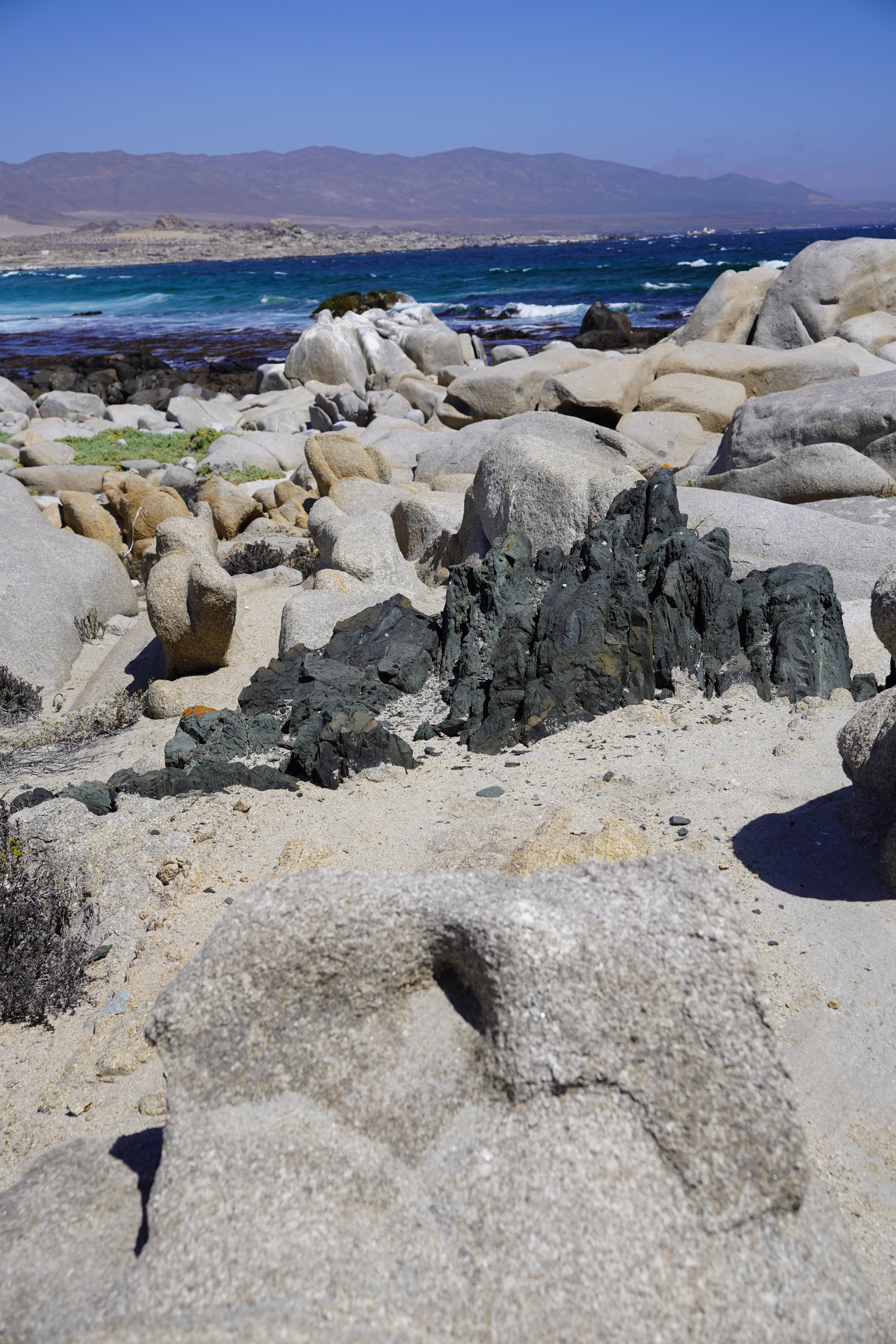 We started a hike along the beach under cloudy skies and did not really applied sunscreen. In the park, we noticed two people harvesting kelp. As we approached, they stopped. I doubt it’s allowed, though people seem to harvest and dry kelp along Chile’s coasts. Less pleasant was seeing jeep tracks in the dunes and on the beach. Our hike continued inland, where we saw numerous lizard species, cacti, and even a few tiny blooming plants. The ground was dotted with small holes, perhaps the lizards’ shelters during cold nights? Unfortunately, by the end of the hike, we both had painful sunburns on our legs. Despite the clouds and wind, the UV index here is extremely high. This was not my last South American sunburn… Aloe vera cream in hand, we drove north along the gorgeous, deserted coastline. The season here only starts in December, so we had the beaches to ourselves. The nature is stunning – if you can ignore the litter. Sadly, people here discard anything and everything in the wild. We’ve even spotted car batteries.