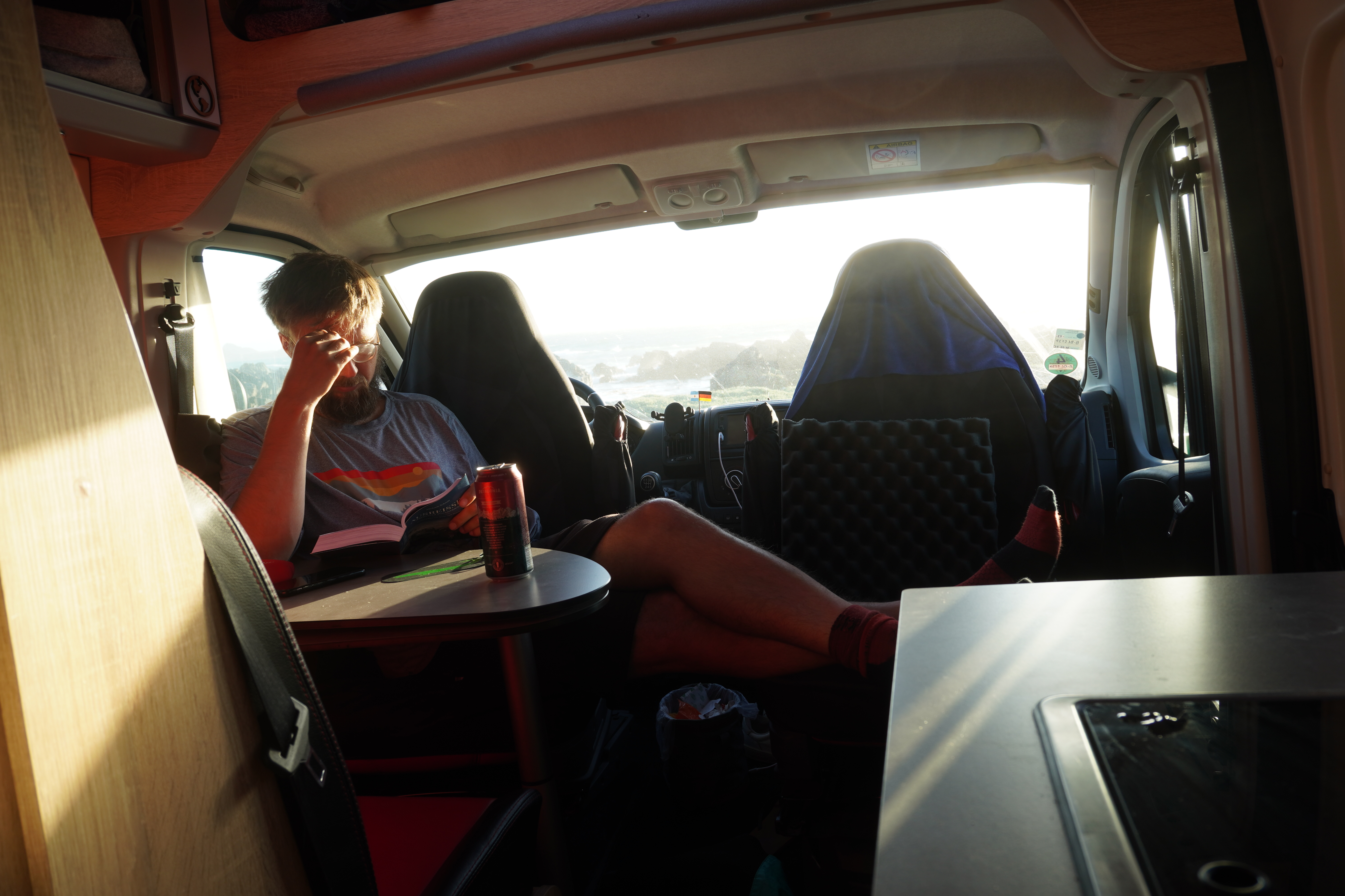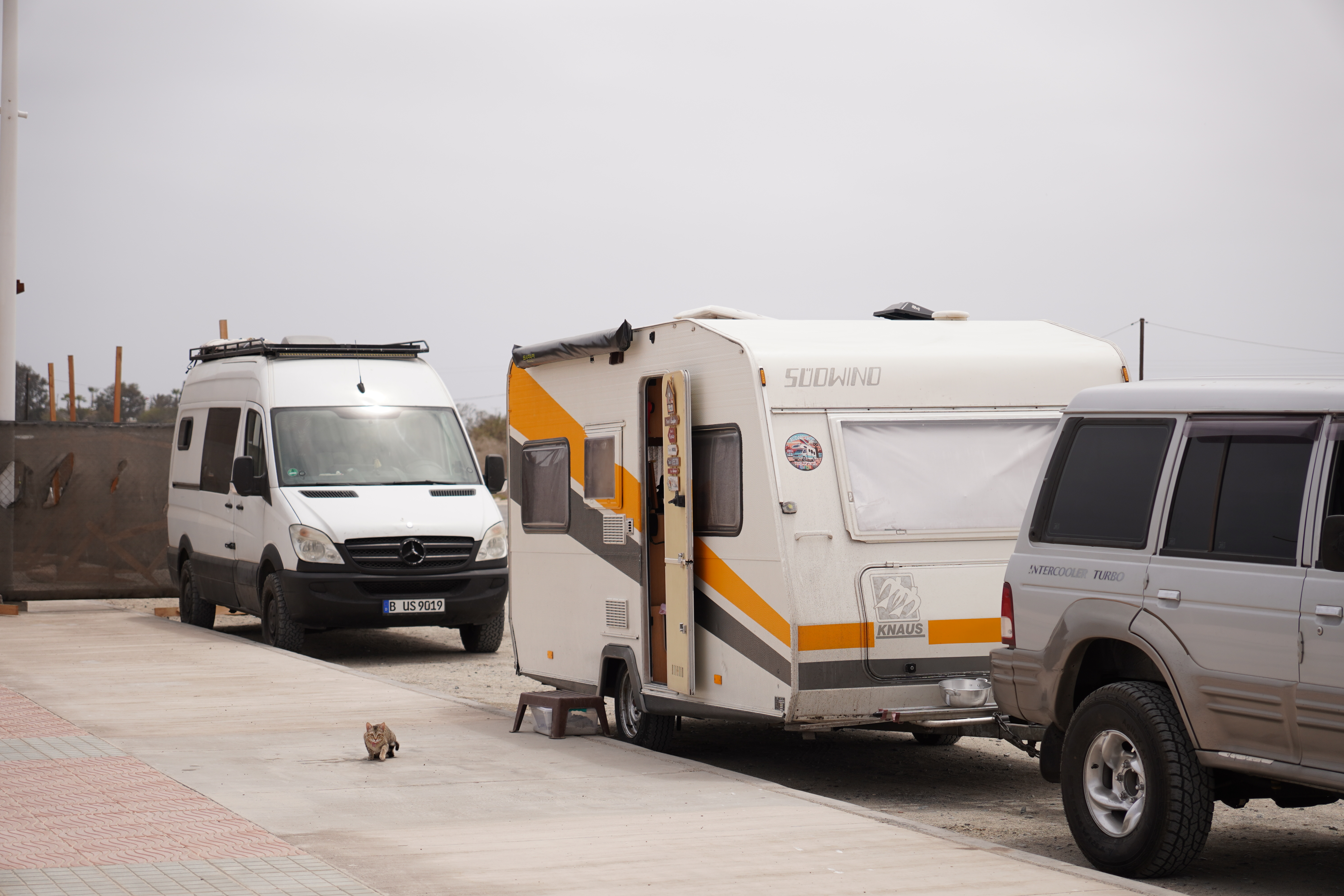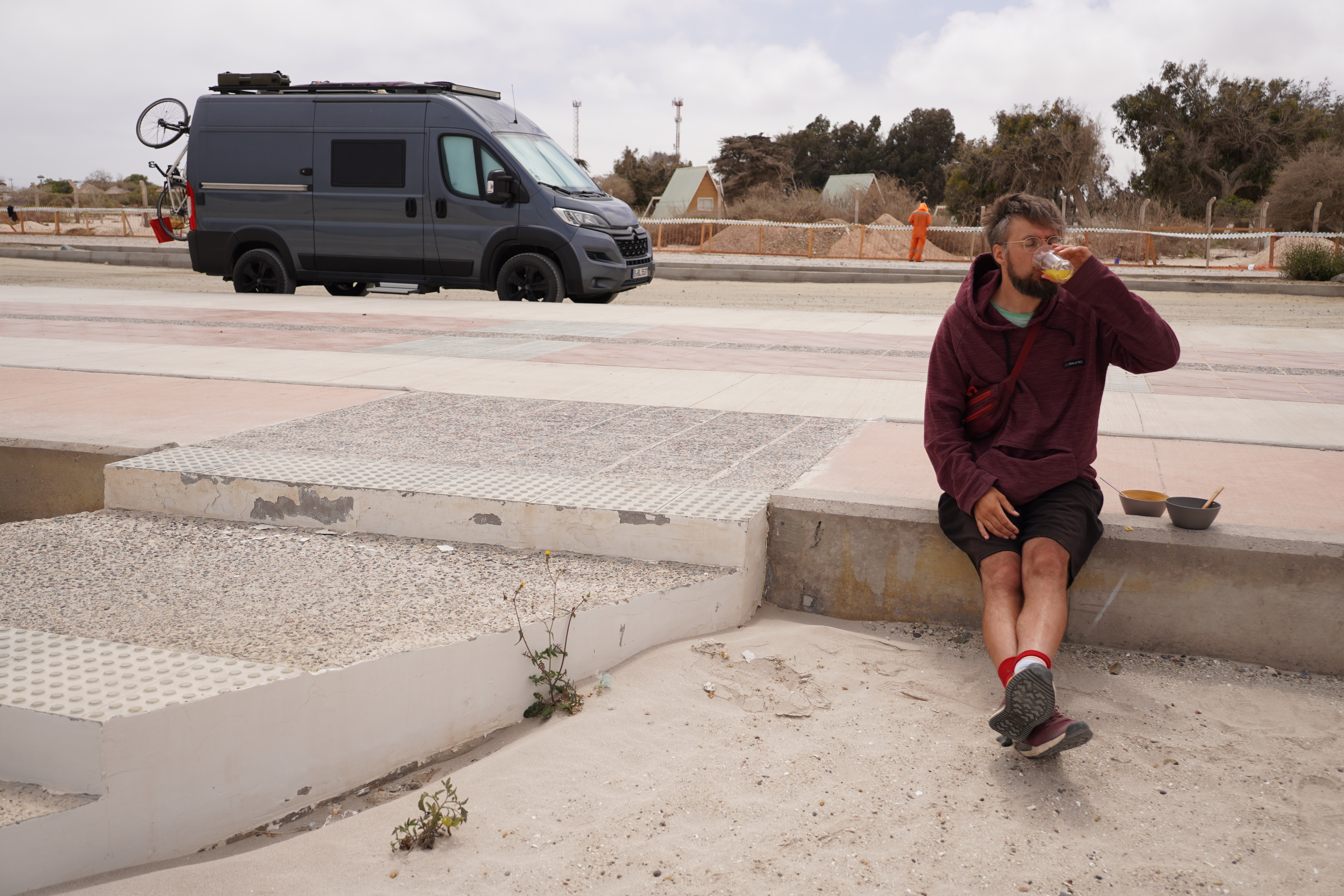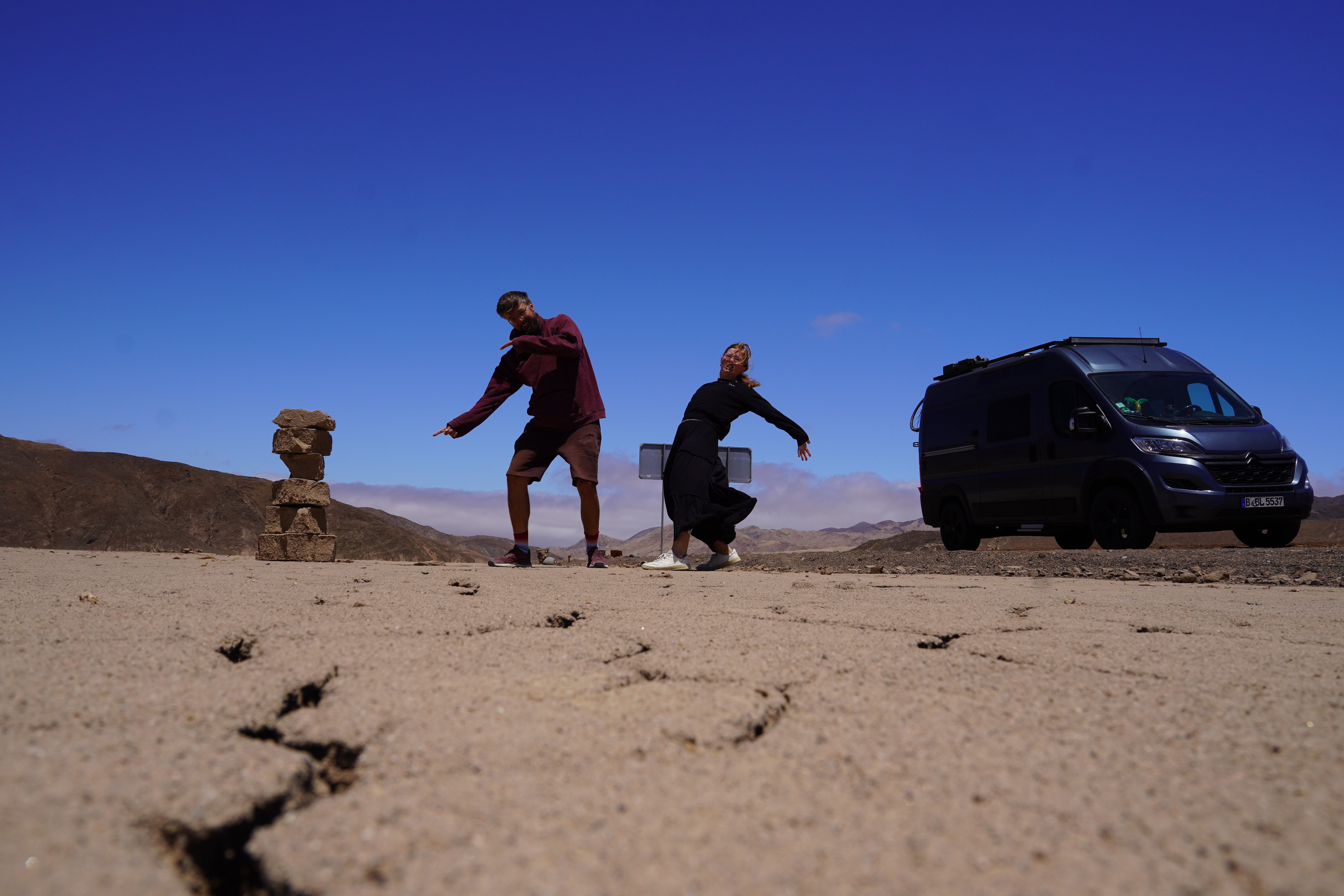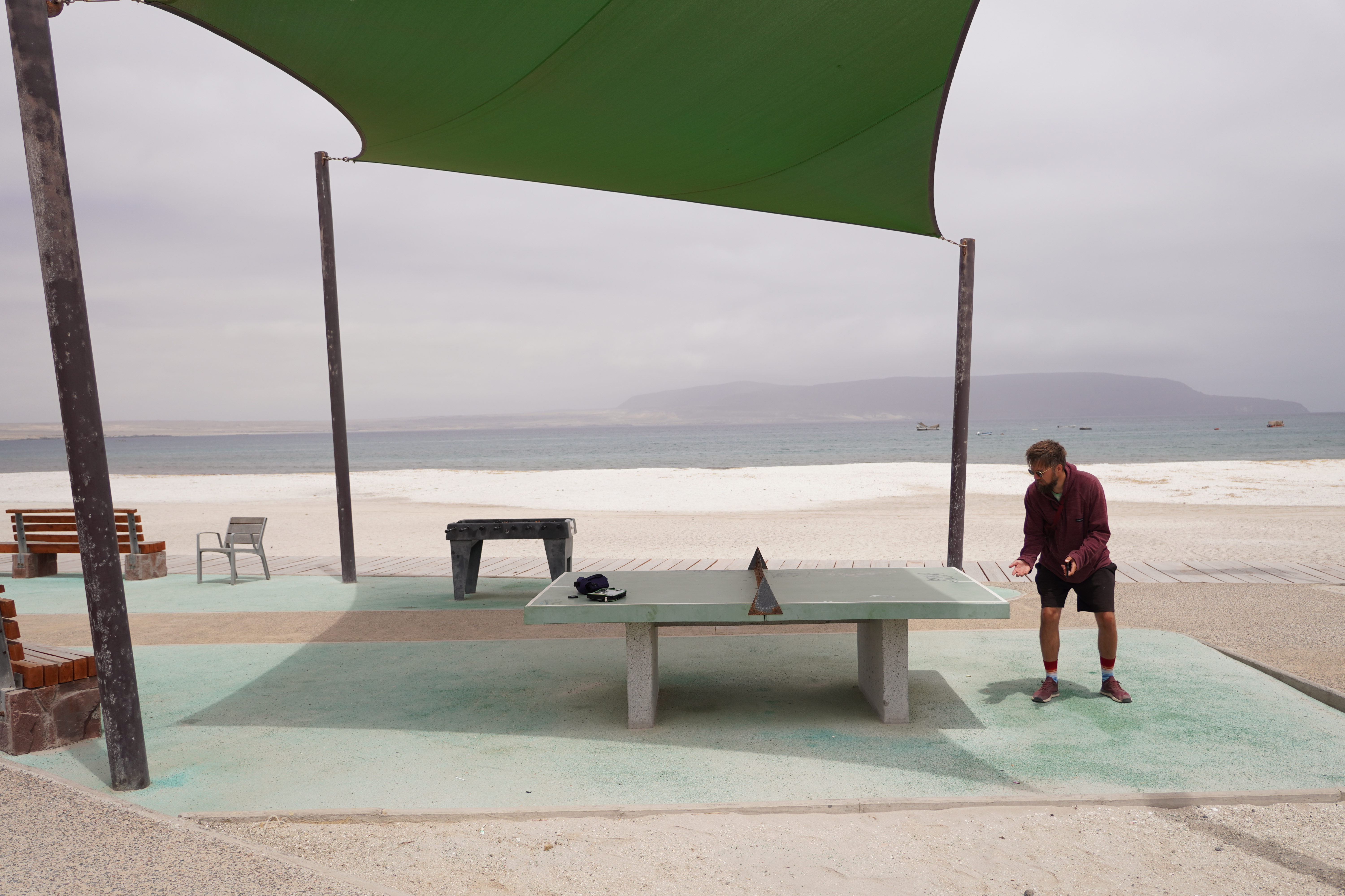We made a coffee break in Bahía Inglesa, known for its white sand beaches crowded with vacationers during peak season. When we visited, it was quiet, as the town prepared for summer tourists. Construction was everywhere. We found our first tabletennis table of the trip – what a flop! The wind made playing impossible. Seriously, who sets up ping-pong tables right by the sea? The normally bright-white sand was covered with a striking, smelly red mass – algae. A local assured us it wasn’t the toxic “red tide”, but we kept our distance anyway. For once, I skipped swimming. On the promenade, a few campers were parked. We met a Chilean family traveling with two kittens, which melted my heart. Further along the Ruta 5 – the Panamerican Highway – we reached Playa los Amarillos, a miles-long, deserted beach. There, we discovered a tiny nest with two eggs in the sand. I hoped no jeep had run them over. Chilean drivers love driving across beaches, even in protected areas. It wasn’t just the eggs we were worried about. Björn’s iPhone finally died here, too. The phone had been complicated since a screen replacement before our trip. In Montevideo, just before Rosi arrived, Björn had such bad hiccups in the hotel that I scared him to stop them. The phone fell to the floor in his shock, breaking the screen. Though repaired, it never worked properly again. Now, here in Chile, it gave up entirely. This night, the iPhone had to sleep inside a LocknLock container on the beach. Suddenly, we realized how dependent we were on it, for communication and safety. Our next stop: an Apple Store, 350 km away in Antofagasta.