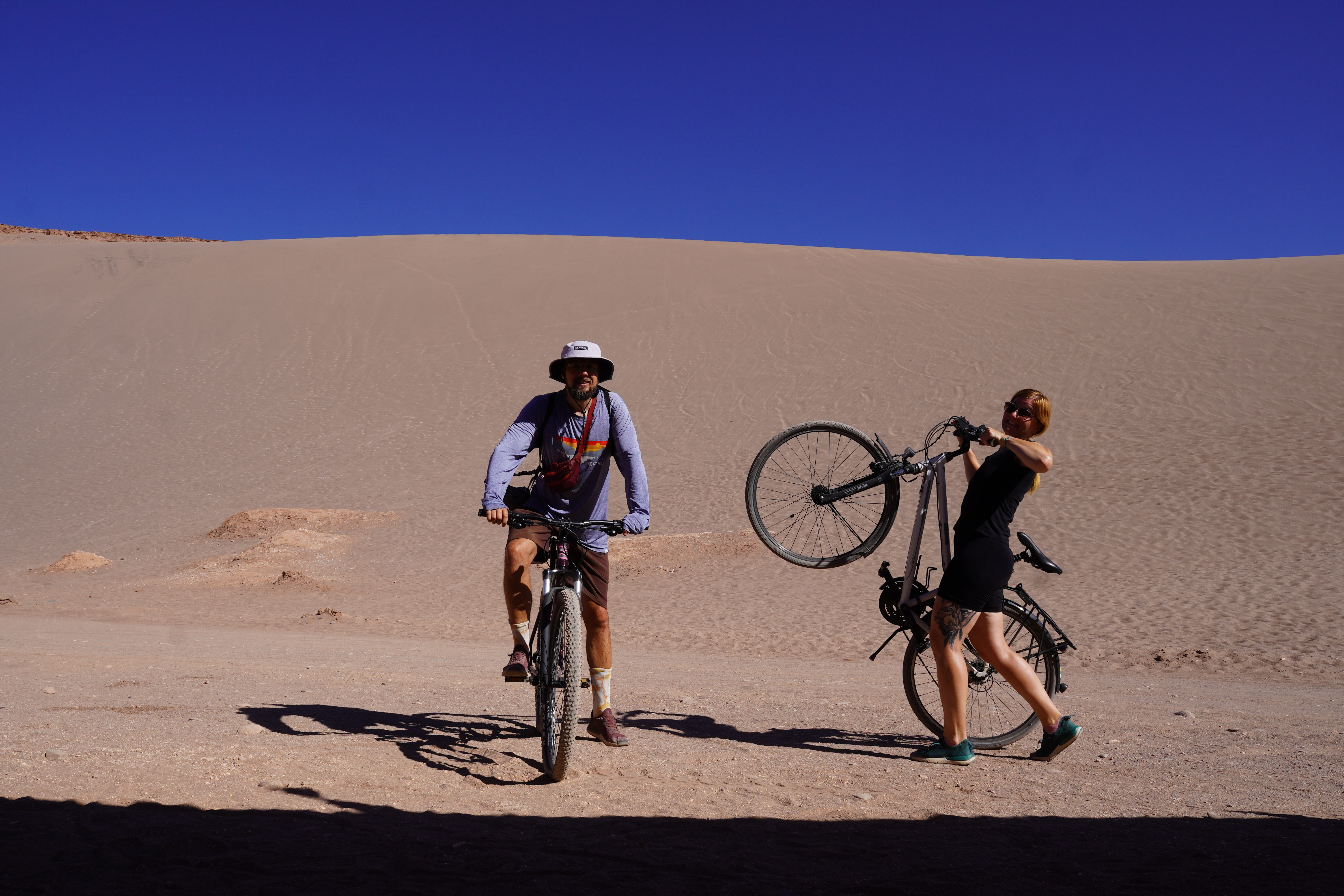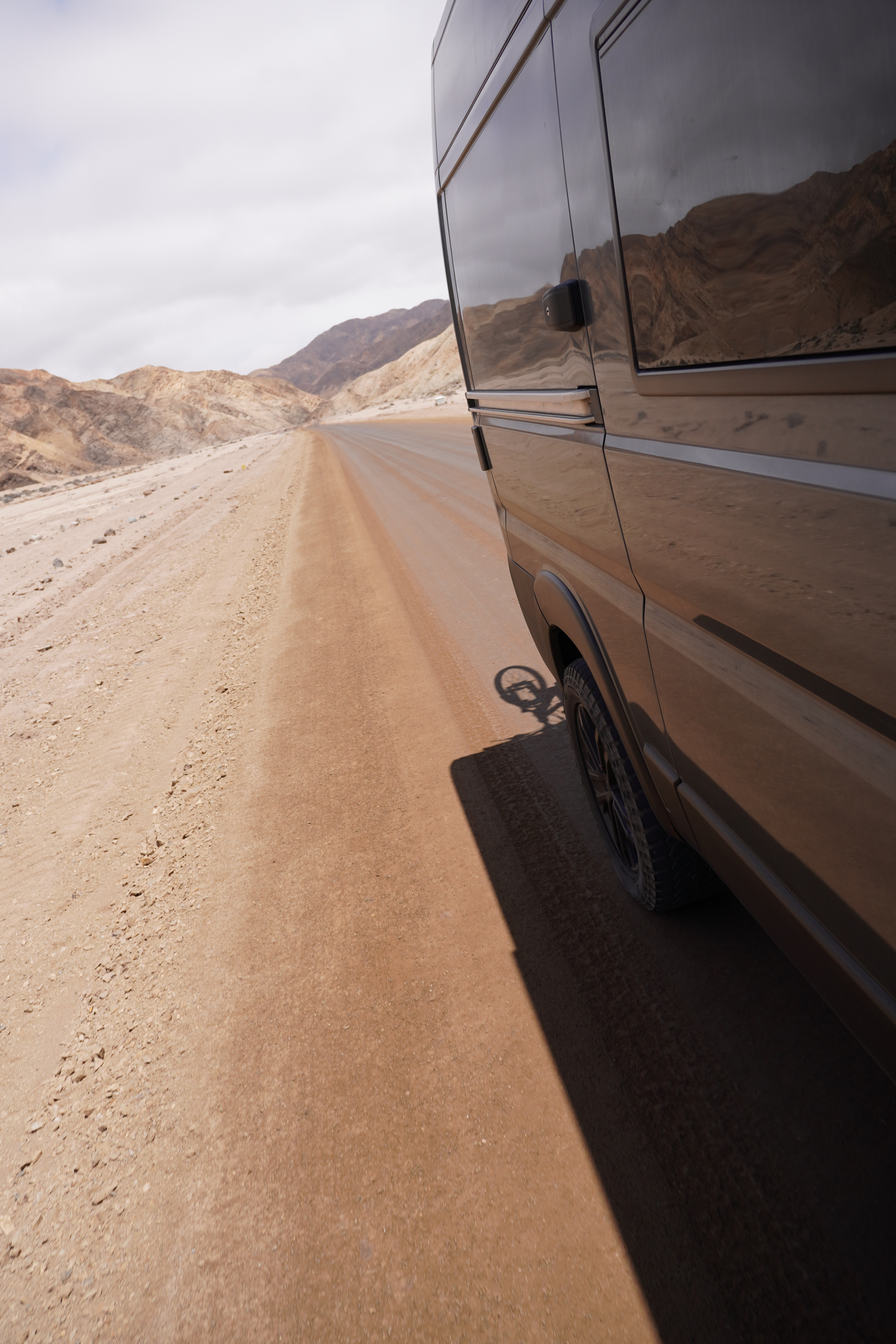 We drove through a sandy, red, moon-like landscape into the town. Traveling in the offseason meant most campgrounds were either closed or empty. The most highly rated one in San Pedro was fully booked, but we found a spot a few streets away. This wasn’t a typical campsite but a place where you could rent small bungalows with hammocks. We stayed with Rosi for three days to acclimatize to the altitude, San Pedro sits at 2407 meters above sea level. The highlight? A pool, which was great in the 30+°C heat. We used the time to prepare for La Ruta de las Lagunas, gathering information and stocking up on supplies. Unfortunately, we couldn’t bring fresh fruits or vegetables because of the upcoming border crossing. San Pedro de Atacama is known for its natural wonders, but we decided to take it easy, opting to relax and make the most of our time. We called Ina and Christoph, who were traveling south along the route, for updates on current conditions. They shared plenty of valuable tips. In a café, we met Lisa and Manu, two backpackers who had recently done the route with a guide. We spent the evening with them at a bar, swapping SIM cards for countries we no longer needed. They were heading south, and we were heading north. San Pedro had a fantastic desert-town vibe that we really enjoyed. On our last morning, we went on a bike ride and dune hike through Valle de la Muerte, starting early to avoid the heat. Despite wearing shoes and socks, the hot sand burned our feet. By the end, we each had at least 500 grams of sand in our shoes. We also took care of some essentials for Rosi: two full diesel canisters, a siphon hose for fuel to suck out of a tank (just in case), and a diesel additive to help the particulate filter burn off more easily at high altitudes. We knew diesel would be almost impossible to find in Bolivia. The country was also experiencing protests and widespread roadblocks.