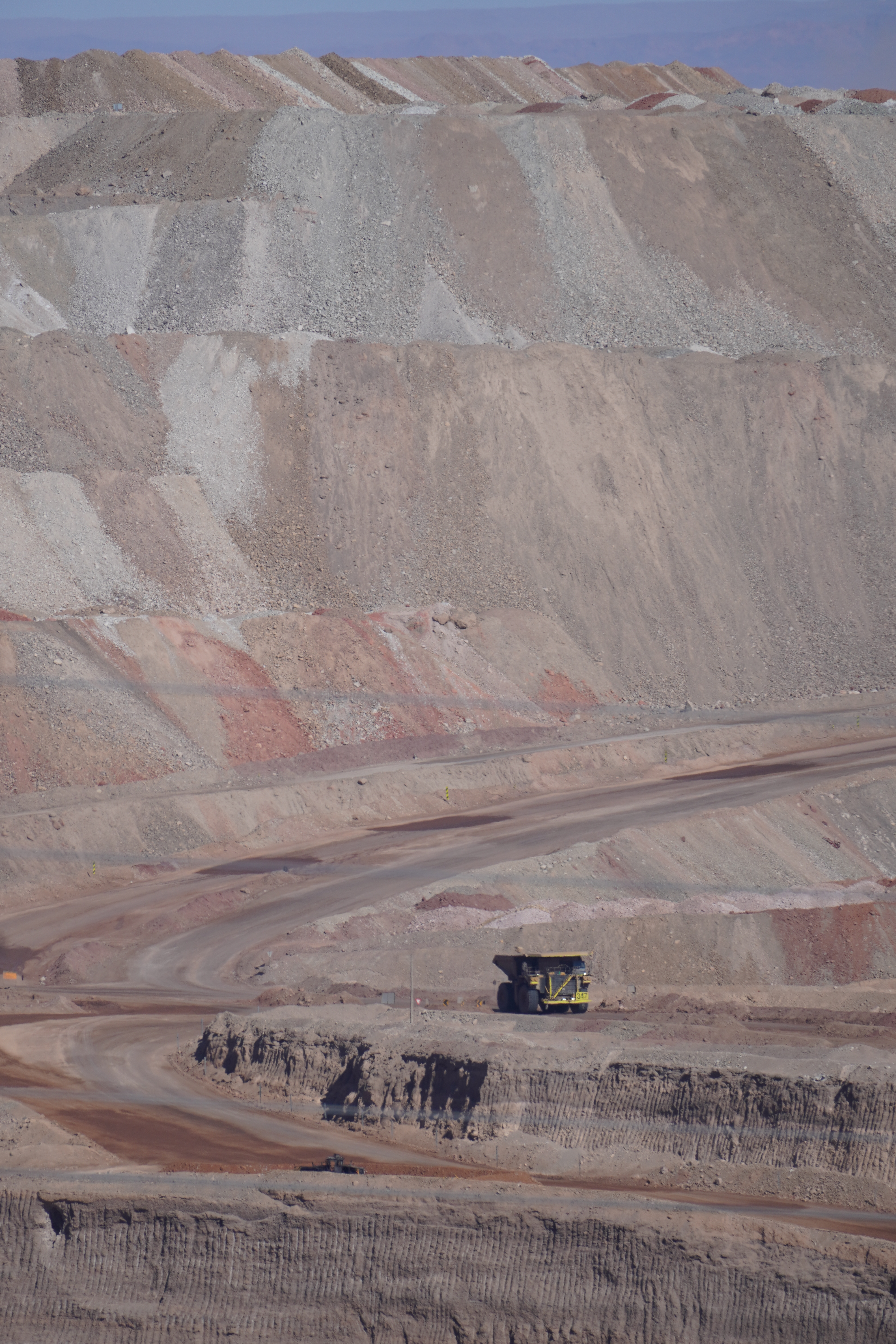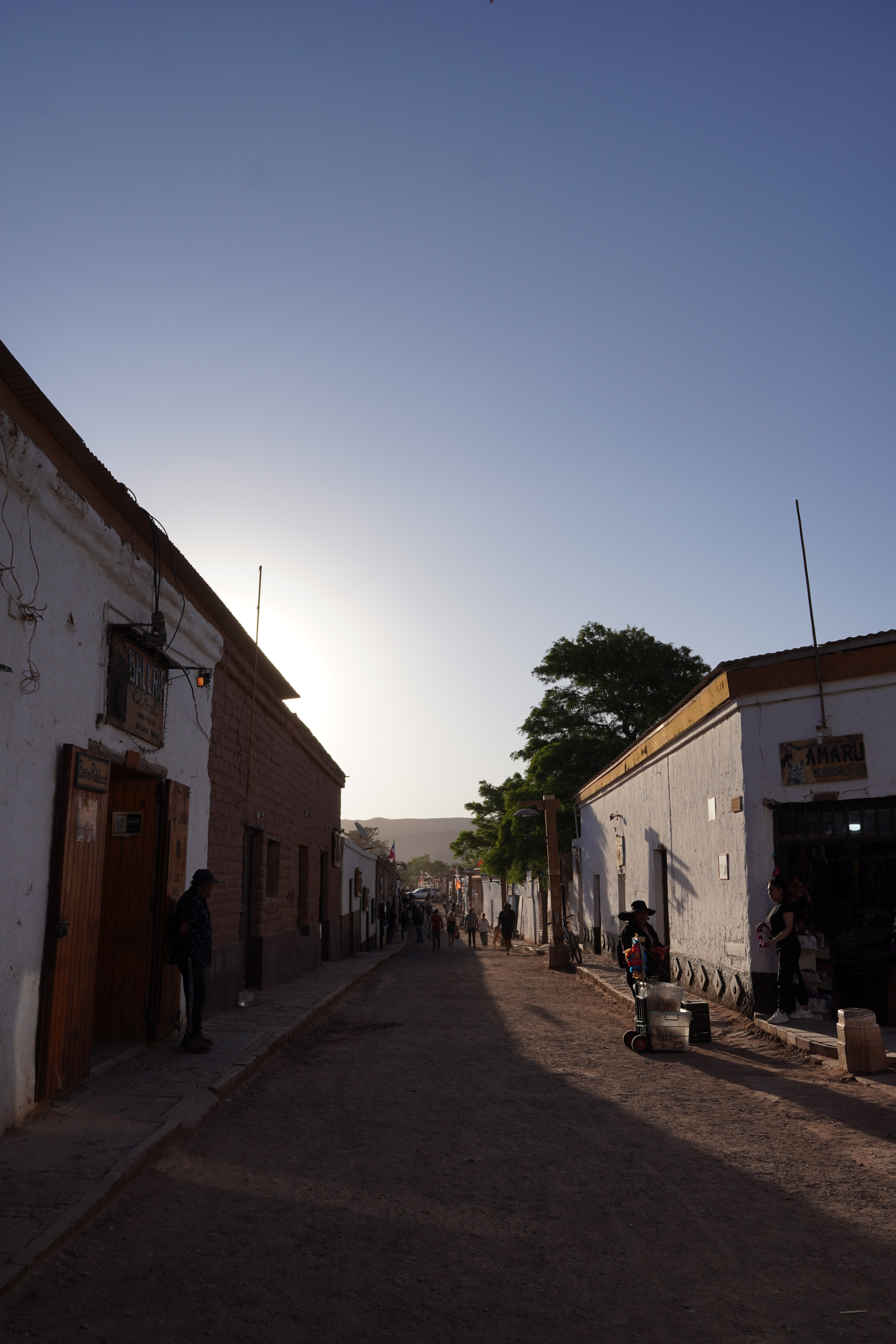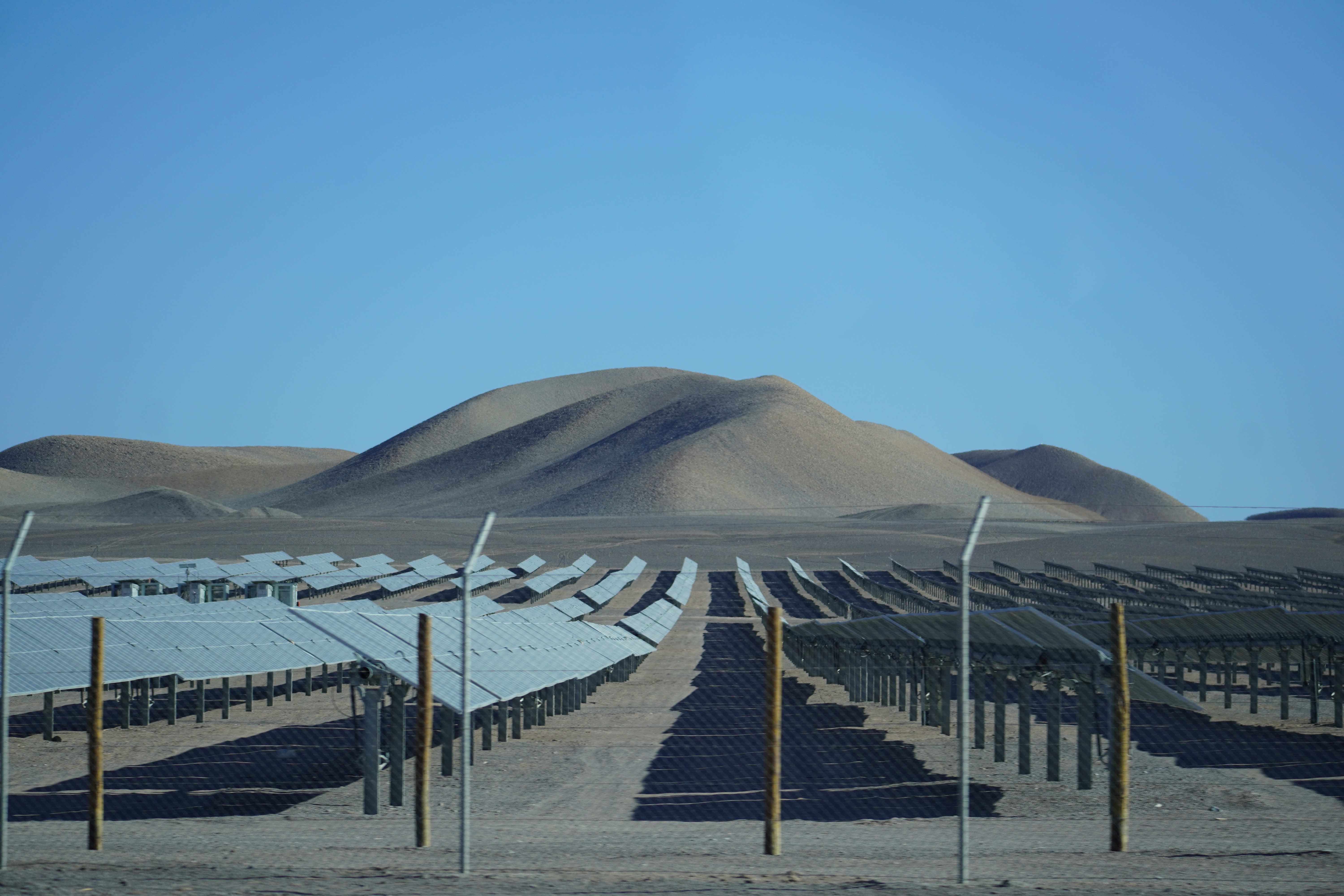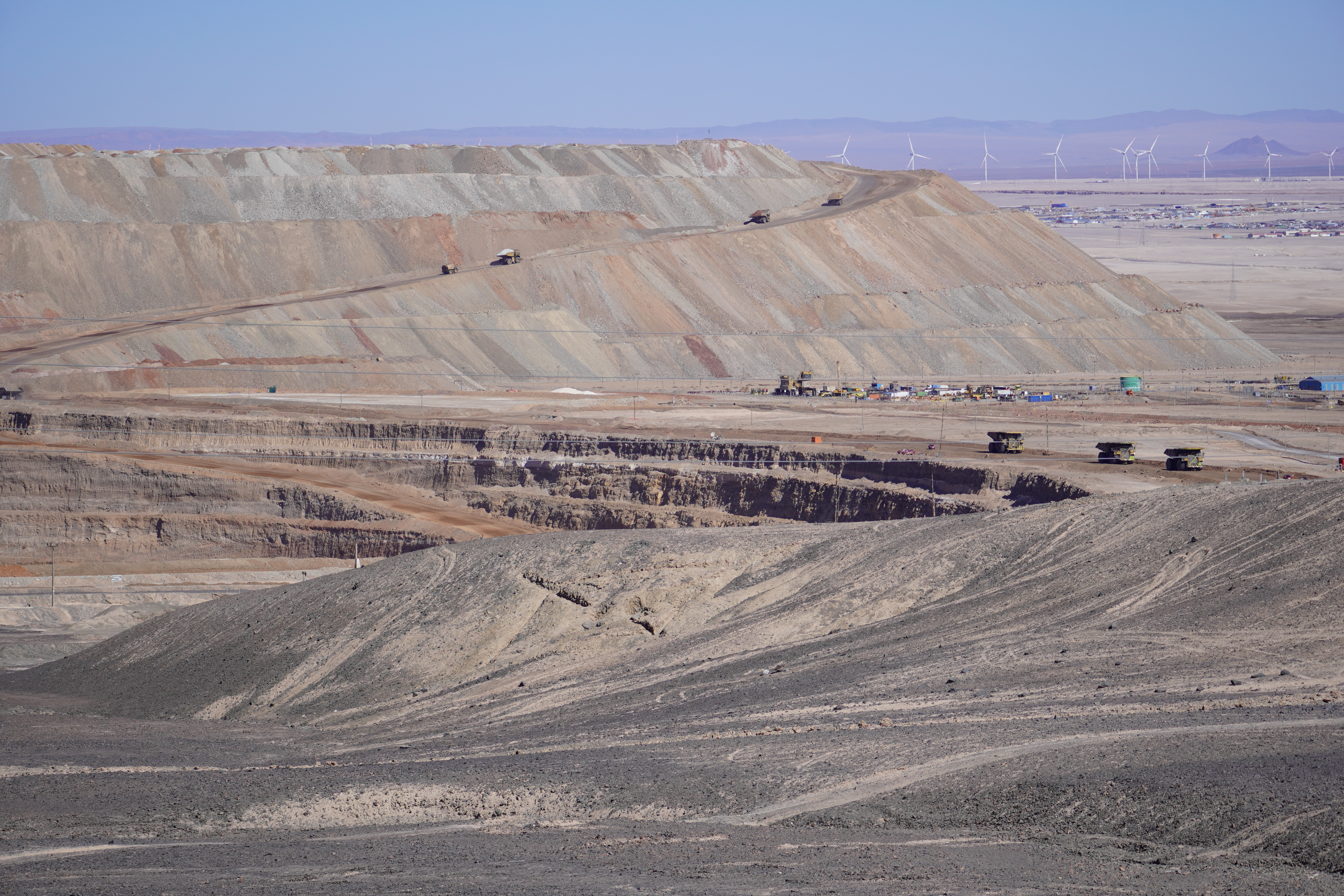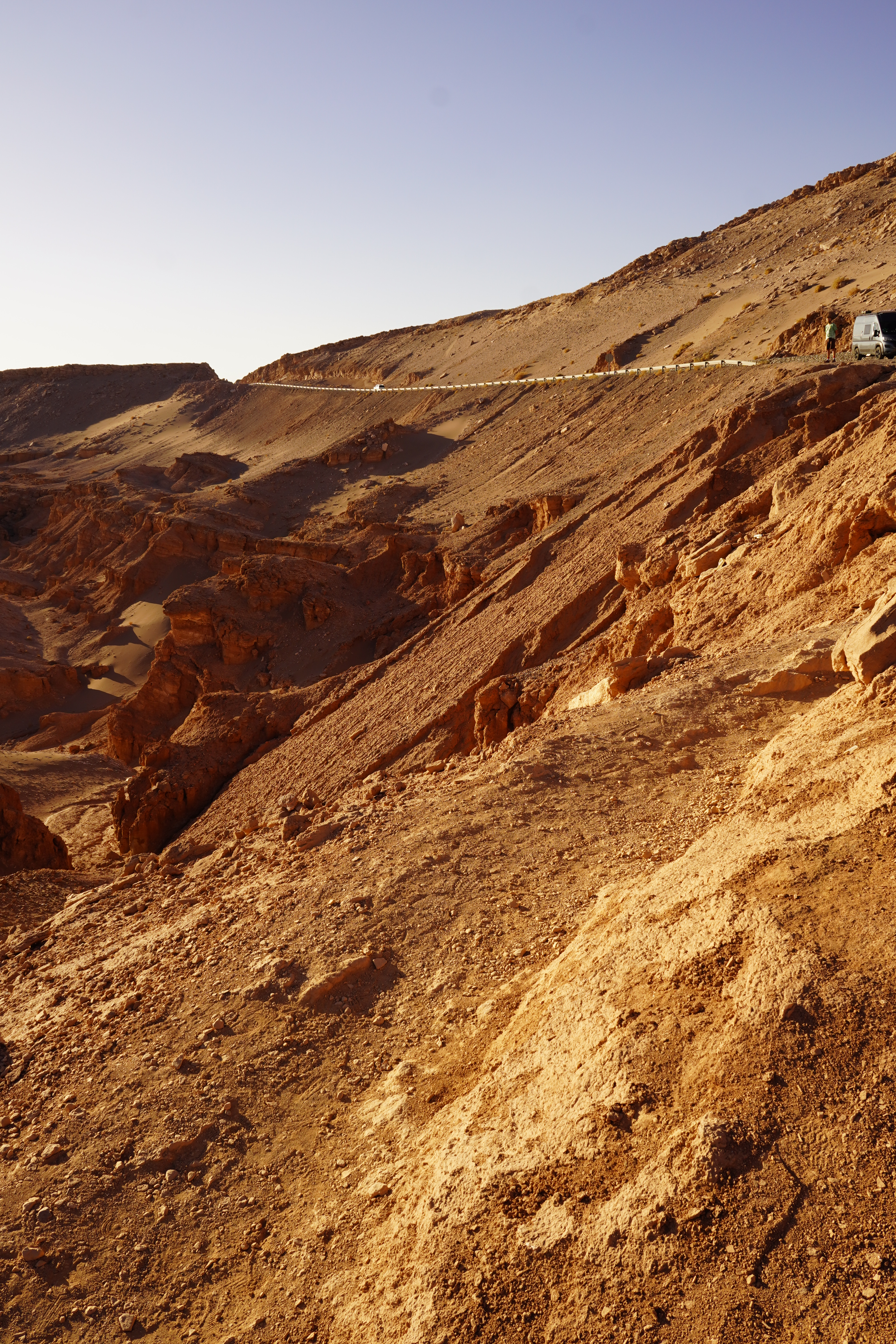 The next morning, Björn tried to restore his new iPhone using the Wi-Fi at the Copec gas station. But the connection kept dropping. After countless attempts and wasted time, we decided to move on. Driving through the blistering heat of the Atacama Desert, with temperatures soaring above 30°C, we found ourselves once again longing for Starlink. I discovered a free Wi-Fi spot in the small town of Baquedano. After several ice pops and nearly 40°C temperatures, Björn was finally able to set up the phone. However, the new iPhone had less storage than the old one, meaning it couldn’t accommodate the full backup. But it finally worked out. Once back on the road, we headed to Chuquicamata, one of the largest copper mines in the world. This open-pit mine is approximately 4300 meters long, 3000 meters wide, and up to 1000 meters deep. Enormous mining vehicles, with tires 3 to 4 meters in diameter, transport the rock. Surrounding the mine are massive waste heaps, an awe-inspiring yet unsettling sight. The town of Chuquicamata itself is now a ghost town. Its residents were relocated to Calama in the 2000s as the expanding mine made living there unsafe. Additionally, the buildings had to be cleared to make room for mining operations. Driving past wind turbines and countless solar farms, we continued towards San Pedro de Atacama.
