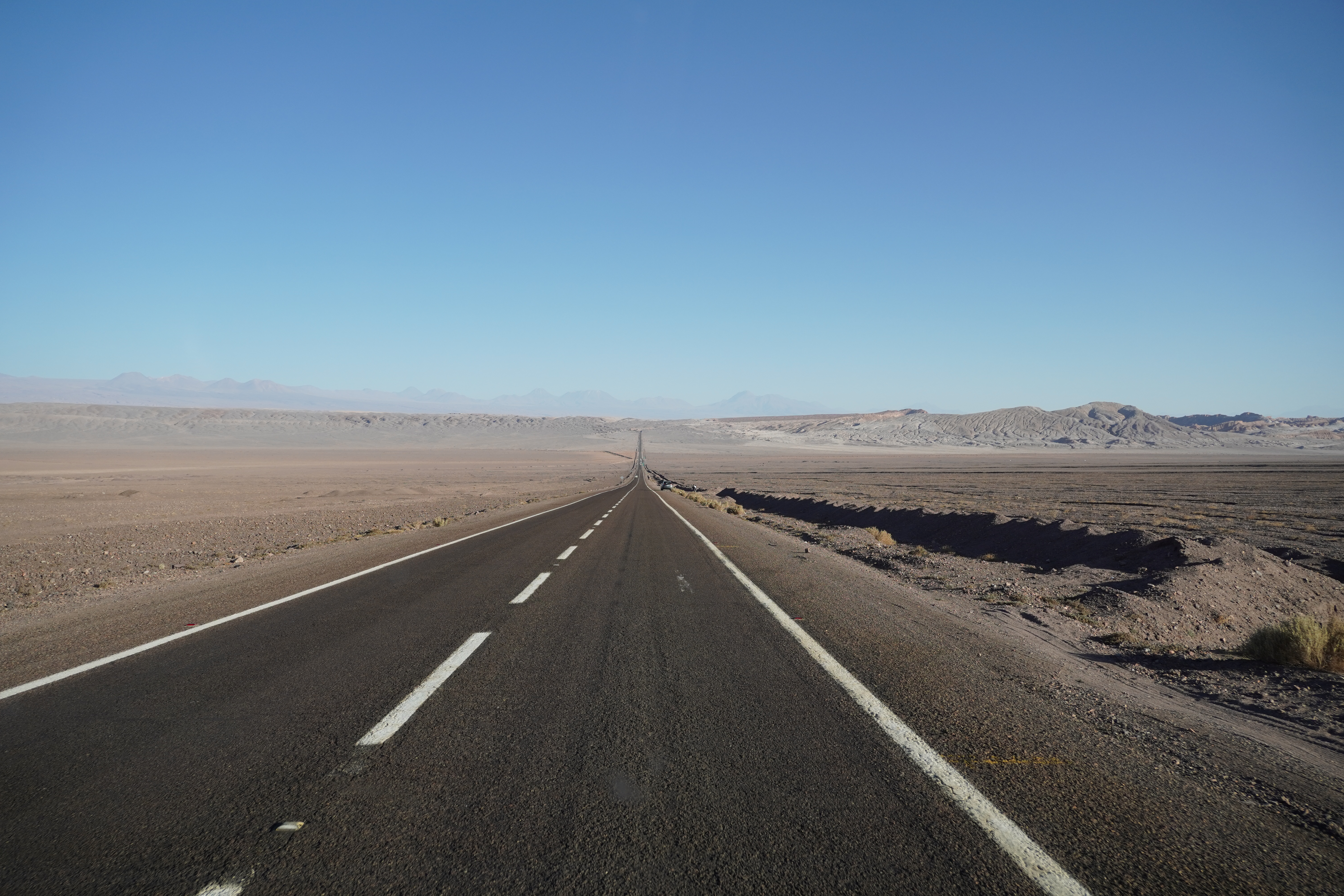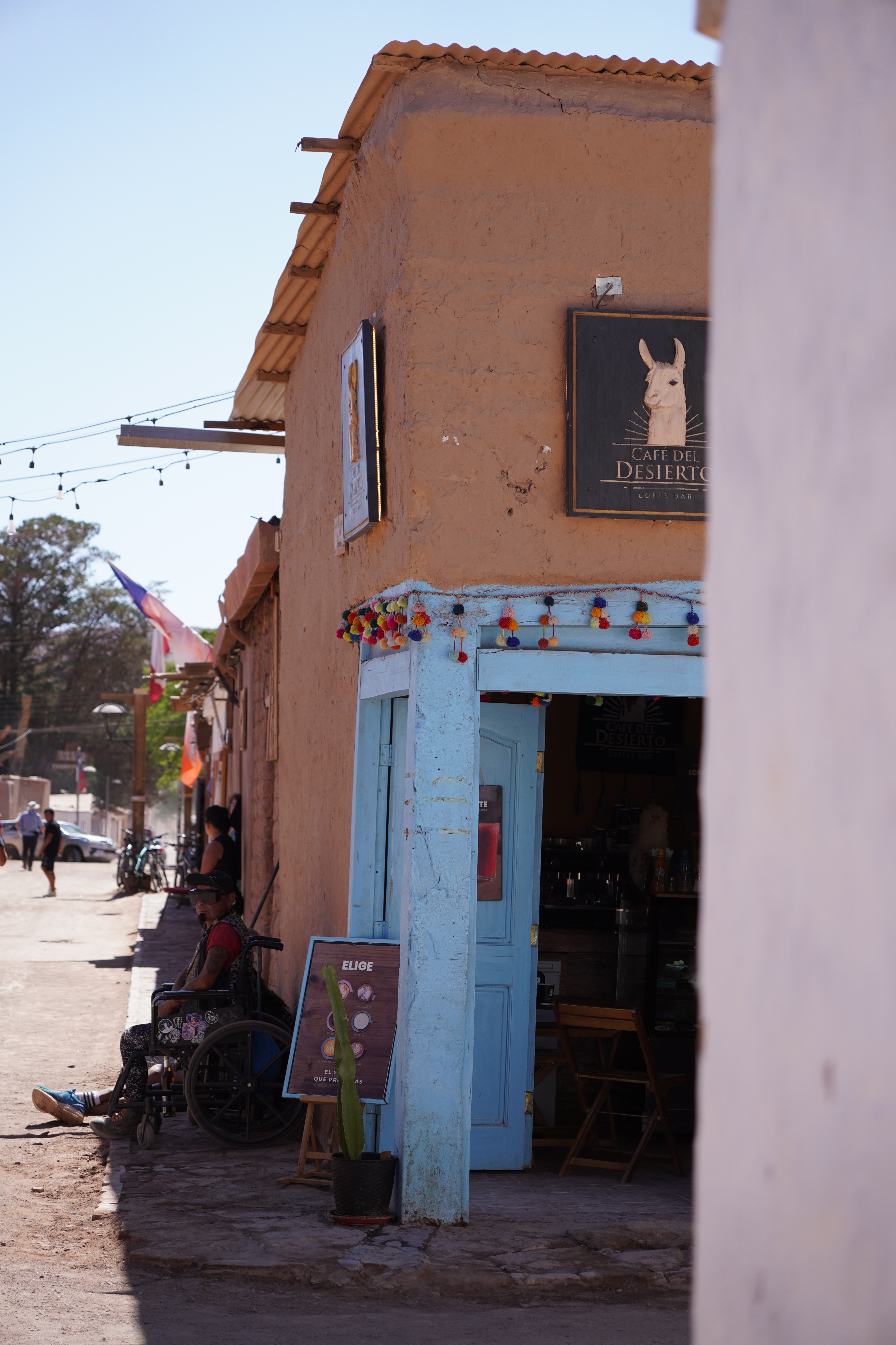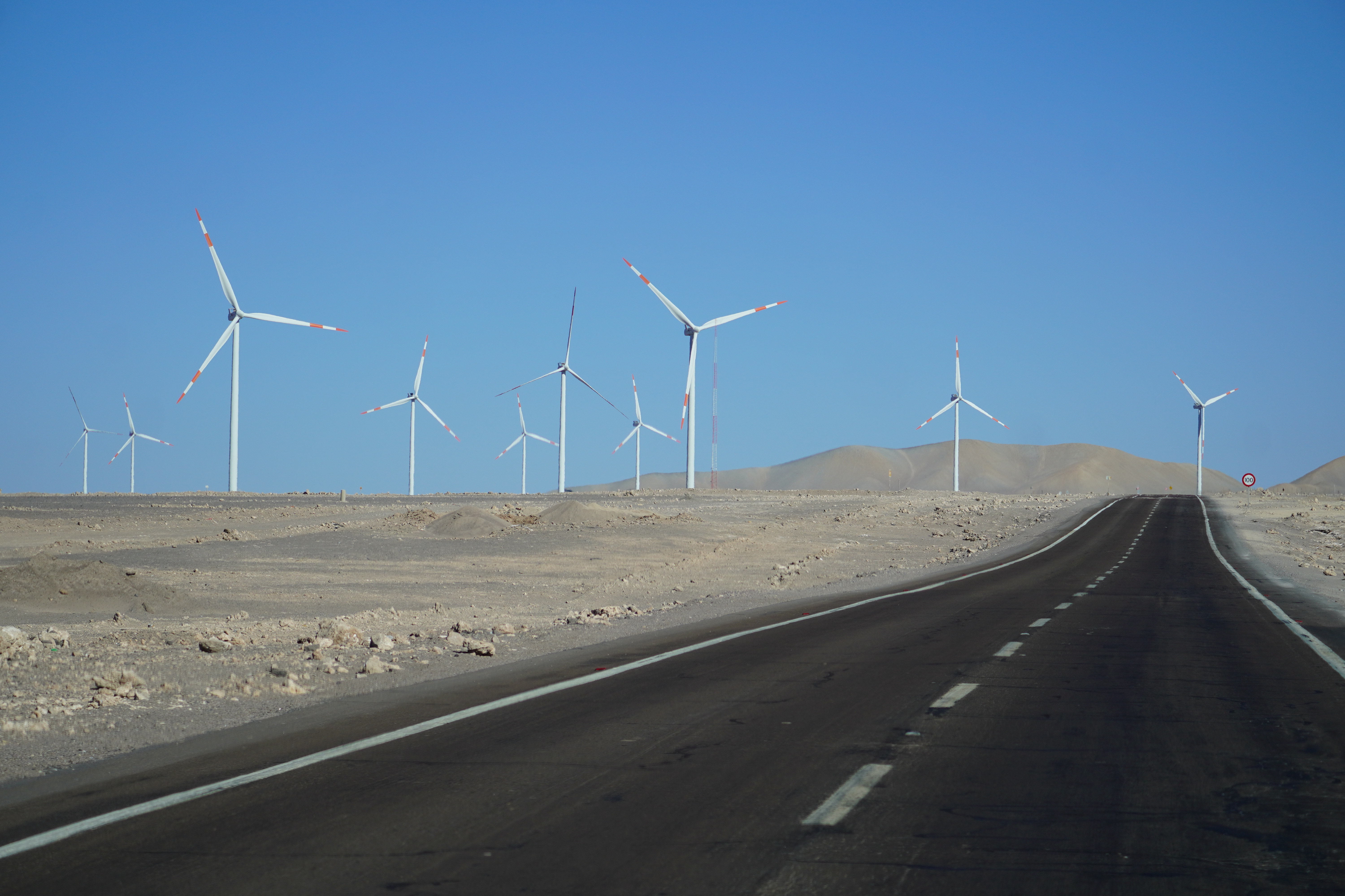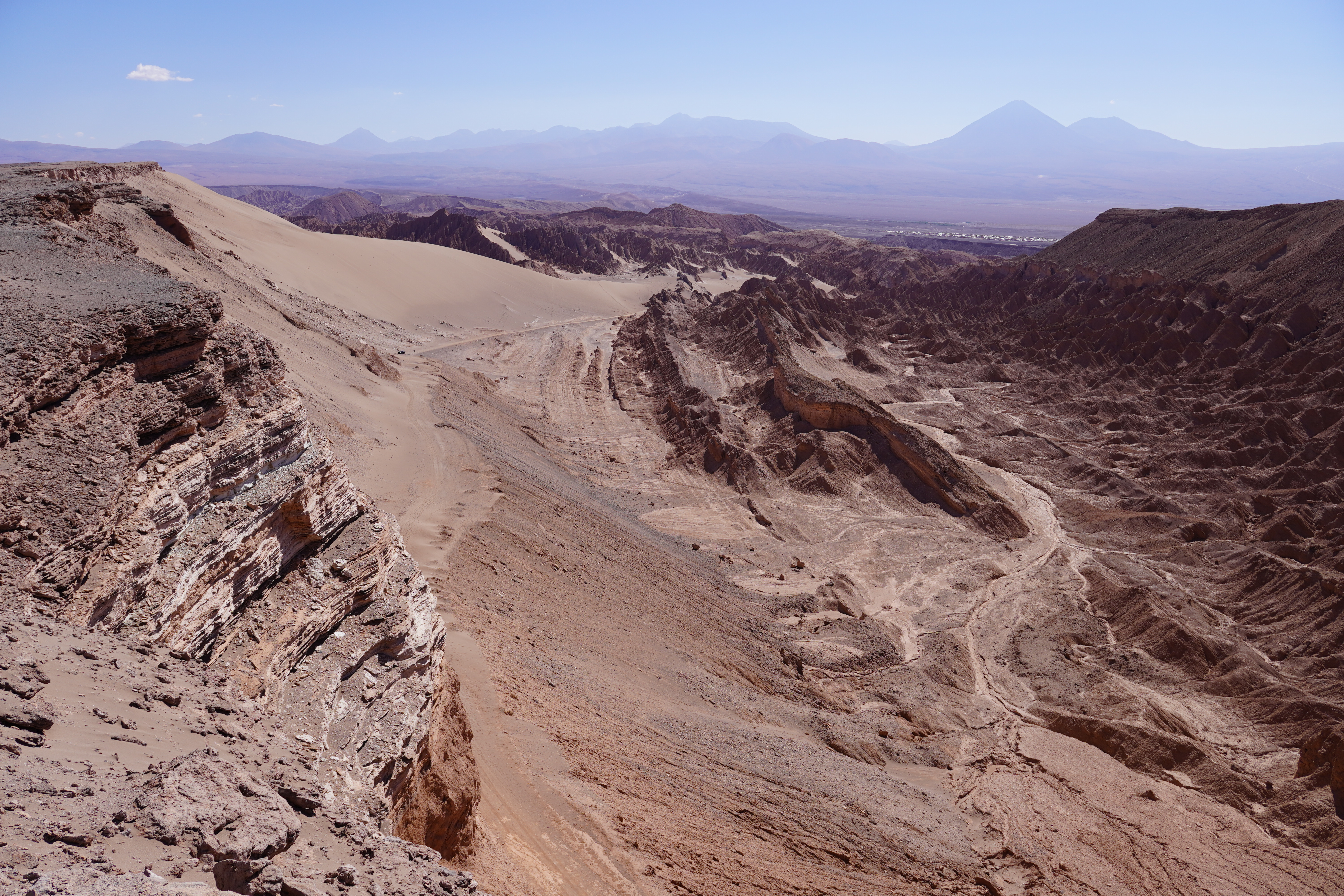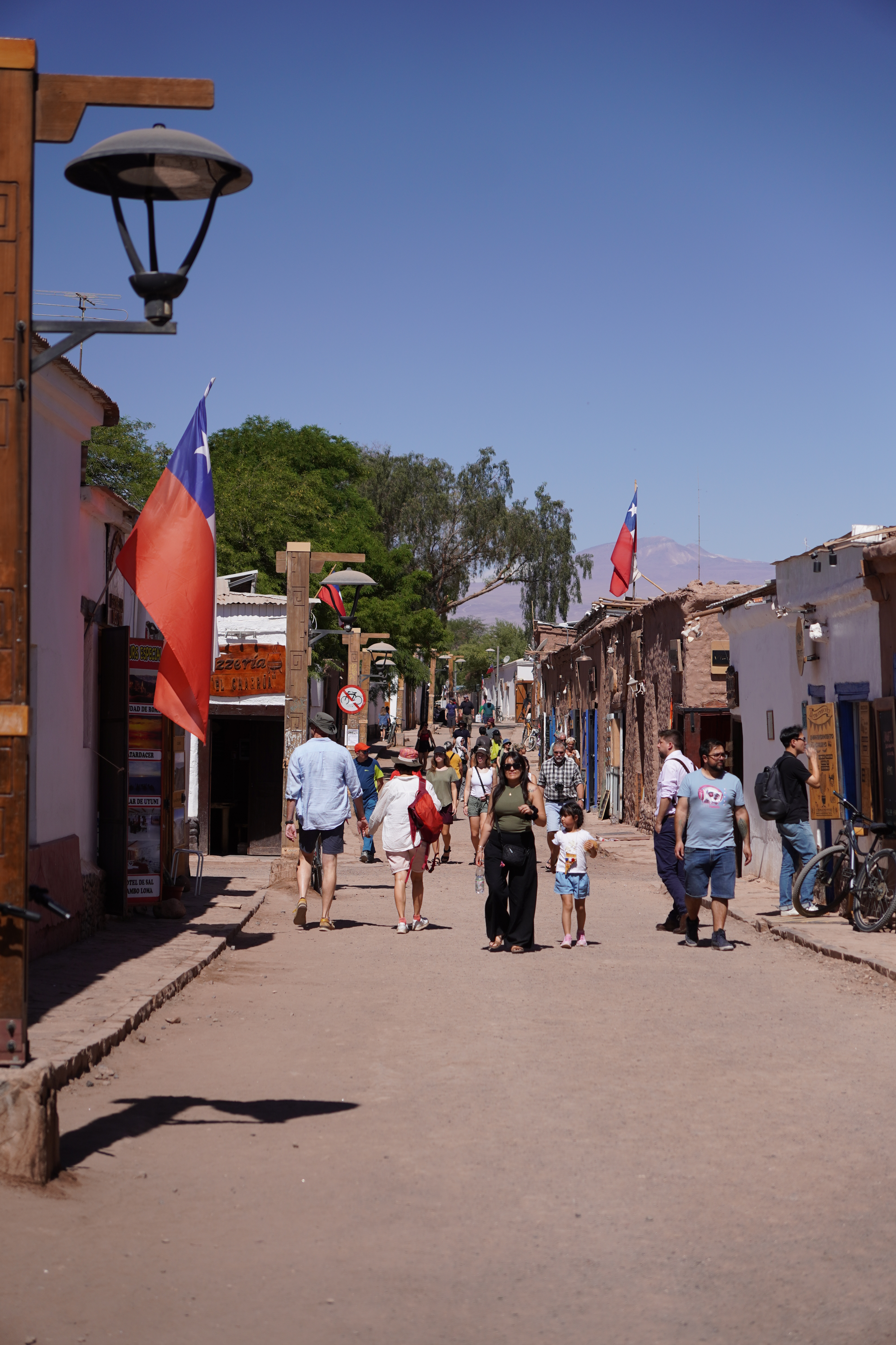 The next morning, Björn tried to restore his new iPhone using the Wi-Fi at the Copec gas station. But the connection kept dropping. After countless attempts and wasted time, we decided to move on. Driving through the blistering heat of the Atacama Desert, with temperatures soaring above 30°C, we found ourselves once again longing for Starlink. I discovered a free Wi-Fi spot in the small town of Baquedano. After several ice pops and nearly 40°C temperatures, Björn was finally able to set up the phone. However, the new iPhone had less storage than the old one, meaning it couldn’t accommodate the full backup. But it finally worked out. Once back on the road, we headed to Chuquicamata, one of the largest copper mines in the world. This open-pit mine is approximately 4300 meters long, 3000 meters wide, and up to 1000 meters deep. Enormous mining vehicles, with tires 3 to 4 meters in diameter, transport the rock. Surrounding the mine are massive waste heaps, an awe-inspiring yet unsettling sight. The town of Chuquicamata itself is now a ghost town. Its residents were relocated to Calama in the 2000s as the expanding mine made living there unsafe. Additionally, the buildings had to be cleared to make room for mining operations. Driving past wind turbines and countless solar farms, we continued towards San Pedro de Atacama.