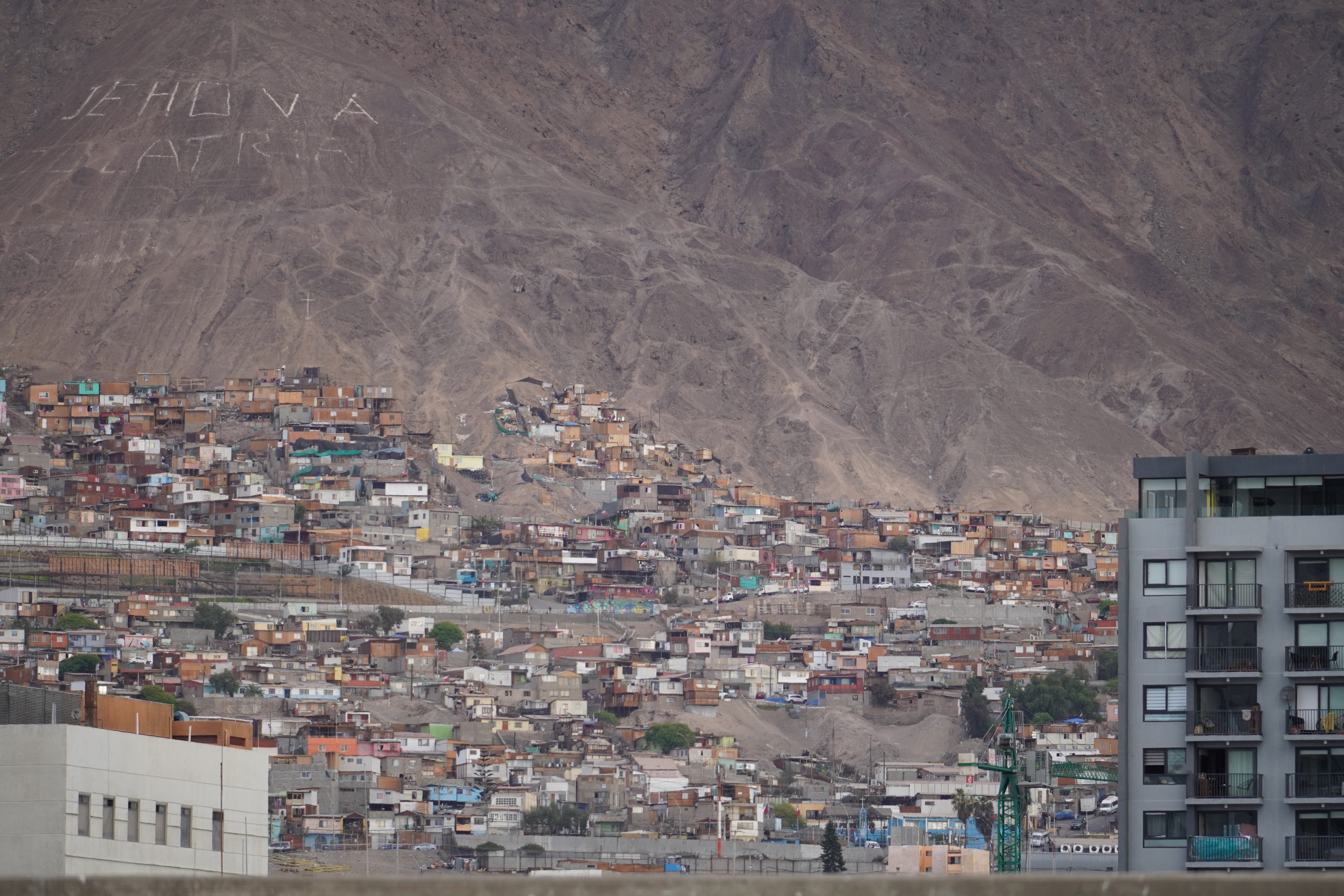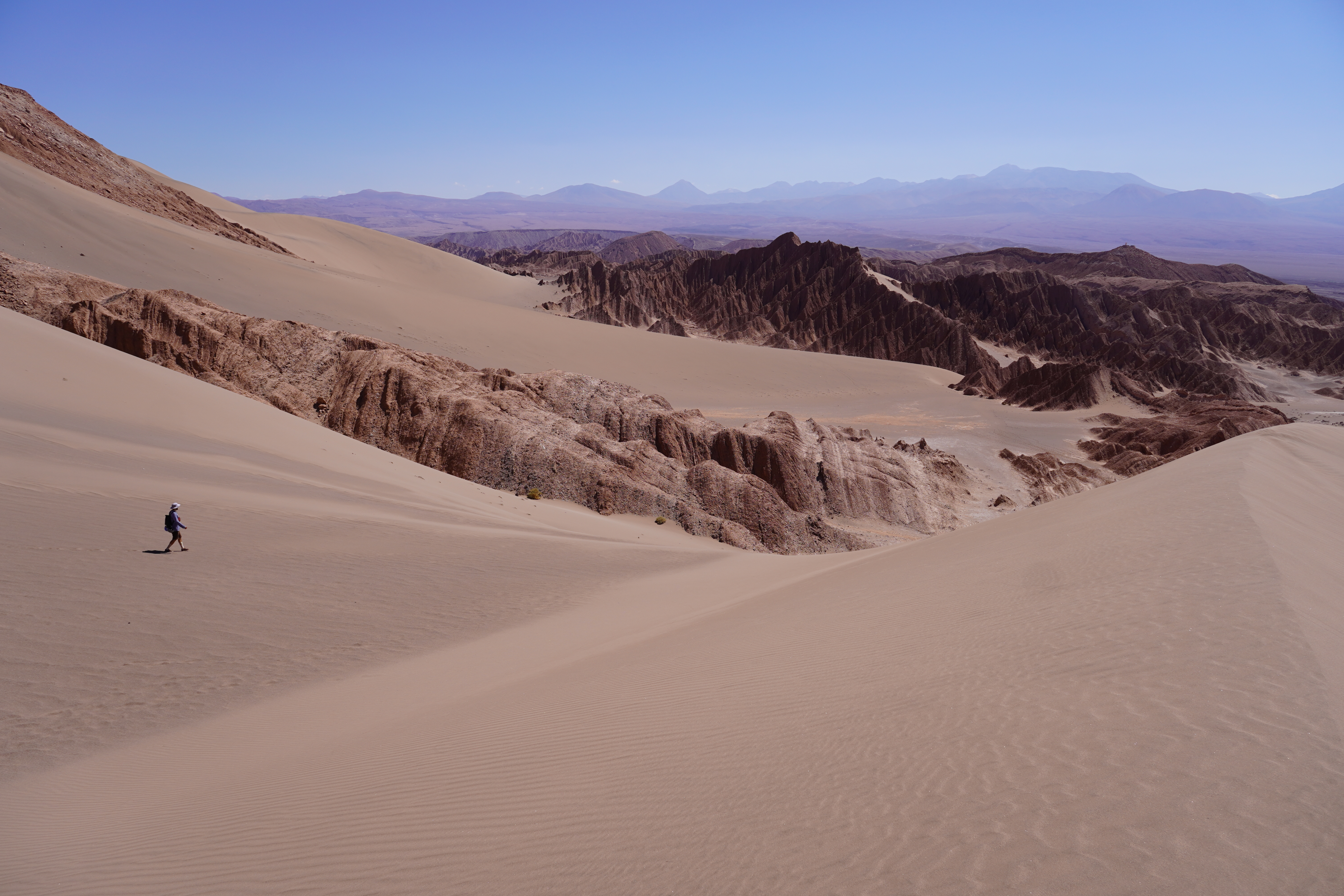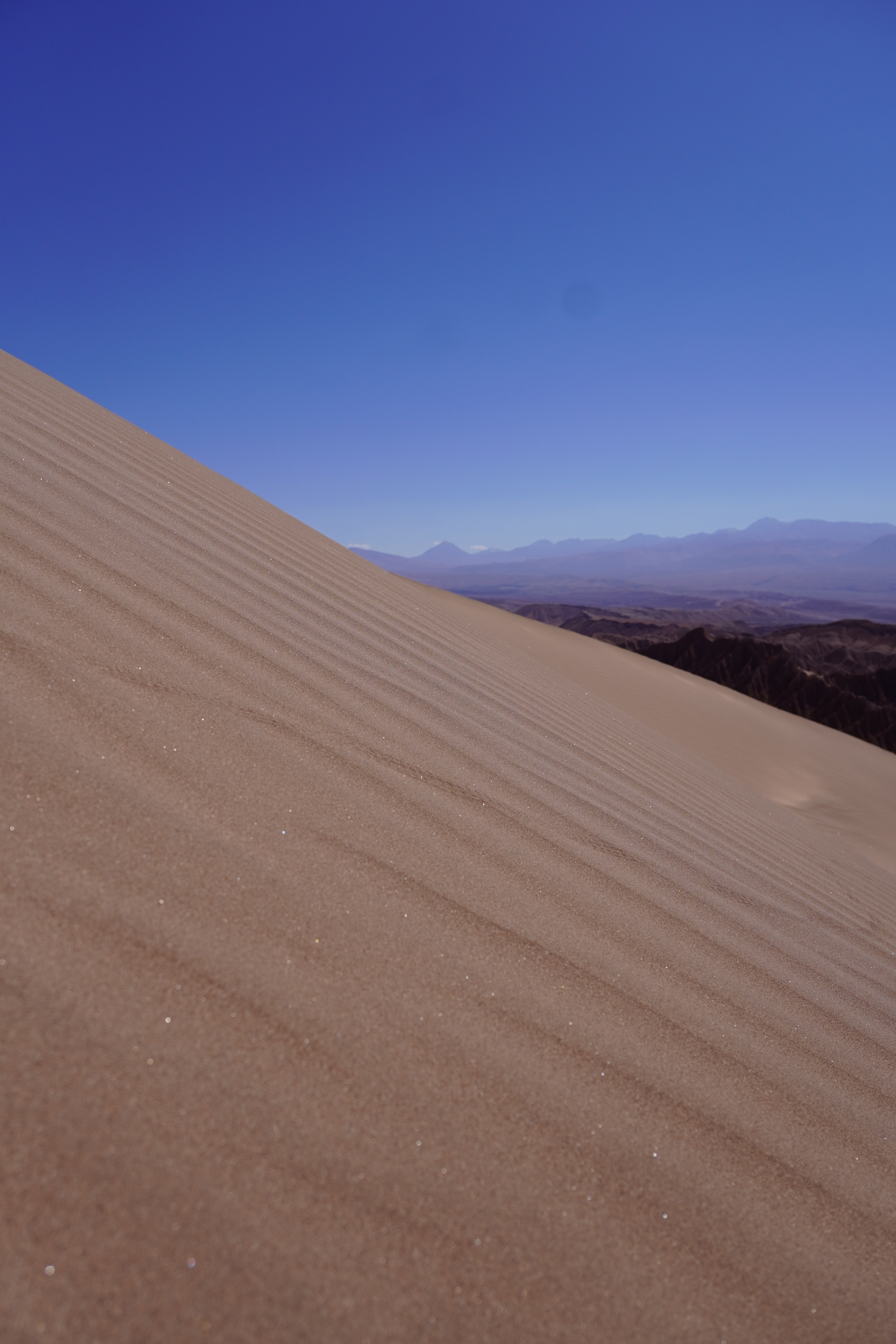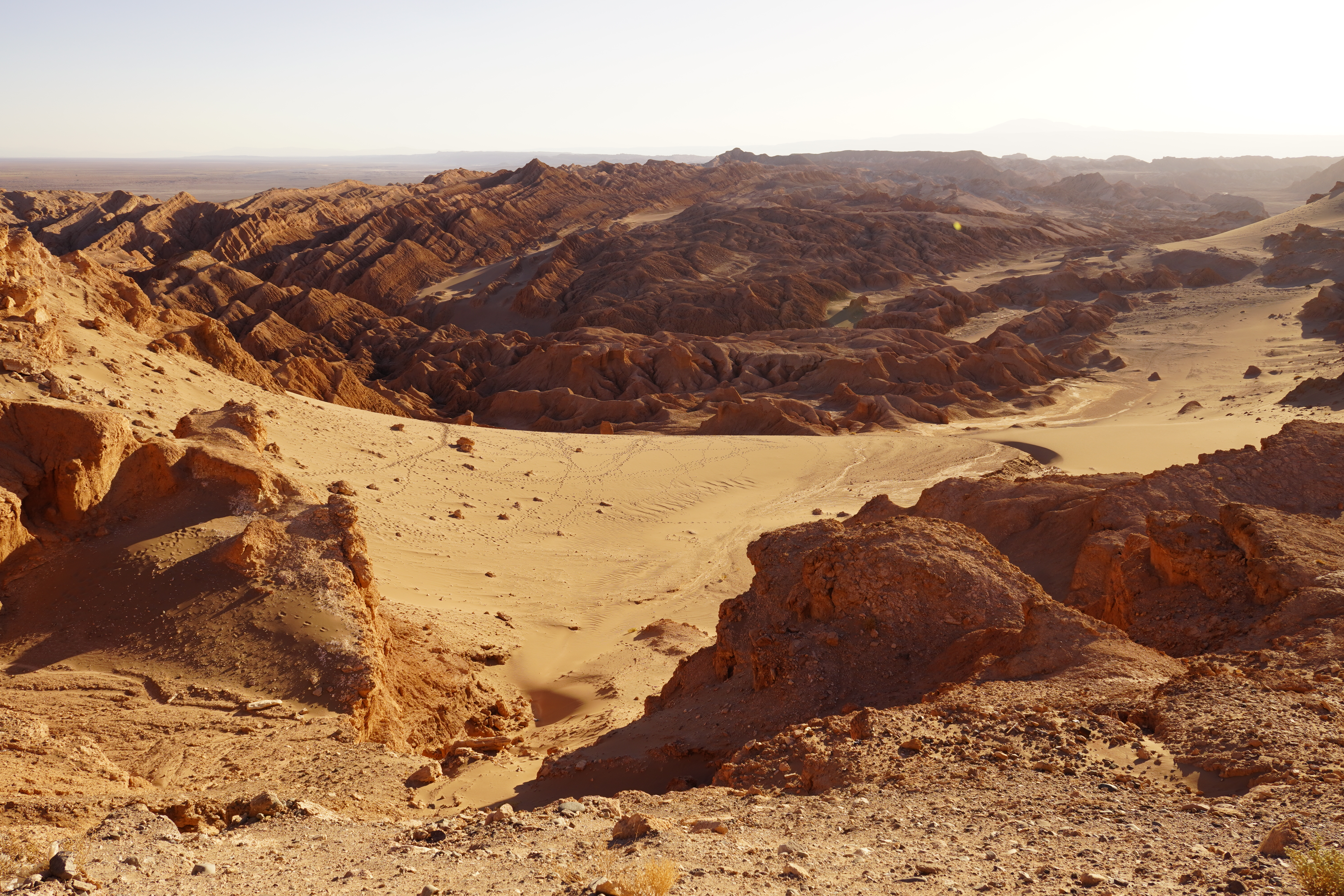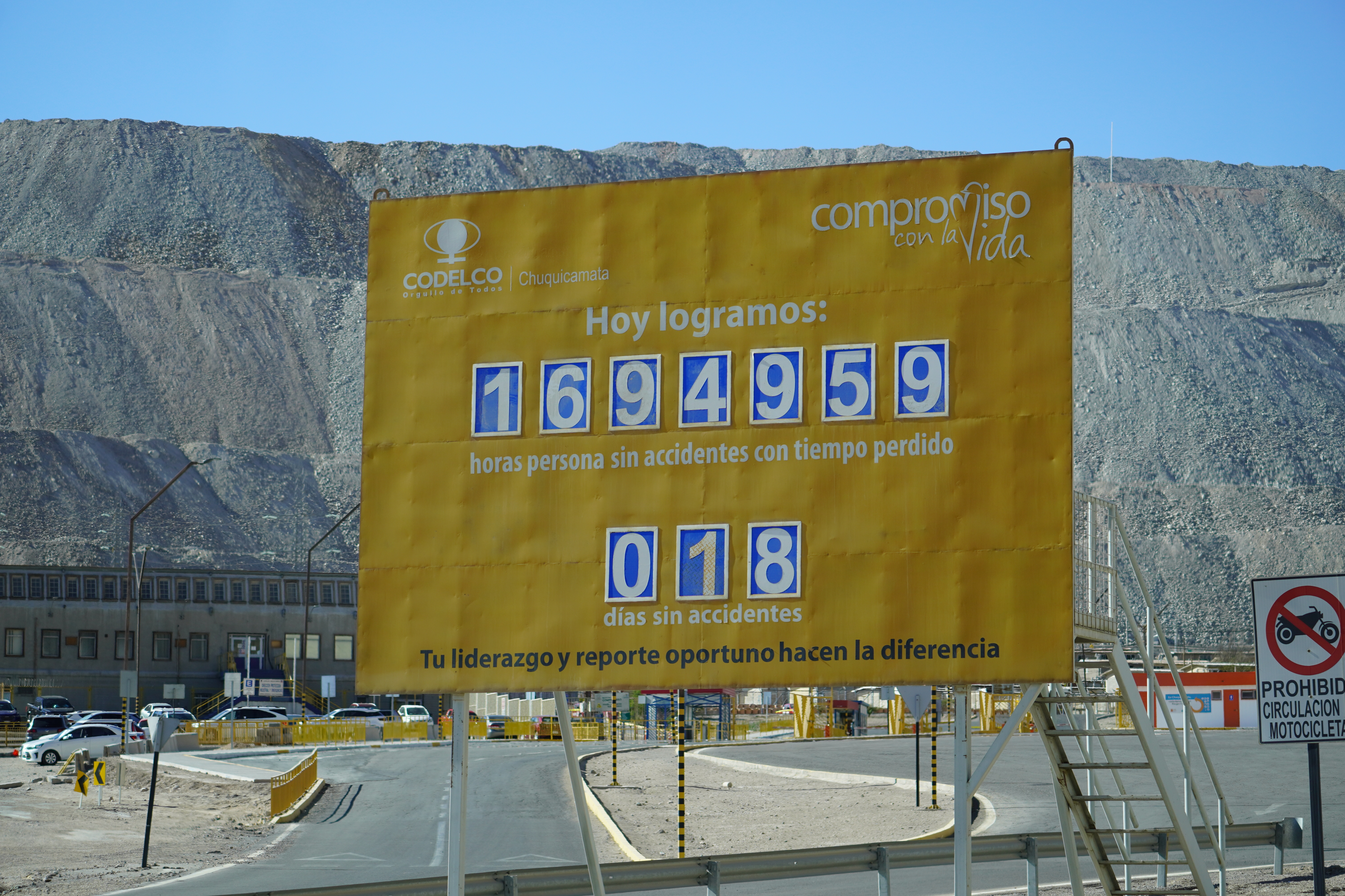 The next morning, Björn tried to restore his new iPhone using the Wi-Fi at the Copec gas station. But the connection kept dropping. After countless attempts and wasted time, we decided to move on. Driving through the blistering heat of the Atacama Desert, with temperatures soaring above 30°C, we found ourselves once again longing for Starlink. I discovered a free Wi-Fi spot in the small town of Baquedano. After several ice pops and nearly 40°C temperatures, Björn was finally able to set up the phone. However, the new iPhone had less storage than the old one, meaning it couldn’t accommodate the full backup. But it finally worked out. Once back on the road, we headed to Chuquicamata, one of the largest copper mines in the world. This open-pit mine is approximately 4300 meters long, 3000 meters wide, and up to 1000 meters deep. Enormous mining vehicles, with tires 3 to 4 meters in diameter, transport the rock. Surrounding the mine are massive waste heaps, an awe-inspiring yet unsettling sight. The town of Chuquicamata itself is now a ghost town. Its residents were relocated to Calama in the 2000s as the expanding mine made living there unsafe. Additionally, the buildings had to be cleared to make room for mining operations. Driving past wind turbines and countless solar farms, we continued towards San Pedro de Atacama.