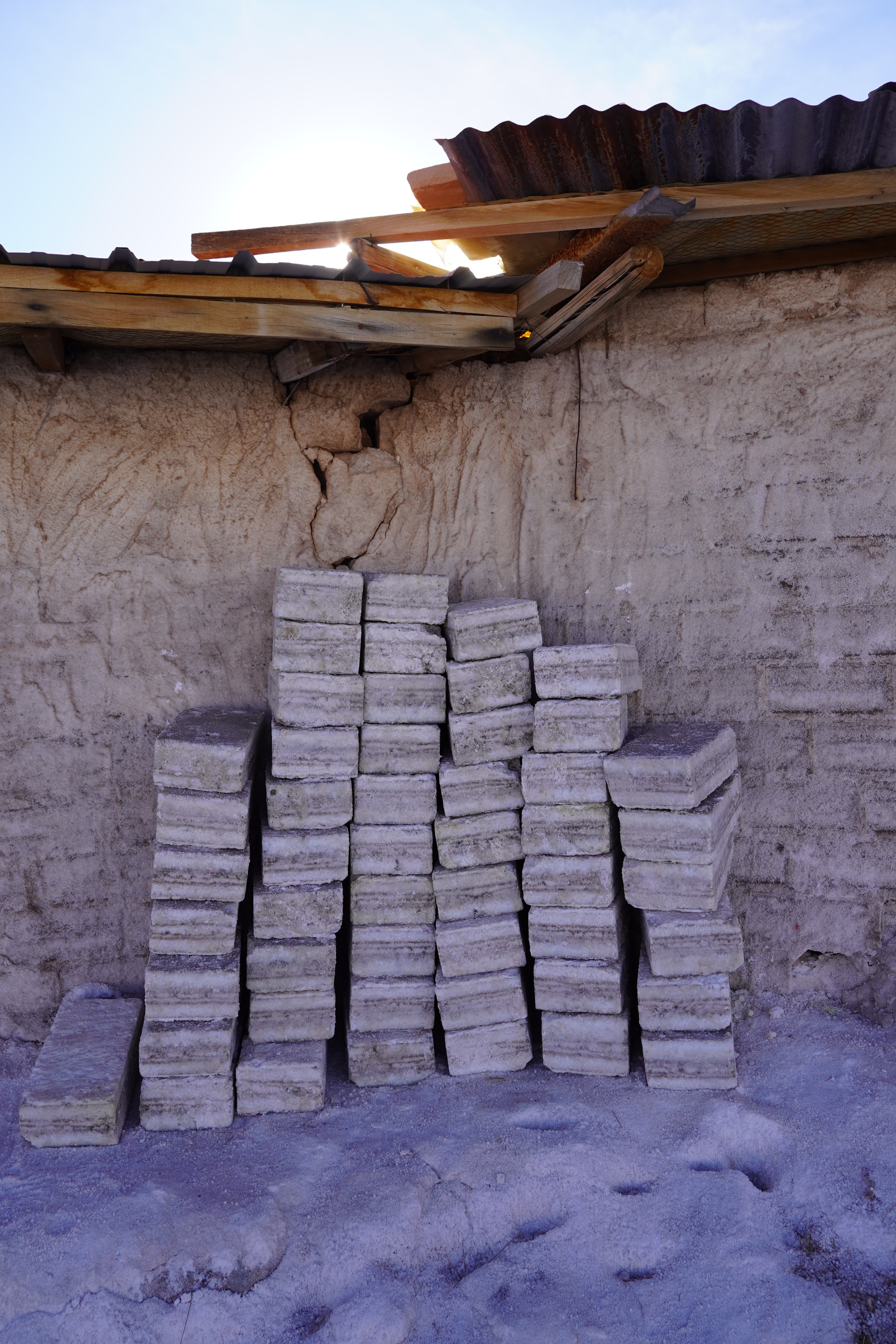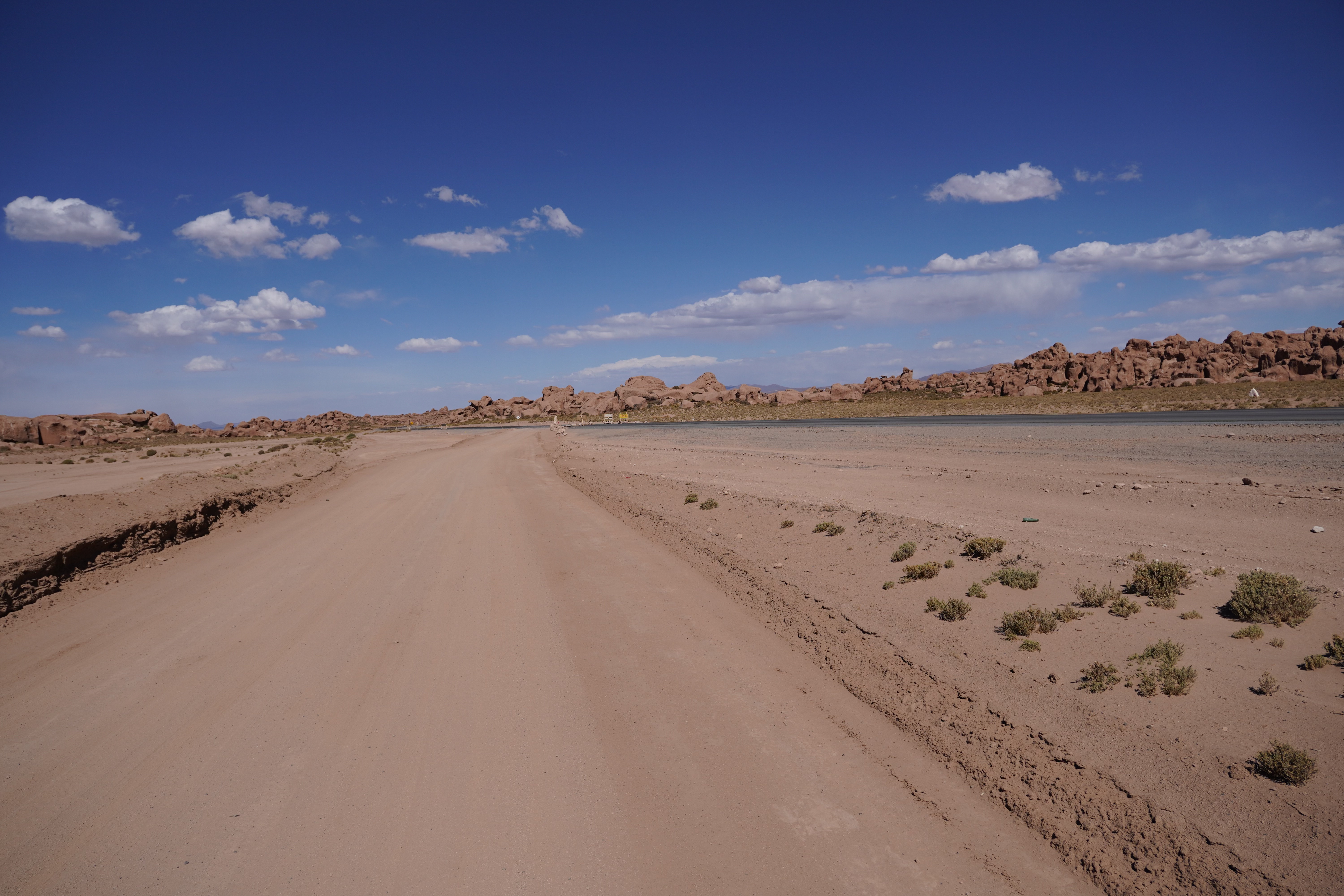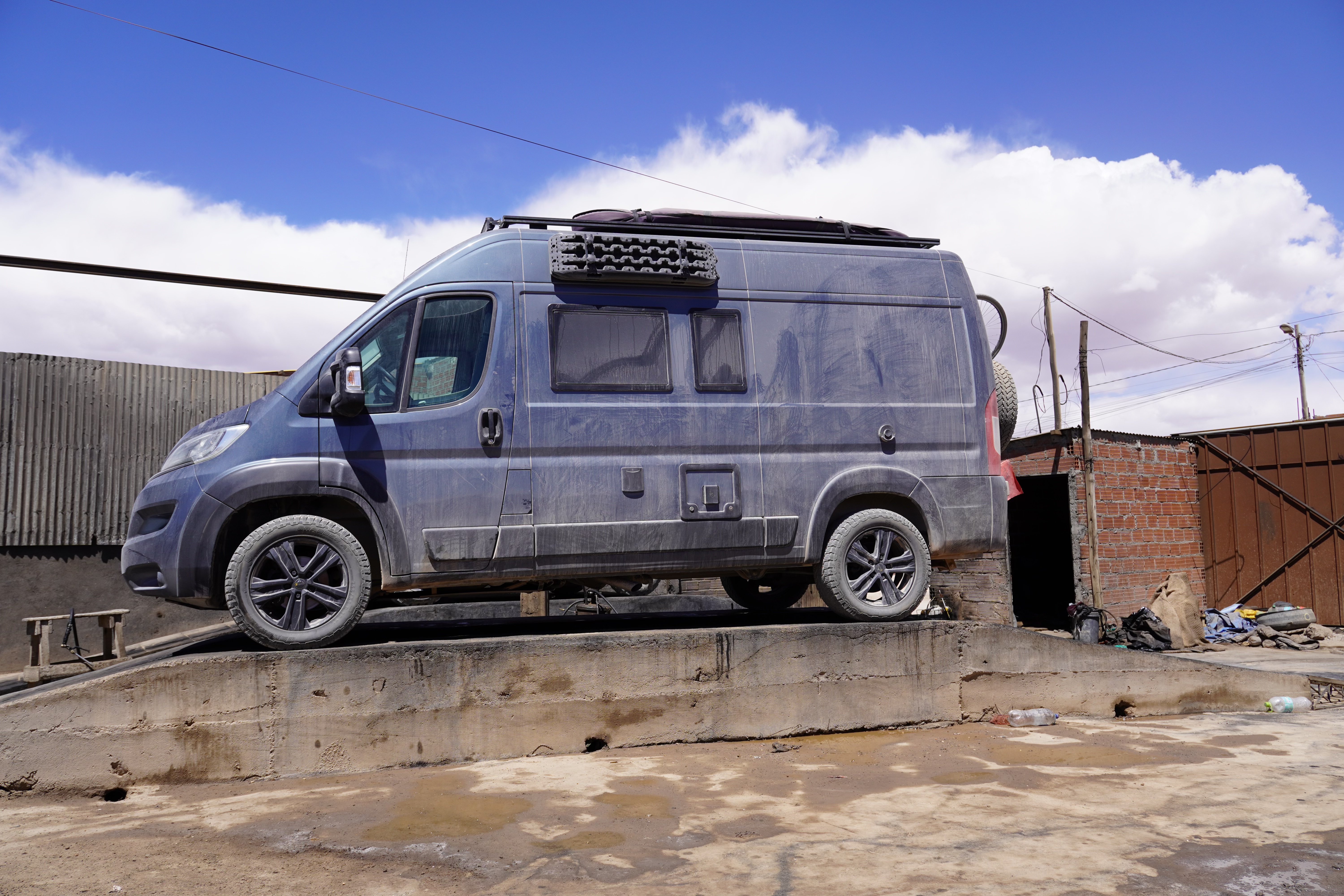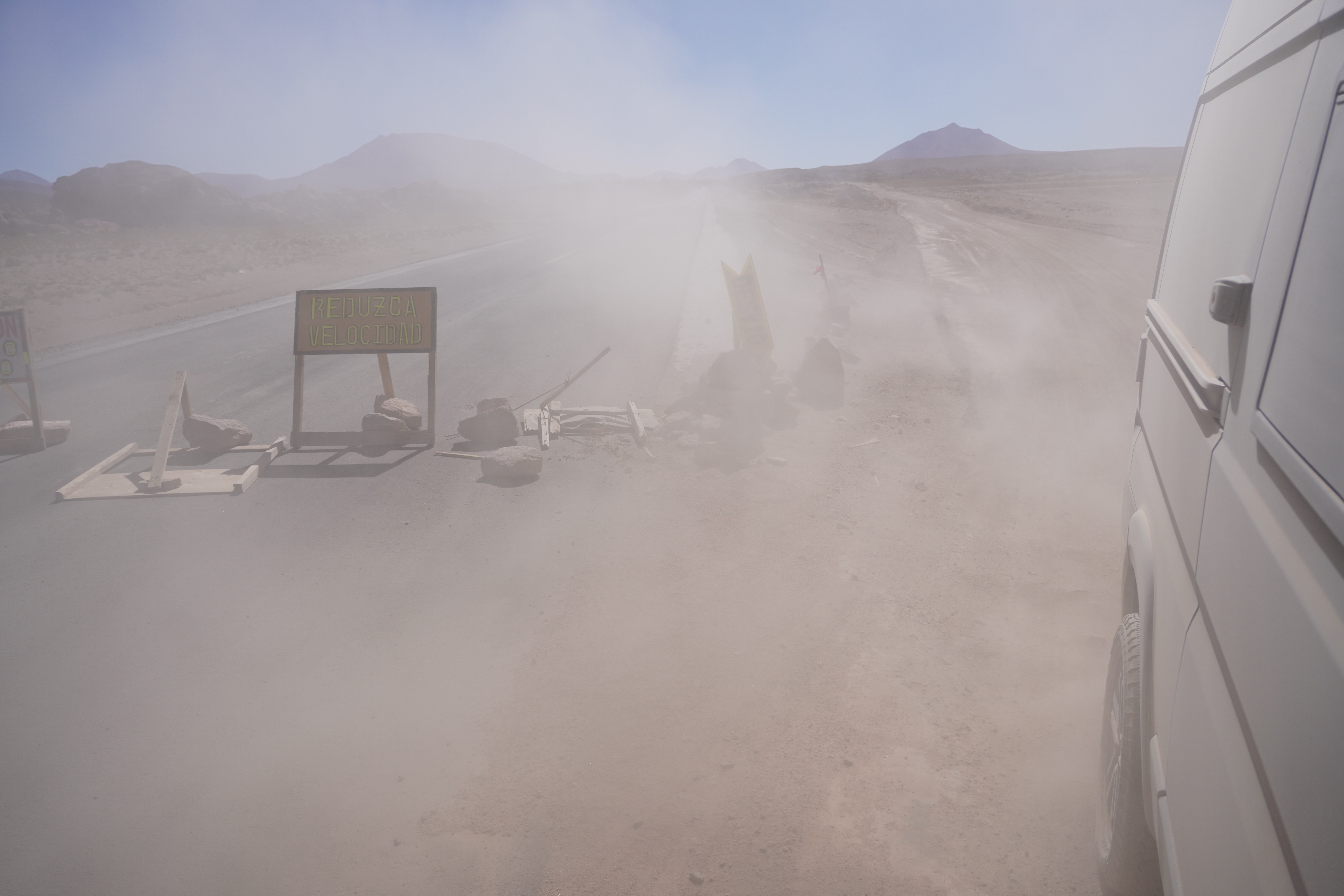 Heading to Uyuni, yes. We were so excited and full of anticipation, finally, a normal road! What would it feel like to drive on it? First, we poured the remaining diesel from our jerry can into the tank and admired Rosi. Her color was no longer visible. She was completely coated, like a breaded schnitzel, but with fine dust and sand. Really dirty. It was already past noon, and we had 150km of Ruta 701 ahead of us to reach Uyuni. In Germany, that distance is covered quickly, but here everything takes a bit longer. We knew we wouldn’t make it to Uyuni that day, but no matter, we just wanted to keep going. We were excited. Reality soon caught up with us. The road wasn’t much better than parts of the Lagoon Route. To be precise, it had every kind of surface you could imagine: deep potholes, loose gravel, compacted clay and sand, dusty tracks and fine sand… The worst part was driving most of the time alongside a brand-new, perfectly asphalted road. Unfortunately, it wasn’t open to traffic yet. Ruta 701 is one of the main connections to Chile, so there were many trucks on this road. On the sandy sections, when oncoming cars stirred up dust, visibility was reduced to zero, like driving through fog. Okay, the road wasn’t quite as bad as the Lagoon Route, but it was bad enough when you had been looking forward to a good road. The Lagoon Route didn’t just stick to Rosi’s coating. Sand was in every crack and hinge, and even came through the air vents. A lot of sand. Note to self: change the air filter in the next few days. In San Cristobal, we stopped at a gas station and witnessed, for the first time, a pump roped off and empty. We were told there wouldn’t be more diesel until the next afternoon. At least we could refill our nearly empty drinking water reserves (we drank a lot at this altitude) and inflate our tires to the proper pressure (back up to 3.5 bar from 2.2 bar) at the garage next door for 4 Bolivianos (50 cents). Our air compressor seems not to work at high altitudes, or maybe it’s just broken in general.
