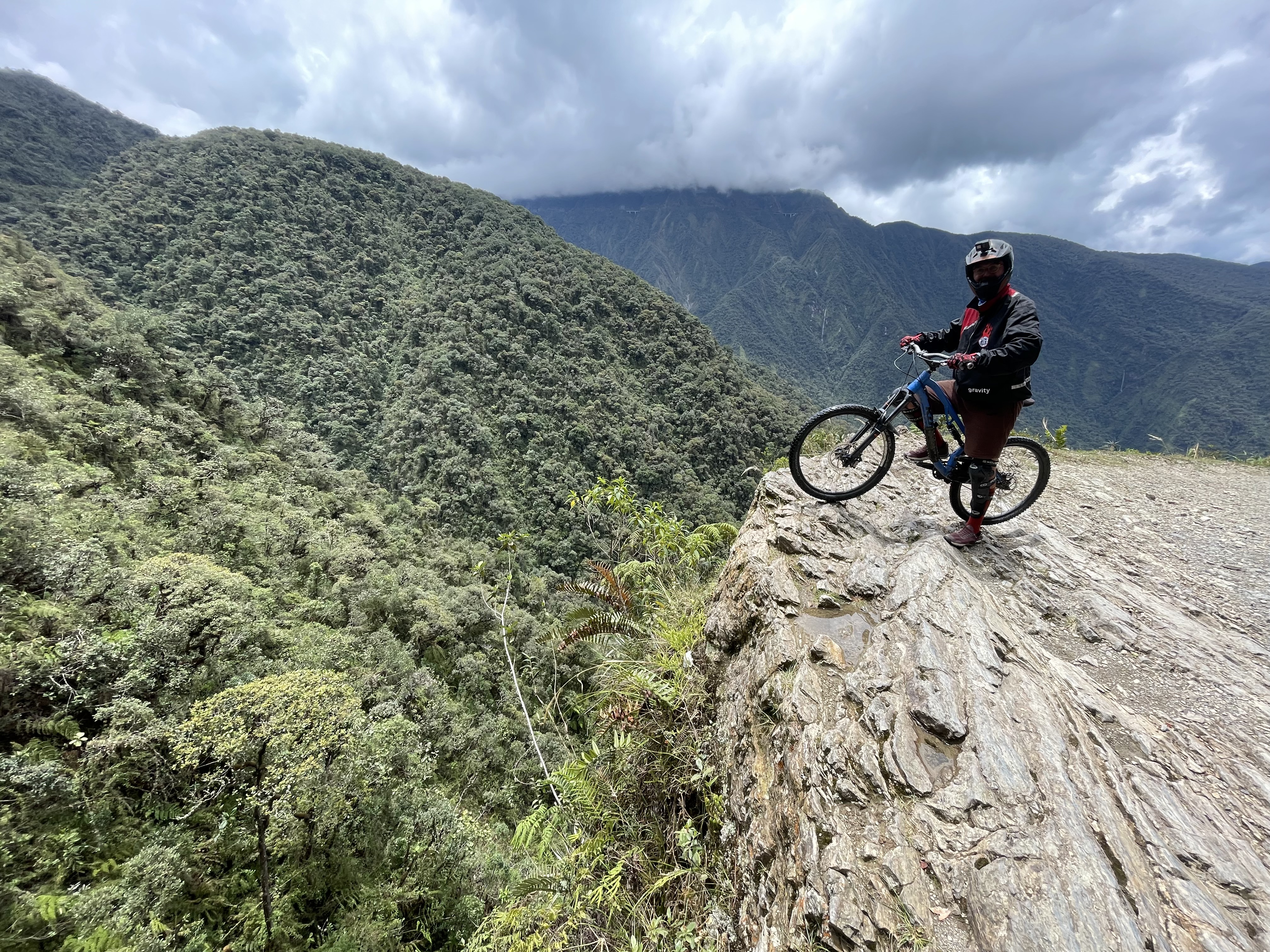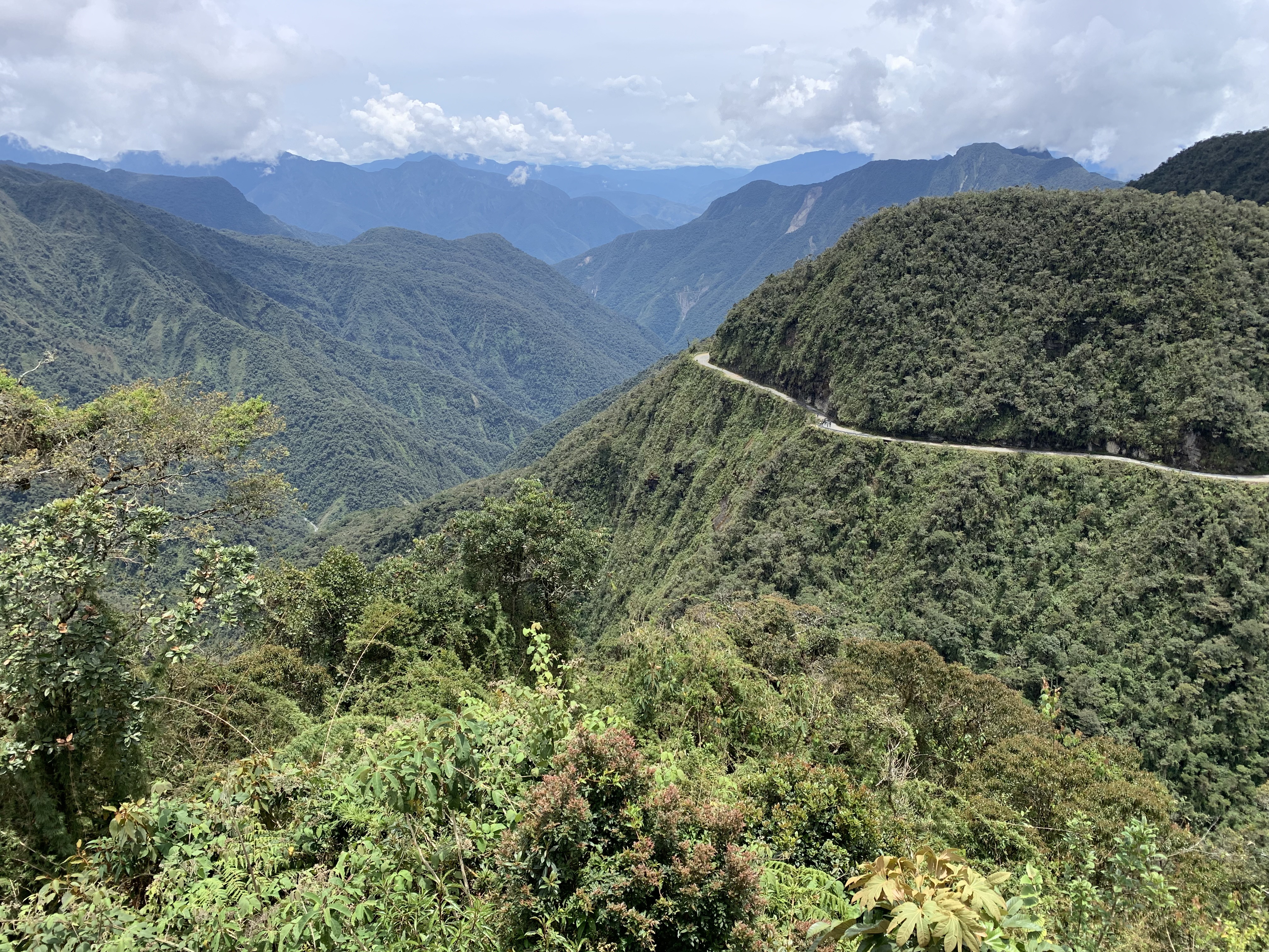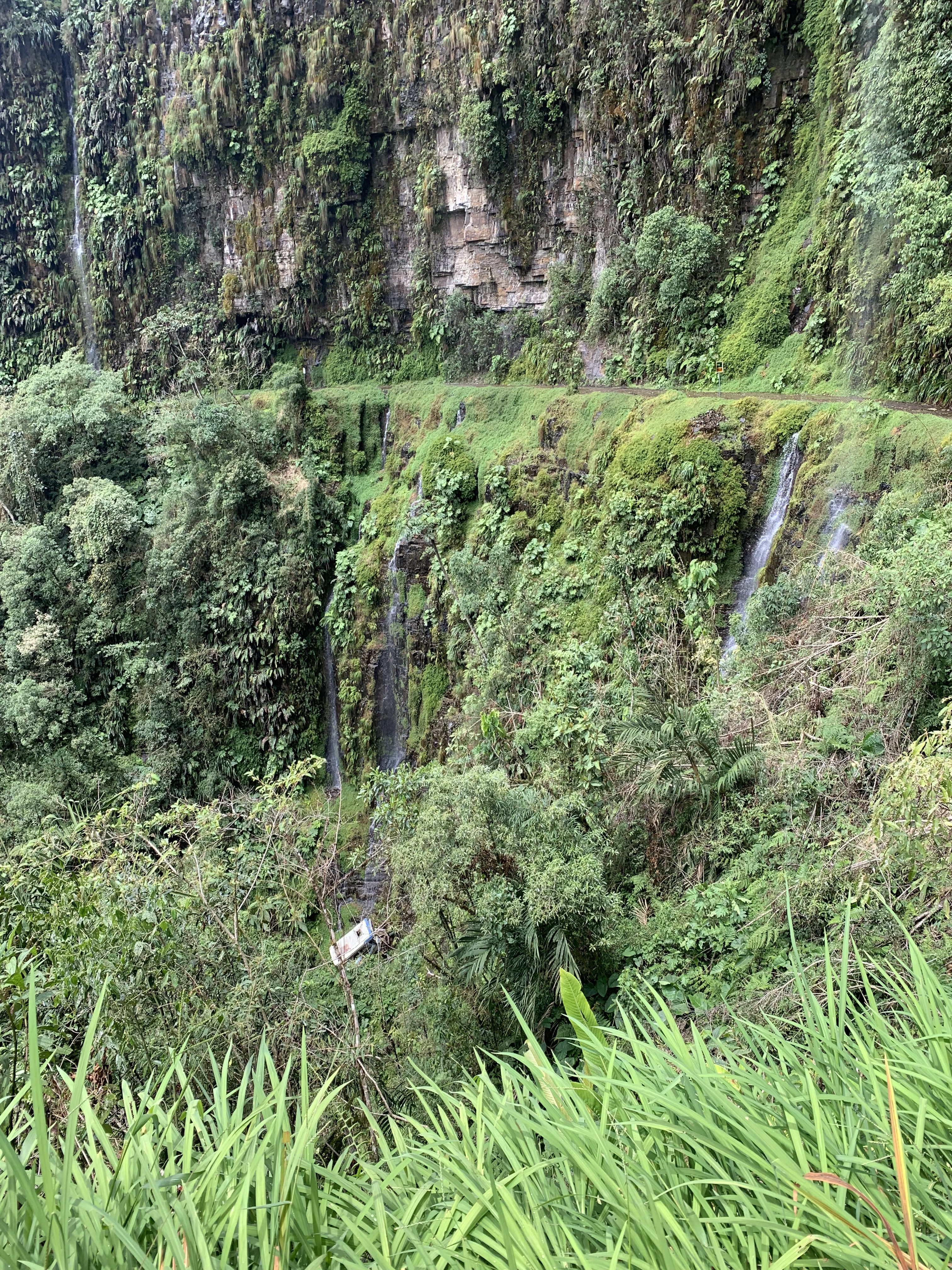 The next day, we booked a mountain bike tour over the Death Road. The Death Road (officially Yungas Road) is often called one of the most dangerous roads in the world. It was built in the 1930s by Paraguayan prisoners of war during the Chaco War. Due to the high number of fatal accidents, it got its name. Since the opening of a new, safer bypass road in 2006, the Death Road is hardly used by cars anymore. Currently, it can’t be fully traversed because a stone ledge recently slid onto the road and blocked it halfway. We booked with the highest-rated tour company, Gravity, because our safety was a priority. The next day, we woke up at 5 a.m., took an Uber into the city, and had breakfast with the group in La Paz. After breakfast, we drove for about an hour by minibus to the start of our tour. We started in the fog at 4650m at the snow-capped La Cumbre Pass, then rode downhill for 64 km, eventually reaching the tropical jungle at 1200m after several hours. Initially, we rode on paved roads before hitting the official Death Road. From there on, it required full concentration. Still, I preferred to ride at the front behind our guide since you could go the fastest there. It was amazing to admire the landscape, feel the wind in my hair, cross small rivers, and ride under waterfalls. It was an incredibly fun experience, which ended after several hours in the humid jungle with an altitude difference of almost 3500m. At the destination, we had spaghetti Bolognese, a cold beer, and the “I survived the Death Road T-shirt”. What an awesome experience. Even if the road had been passable by car, we wouldn’t have wanted to drive Rosi there. It’s a gravel road with a very narrow, uneven surface, often only 3 meters wide. On the route, vehicles must drive on the left, meaning you’re always on the edge, and the steep cliffs of up to 600 meters often have no guardrails. Also, fog, rain, and landslides make the road slippery and dangerous. Plus, there’s hardly any room to pass if you encounter traffic.