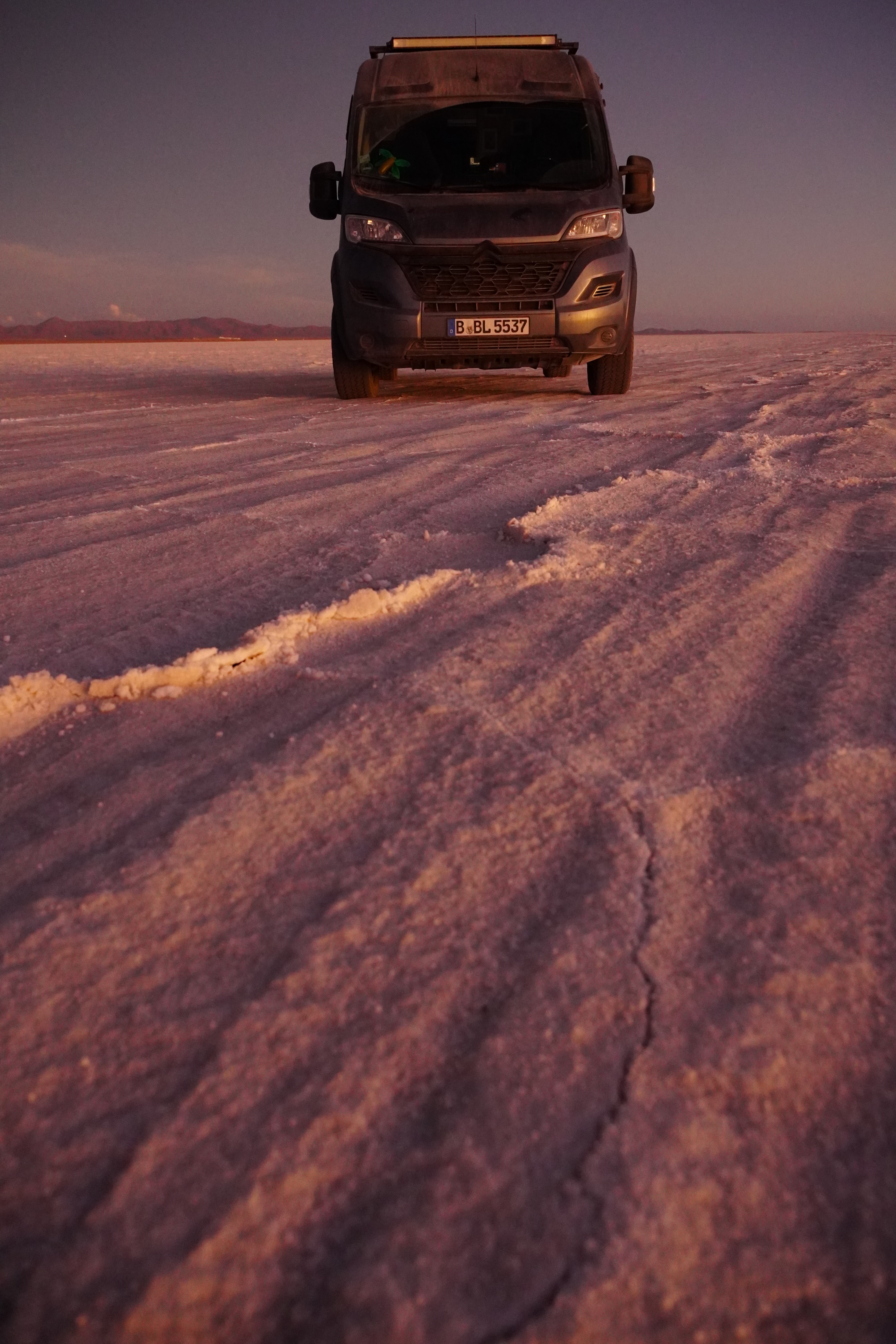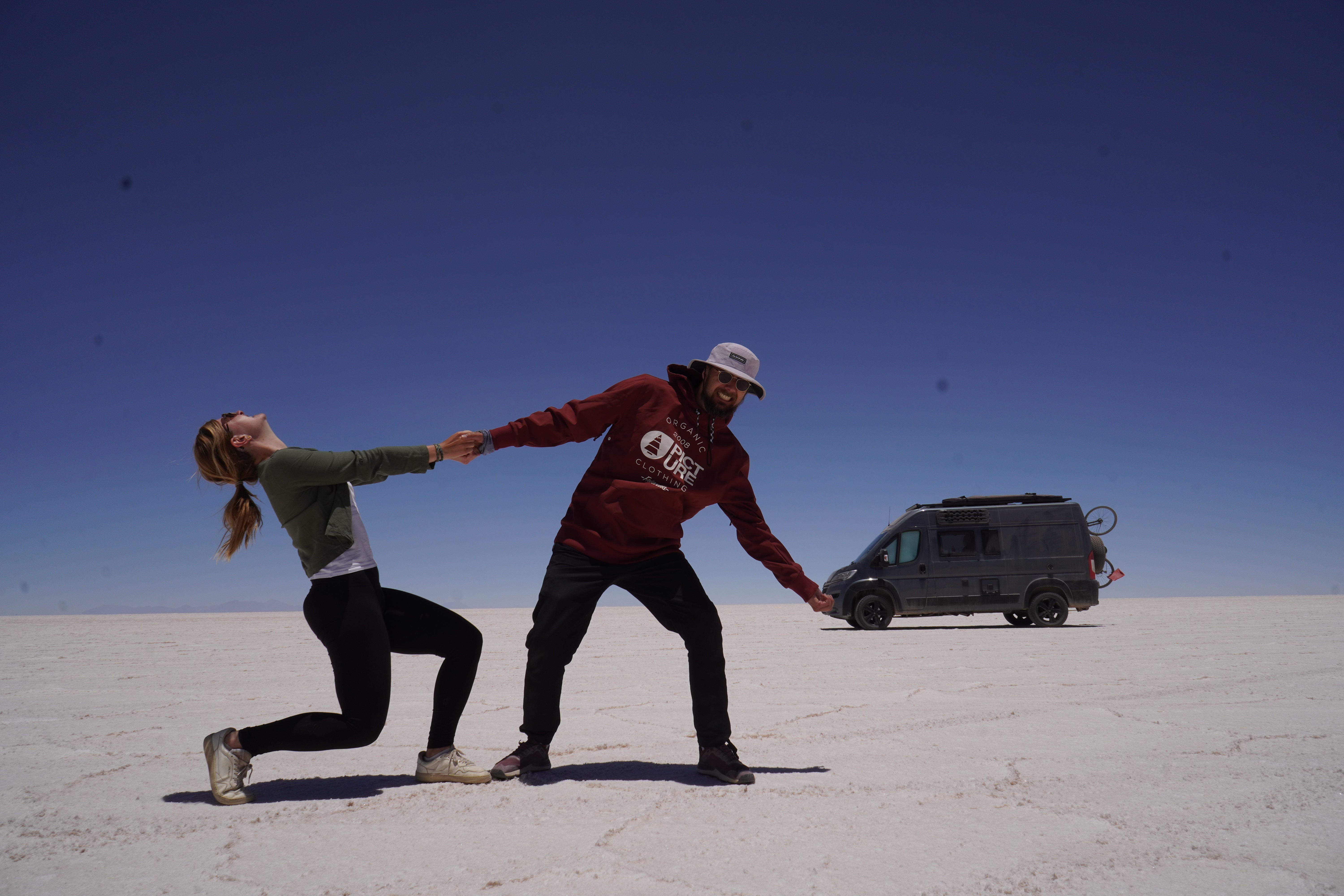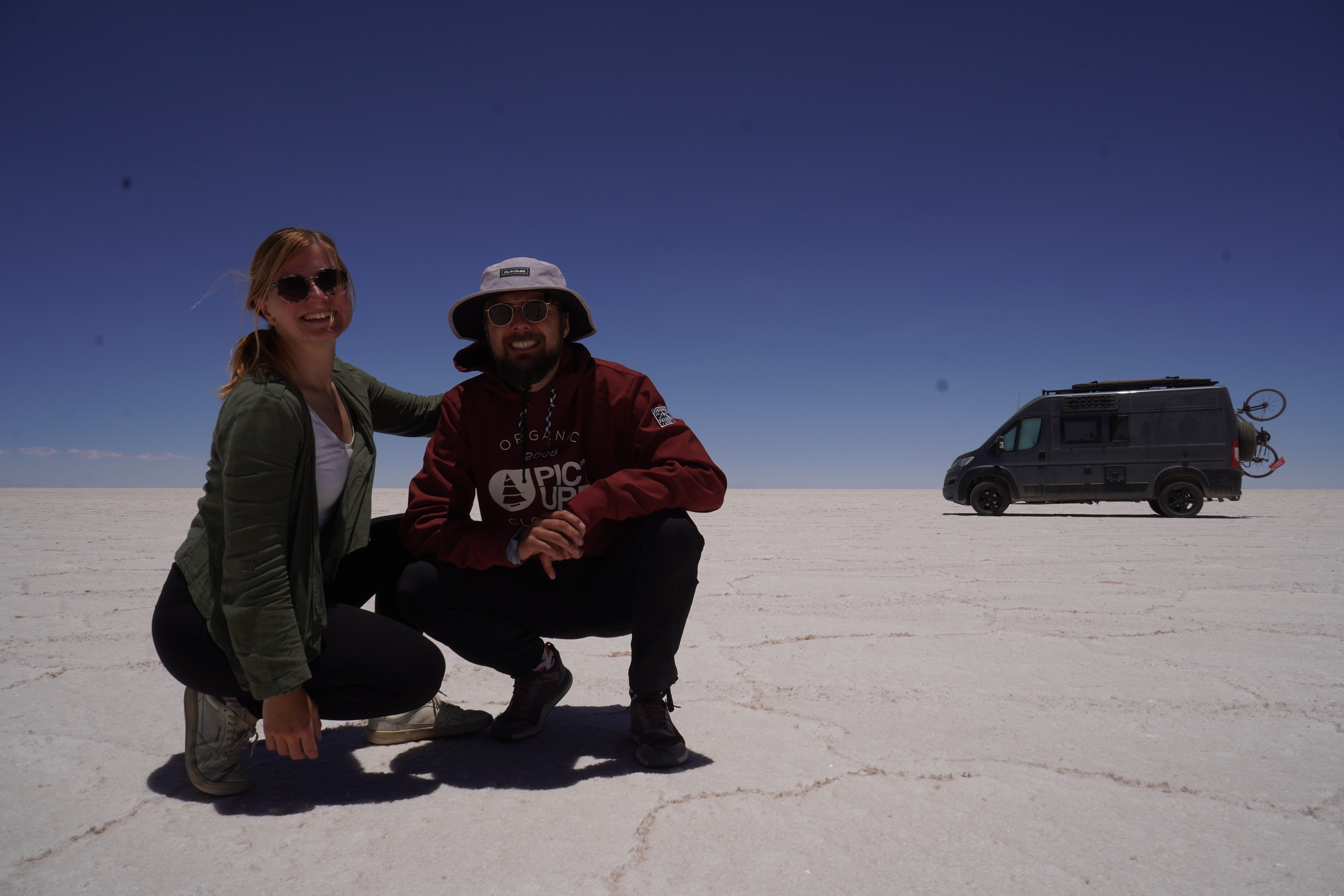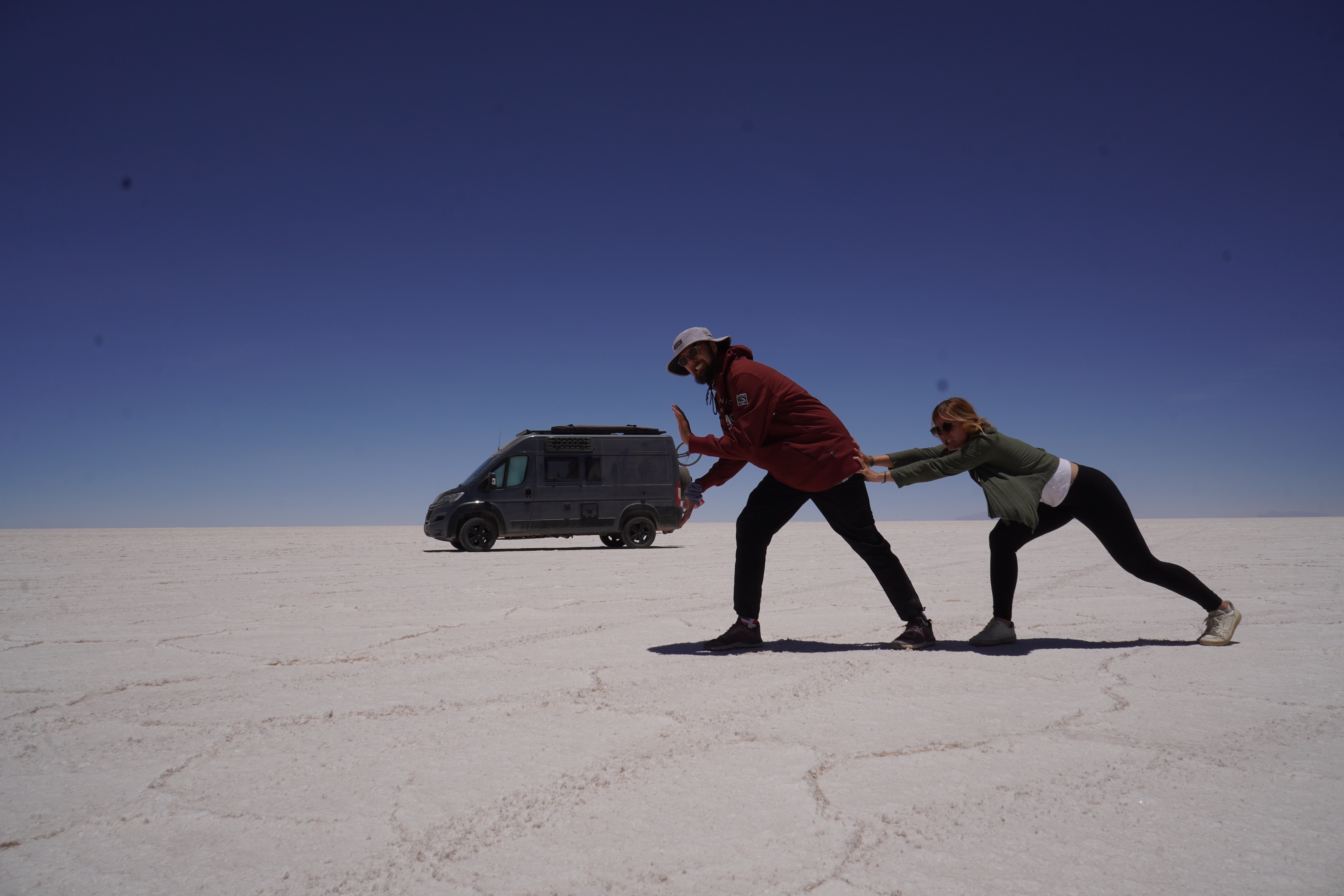 We set up camp at the Escalera al Cielo, the Stairway to Heaven. The next day, we planned to take perspective photos around noon, as the sun would be at its highest, and people and objects would cast no shadows. During the photoshoot, we were visited by Jule and Michi. They’ve been traveling just like us since August and came from the north, like most of the travelers we meet. We parked both vans (they drive an old VW T4 with a pop-up tent) and set up a tarp between the cars to create some shade. It was windy and cool, but the sun, reflected off the salt, was even stronger than usual at this altitude. Guess what happened? That’s right, I got a nasty sunburn on my face because I sat just a little outside of the shadow and took off my hat. Even though I wore sunscreen. We spent the day together, exchanged information about the roads north and south, and cooked together in the evening at the train graveyard. It was nice to have company. Our original plan was to take the bad road back toward the Lagoon Route due to the diesel situation and roadblocks in the country and cross into Chile there. We intended to drive north along the Chilean coast and possibly head to La Paz afterward. Jule and Michi told us how great the road was from here north toward La Paz. Plans, as we know, are meant to be broken. And that’s what we did.