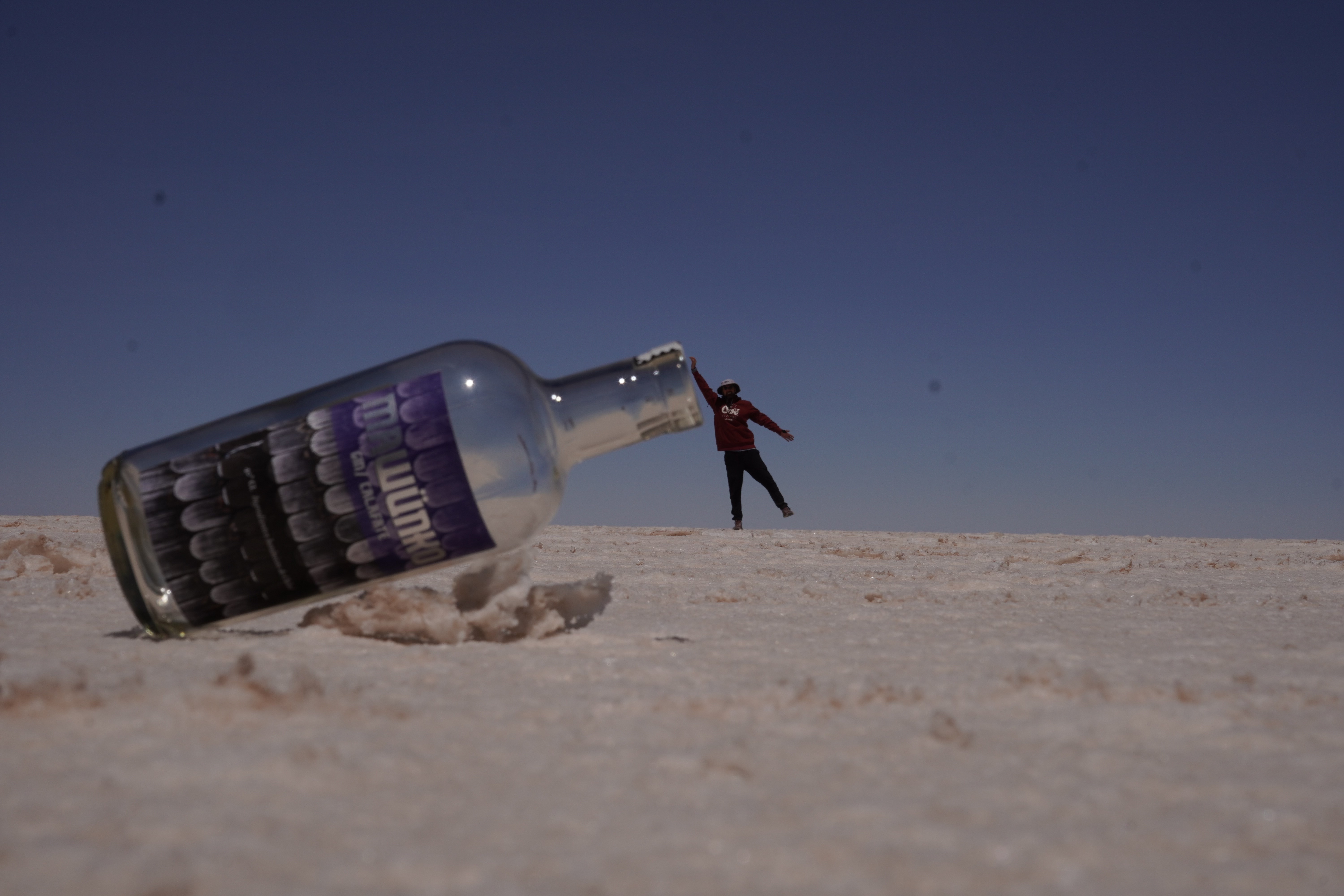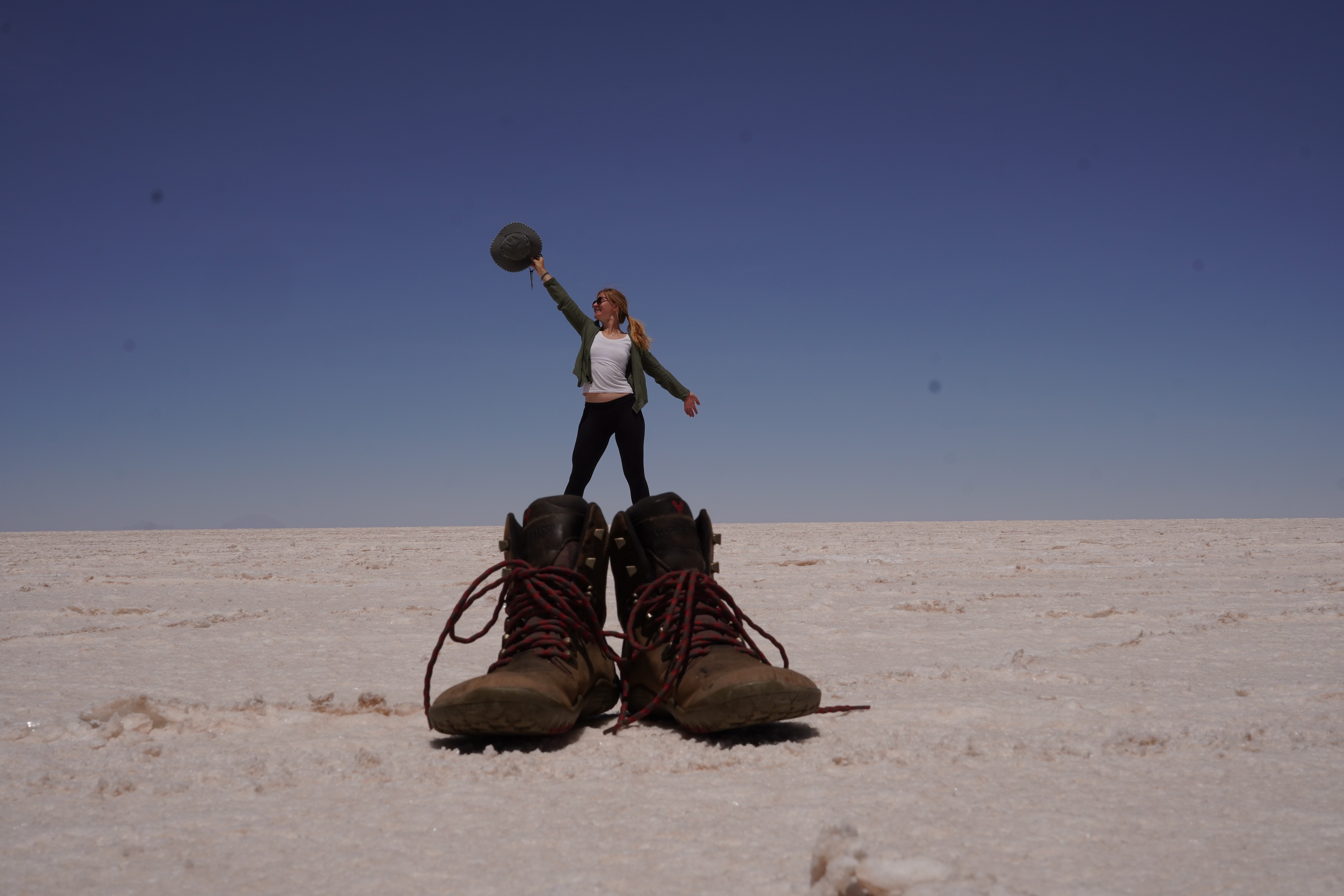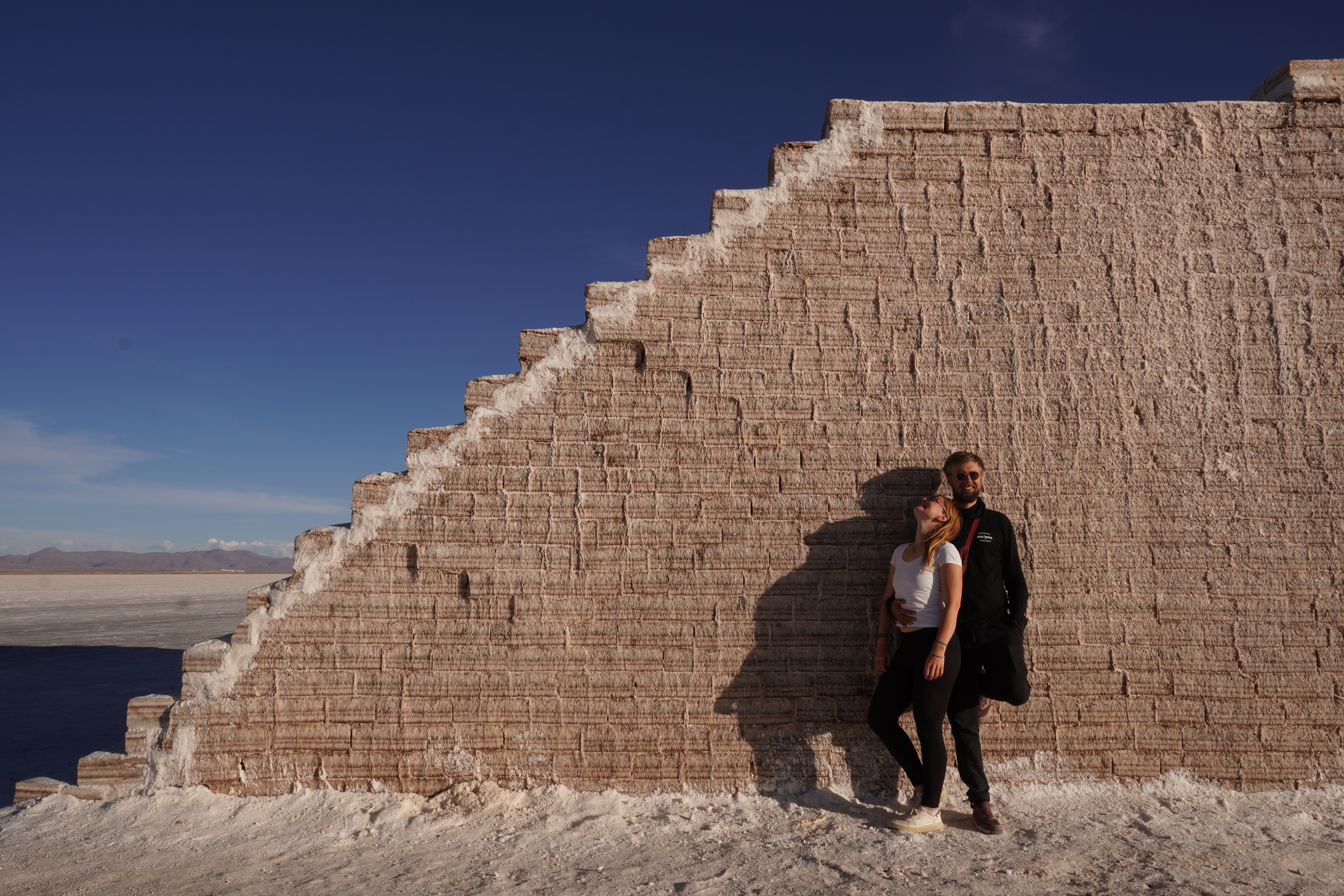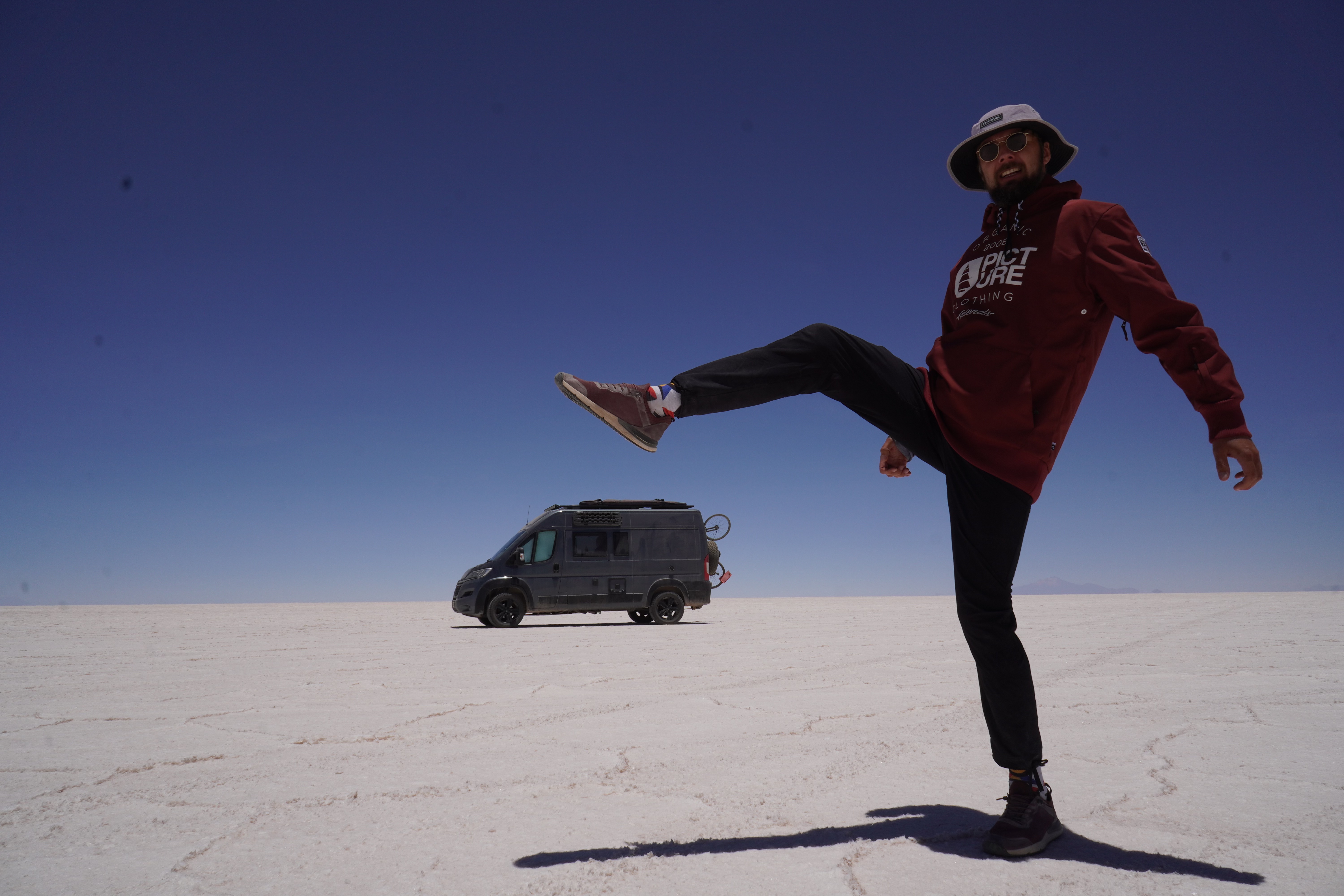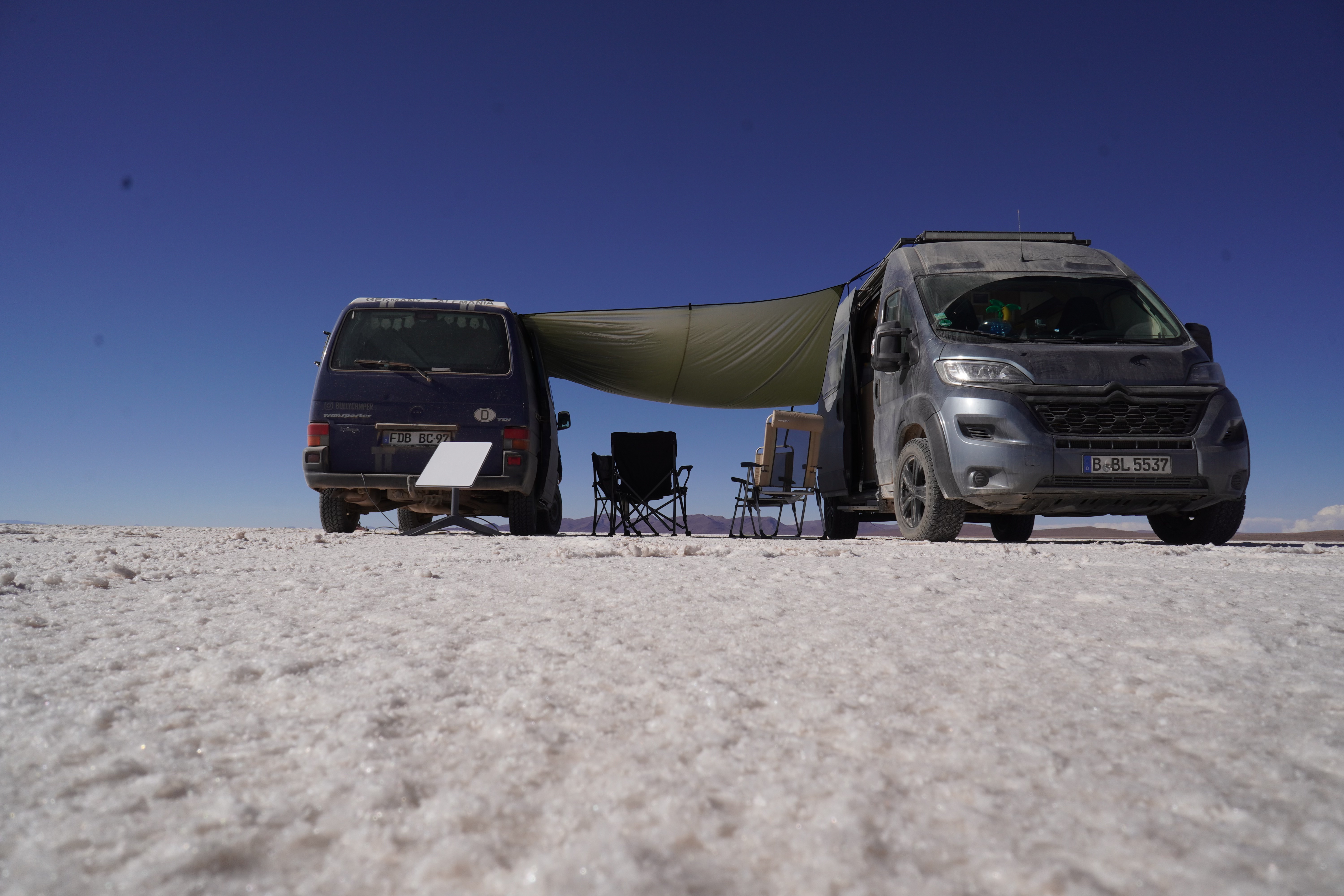 We set up camp at the Escalera al Cielo, the Stairway to Heaven. The next day, we planned to take perspective photos around noon, as the sun would be at its highest, and people and objects would cast no shadows. During the photoshoot, we were visited by Jule and Michi. They’ve been traveling just like us since August and came from the north, like most of the travelers we meet. We parked both vans (they drive an old VW T4 with a pop-up tent) and set up a tarp between the cars to create some shade. It was windy and cool, but the sun, reflected off the salt, was even stronger than usual at this altitude. Guess what happened? That’s right, I got a nasty sunburn on my face because I sat just a little outside of the shadow and took off my hat. Even though I wore sunscreen. We spent the day together, exchanged information about the roads north and south, and cooked together in the evening at the train graveyard. It was nice to have company. Our original plan was to take the bad road back toward the Lagoon Route due to the diesel situation and roadblocks in the country and cross into Chile there. We intended to drive north along the Chilean coast and possibly head to La Paz afterward. Jule and Michi told us how great the road was from here north toward La Paz. Plans, as we know, are meant to be broken. And that’s what we did.