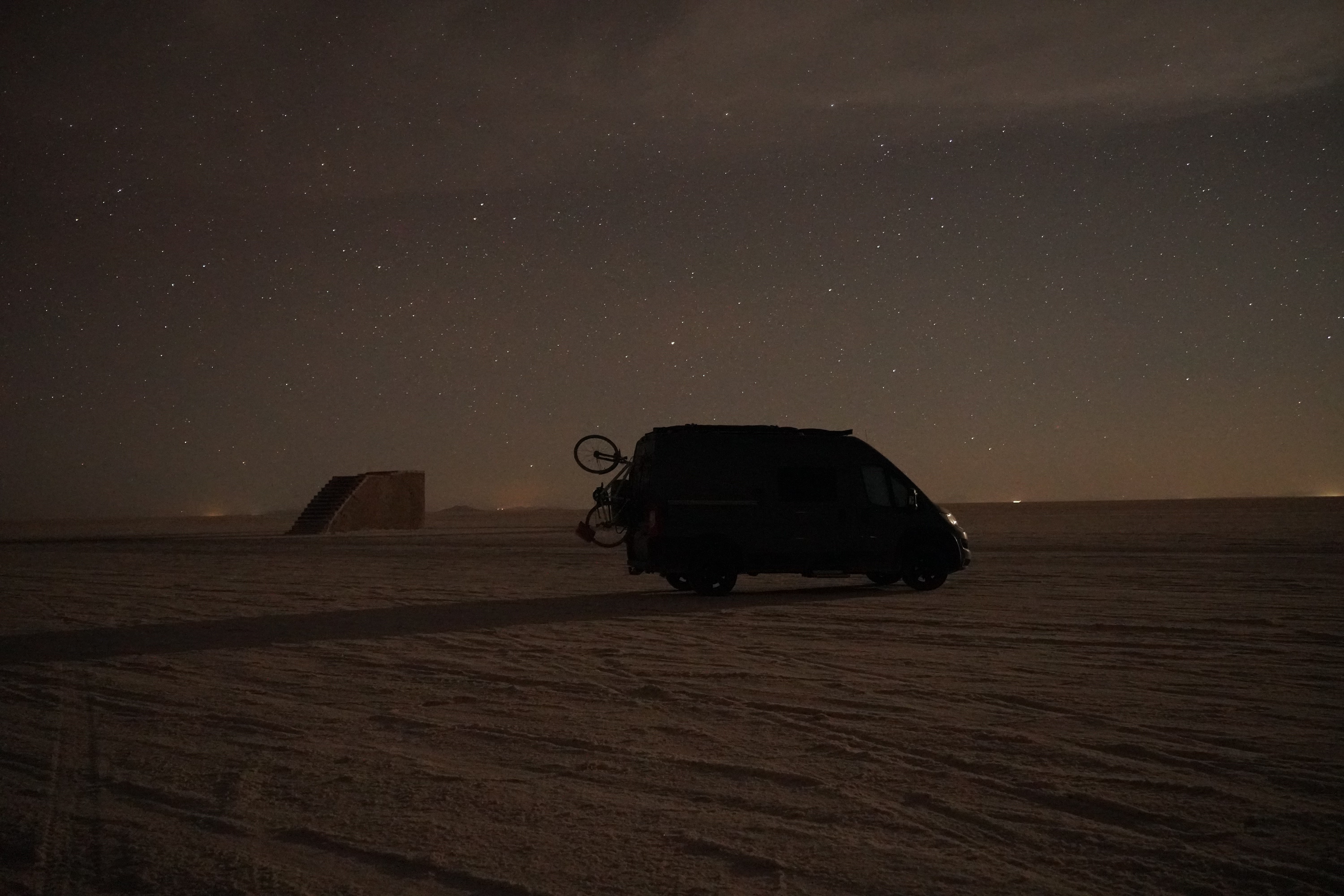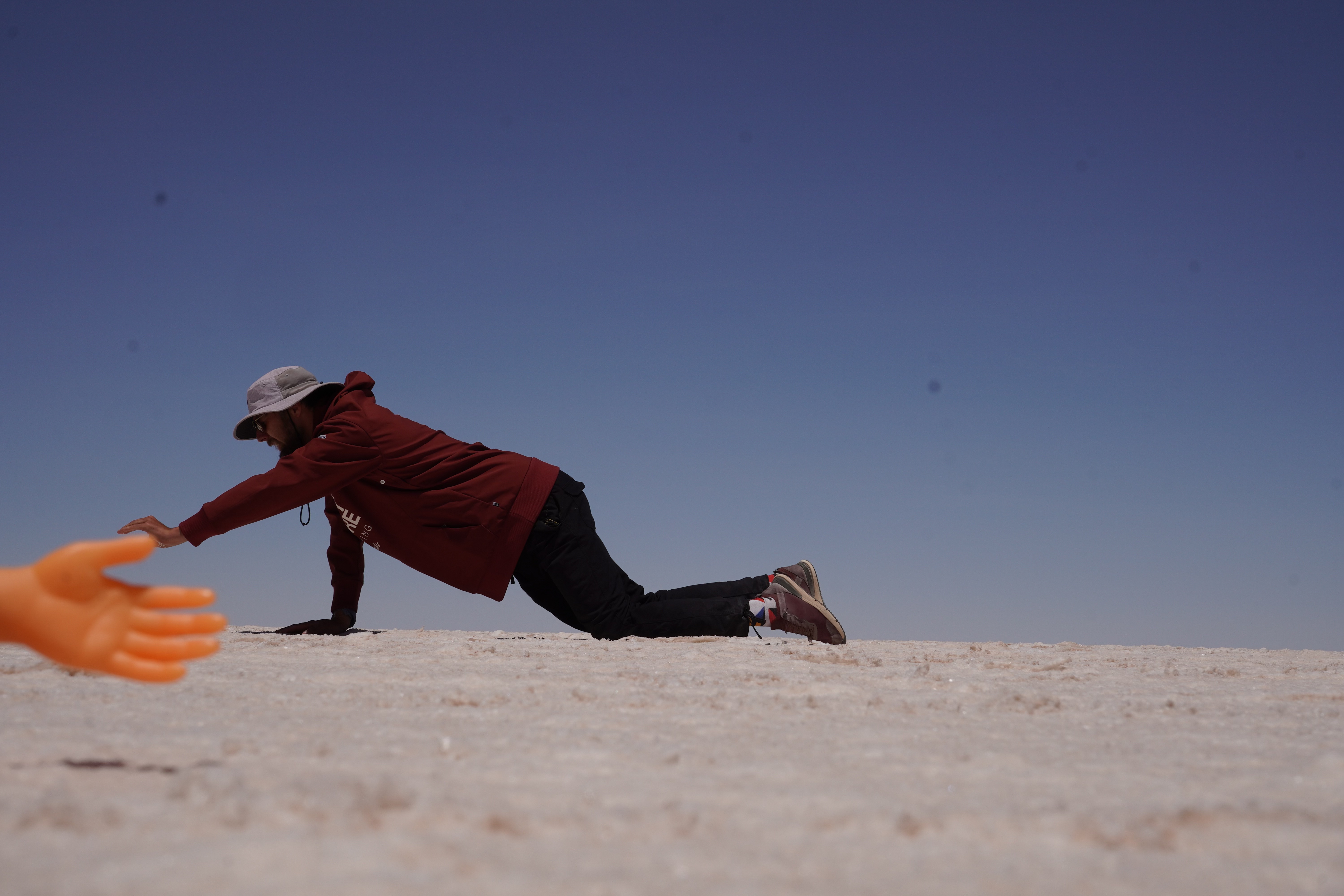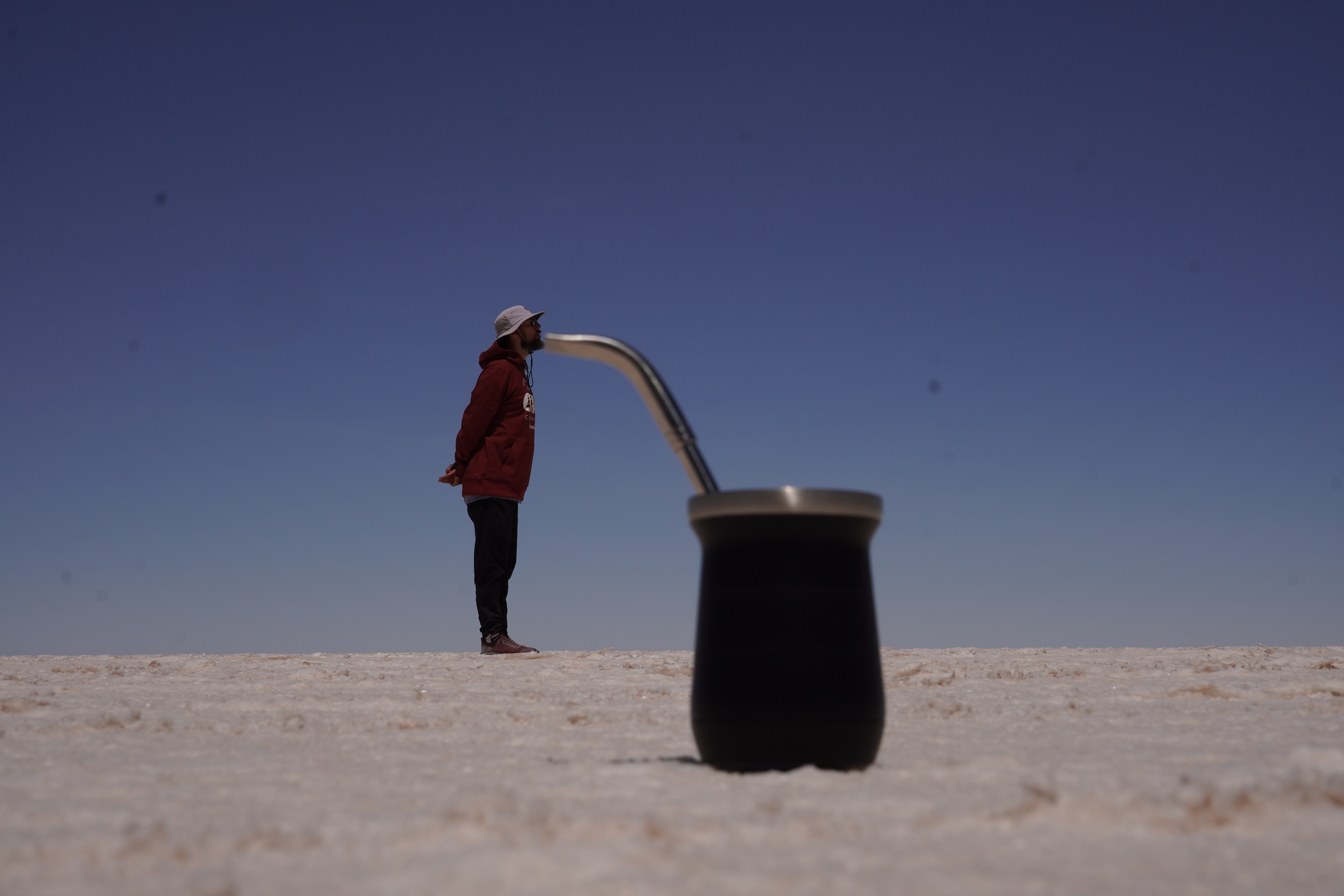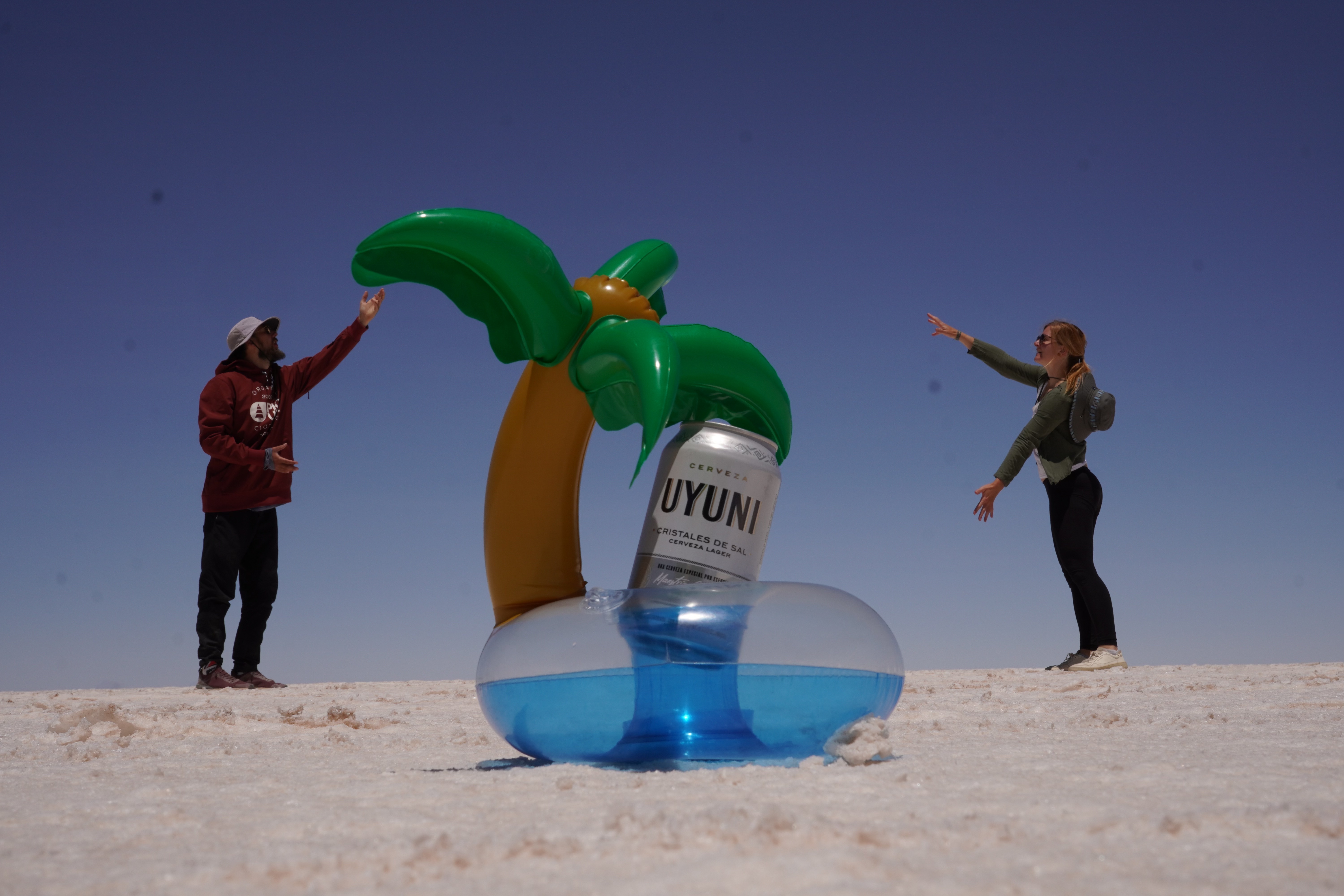 We set up camp at the Escalera al Cielo, the Stairway to Heaven. The next day, we planned to take perspective photos around noon, as the sun would be at its highest, and people and objects would cast no shadows. During the photoshoot, we were visited by Jule and Michi. They’ve been traveling just like us since August and came from the north, like most of the travelers we meet. We parked both vans (they drive an old VW T4 with a pop-up tent) and set up a tarp between the cars to create some shade. It was windy and cool, but the sun, reflected off the salt, was even stronger than usual at this altitude. Guess what happened? That’s right, I got a nasty sunburn on my face because I sat just a little outside of the shadow and took off my hat. Even though I wore sunscreen. We spent the day together, exchanged information about the roads north and south, and cooked together in the evening at the train graveyard. It was nice to have company. Our original plan was to take the bad road back toward the Lagoon Route due to the diesel situation and roadblocks in the country and cross into Chile there. We intended to drive north along the Chilean coast and possibly head to La Paz afterward. Jule and Michi told us how great the road was from here north toward La Paz. Plans, as we know, are meant to be broken. And that’s what we did.