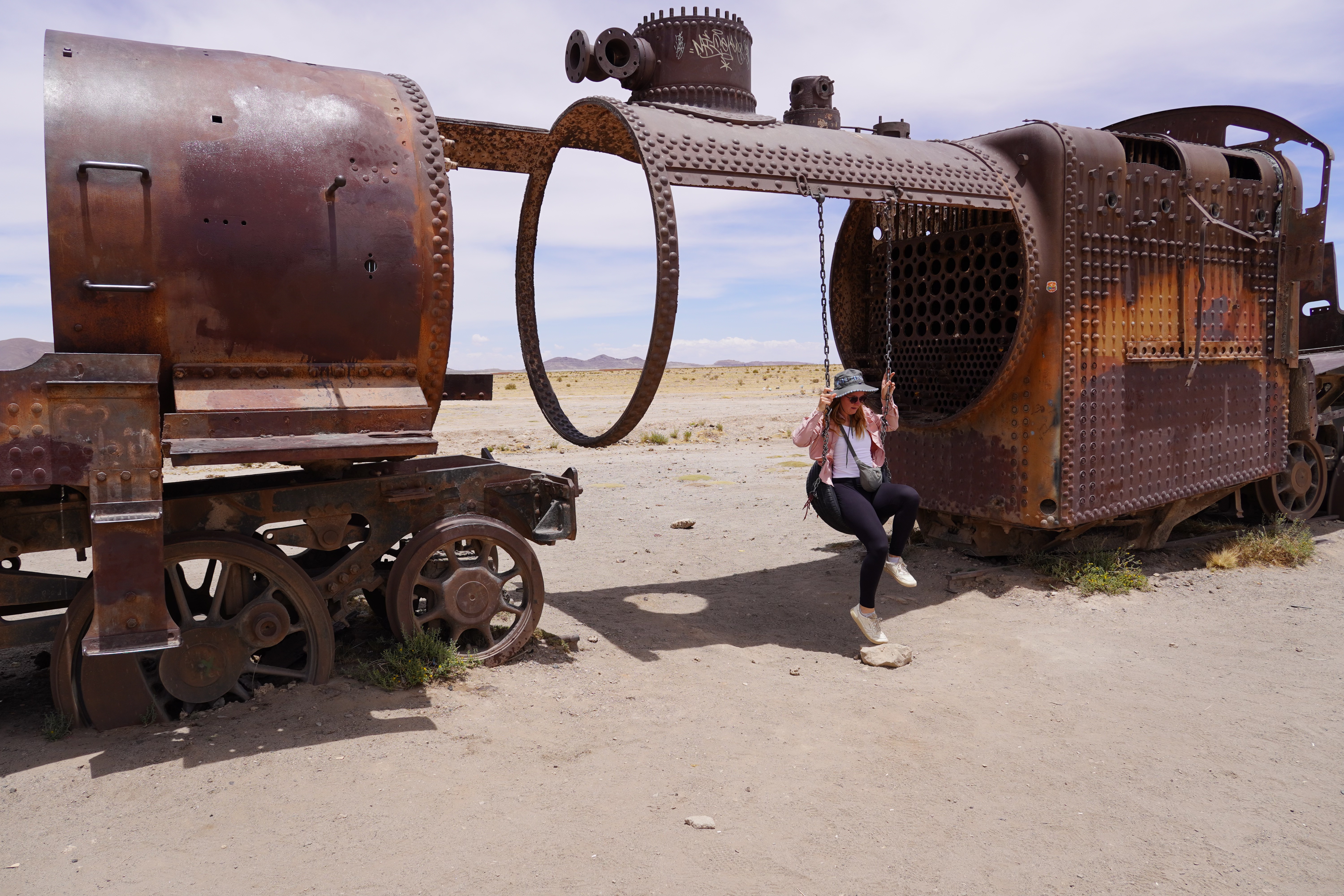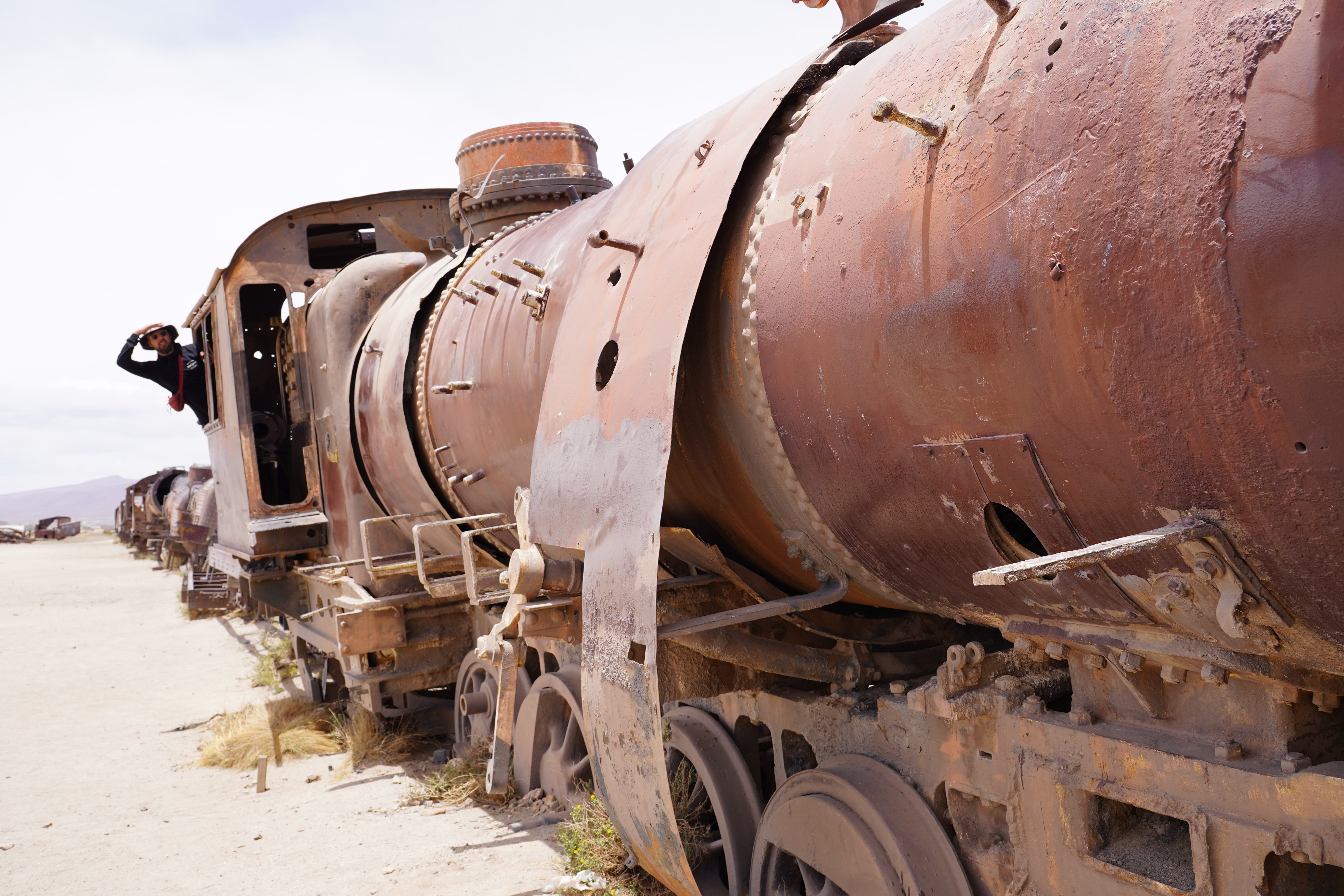 We continued to Uyuni, located 3670 meters above sea level. To us, it felt like being at sea level again, we barely noticed the altitude anymore. We had read beforehand that entering the salt flats with your vehicle during the day could be problematic, so we decided to try in the afternoon. First, we visited the Cementerio de Trenes In the late 19th and early 20th centuries, Uyuni was an important railway hub, mainly transporting silver and other minerals from nearby mines. With the mining industry’s decline in the 1940s, the trains were decommissioned and left behind. Today, the rusting trains resemble art pieces. Some locomotives have been adorned with graffiti, while others are slowly disintegrating in the harsh environment. After taking a few photos and finding a geocache, we headed into Uyuni itself.
