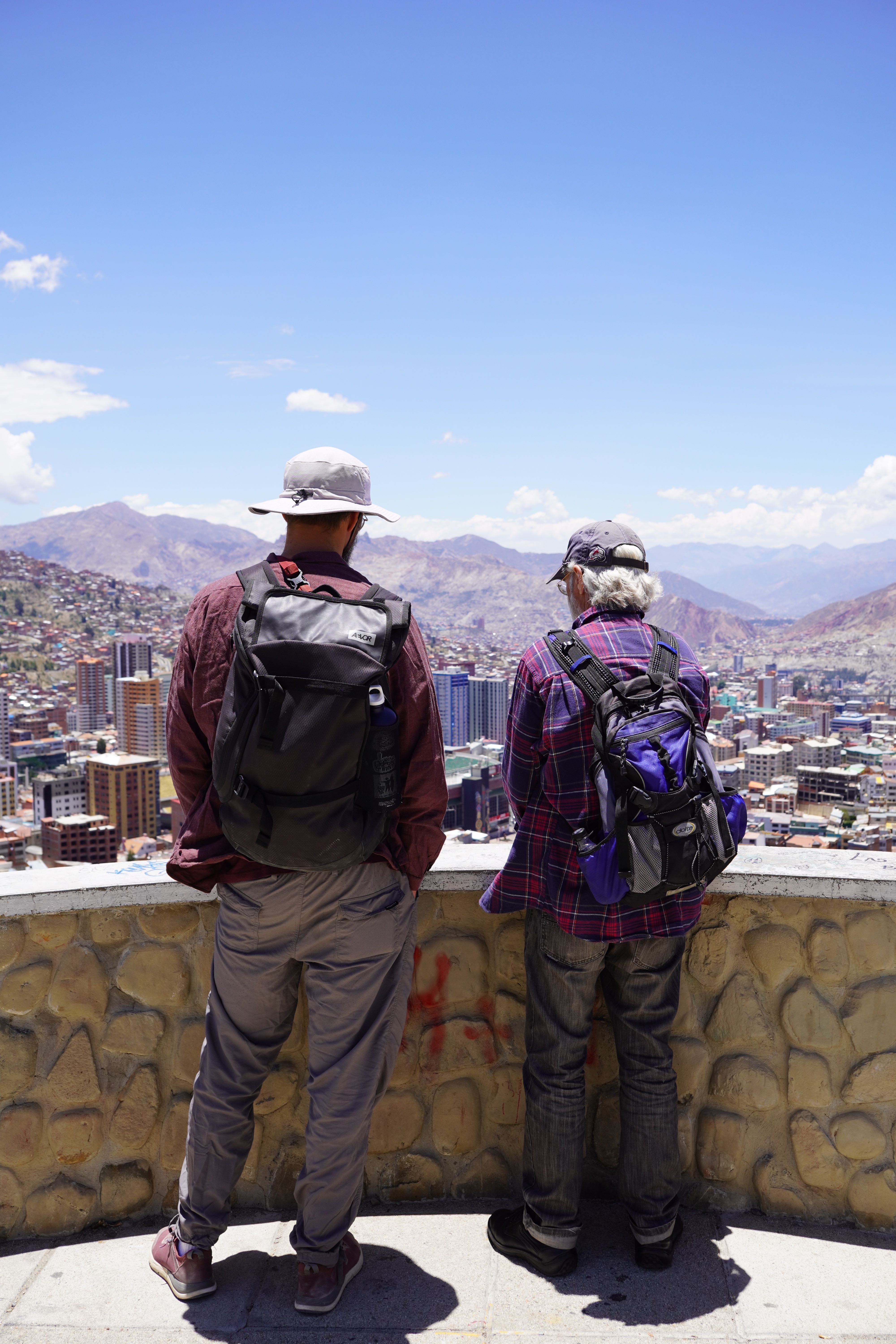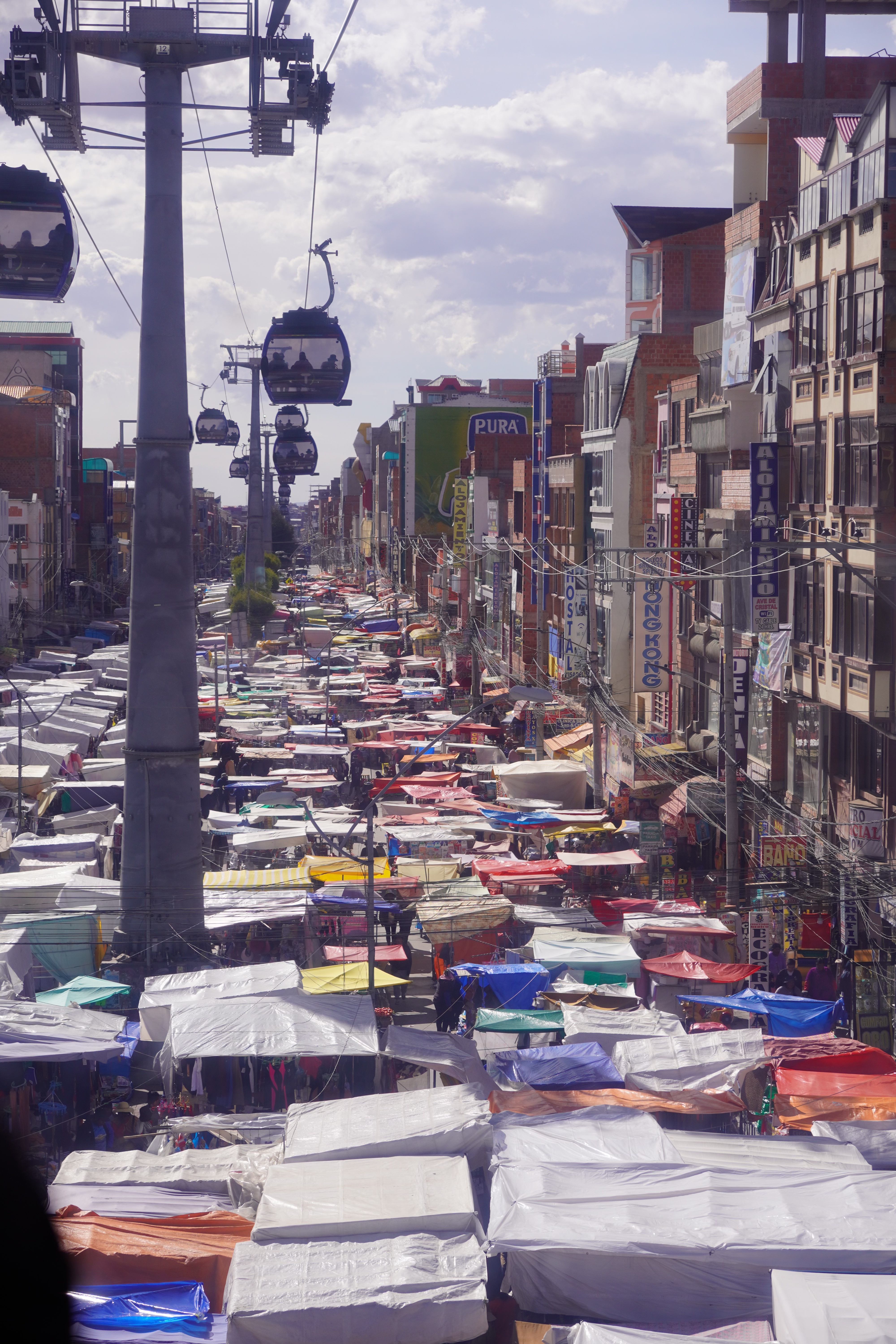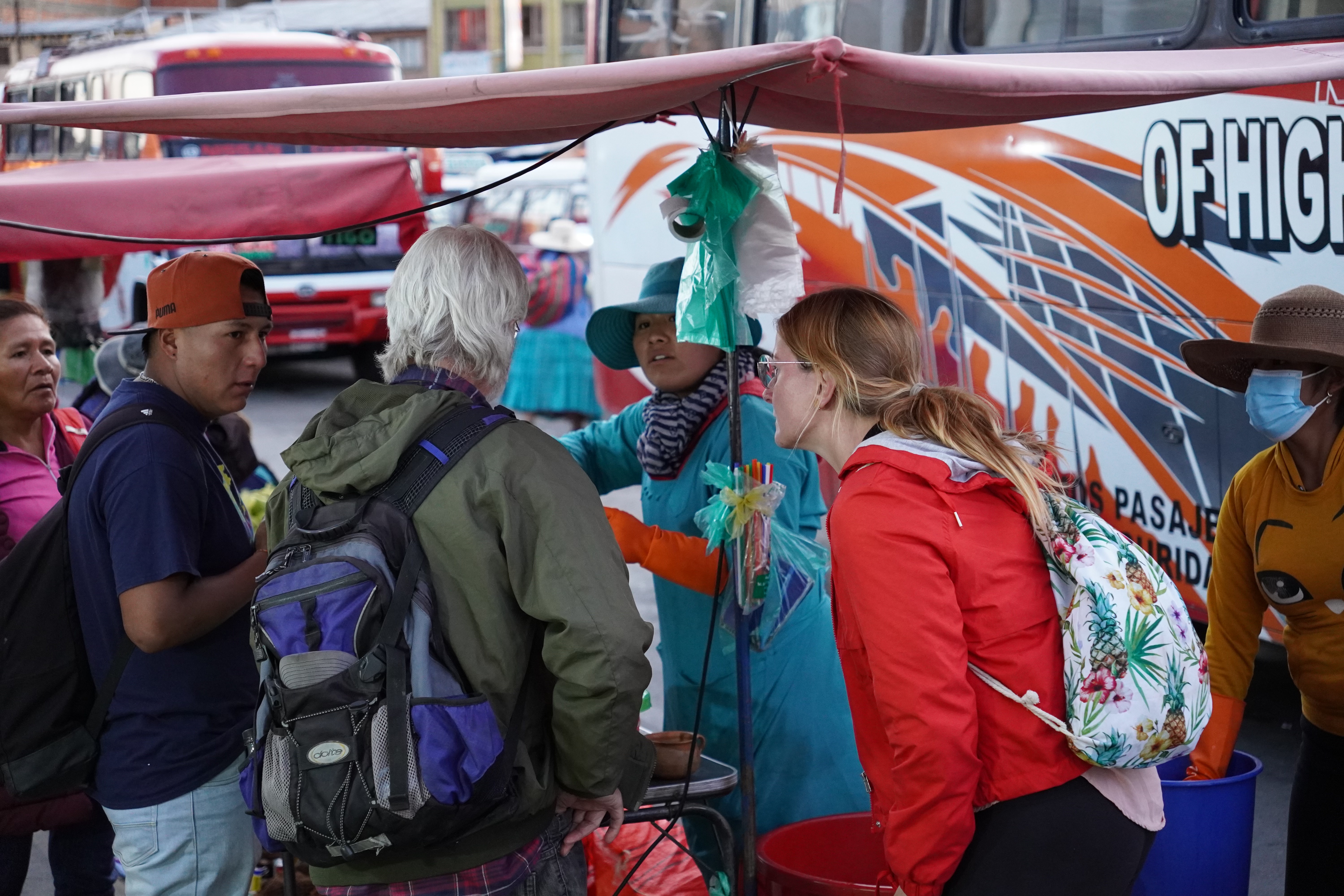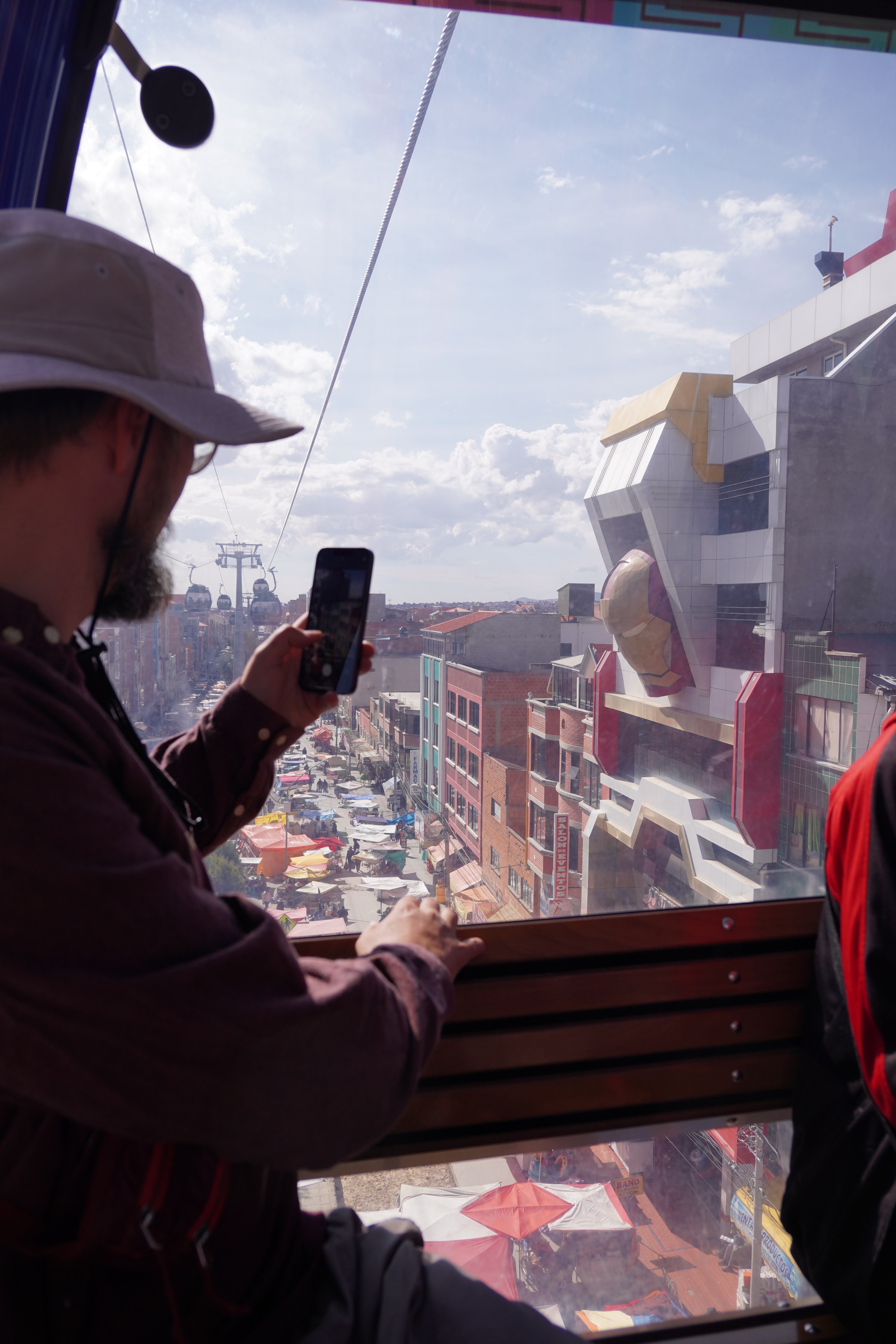 By the way, La Paz isn’t really Bolivia’s capital; that’s Sucre. It’s not accessible to us, as there are roadblocks there. However, La Paz is the government capital, housing the presidential palace and the parliament. So, we drove along a gravel road into the bowl, through the beautiful Valle de la Luna, a moonlike landscape with pointed formations of clay. On the other side of the city, we had to climb a steep road up to the campsite. Jule and Michi had recommended it to us. There were hot showers, a self-service washing machine (a very rare find, which we used twice), a sitting area, and an amazing view of the city. It was more of a car workshop with a small camper area, but nice. For two days, we were the only ones until an older French couple with their off-road van joined us. We didn’t speak French, and they didn’t speak English or Spanish, so our conversations were limited to “Alors, buenos dias, merci, oui, si, au revoir.” Björn and I were always amazed at how many older people travel the Pan-American Highway. They were probably in their 70s. On our first day in La Paz, we did an 8-hour city tour with Gerd. It wasn’t easy to get to the meeting point of the Teleférico, but thanks to Uber, after 30 minutes of waiting, we got there for about €2. All of La Paz is crisscrossed by cable cars from the company Dopplmayer (exactly like ski lifts in the Alps and just as modern), which locals can use to get around, instead of taking the minibus or mototaxi or tuktuk like most of them do. Gerd was born in Germany, and his family moved to South America early; he’s been living in La Paz for 40 years. We learned a lot about Bolivia’s history, government, and the country’s issues. From the Mirador Killi Killi, we had an incredible view of the city. We explored the government district, ate Salteñas (similar to empanadas but with firmer dough and a liquid filling – the trick is not to spill any), and visited the Sunday market in El Alto. The market in El Alto is one of the largest in South America, and perhaps even the world. It spans several square kilometers and runs through many streets of the city. The market is so large that it takes hours or even a whole day to explore fully. Here, you can find anything, really anything. In El Alto, we marveled at the Cholitas and their fashion, and the Cholets. Cholets are an iconic architectural phenomenon in El Alto. The term comes from “Cholo” (a term often used to describe the indigenous population) and “Chalet.” These extravagant buildings are a symbol of the growing wealth of the indigenous Aymara elite and blend tradition with modernity. The best place to view them was from the lift.