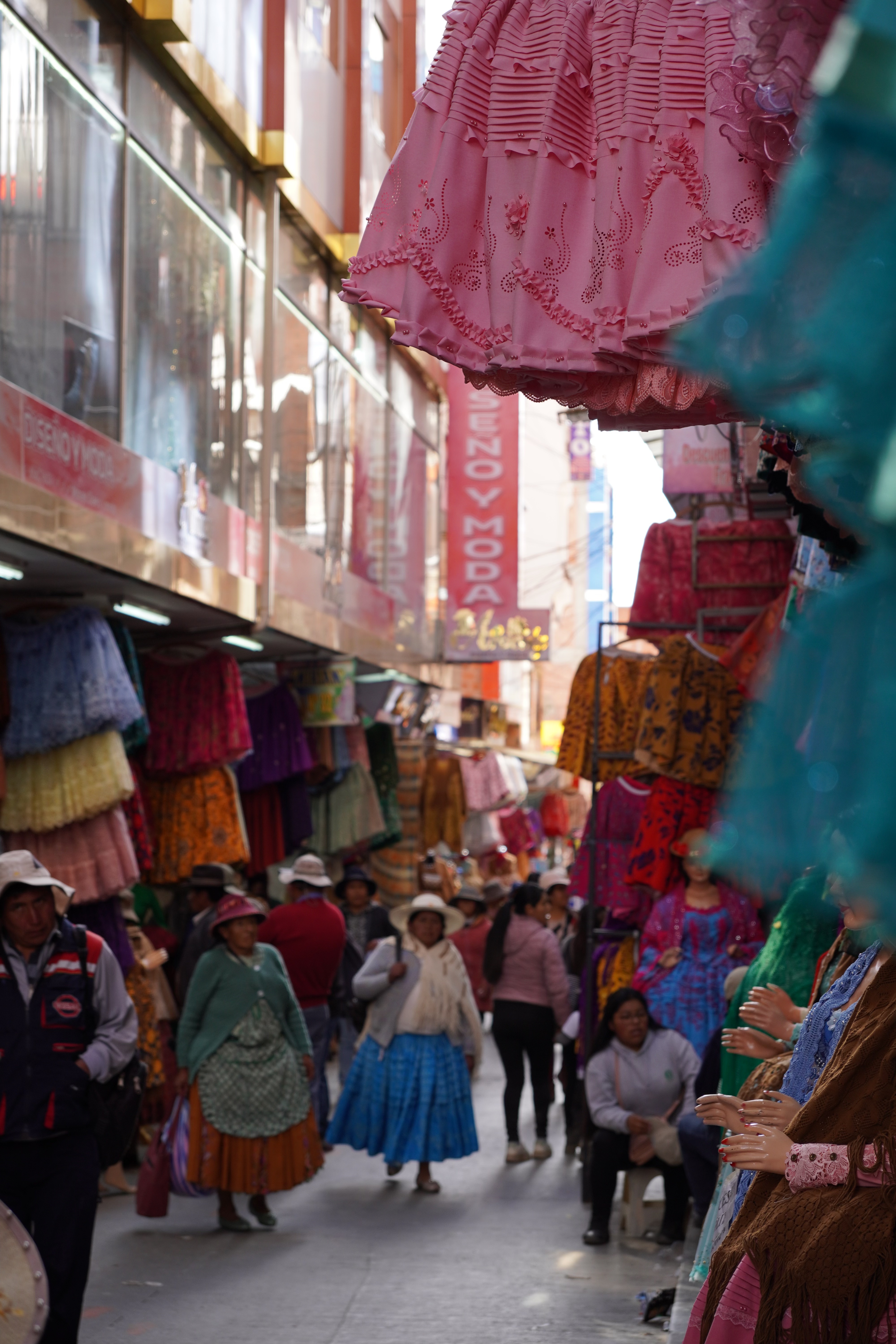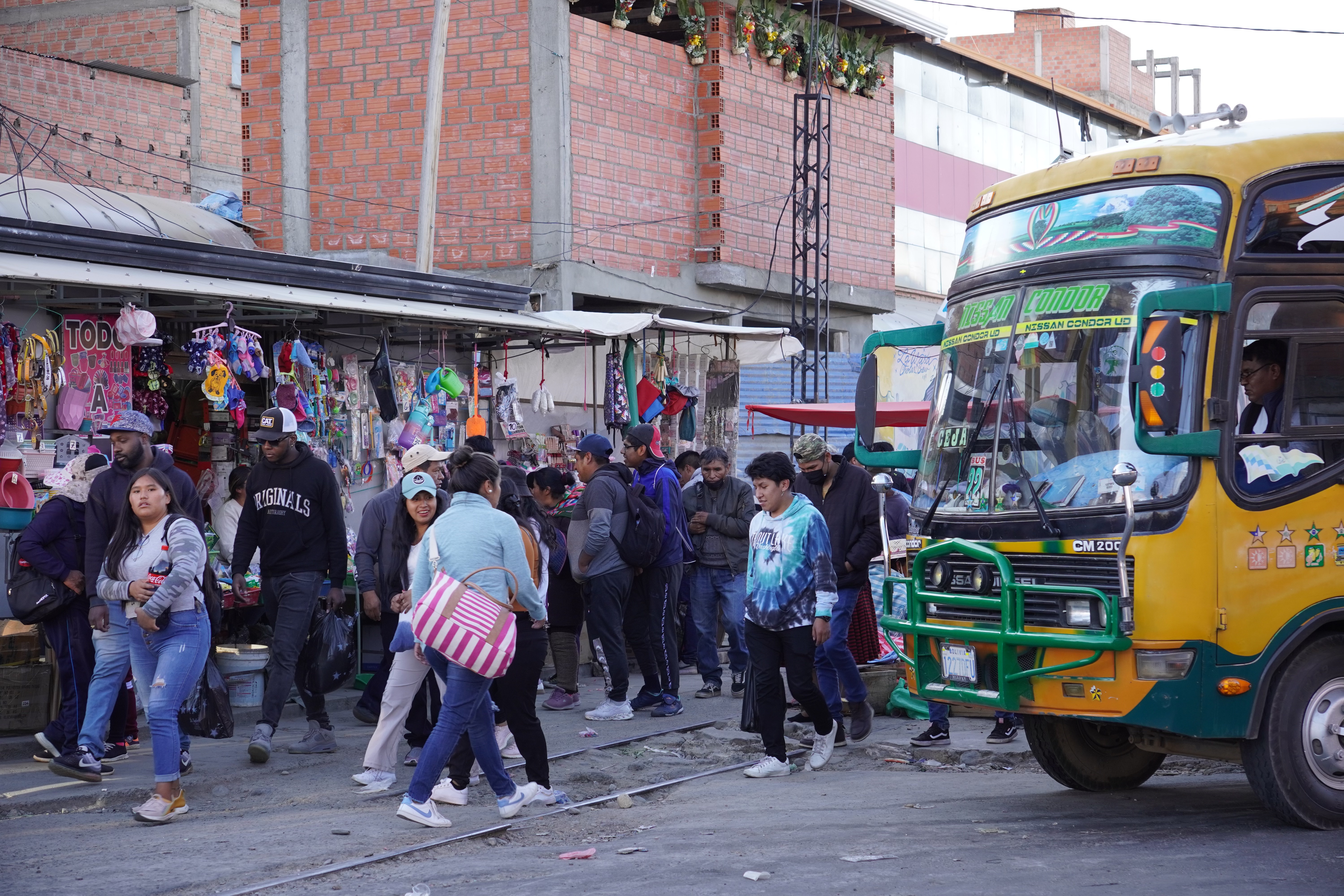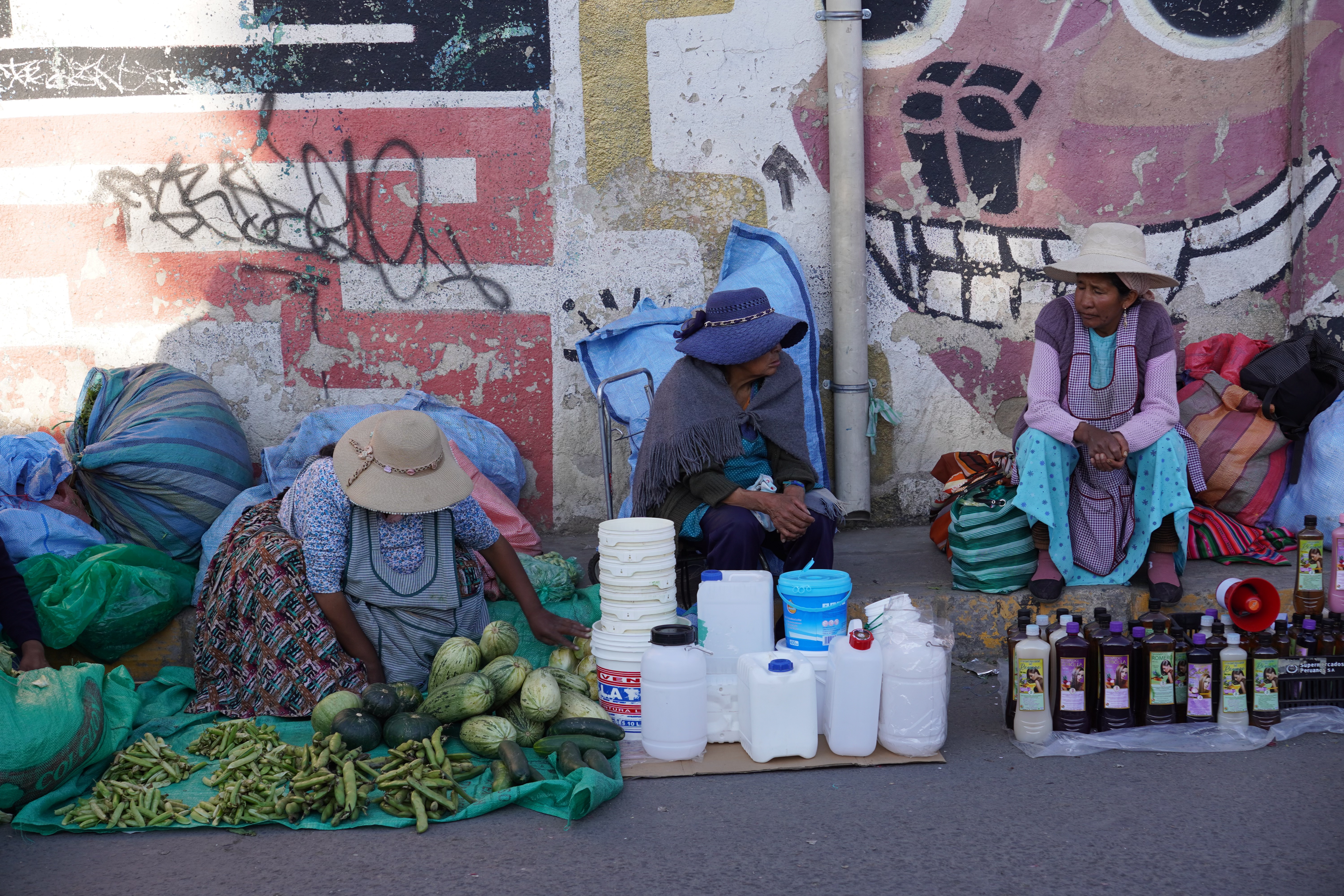 By the way, La Paz isn’t really Bolivia’s capital; that’s Sucre. It’s not accessible to us, as there are roadblocks there. However, La Paz is the government capital, housing the presidential palace and the parliament. So, we drove along a gravel road into the bowl, through the beautiful Valle de la Luna, a moonlike landscape with pointed formations of clay. On the other side of the city, we had to climb a steep road up to the campsite. Jule and Michi had recommended it to us. There were hot showers, a self-service washing machine (a very rare find, which we used twice), a sitting area, and an amazing view of the city. It was more of a car workshop with a small camper area, but nice. For two days, we were the only ones until an older French couple with their off-road van joined us. We didn’t speak French, and they didn’t speak English or Spanish, so our conversations were limited to “Alors, buenos dias, merci, oui, si, au revoir.” Björn and I were always amazed at how many older people travel the Pan-American Highway. They were probably in their 70s. On our first day in La Paz, we did an 8-hour city tour with Gerd. It wasn’t easy to get to the meeting point of the Teleférico, but thanks to Uber, after 30 minutes of waiting, we got there for about €2. All of La Paz is crisscrossed by cable cars from the company Dopplmayer (exactly like ski lifts in the Alps and just as modern), which locals can use to get around, instead of taking the minibus or mototaxi or tuktuk like most of them do. Gerd was born in Germany, and his family moved to South America early; he’s been living in La Paz for 40 years. We learned a lot about Bolivia’s history, government, and the country’s issues. From the Mirador Killi Killi, we had an incredible view of the city. We explored the government district, ate Salteñas (similar to empanadas but with firmer dough and a liquid filling – the trick is not to spill any), and visited the Sunday market in El Alto. The market in El Alto is one of the largest in South America, and perhaps even the world. It spans several square kilometers and runs through many streets of the city. The market is so large that it takes hours or even a whole day to explore fully. Here, you can find anything, really anything. In El Alto, we marveled at the Cholitas and their fashion, and the Cholets. Cholets are an iconic architectural phenomenon in El Alto. The term comes from “Cholo” (a term often used to describe the indigenous population) and “Chalet.” These extravagant buildings are a symbol of the growing wealth of the indigenous Aymara elite and blend tradition with modernity. The best place to view them was from the lift.
