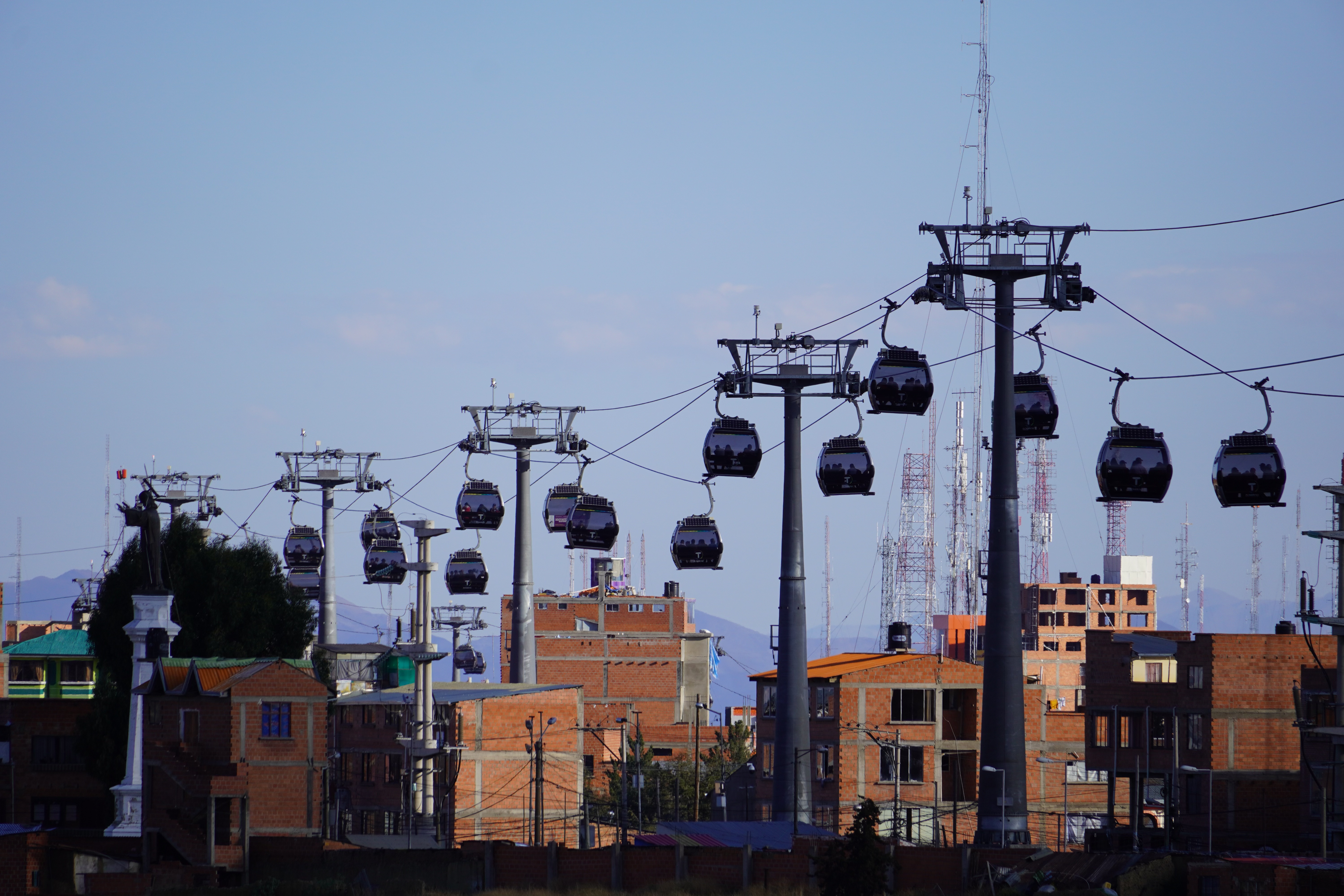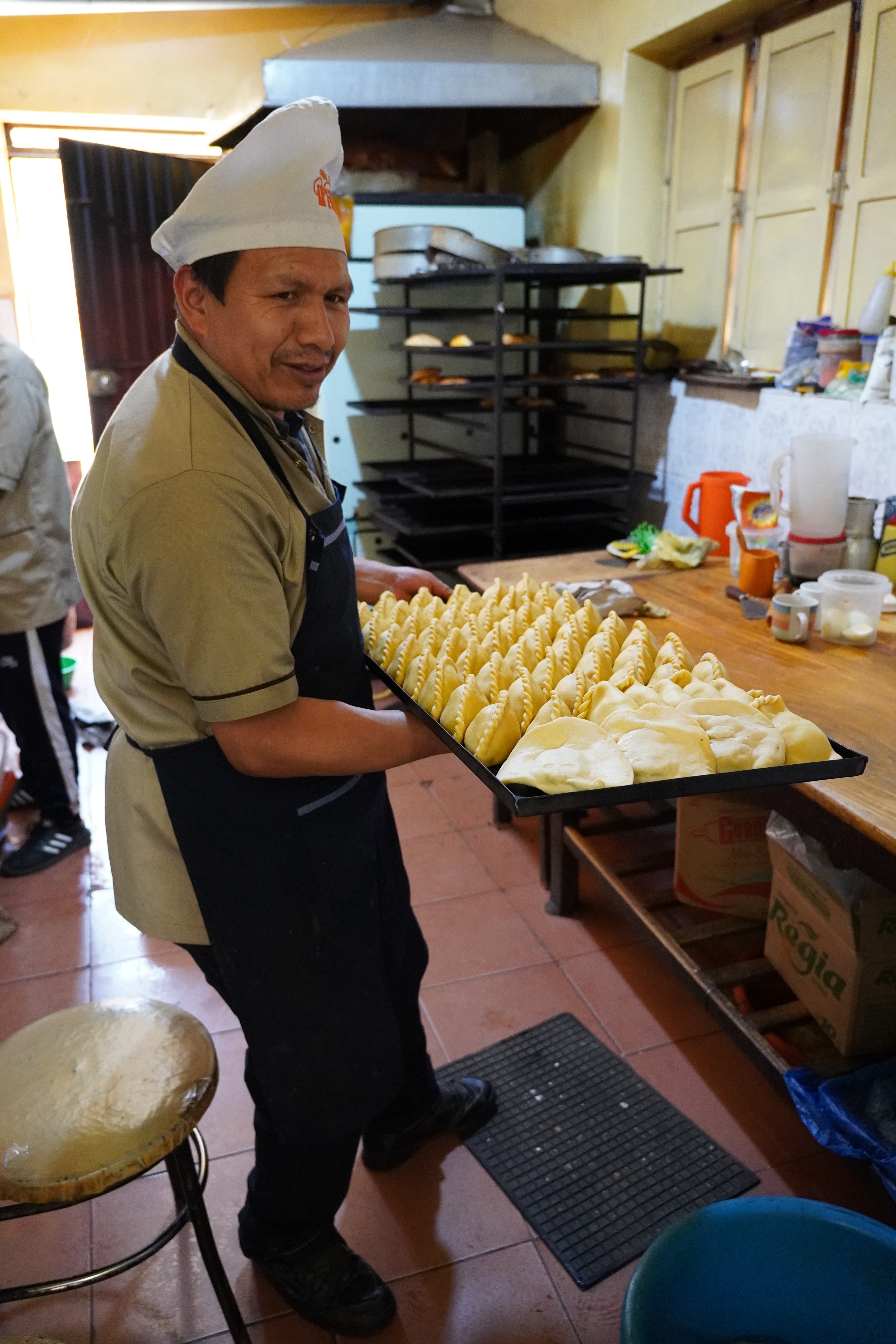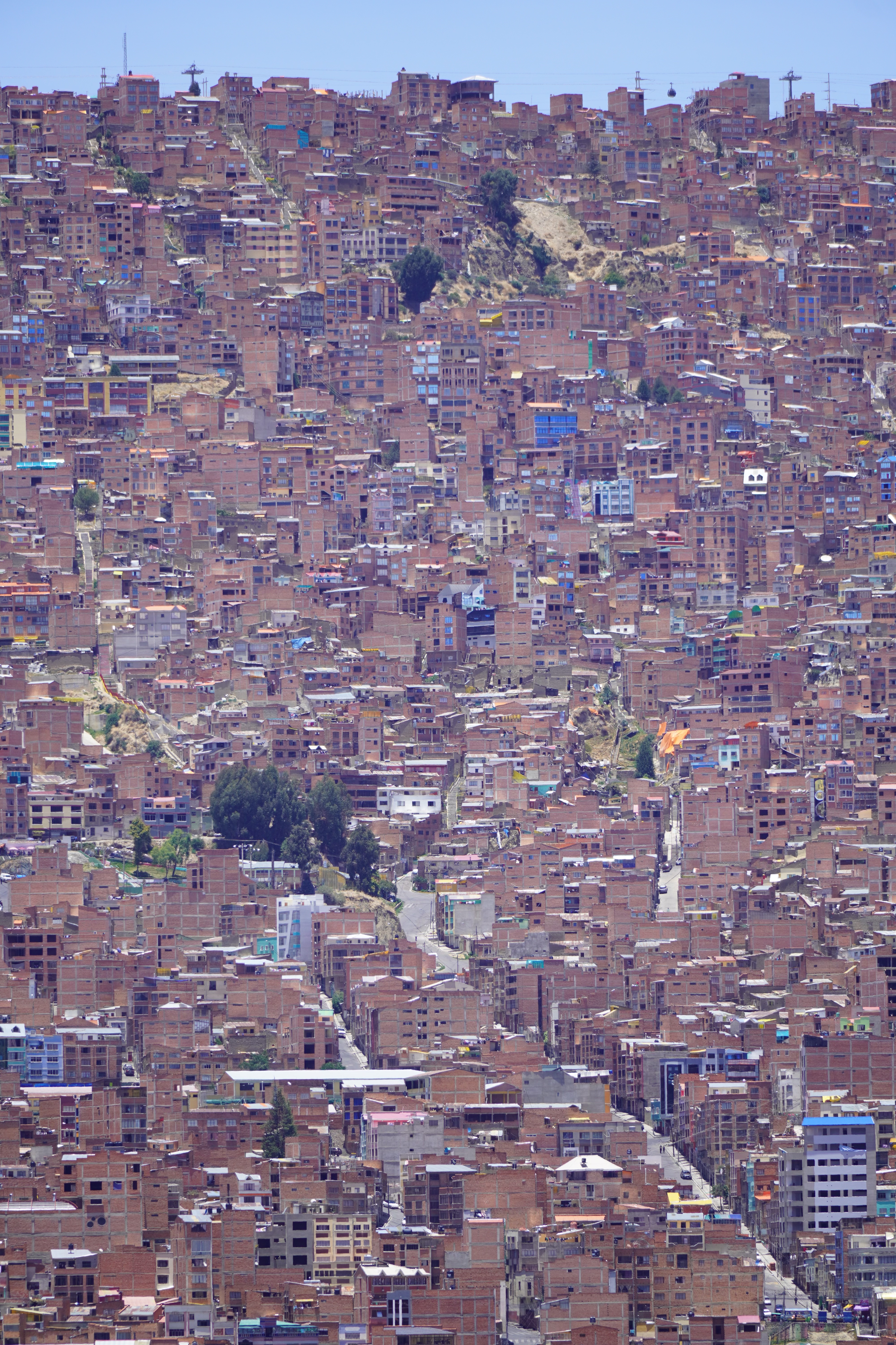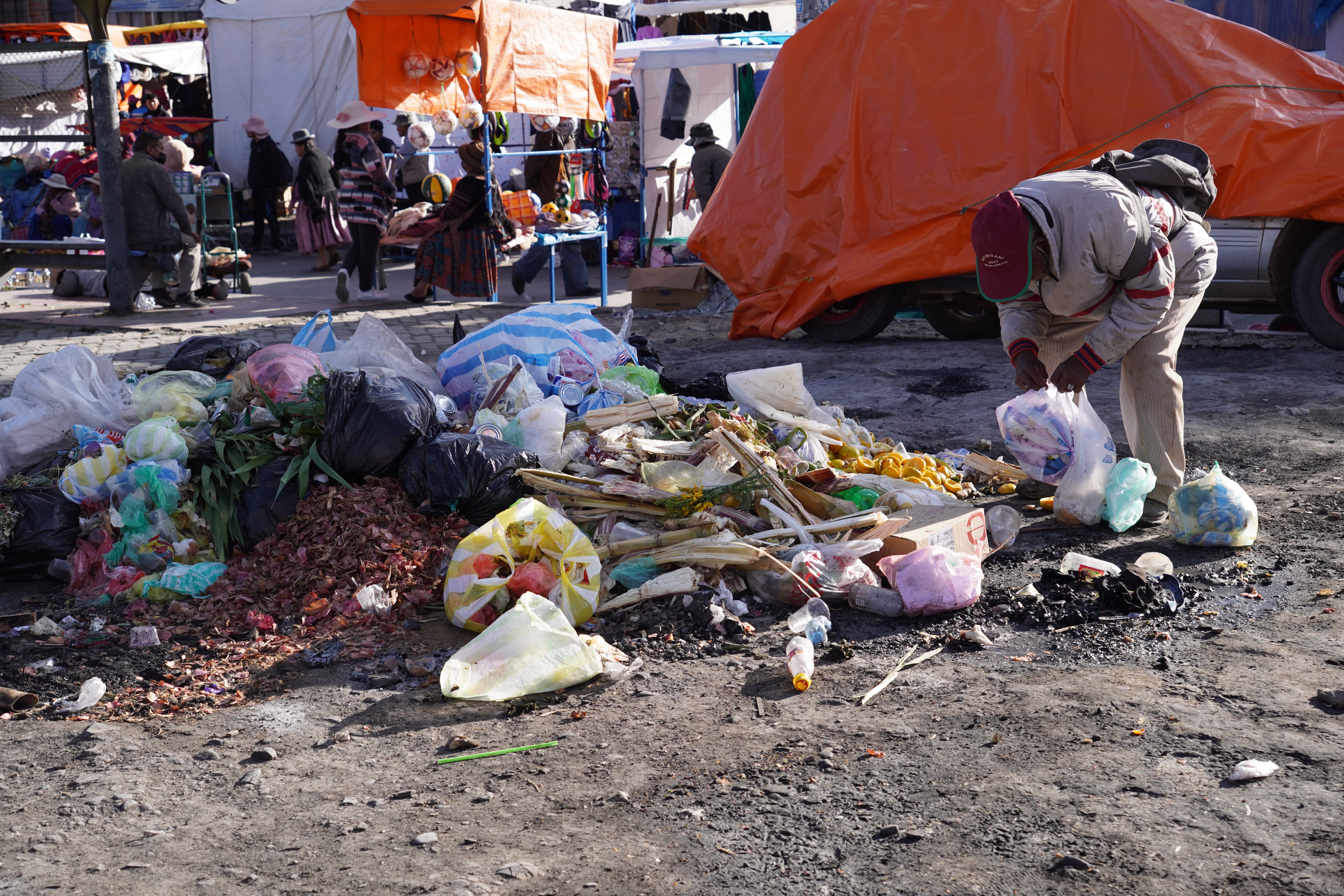 By the way, La Paz isn’t really Bolivia’s capital; that’s Sucre. It’s not accessible to us, as there are roadblocks there. However, La Paz is the government capital, housing the presidential palace and the parliament. So, we drove along a gravel road into the bowl, through the beautiful Valle de la Luna, a moonlike landscape with pointed formations of clay. On the other side of the city, we had to climb a steep road up to the campsite. Jule and Michi had recommended it to us. There were hot showers, a self-service washing machine (a very rare find, which we used twice), a sitting area, and an amazing view of the city. It was more of a car workshop with a small camper area, but nice. For two days, we were the only ones until an older French couple with their off-road van joined us. We didn’t speak French, and they didn’t speak English or Spanish, so our conversations were limited to “Alors, buenos dias, merci, oui, si, au revoir.” Björn and I were always amazed at how many older people travel the Pan-American Highway. They were probably in their 70s. On our first day in La Paz, we did an 8-hour city tour with Gerd. It wasn’t easy to get to the meeting point of the Teleférico, but thanks to Uber, after 30 minutes of waiting, we got there for about €2. All of La Paz is crisscrossed by cable cars from the company Dopplmayer (exactly like ski lifts in the Alps and just as modern), which locals can use to get around, instead of taking the minibus or mototaxi or tuktuk like most of them do. Gerd was born in Germany, and his family moved to South America early; he’s been living in La Paz for 40 years. We learned a lot about Bolivia’s history, government, and the country’s issues. From the Mirador Killi Killi, we had an incredible view of the city. We explored the government district, ate Salteñas (similar to empanadas but with firmer dough and a liquid filling – the trick is not to spill any), and visited the Sunday market in El Alto. The market in El Alto is one of the largest in South America, and perhaps even the world. It spans several square kilometers and runs through many streets of the city. The market is so large that it takes hours or even a whole day to explore fully. Here, you can find anything, really anything. In El Alto, we marveled at the Cholitas and their fashion, and the Cholets. Cholets are an iconic architectural phenomenon in El Alto. The term comes from “Cholo” (a term often used to describe the indigenous population) and “Chalet.” These extravagant buildings are a symbol of the growing wealth of the indigenous Aymara elite and blend tradition with modernity. The best place to view them was from the lift.