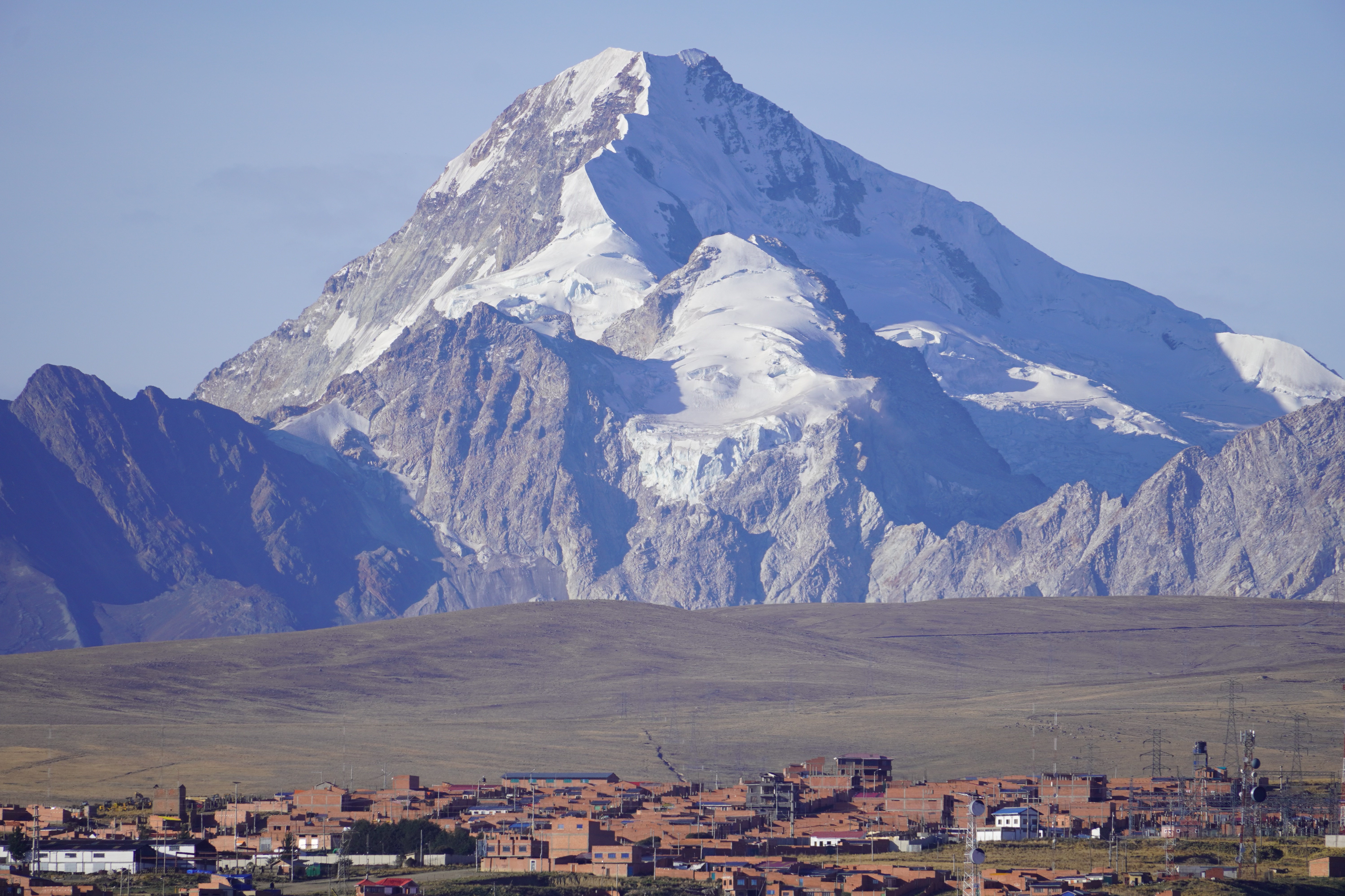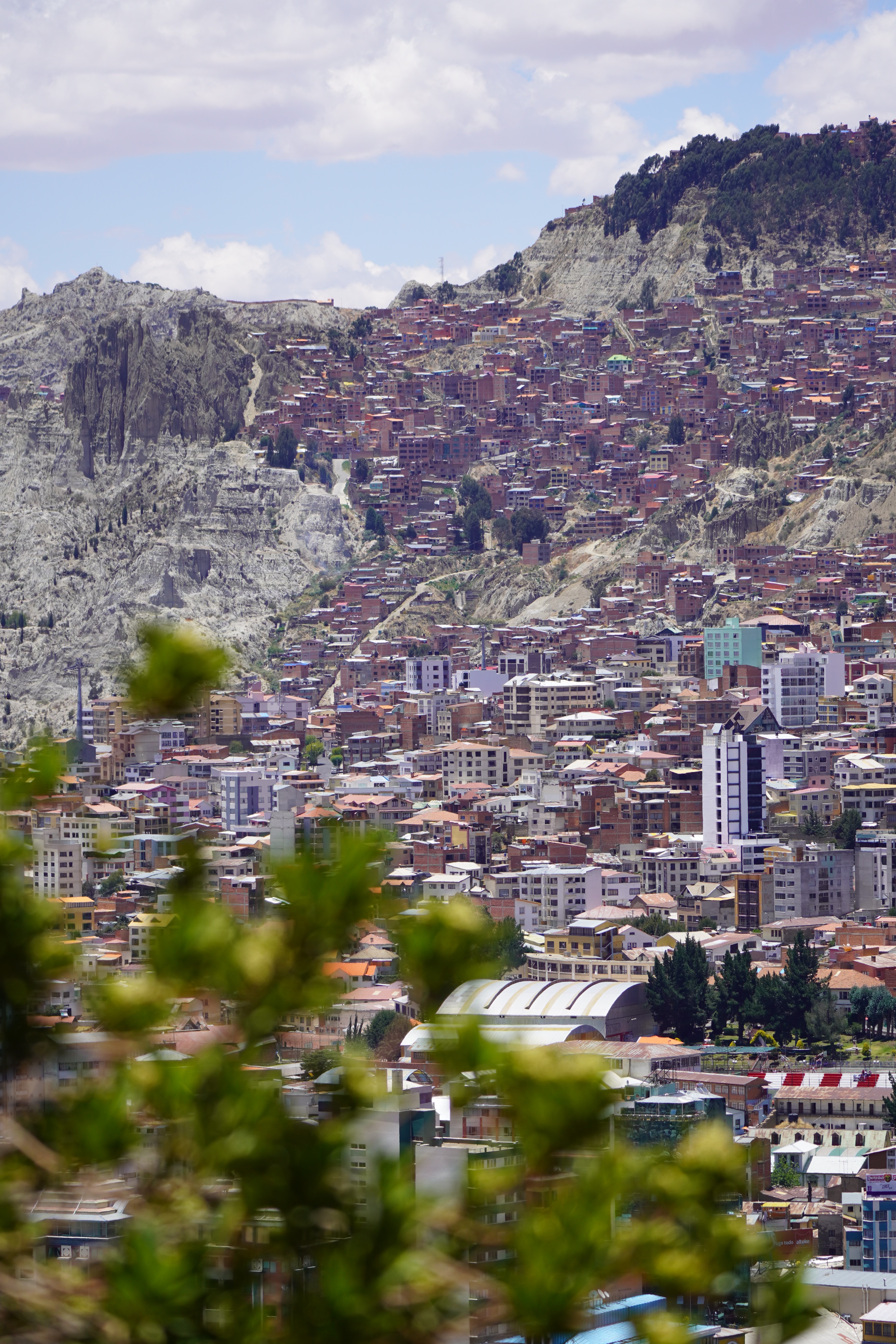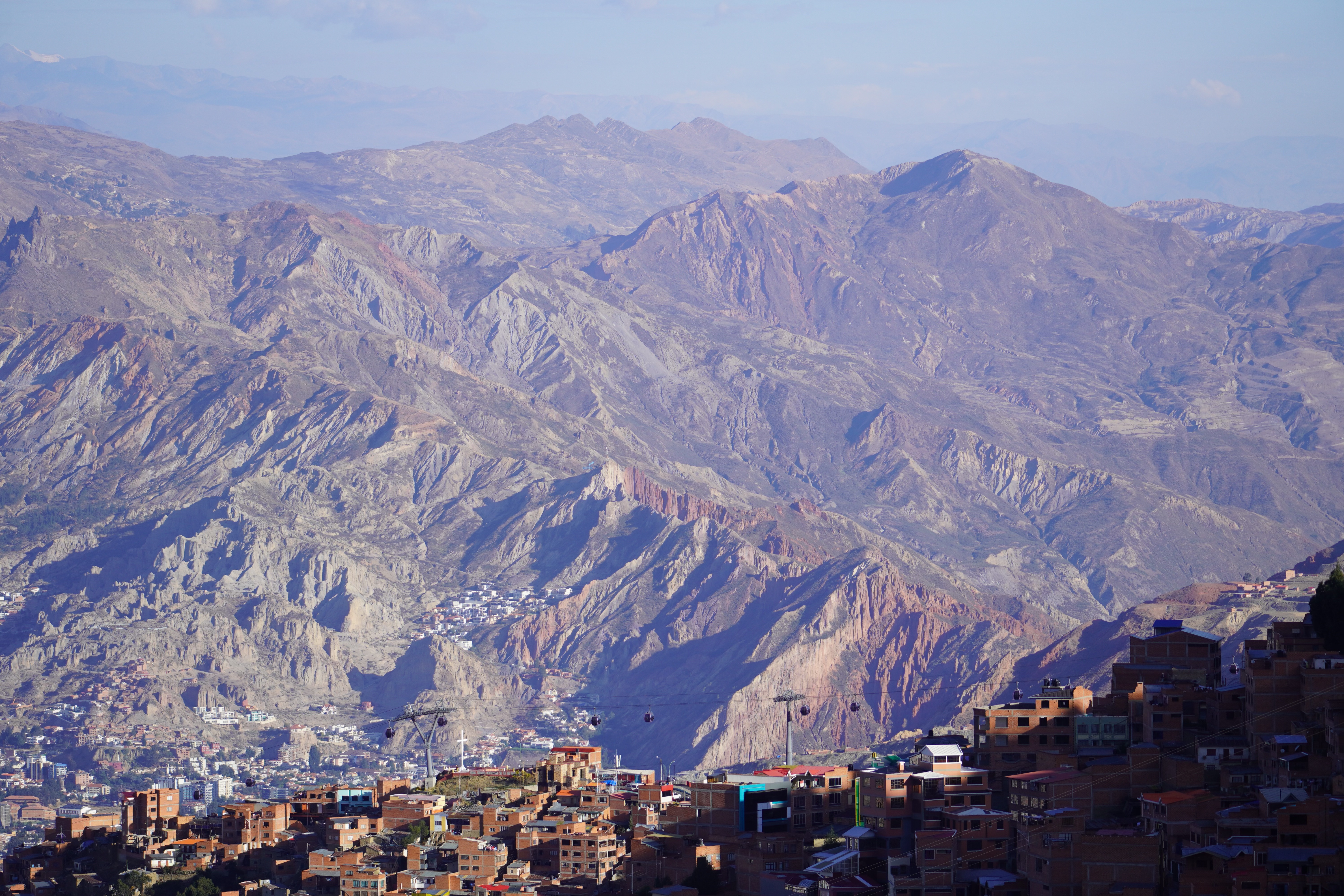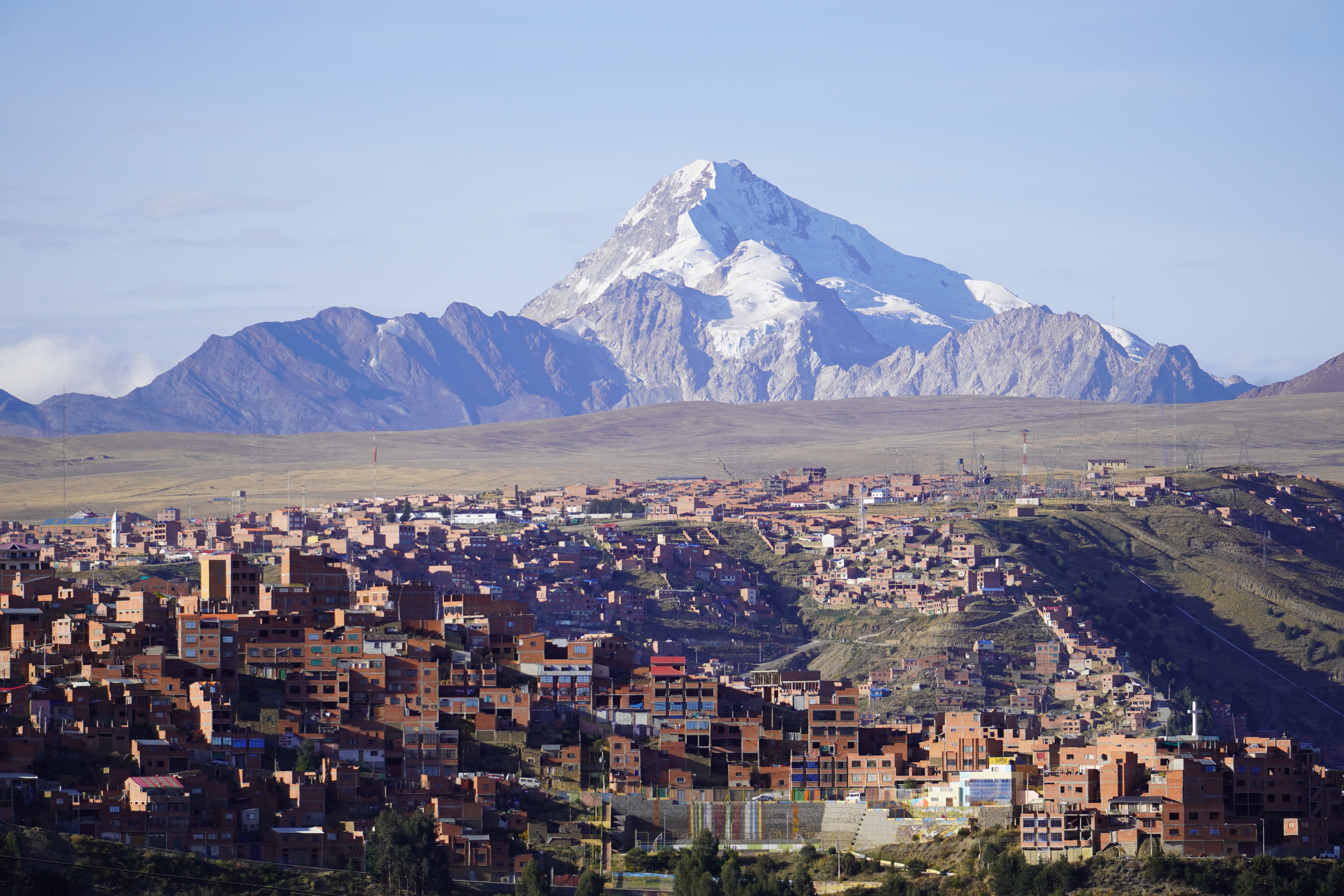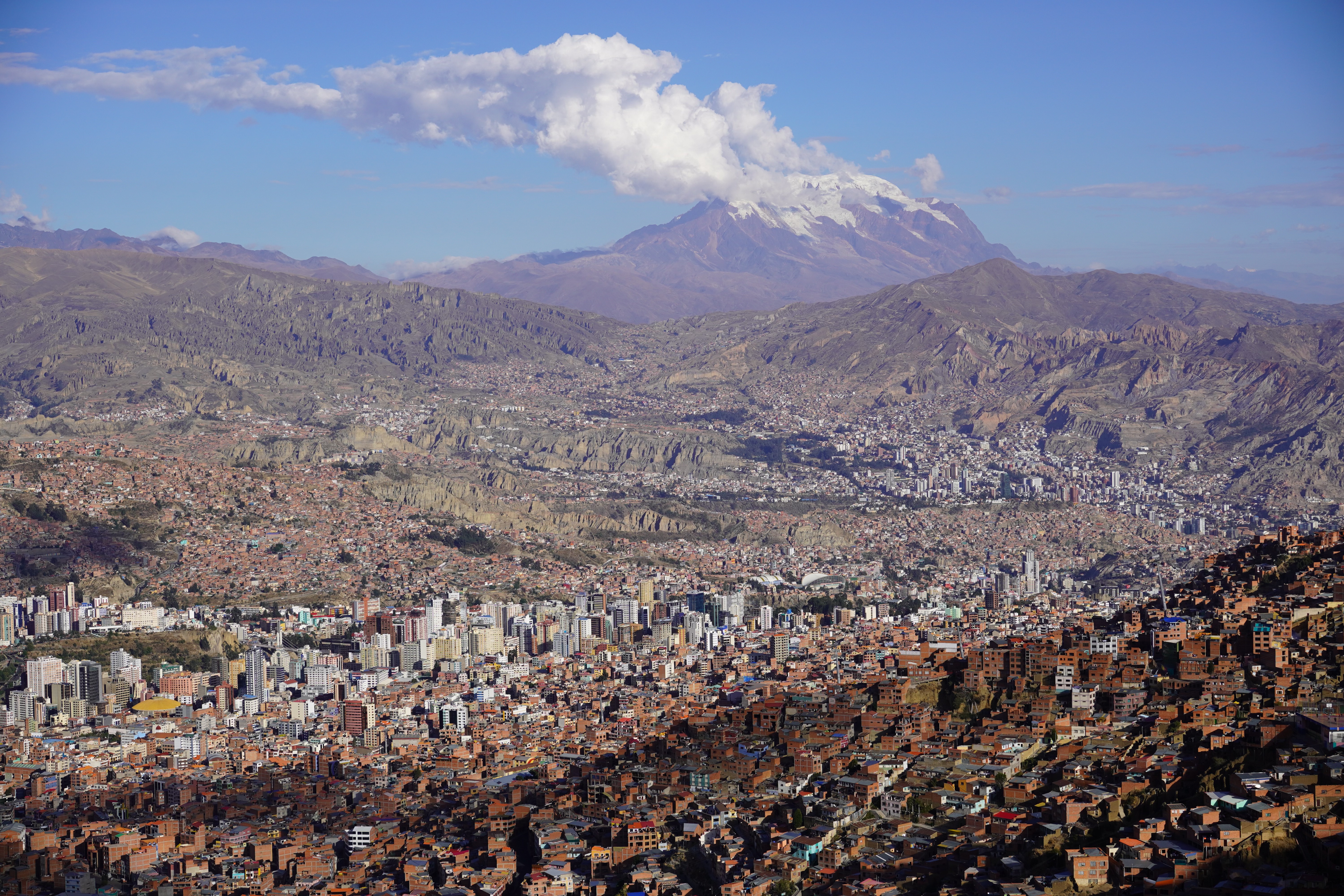 On the way to La Paz, we saw the real Bolivia, without tourists or tour jeeps. Simple, small houses. Tied-up cows, sheep, and pigs by the roadside. Traditionally dressed Bolivians. We also saw the first tuk-tuks. Small mopeds with a cabin that can fit three people. They look like tiny cars, mostly in Batman design. It took us two days from Uyuni to La Paz, with an overnight stop near the dried-up Lago Poopó. Unfortunately, we had to go through the big city of Oruro, which took us some time and nerves. The arrival in La Paz was just as challenging. Google Maps directed us down a steep gravel slope. For those who, like us, had never been to La Paz, it’s hard to imagine what it’s like to drive there. It is very steep. Cars honk and cut in front of you. You don’t feel very comfortable on the road. The city lies in a bowl, surrounded by tall mountains: Illimani (6438m), Huayna Potosí (6088m), and the now-vanished Chacaltaya ski resort (5421m). The city extends at an altitude of about 3200m in the lower, wealthier zones and up to over 4000m in the higher, poorer neighborhoods like El Alto, which is not a district of La Paz, but a separate city. The altitude difference is over 800 meters. Together, the two cities form Bolivia’s most populous urban area, with 1.8 million people.