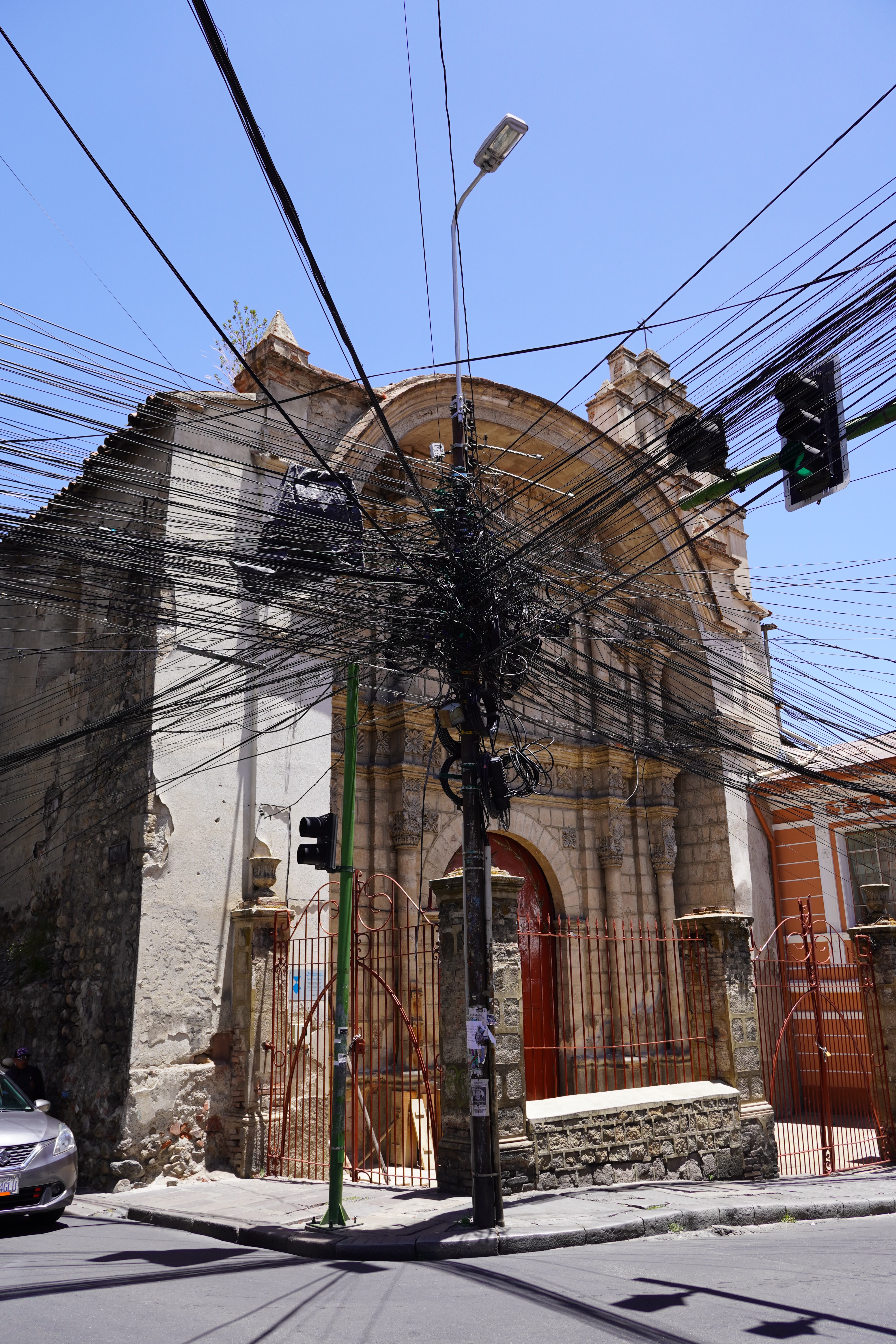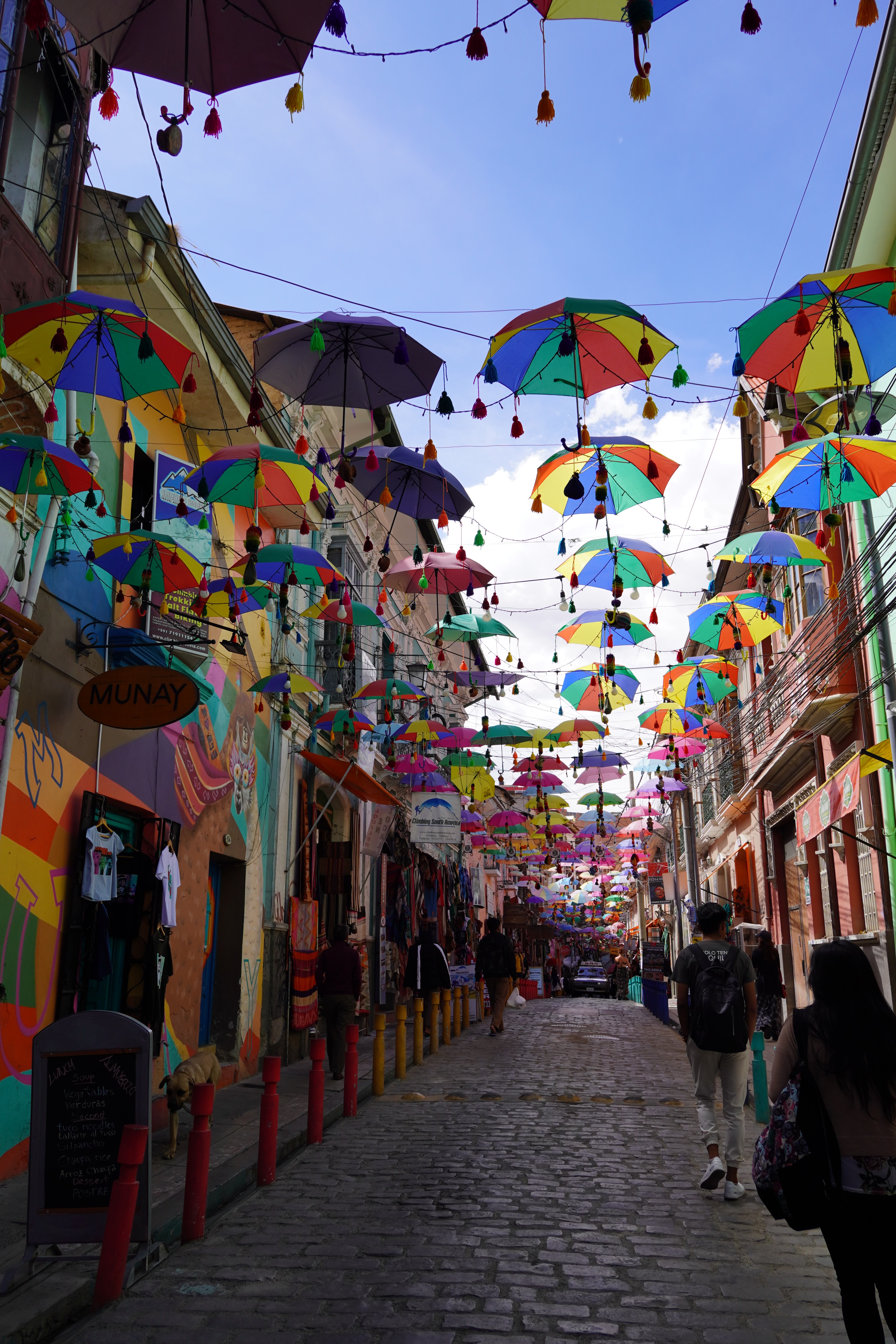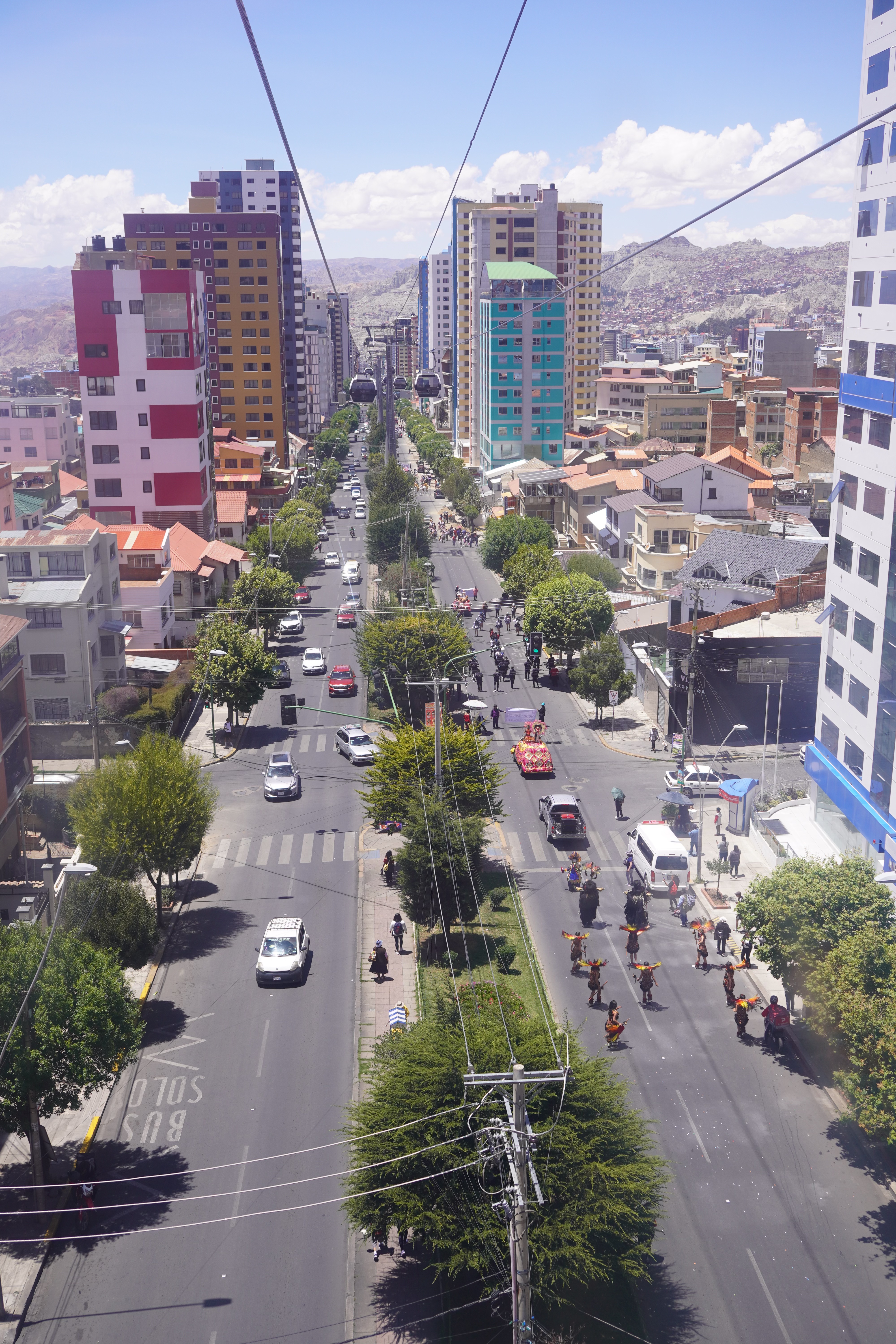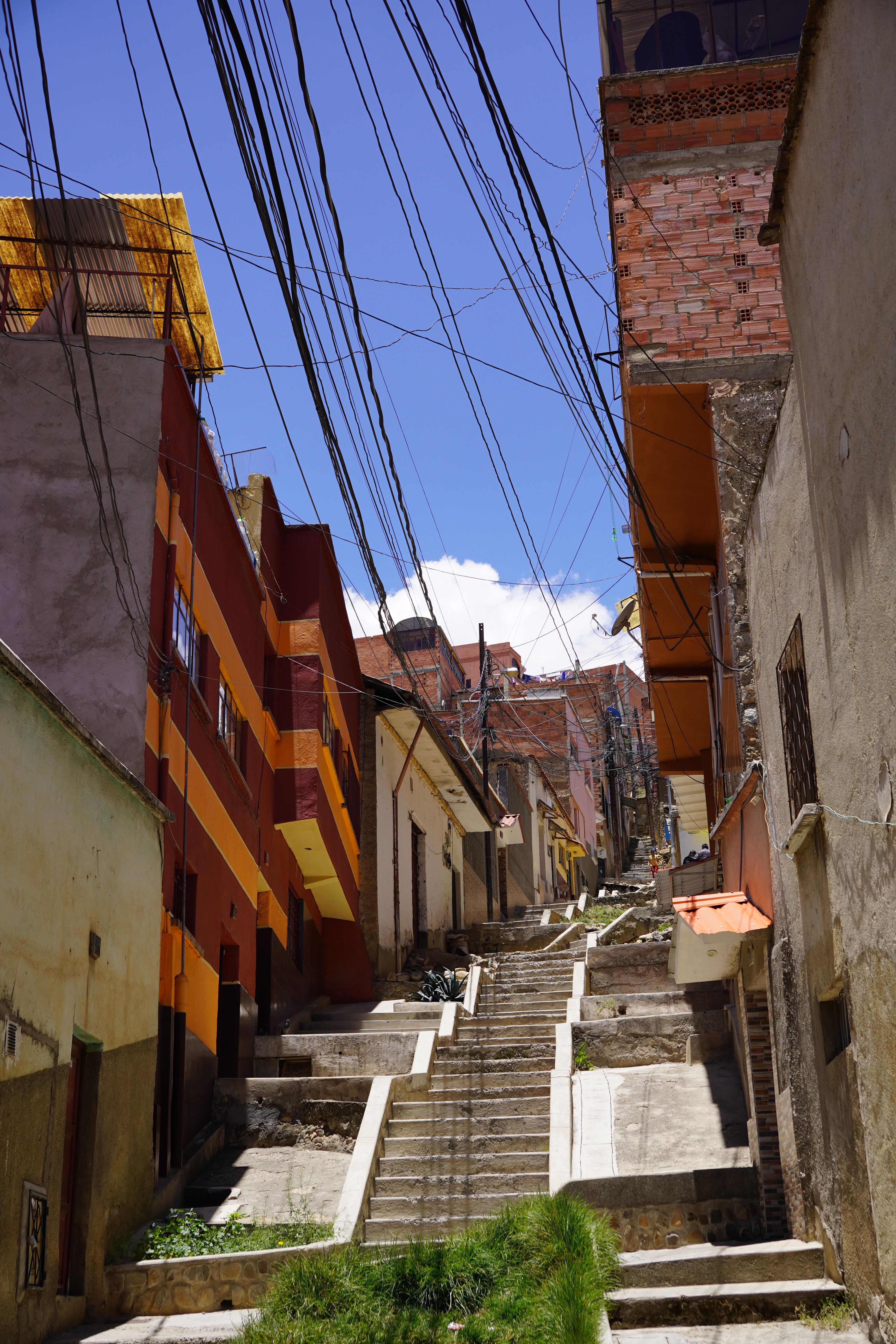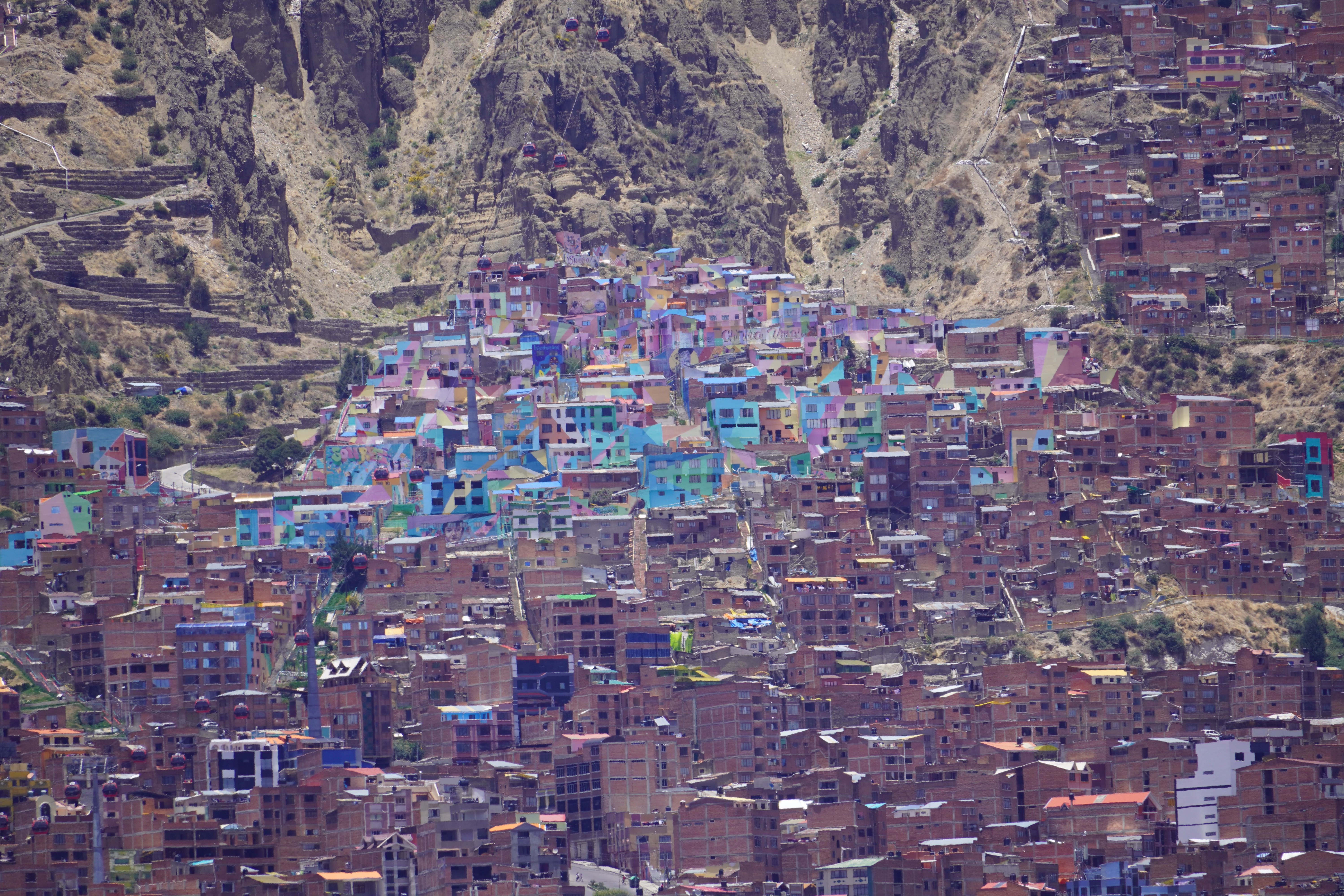 On the way to La Paz, we saw the real Bolivia, without tourists or tour jeeps. Simple, small houses. Tied-up cows, sheep, and pigs by the roadside. Traditionally dressed Bolivians. We also saw the first tuk-tuks. Small mopeds with a cabin that can fit three people. They look like tiny cars, mostly in Batman design. It took us two days from Uyuni to La Paz, with an overnight stop near the dried-up Lago Poopó. Unfortunately, we had to go through the big city of Oruro, which took us some time and nerves. The arrival in La Paz was just as challenging. Google Maps directed us down a steep gravel slope. For those who, like us, had never been to La Paz, it’s hard to imagine what it’s like to drive there. It is very steep. Cars honk and cut in front of you. You don’t feel very comfortable on the road. The city lies in a bowl, surrounded by tall mountains: Illimani (6438m), Huayna Potosí (6088m), and the now-vanished Chacaltaya ski resort (5421m). The city extends at an altitude of about 3200m in the lower, wealthier zones and up to over 4000m in the higher, poorer neighborhoods like El Alto, which is not a district of La Paz, but a separate city. The altitude difference is over 800 meters. Together, the two cities form Bolivia’s most populous urban area, with 1.8 million people.