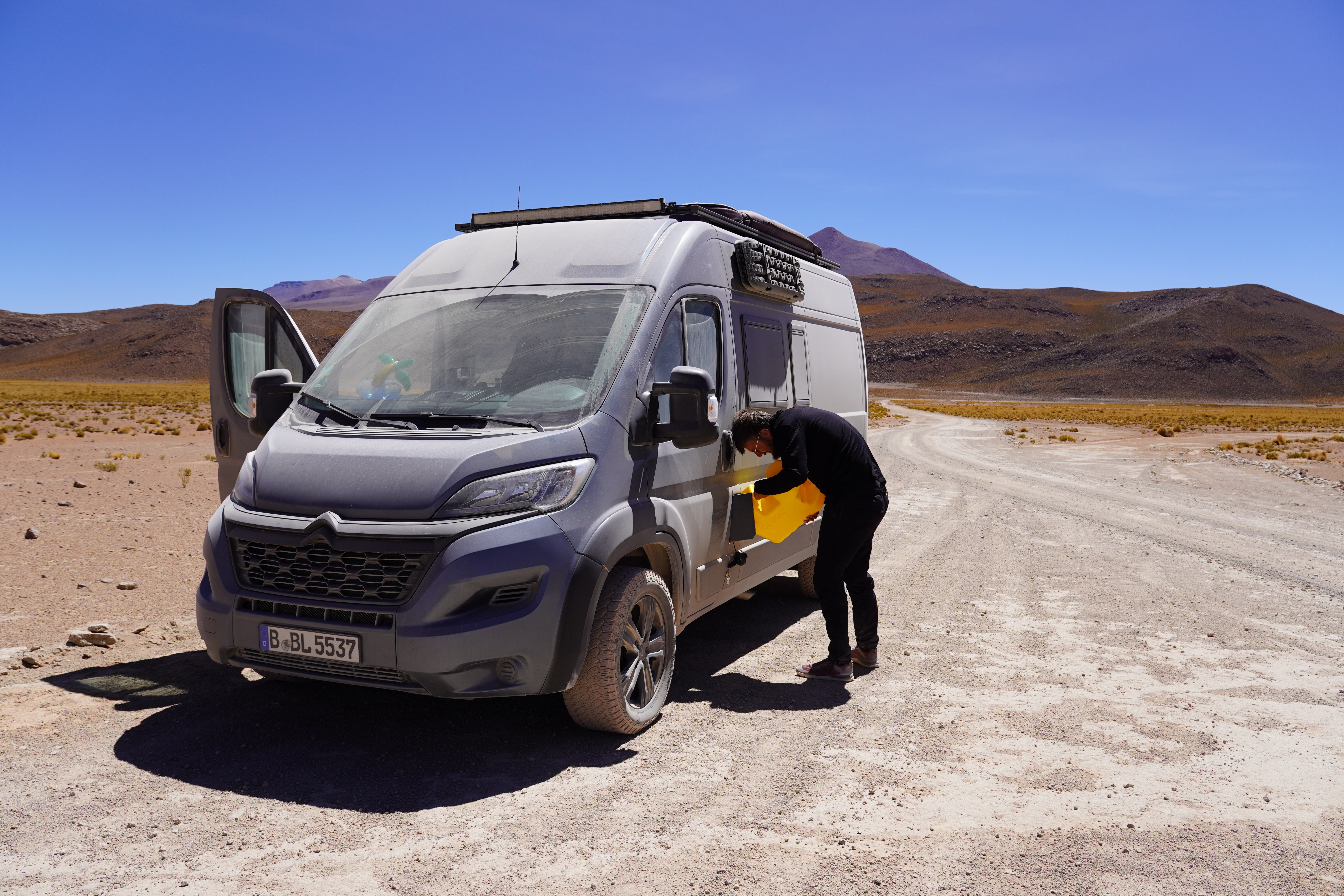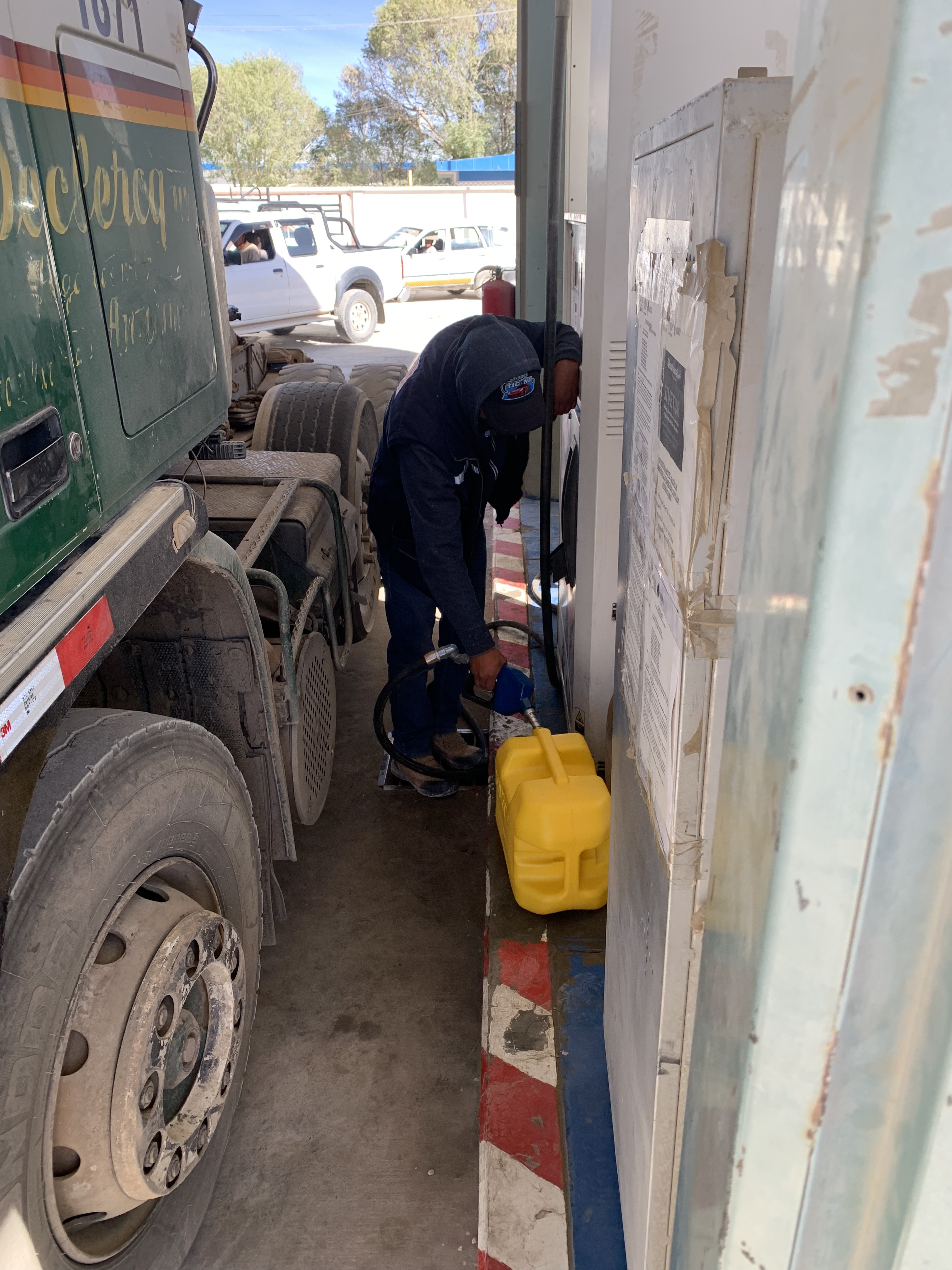 The town, laid out in a grid, was dusty and full of tourists. At Llama Café, we enjoyed delicious coffee and a quick lunch. Finally, we restocked on fresh fruits and vegetables at the local market after a week without. I love markets, and here everything was incredibly cheap and fresh. The people were friendly and honest about the prices. Next came the most important task: diesel. At the gas stations, there were kilometer-long queues of waiting vehicles. We heard from other travelers that foreigners should approach the attendant with a jerry can, ideally, as a woman, and politely ask. That’s what I did. I felt awkward walking past all the waiting cars and trucks, but at the pump, things moved quickly. I asked in Spanish for 20 liters of diesel, explaining I needed it to leave the country and didn’t require a receipt. The attendant gave me a price, slightly higher than usual but still cheap compared to other South American countries (8 Bolivianos per liter, about €1) After fueling a truck and another jerry can, he filled mine. I was so relieved, we would make it back to Chile for sure. Later, we learned that some tour guides or truck drivers have to wait up to three days for fuel, unable to work during that time. Despite my success, I still felt a bit awkward about the situation.
