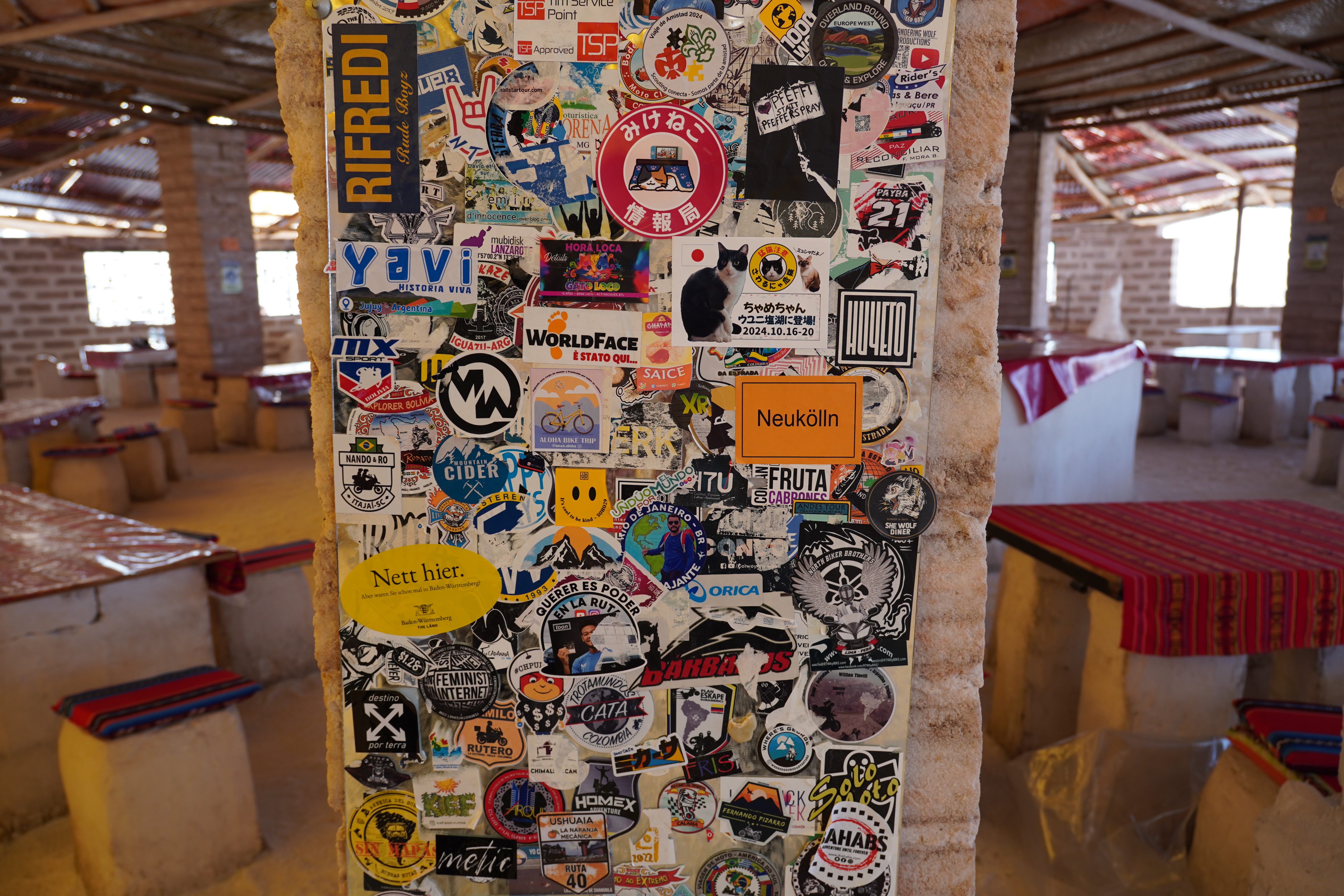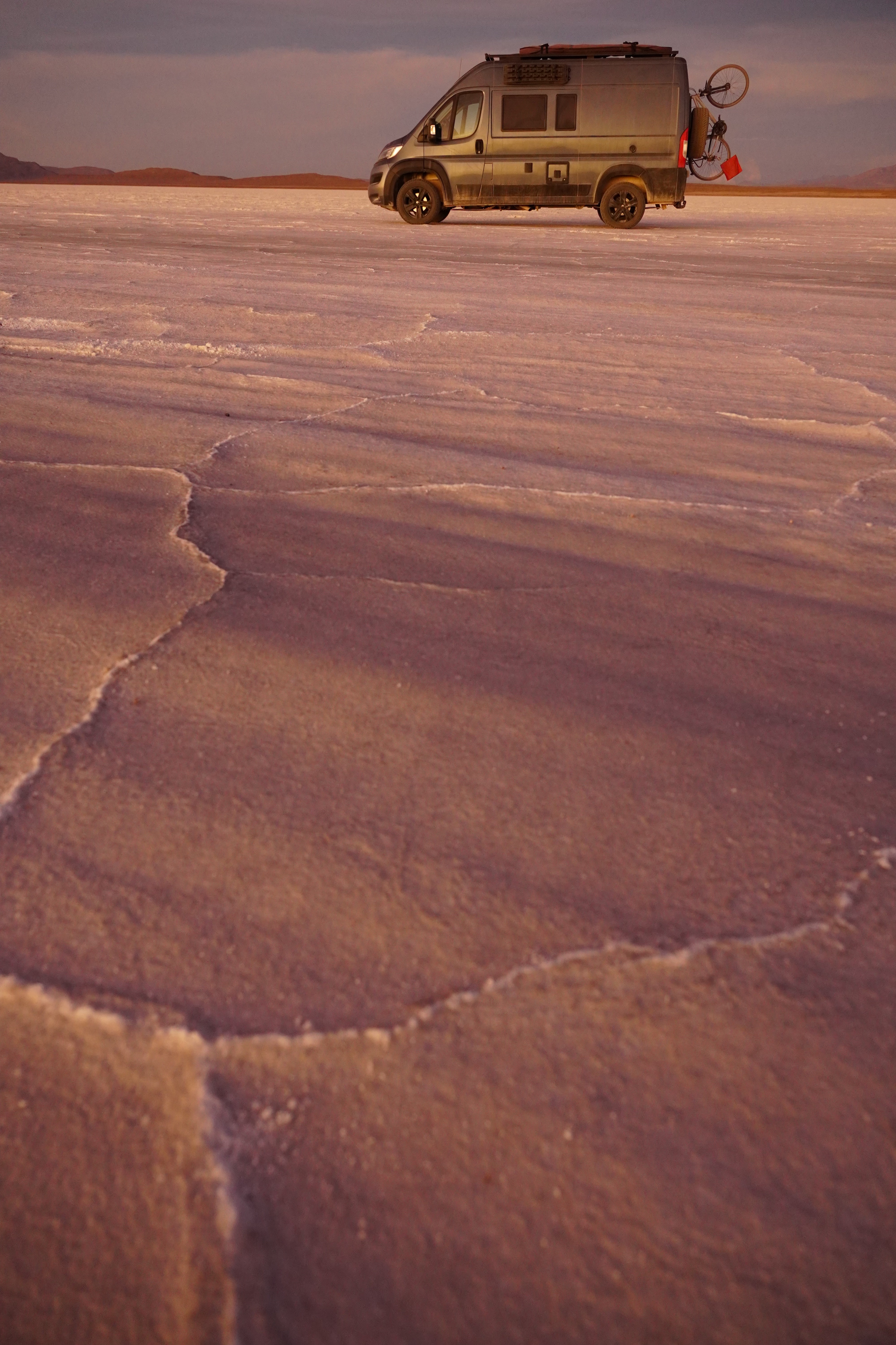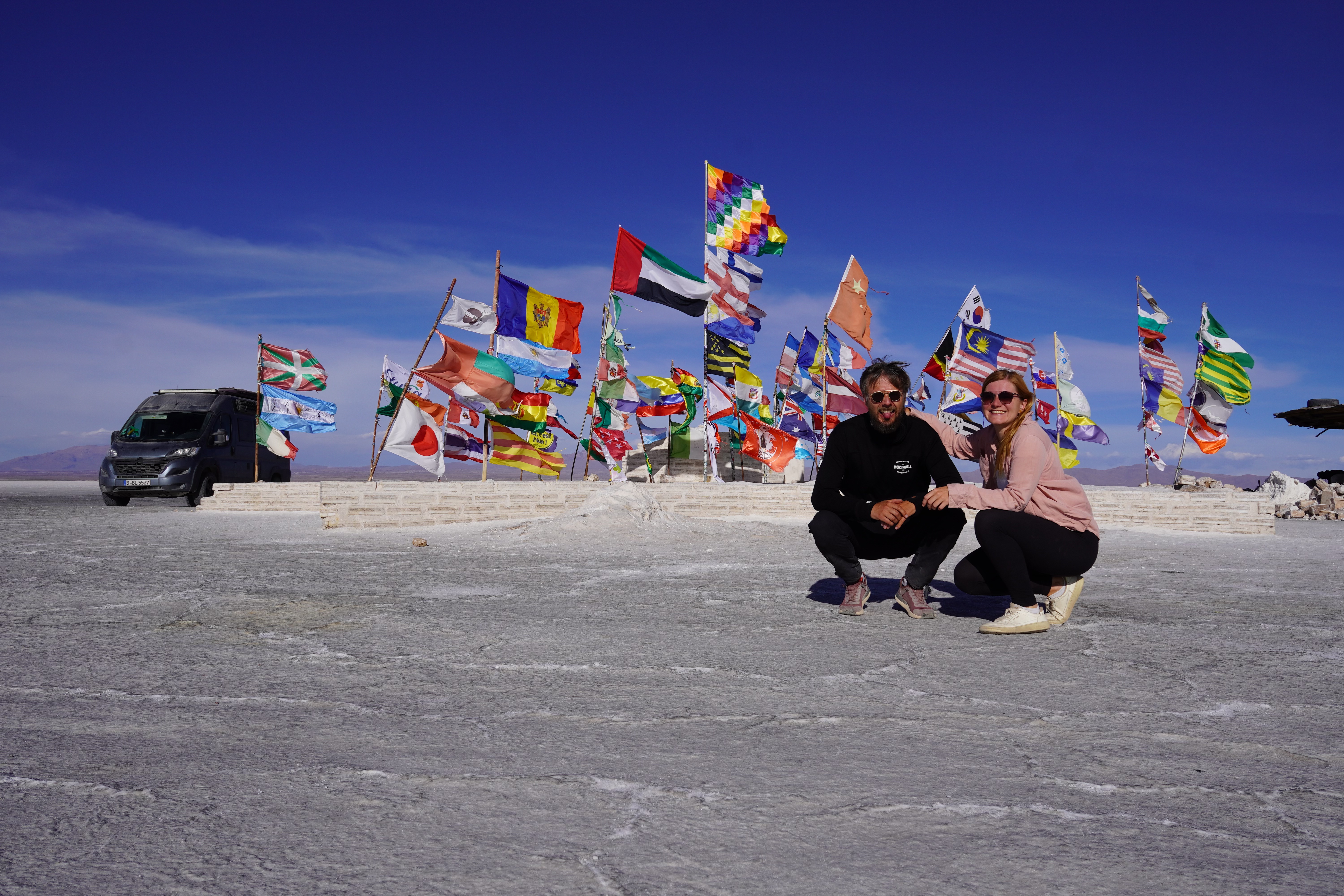 With the diesel, we made our way to the Salar de Uyuni, the world’s largest salt flat, covering about 10 582 km2. Formed around 40 000 years ago from the prehistoric Lake Minchin, which dried up and left behind a thick salt crust, the surface can be up to 10 meters thick in places and conceals brine rich in lithium and other minerals. During the dry season, the salt flat displays geometric patterns on its white crust. In the rainy season, water covers the surface, transforming it into a giant mirror. We arrived just before the rainy season began in December, so we could still drive on the dry crust. We read about people whose campers broke through the surface. There are also areas to avoid. Initially, we considered entering from the south, which was closer, but many vehicles reportedly get stuck on that route, so we took the longer way around. On the salt flat, we stuck to the established routes. With our limited diesel, we didn’t drive too far in. The Salar is about 100 km wide and 135 km long, you could easily get lost or run out of fuel. We explored the highlights: the Dakar Monument, the Hotel de Sal, and the Plaza de las Banderas. The Dakar Rally passed through the Salar de Uyuni several times, especially from 2014 to 2018. It became one of the most spectacular stages of the rally as the vast white expanse and extreme conditions posed a unique challenge for drivers and teams.