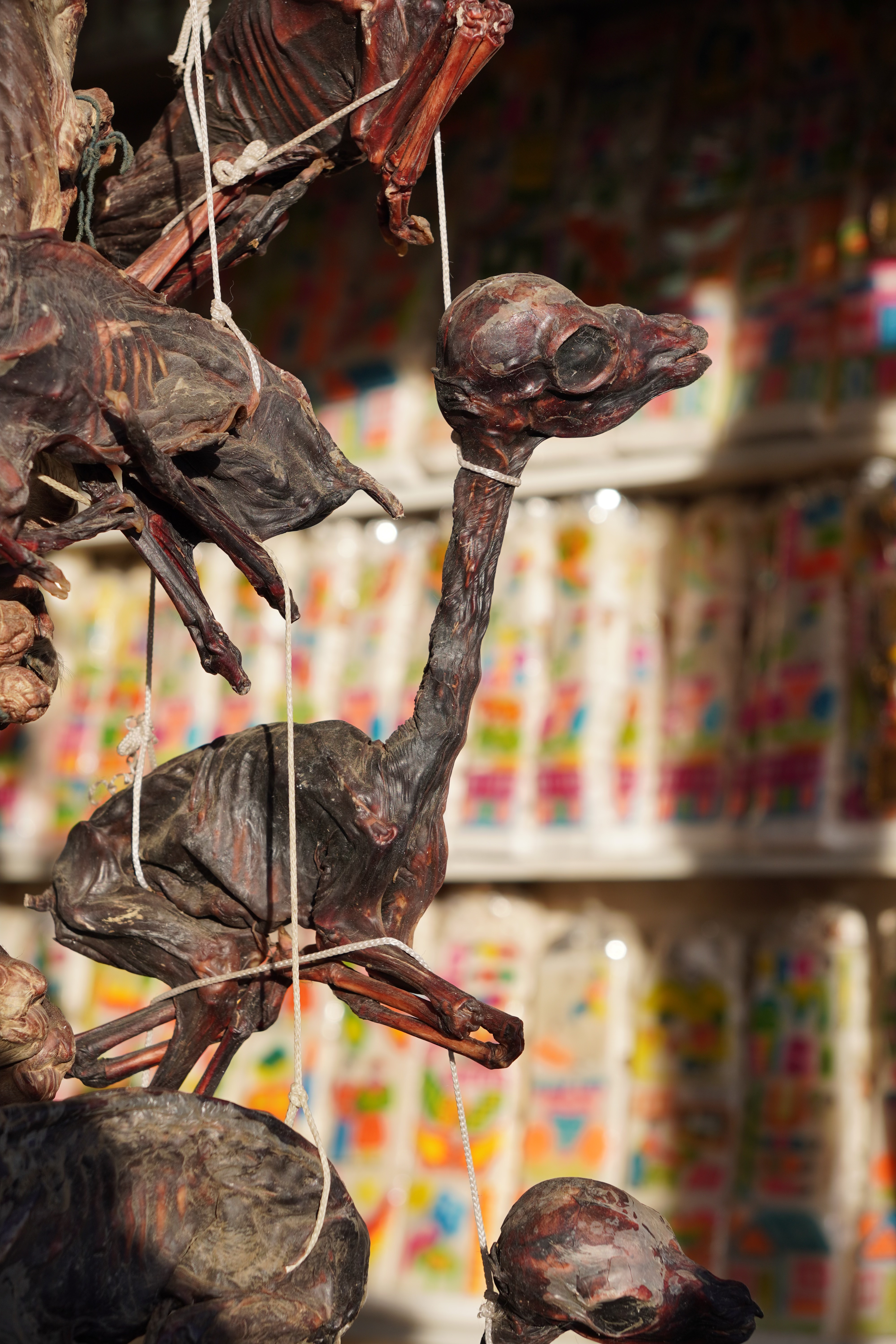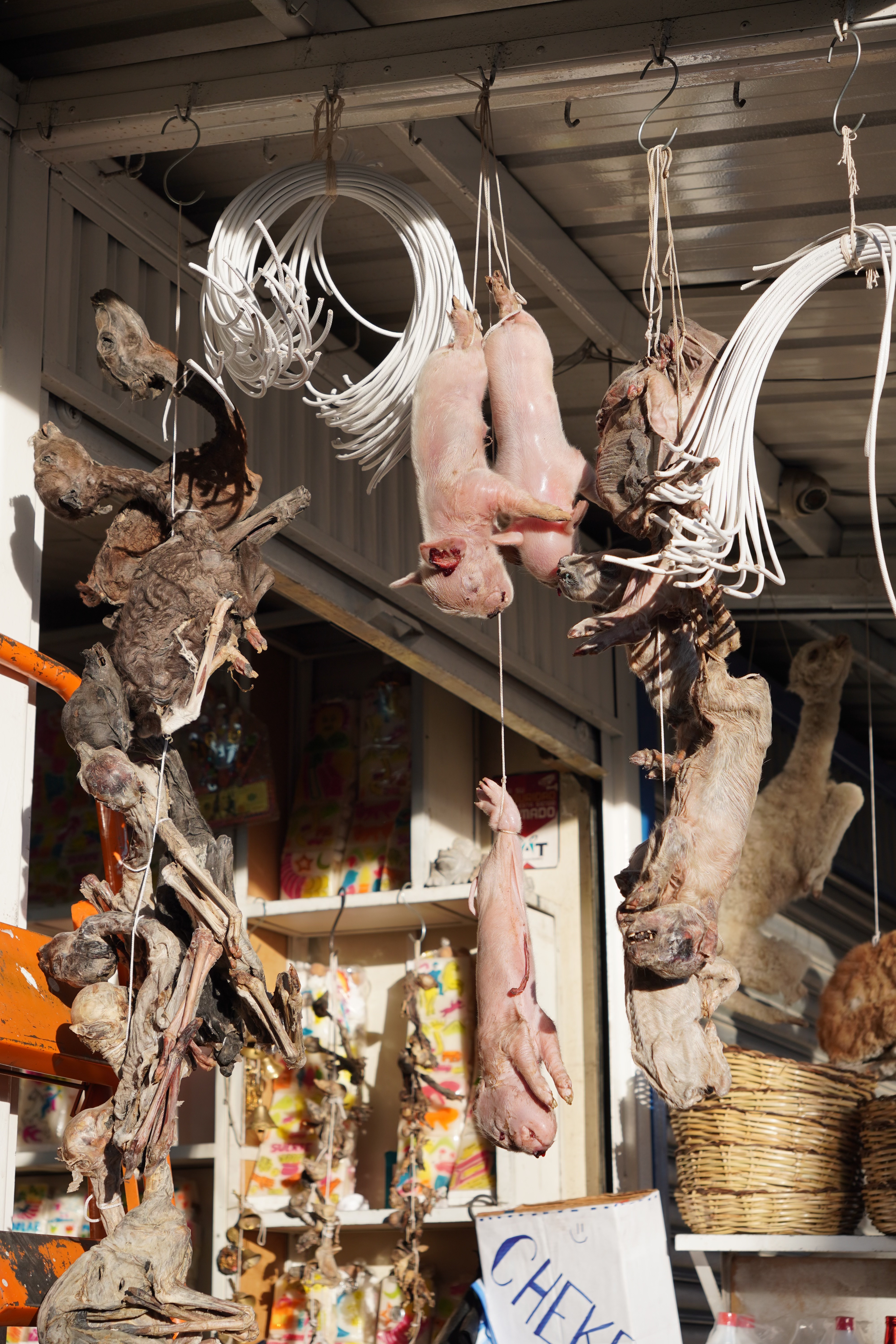 Llama fetuses play a central role here, especially among the Aymara and Quechua communities. They are important offerings for Pachamama (Mother Earth), who is worshiped as a divine protector and giver of life. The fetuses are used as offerings to thank Pachamama for gifts like good harvests, health, and prosperity. It’s believed that the sacrifice strengthens the connection between humans and nature. The fetuses are often buried during construction projects, like building a house, to appease Pachamama and protect the project from misfortune and disaster. The fetuses generally come from natural miscarriages. Given the number of fetuses we saw that day, I don’t believe this is always the case.