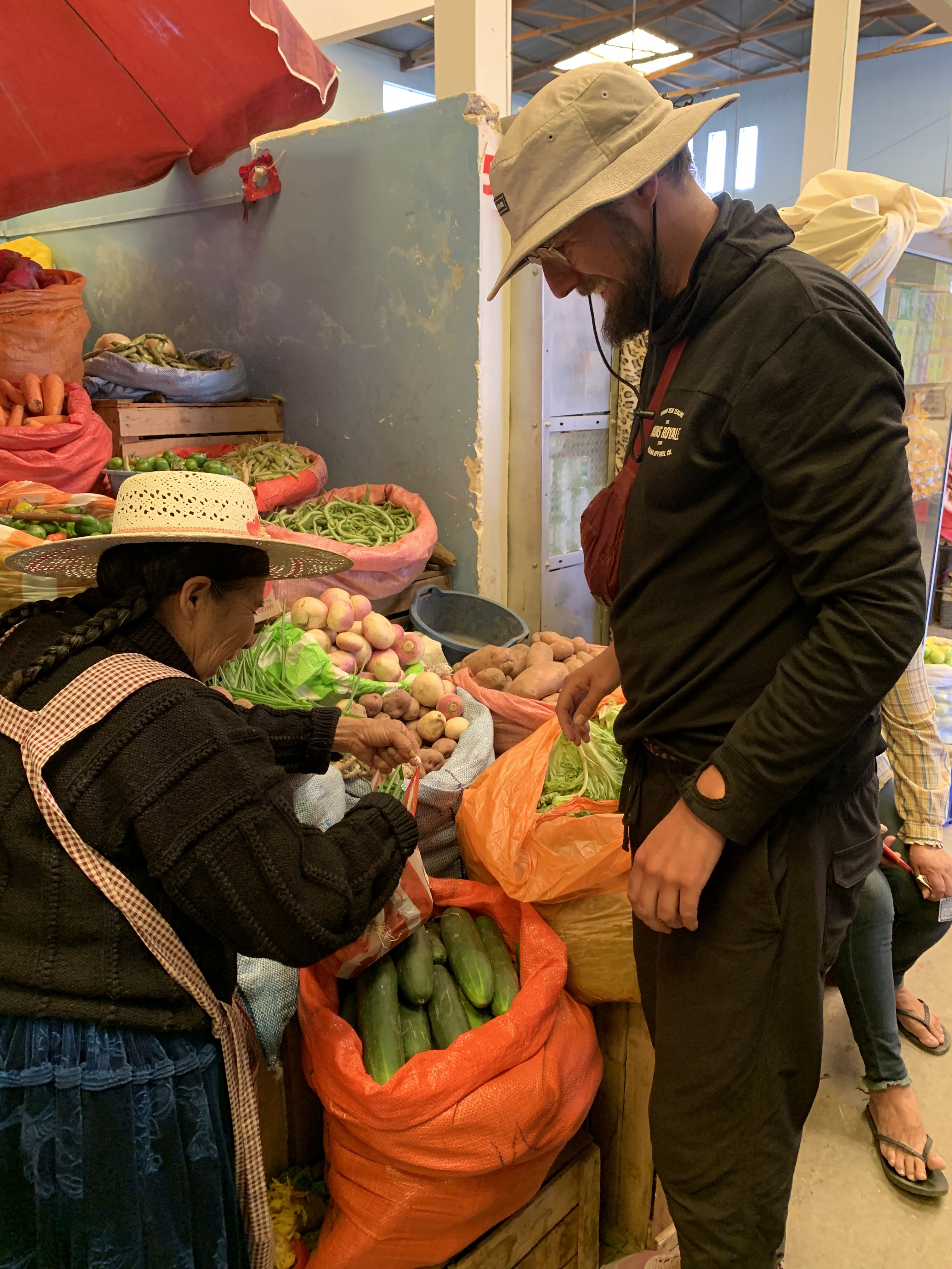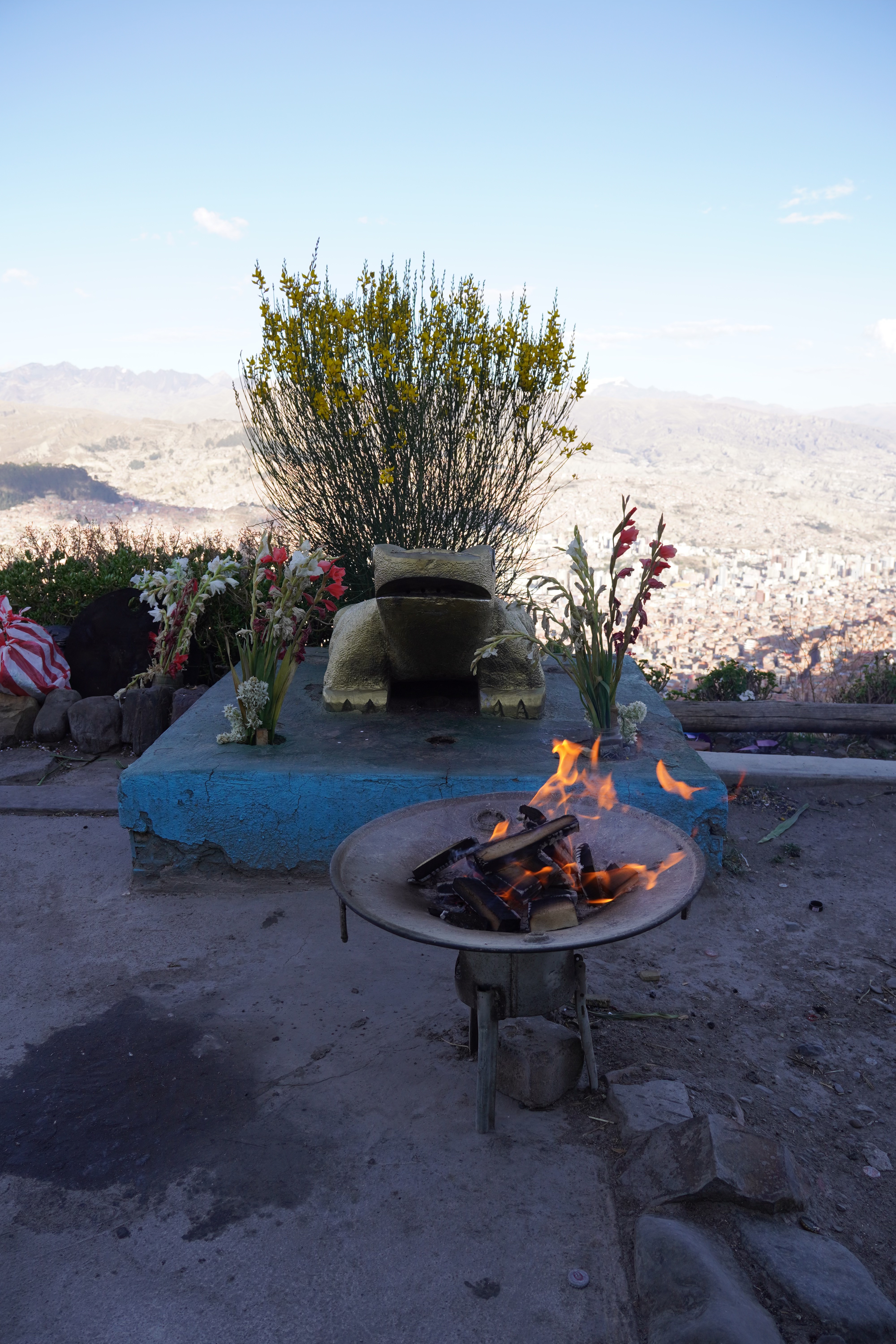 Finally, we went to the Witch Market, which is much bigger than the one in La Paz. From there, you get a great view over the city and the surrounding mountains. We saw witches and shamans performing rituals and visited the shops where they buy ritual items like dried flowers, sweets, alcohol, coca leaves, roots, and even llama fetuses (we also saw piglets). Many Bolivians believe in this and visit a shaman, for example, before an important event or to cast a spell or protect themselves. It’s an important part of the culture. A Yatiri (shaman) performs the ceremony, where the offerings are burned or buried in the earth.