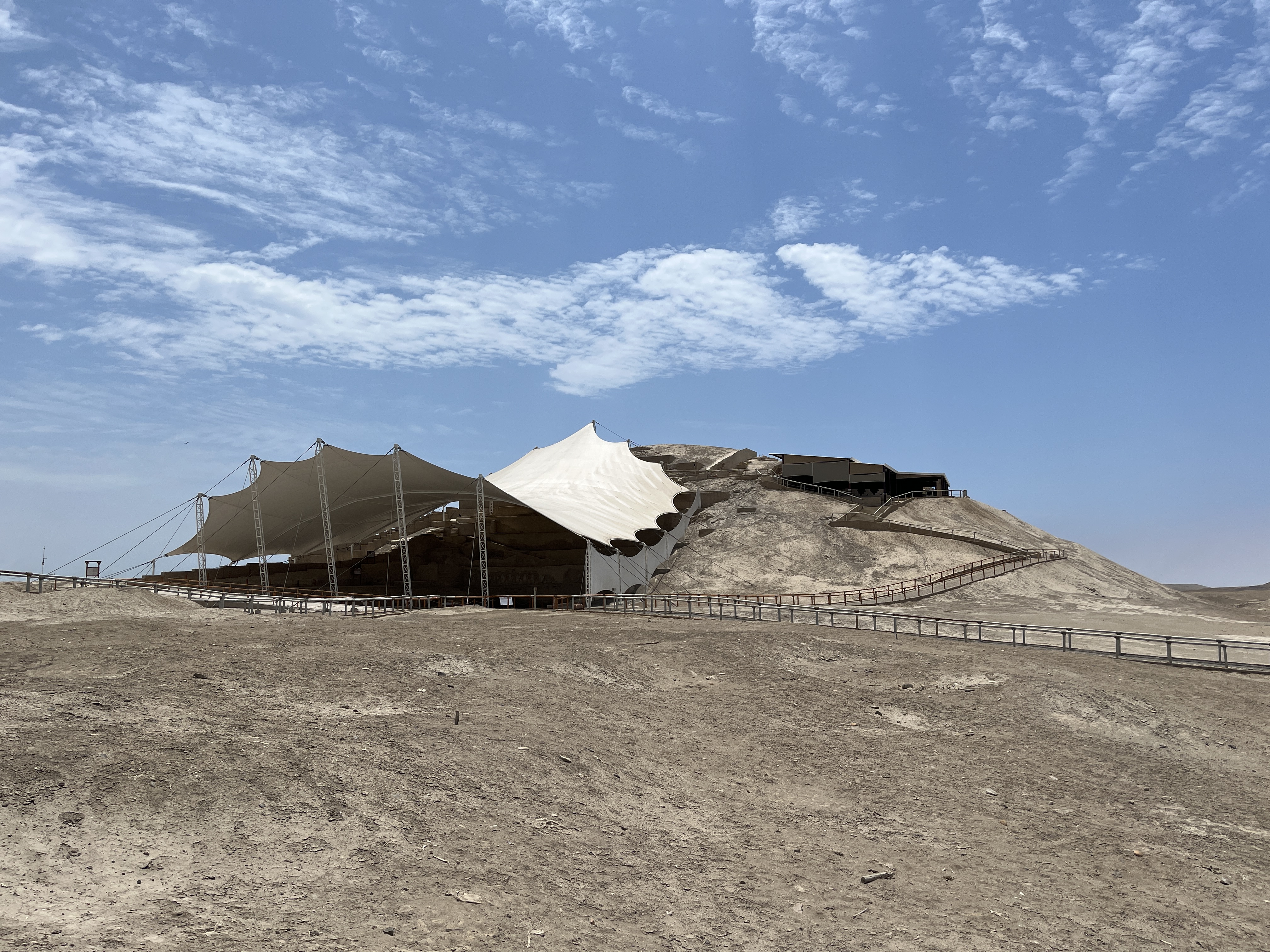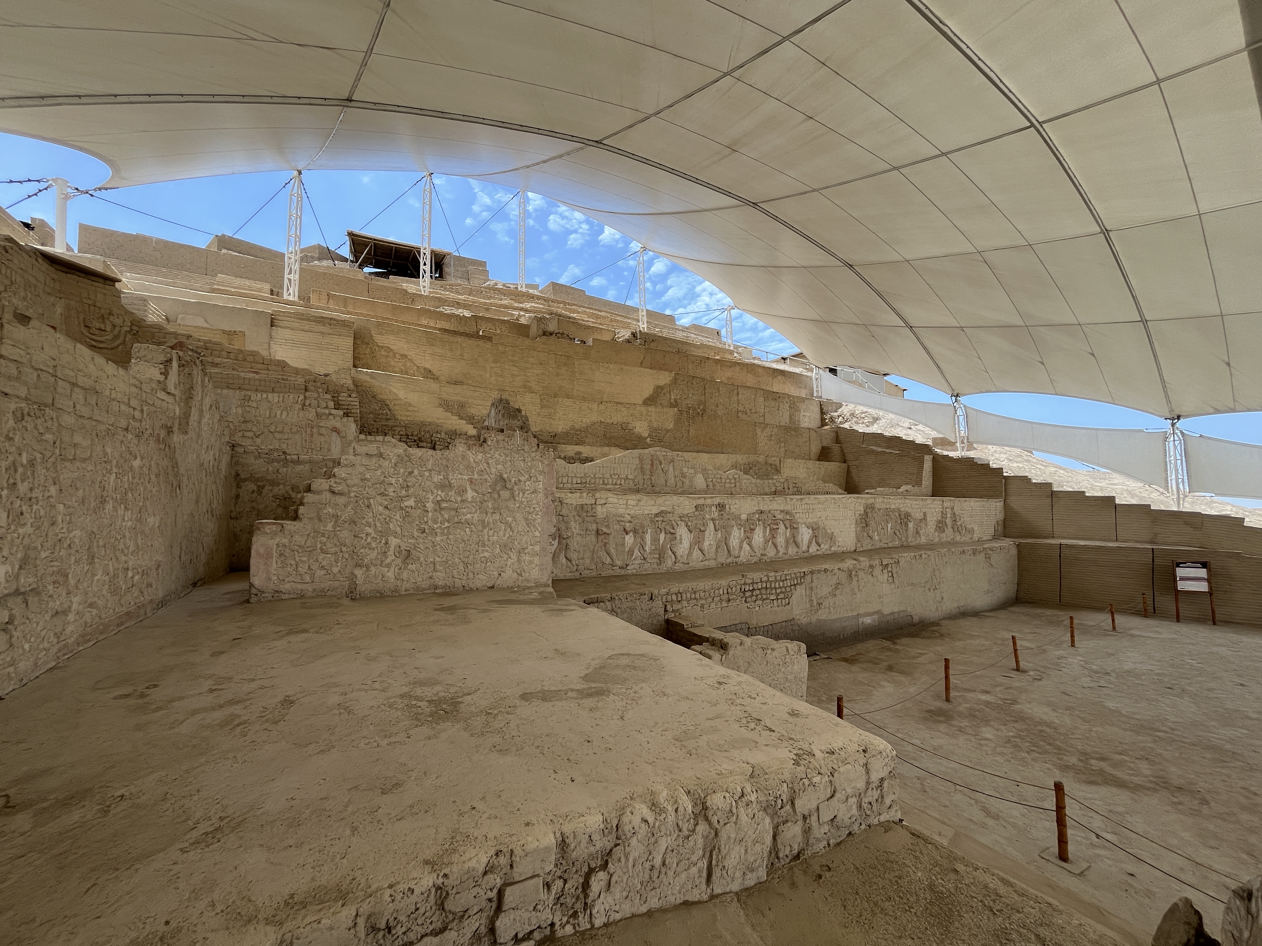 From Huanchaco we took an incredibly bad road along the coast in between huge sugarcane fields to the historical site „El brujo“. El Brujo is a pretty cool historical site located on the northern coast of Peru, near the Chicama Valley. It dates back over 5,000 years and was a key ceremonial center for the Moche culture (100–700 CE). The site is renowned for its intricate adobe pyramids, particularly the Huaca Cao Viejo, which features vivid murals depicting scenes of Moche mythology, rituals, and everyday life.