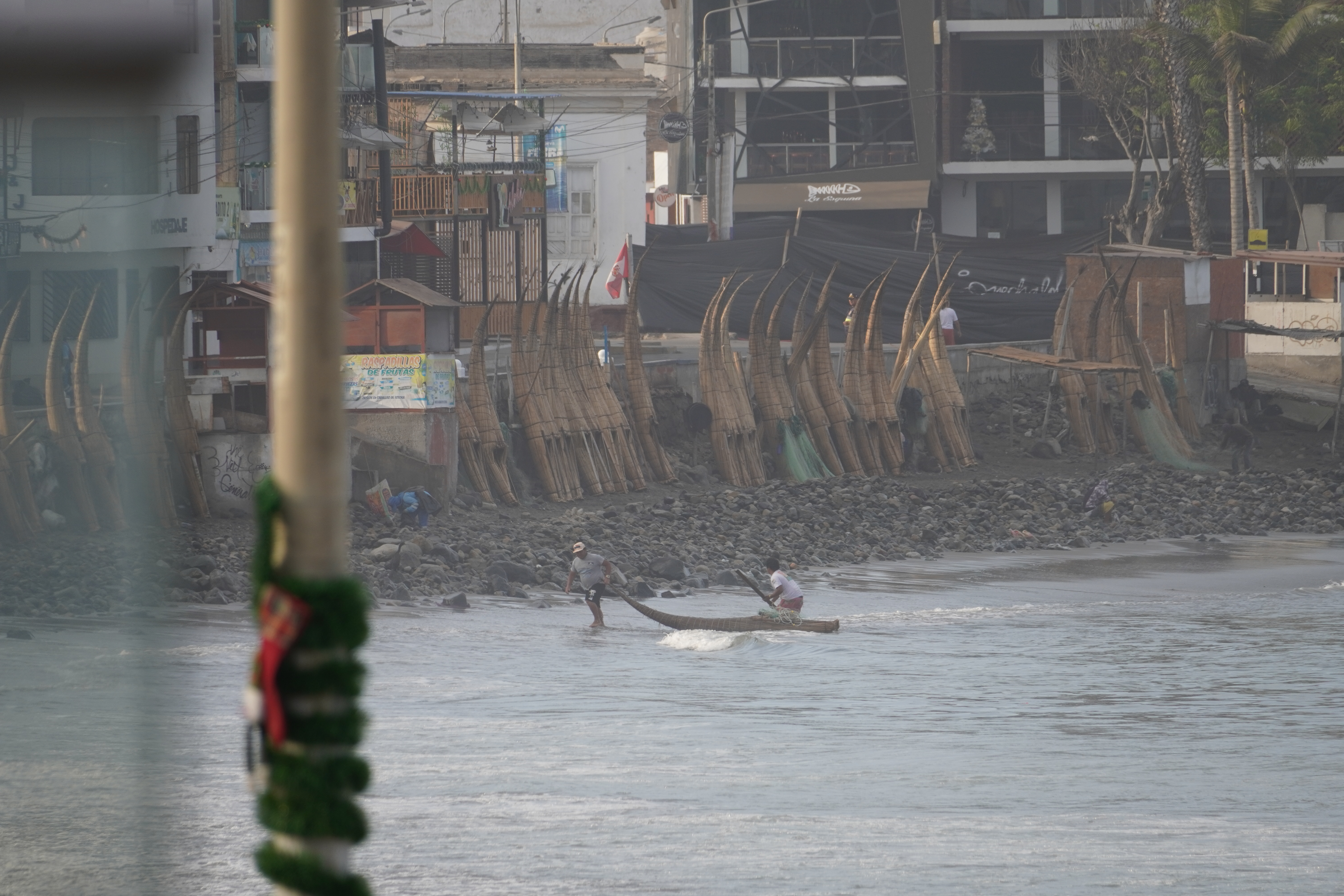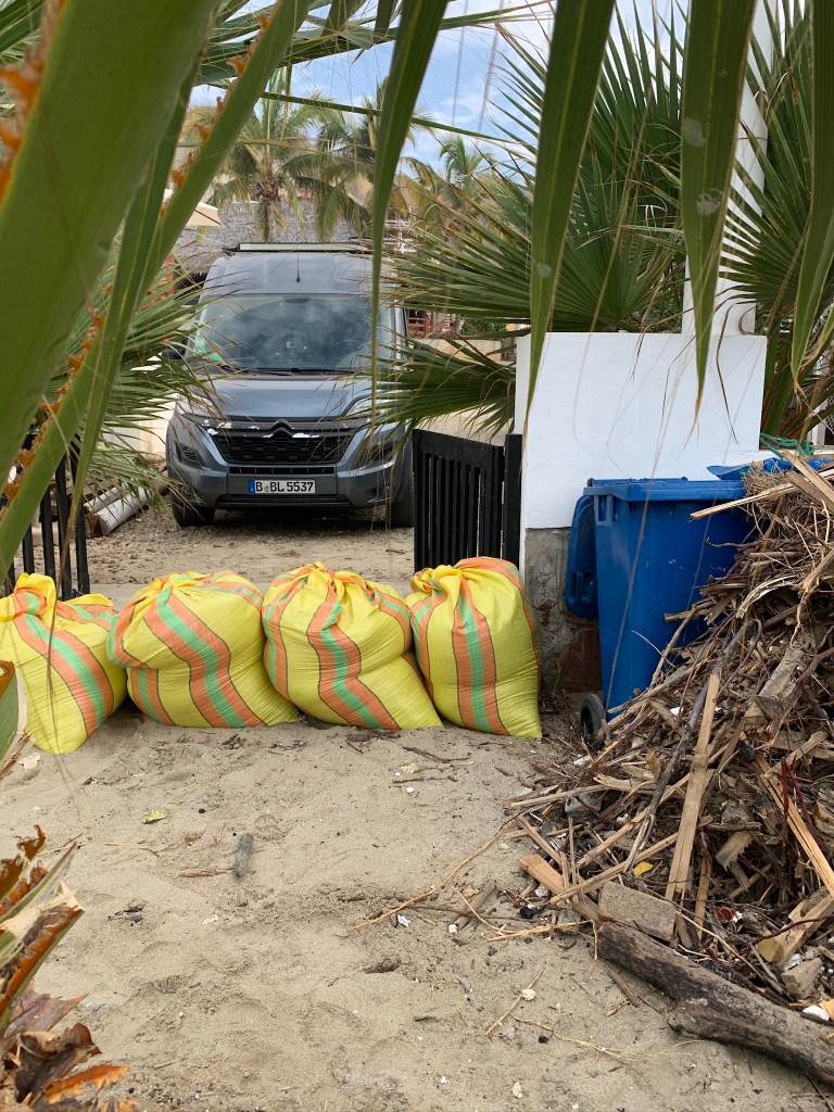 After Christmas the waves became bigger and not just that… they became massive, way too big to be surfed by us and most of the people. We watched a few crazy people that were still in the water and a few waves were so big that they reached into the hotels on the beach front. Even though we were being careful all the time one wave caught me in-between sandbag and the gate of a Hotel and I got completely soaked and cut my feet open, while Linda jumped into the Hotel garden in time, that was flooded after. Never underestimate the ocean! The north coast of Peru was in news for that big swell, but afterwards I found THIS VIDEO, that shows how the pros were still able to surf in that crazy swell. After the huge waves the beach in Mancora looked completely different. Tons of sand have been moved away and the beforehand pretty white beach was now a field of stones with some sand in-between.