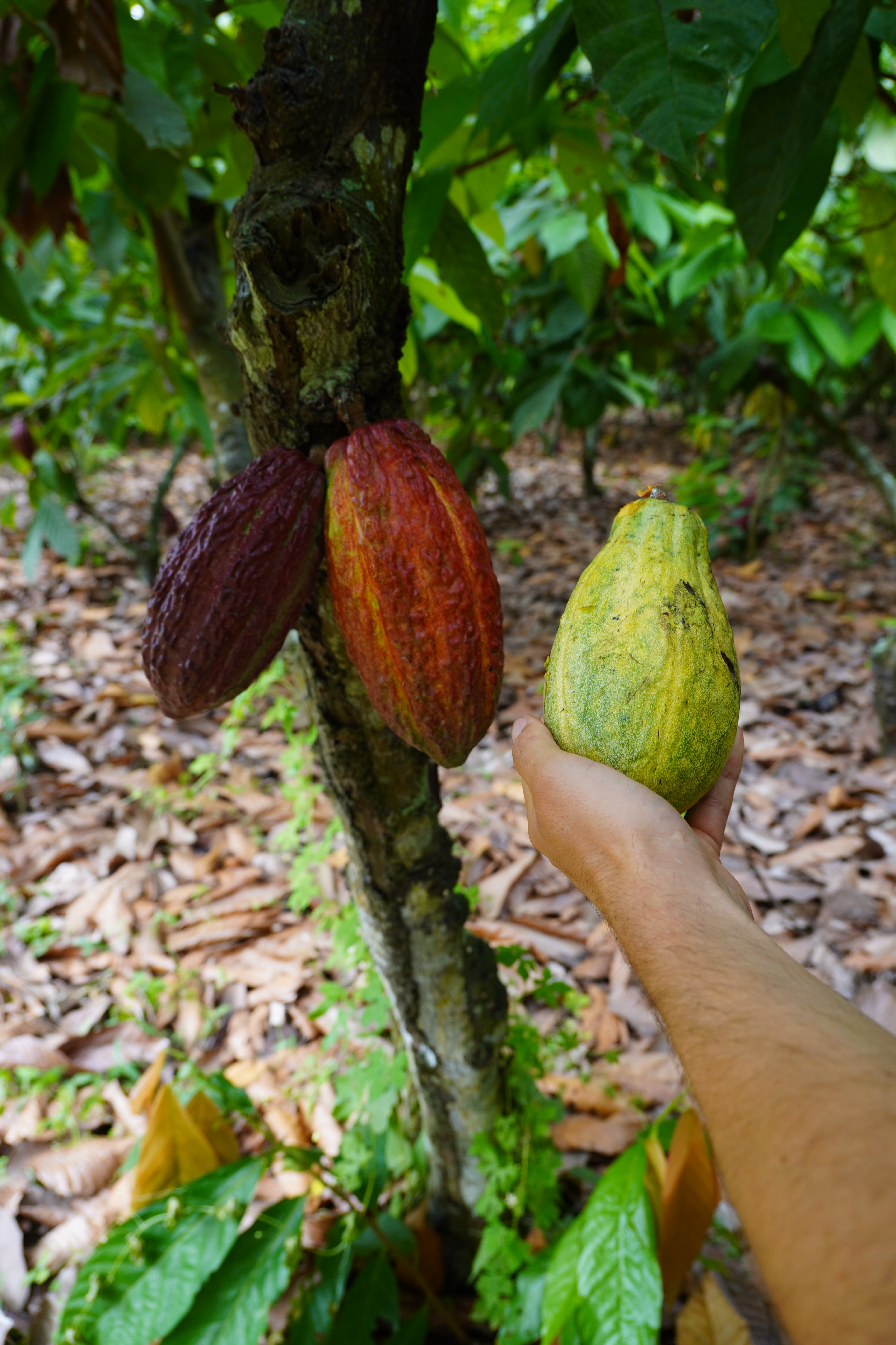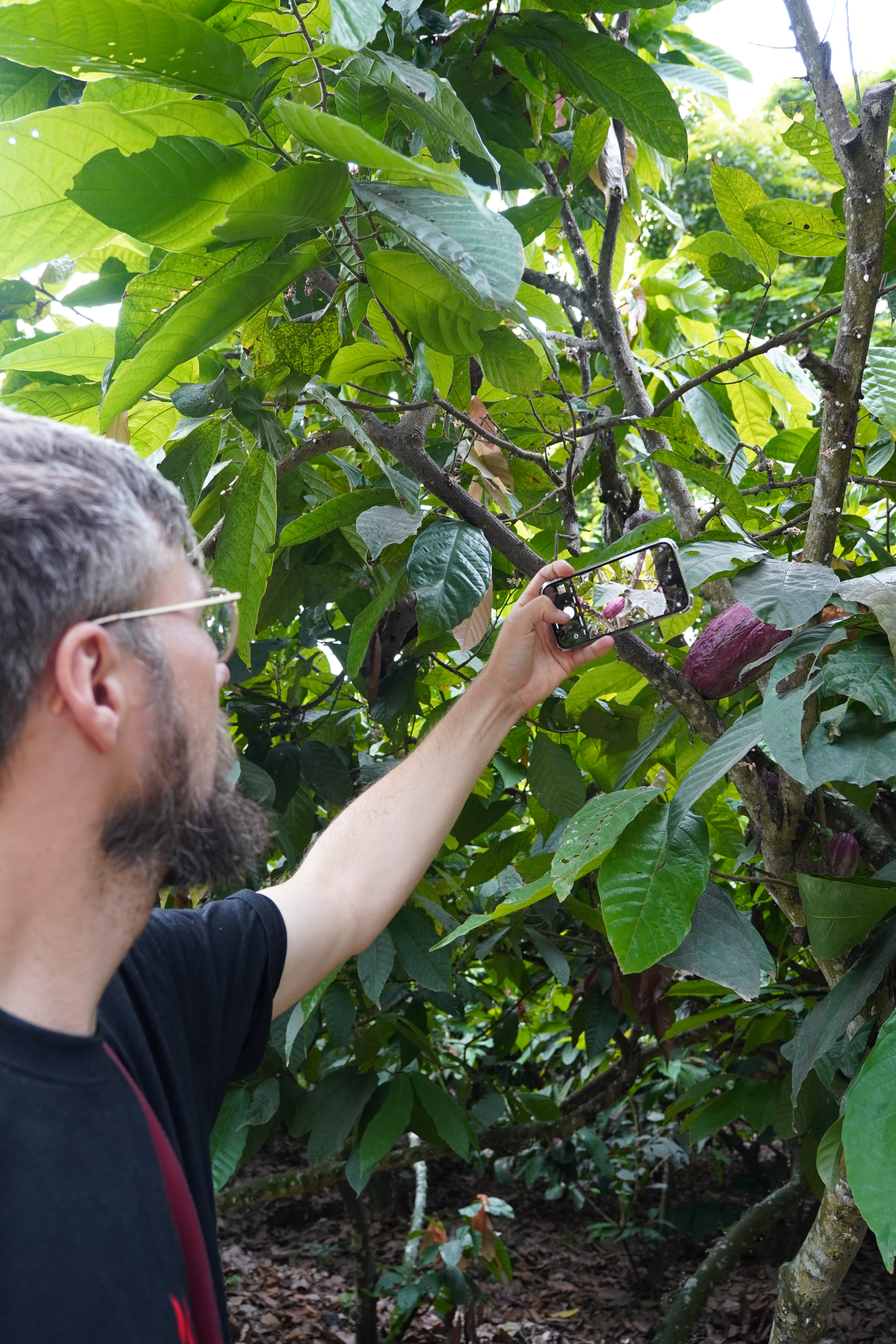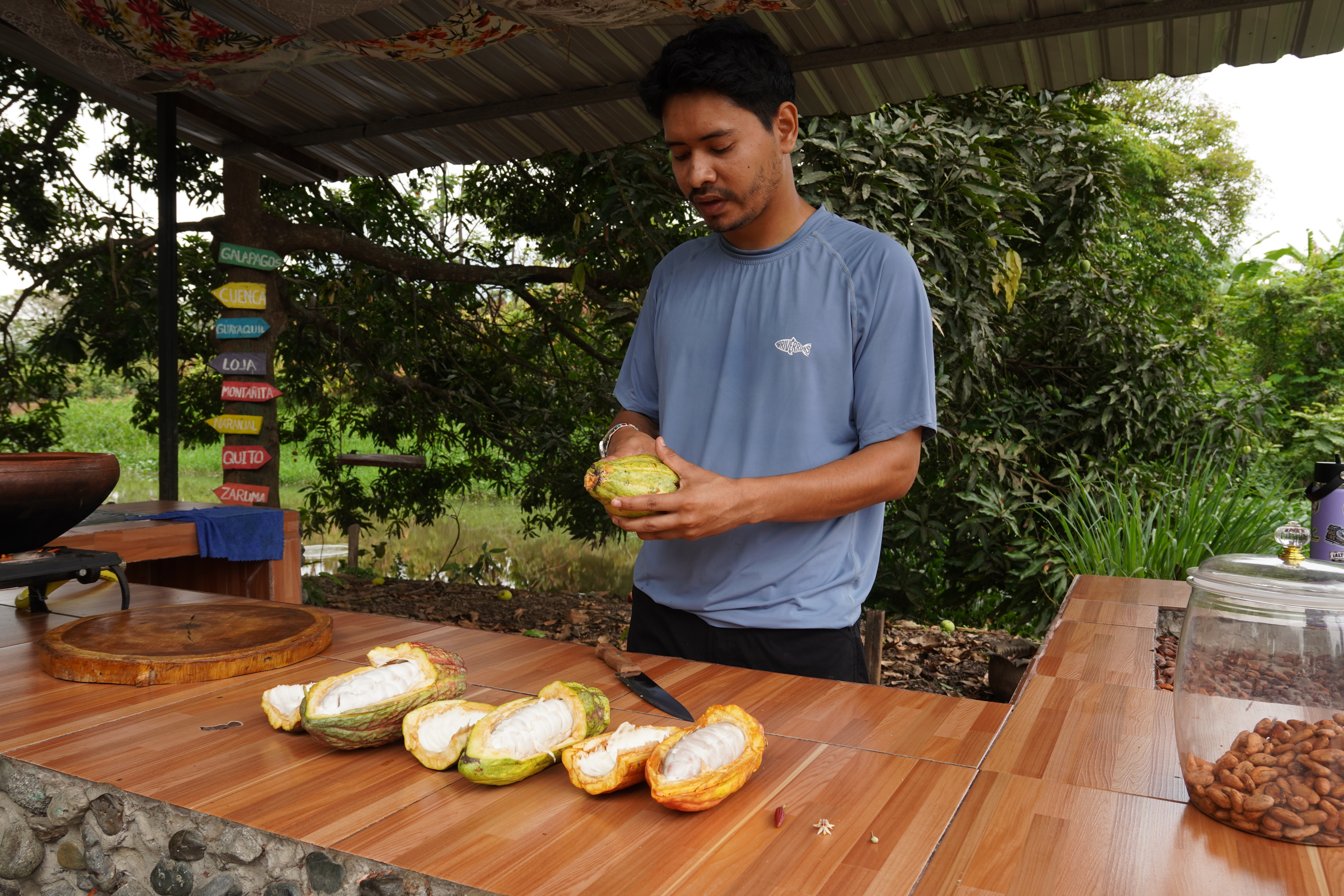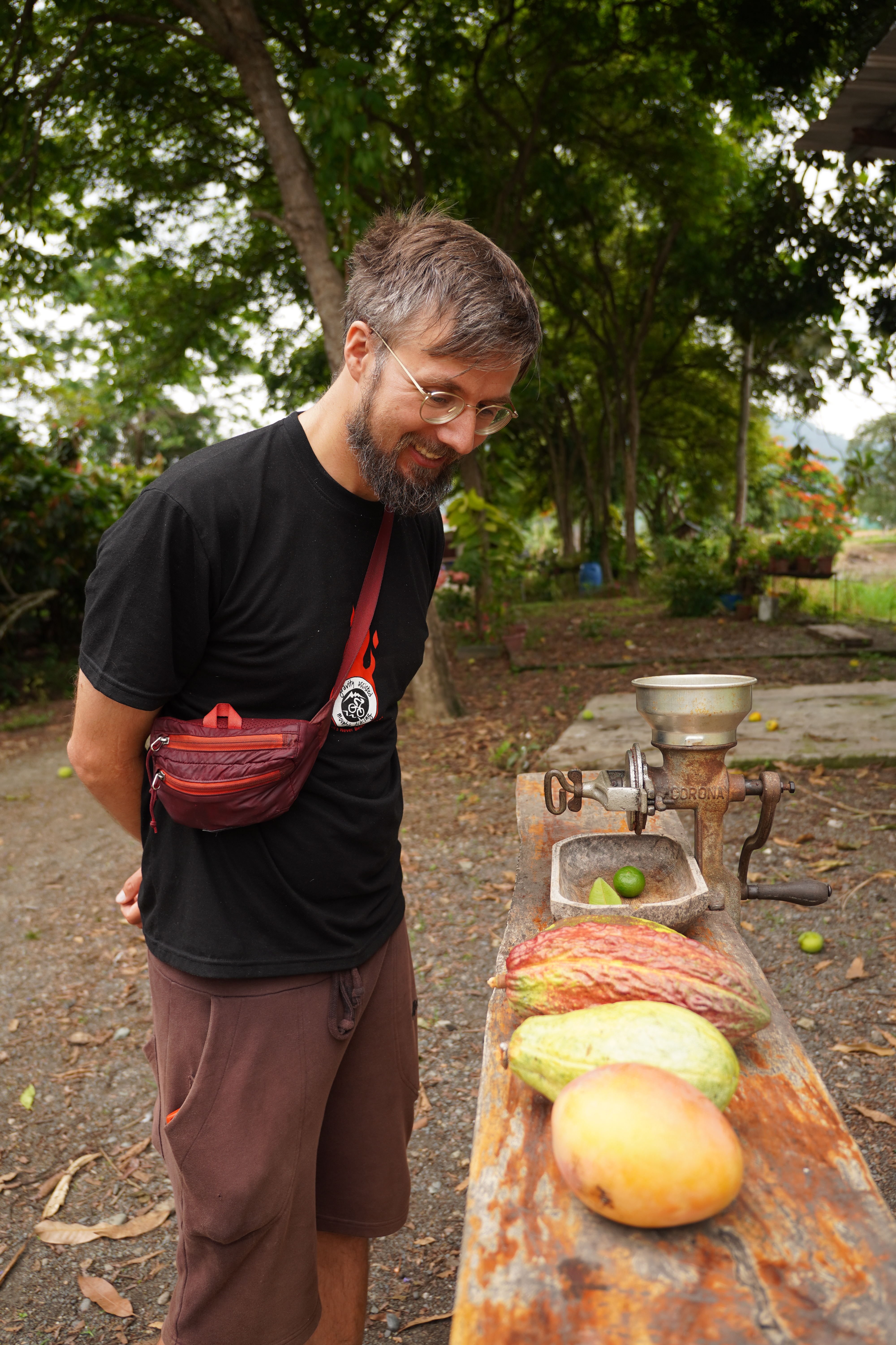 The landscape changed. We were in the jungle. Now we saw the first cocoa plants with their dark red pods. At Hacienda Cacao y Mango https://ecuadorfarmtours.com – we dried our damp hiking clothes and boots. Although only about 100 km separate the national park in the mountains from the cocoa farm, the climate here was completely different. It was warm and humid and perfect weather for mosquitoes. I had never had so many mosquito bites at once in my life. Yet. We couldn’t repair the roof yet, that had to wait until the next big city, Guayaquil. But at least it wasn’t raining anymore, and Rosi was dry. The next morning, we quickly had coffee to wake up, and then we were off. At 9 a.m., our private cocoa tour with Jamil started in English. It was immediately clear: Jamil loves his job. He has a passion for what he does and conveys it with every sentence about cocoa production. I can say in advance, the experience on the cocoa farm was one of the highlights of our trip. We went into the plantation and took a close look at the cocoa plants. The pods can be harvested all year round, every two weeks. If they are not picked, they just stay on the tree. We saw all stages of the fruit: a very beautiful small white fragile flower, pods in all sizes and colors, up to the fully matured fruit. The flowers are so tiny that only very small insects, mostly mosquitoes, can pollinate them. Pollination is very complex, and only 10% mature into fruit. Since this is an organic farm, no additional chemicals are used, as they would also harm the mosquitoes and insects. The leaves and fruits simply fall to the ground, serving as fertilizer and food for the insects. The cocoa is grown here in a mixed culture alongside bananas, mangoes, avocados, limes, coffee, vanilla (I have never seen such a beautiful flower before), pepper, palm trees, and many other plants. The advantage of this mixed culture is that there is more shade, fewer pests, better soil quality, and a higher pollination rate for the cocoa. We spent about an hour in the plantation and learned a lot. I was thrilled by all the plants and fruits. We picked four different cocoa pods, including two red and two yellow varieties, to compare them. The red pods are cultivated hybrids with more pulp. CCN-51 is a hybrid cocoa variety widely grown in Ecuador. It was bred in the 1960s and stands for Cacao Colección Castro Naranjal, Plant No. 51. It is very resilient, resistant, and yields a high harvest. However, compared to the yellow Nacional (Arriba) cocoa bean, it is rather bitter and of lower quality. After harvesting, the cocoa beans are removed from the pod and fermented with their pulp for several days. We had the unique pleasure of drinking juice from the pulp. It was delicious. We also tried red berries that made the taste of a lemon sweet. Afterwards, the beans are roasted, which we also did. The smell was indescribably good. Now, similar to peanuts, you can remove the shell, break the bean with your fingers, and obtain delicious cocoa nibs. Pure freshly roasted cocoa bean. However, we put our roasted beans into a kind of meat grinder and obtained 100% cocoa paste. This only needs to be mixed with at least one other ingredient, such as panela (sugarcane sugar), and you get chocolate. We ate ours with freshly picked mango and banana. Along with it, we drank hot cocoa. Although I am not a chocolate fan, I was in heaven. The chocolate and cocoa had a completely different taste than what you know from Germany. Many Ecuadorians drink cocoa in the morning instead of coffee. Cocoa contains theobromine, a mild stimulating substance. It also contains many antioxidants and stimulates serotonin production. After our chocolate breakfast, we made our own chocolate bars. Björn took salt, cranberries and cacao nibs, and I took coffee beans as a topping. We also bought a large bag full of cocoa nibs. Many Ecuadorians benefit from cocoa production. Due to poor harvests in Africa, the price has risen from 2 to 8 dollars per kilo. Unlike banana plantations, which are only cultivated by a few large companies, almost everyone here in the country grows cocoa and can harvest it. By the way, only the hybrid beans are exported; the good cocoa from the yellow cocoa beans stays in the country. Here, it is processed directly into chocolate bars and sold. From tree to bar. Or in our case: from tree to mouth.