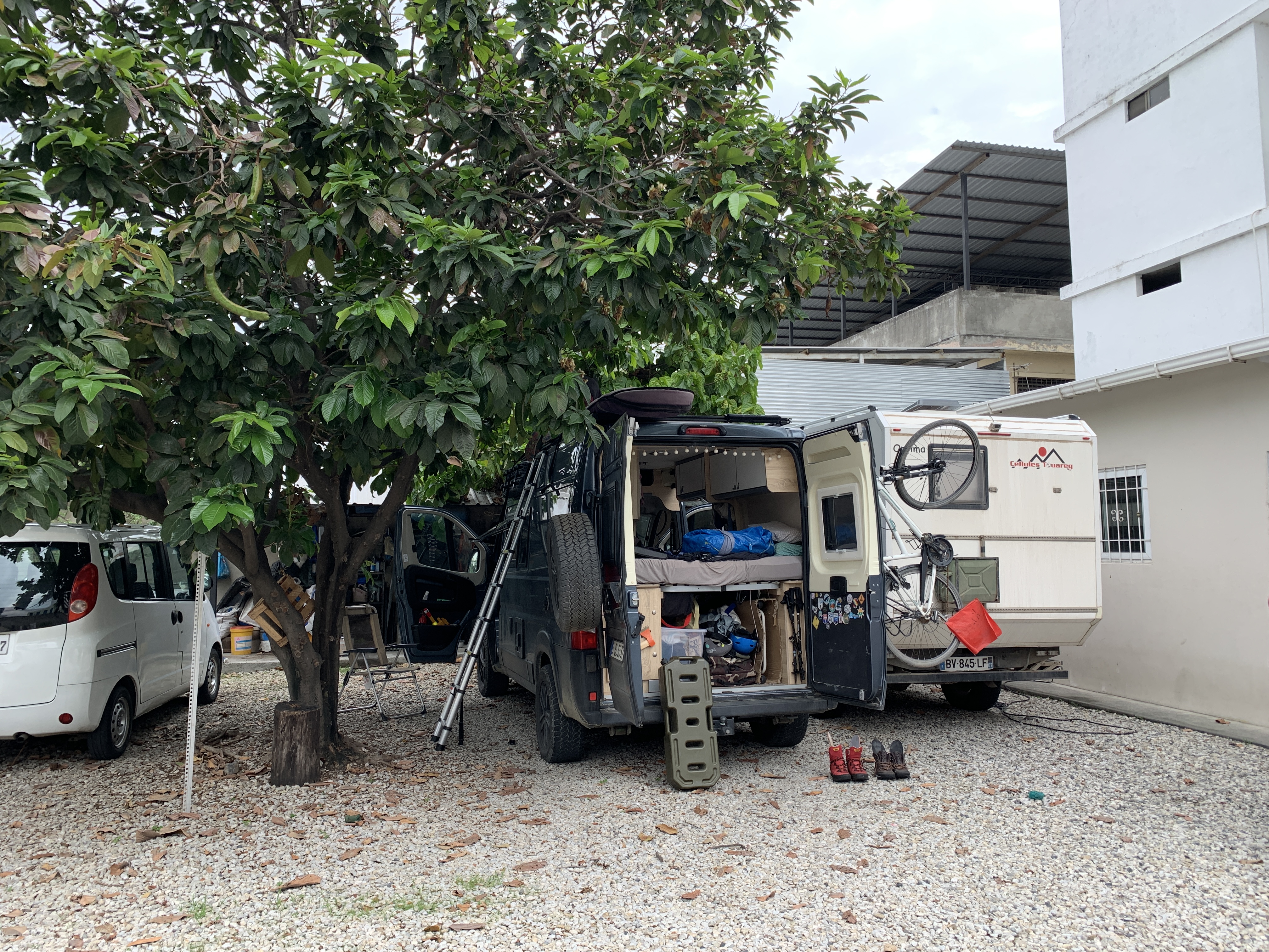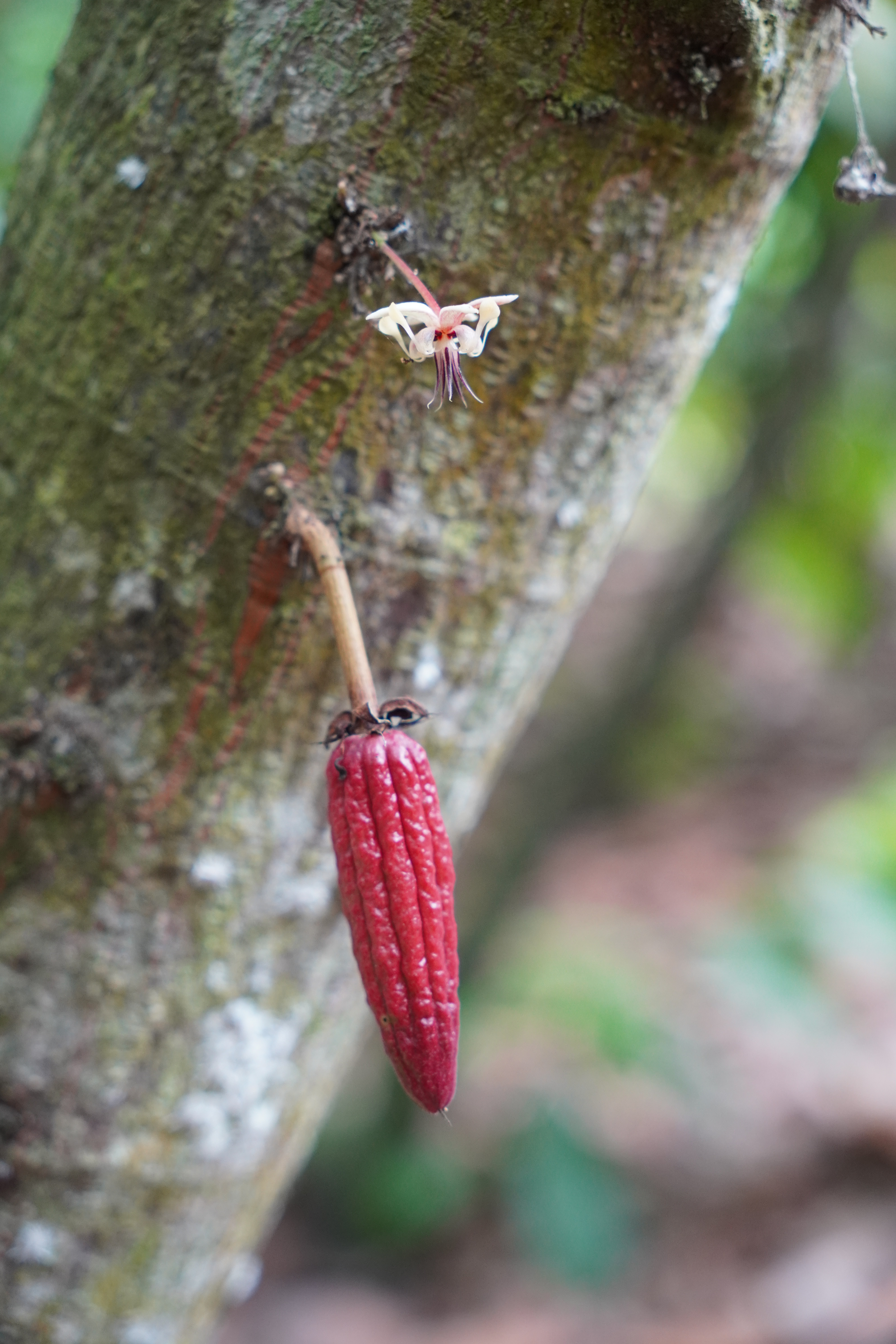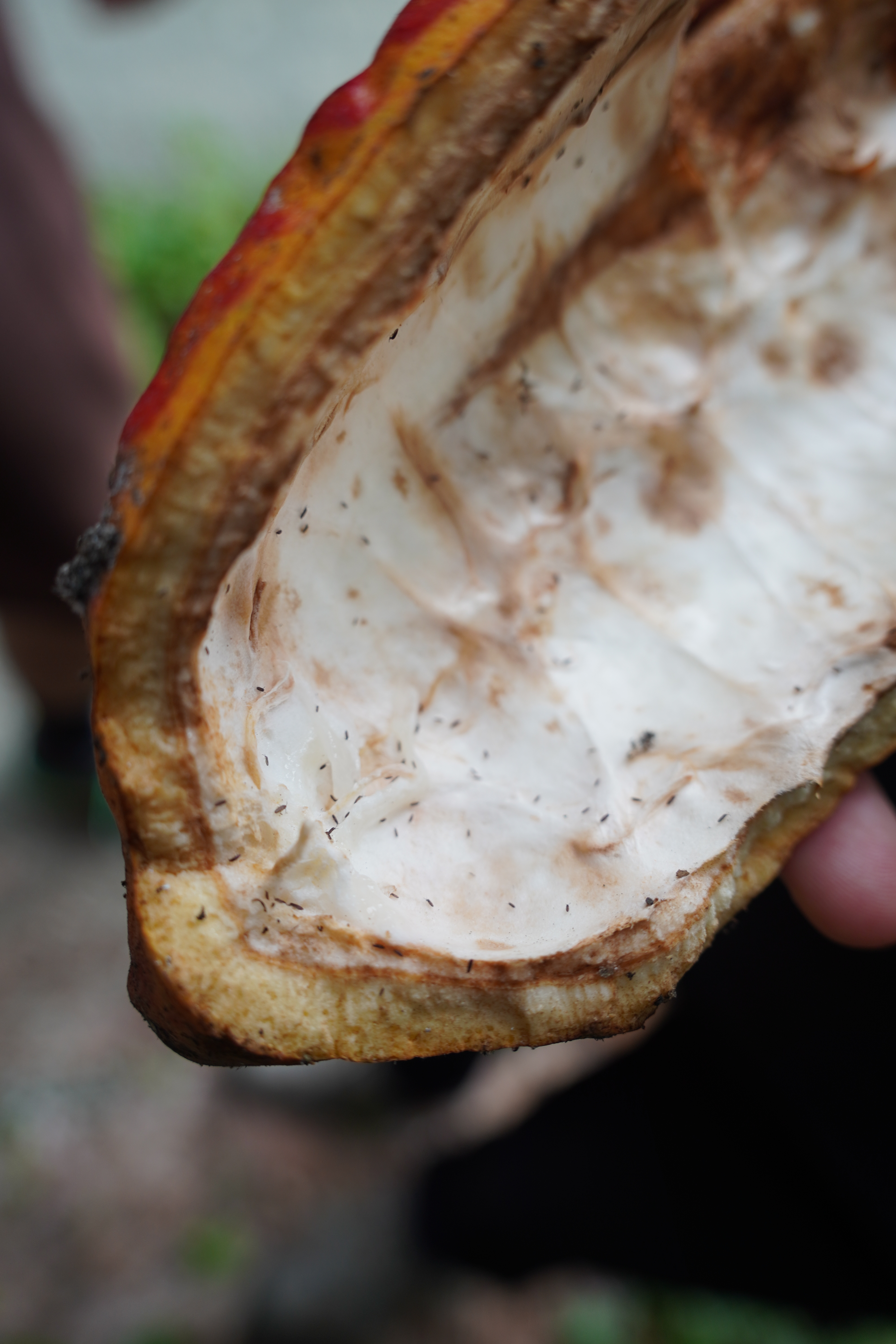 The landscape changed. We were in the jungle. Now we saw the first cocoa plants with their dark red pods. At Hacienda Cacao y Mango https://ecuadorfarmtours.com – we dried our damp hiking clothes and boots. Although only about 100 km separate the national park in the mountains from the cocoa farm, the climate here was completely different. It was warm and humid and perfect weather for mosquitoes. I had never had so many mosquito bites at once in my life. Yet. We couldn’t repair the roof yet, that had to wait until the next big city, Guayaquil. But at least it wasn’t raining anymore, and Rosi was dry. The next morning, we quickly had coffee to wake up, and then we were off. At 9 a.m., our private cocoa tour with Jamil started in English. It was immediately clear: Jamil loves his job. He has a passion for what he does and conveys it with every sentence about cocoa production. I can say in advance, the experience on the cocoa farm was one of the highlights of our trip. We went into the plantation and took a close look at the cocoa plants. The pods can be harvested all year round, every two weeks. If they are not picked, they just stay on the tree. We saw all stages of the fruit: a very beautiful small white fragile flower, pods in all sizes and colors, up to the fully matured fruit. The flowers are so tiny that only very small insects, mostly mosquitoes, can pollinate them. Pollination is very complex, and only 10% mature into fruit. Since this is an organic farm, no additional chemicals are used, as they would also harm the mosquitoes and insects. The leaves and fruits simply fall to the ground, serving as fertilizer and food for the insects. The cocoa is grown here in a mixed culture alongside bananas, mangoes, avocados, limes, coffee, vanilla (I have never seen such a beautiful flower before), pepper, palm trees, and many other plants. The advantage of this mixed culture is that there is more shade, fewer pests, better soil quality, and a higher pollination rate for the cocoa. We spent about an hour in the plantation and learned a lot. I was thrilled by all the plants and fruits. We picked four different cocoa pods, including two red and two yellow varieties, to compare them. The red pods are cultivated hybrids with more pulp. CCN-51 is a hybrid cocoa variety widely grown in Ecuador. It was bred in the 1960s and stands for Cacao Colección Castro Naranjal, Plant No. 51. It is very resilient, resistant, and yields a high harvest. However, compared to the yellow Nacional (Arriba) cocoa bean, it is rather bitter and of lower quality. After harvesting, the cocoa beans are removed from the pod and fermented with their pulp for several days. We had the unique pleasure of drinking juice from the pulp. It was delicious. We also tried red berries that made the taste of a lemon sweet. Afterwards, the beans are roasted, which we also did. The smell was indescribably good. Now, similar to peanuts, you can remove the shell, break the bean with your fingers, and obtain delicious cocoa nibs. Pure freshly roasted cocoa bean. However, we put our roasted beans into a kind of meat grinder and obtained 100% cocoa paste. This only needs to be mixed with at least one other ingredient, such as panela (sugarcane sugar), and you get chocolate. We ate ours with freshly picked mango and banana. Along with it, we drank hot cocoa. Although I am not a chocolate fan, I was in heaven. The chocolate and cocoa had a completely different taste than what you know from Germany. Many Ecuadorians drink cocoa in the morning instead of coffee. Cocoa contains theobromine, a mild stimulating substance. It also contains many antioxidants and stimulates serotonin production. After our chocolate breakfast, we made our own chocolate bars. Björn took salt, cranberries and cacao nibs, and I took coffee beans as a topping. We also bought a large bag full of cocoa nibs. Many Ecuadorians benefit from cocoa production. Due to poor harvests in Africa, the price has risen from 2 to 8 dollars per kilo. Unlike banana plantations, which are only cultivated by a few large companies, almost everyone here in the country grows cocoa and can harvest it. By the way, only the hybrid beans are exported; the good cocoa from the yellow cocoa beans stays in the country. Here, it is processed directly into chocolate bars and sold. From tree to bar. Or in our case: from tree to mouth.
