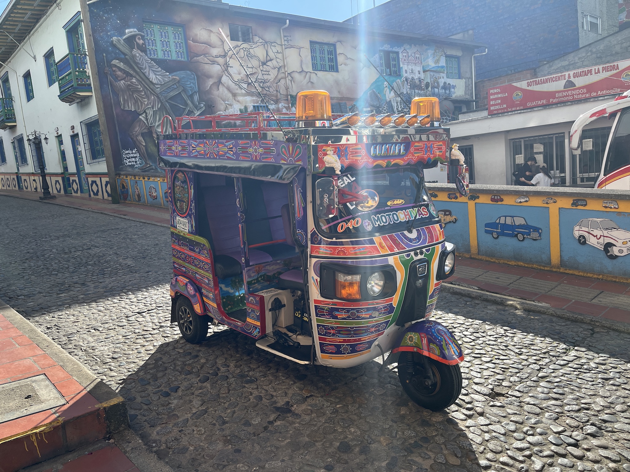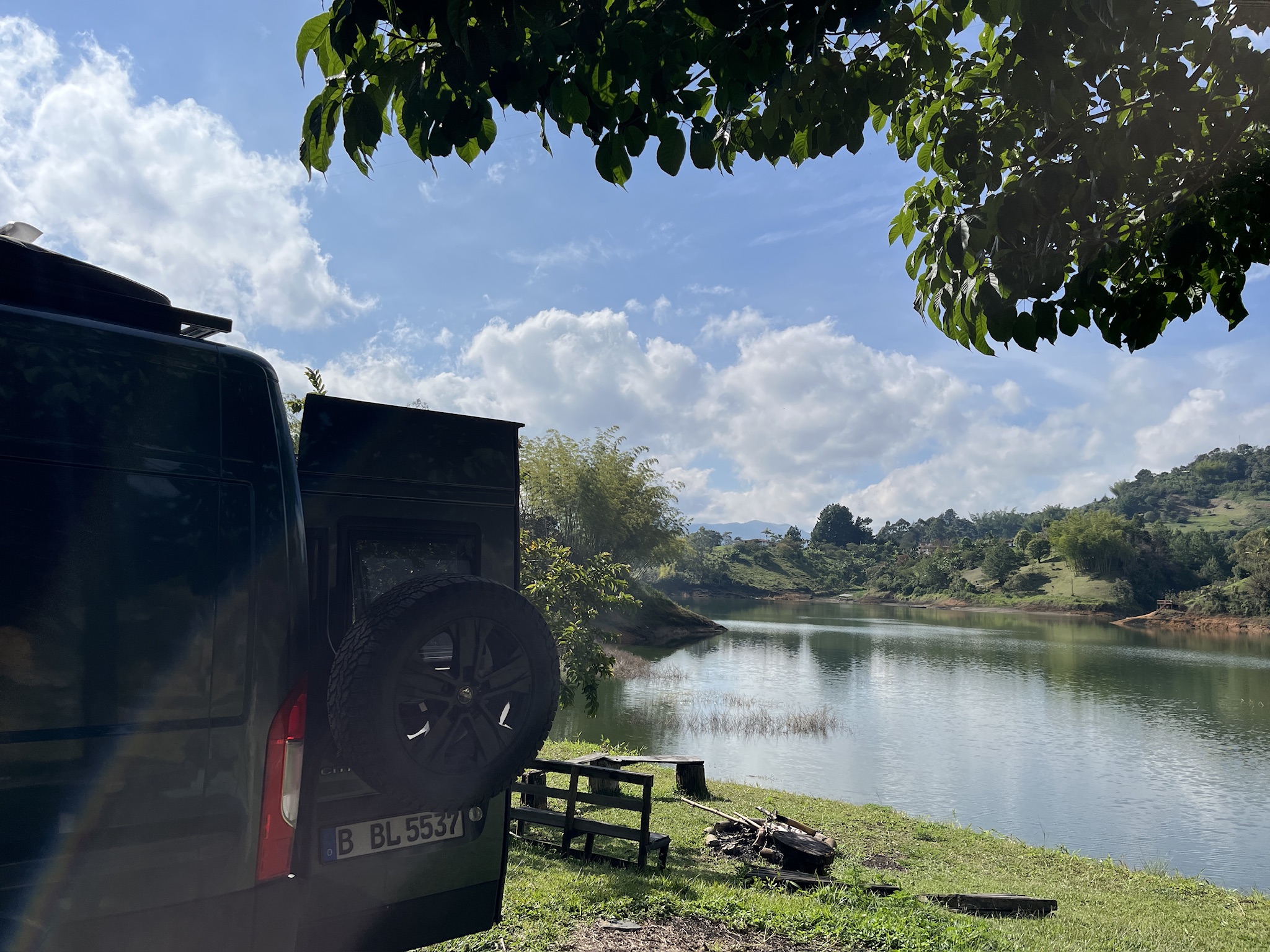 After the exhausting hike we visited together the colourful and beautiful little town of Guatape which is next to the Rock. Our passengers took a bus back to Medellin and we started to search a place to sleep. In iOverlander we found the Portus Hotel which was located right at the lake. The last few hundred meters were again extremely narrow and a challenge for Rosi, but we made it to the hotel and once agains….the complete area was empty. After I called, a friendly lady came, opened the gate and once again we had the full place for ourself. A big lawn next to the lake with an outdoor kitchen and seating area. The next morning I went for a refreshing dip in the lake before we took off in the direction of the Caribbean sea.