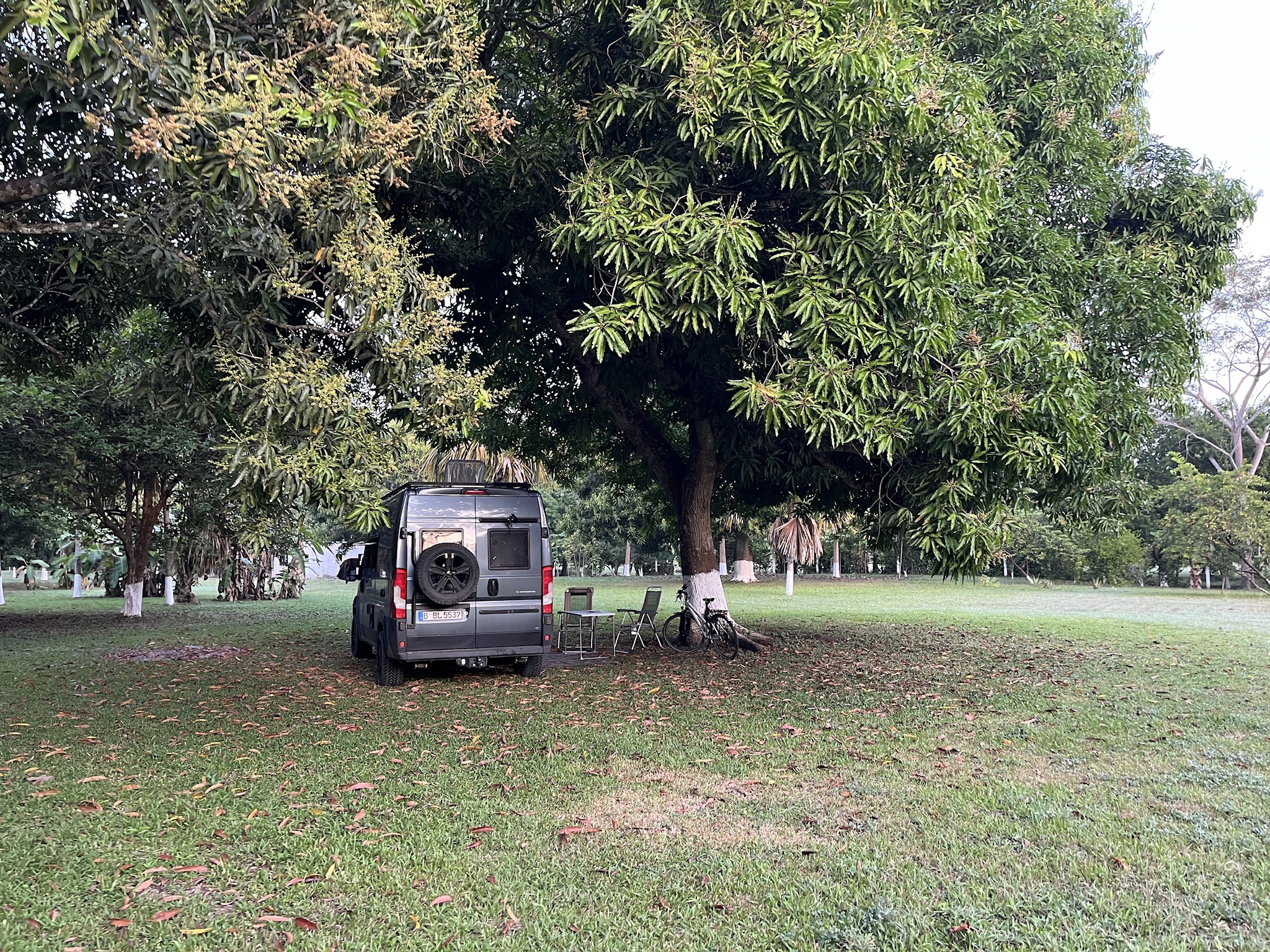 To reach Cartagena we decided to take a more eastern route from Medellin. In the beginning the street was a prefect highway but after a while we had to leave the highway and take a smaller road which was blocked by protesters. One of the locals told us how we could drive around the blockade and we ended up many kilometres on a tiny little dirt road but he was right and we managed to drive around the blockade. The night we spent at a gas station and after Linda broke by accident one the the glas plates that covers the sink in Rosi, we decided to eat dinner at the grill restaurant close by. The next day was Saturday and our agent has told us that we needed a document to be signed by a notary to be able to enter the harbour where Rosi will be loaded into a container. Once again we were fooled by the information on Google maps and after we had driven through two tiny villages and both times the notary offices were closed we continued towards the cost. On our full trip it happened very often that locations were not marked right on Google maps and opening times were not the right ones either. Linda had found a tiny little campground right next to the ocean and we parked the night there. It was an incredible feeling to be at the Carribean cost and swim in the warm water. We started the following morning with a great long breakfast and measured again the hight of Rosi….It was obvious that it would be close call to fit Rosi in the container, but we decided to not buy smaller wheels and would manage it somehow to get her in the container with releasing air from the current tires… Then we drove to a campground outside of Cartagena which was run by a friendly french guy and a very cute white cat, that spent a lot of time with us. It was a huge area and we prepared our suitcases and everything inside Rosi. The next day we found a notary office in Cartagena, got Rosi all nice and clean and organised some other things in the city.