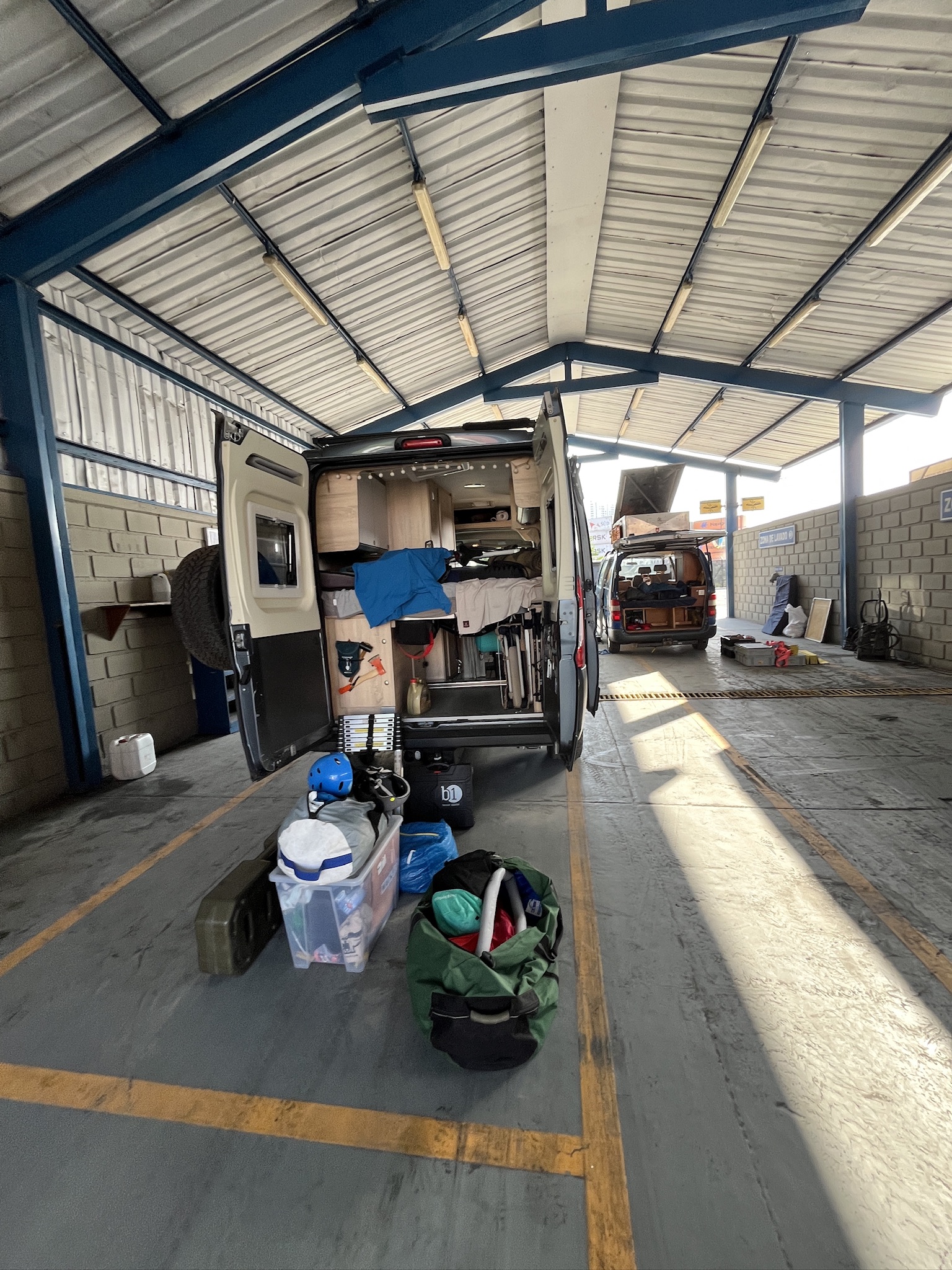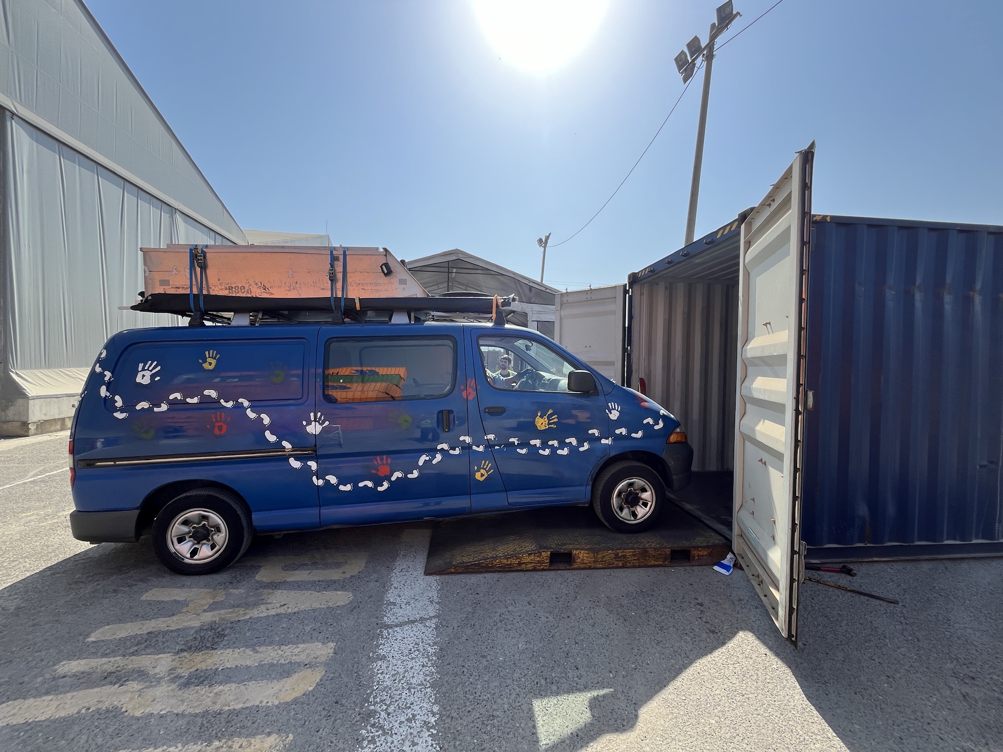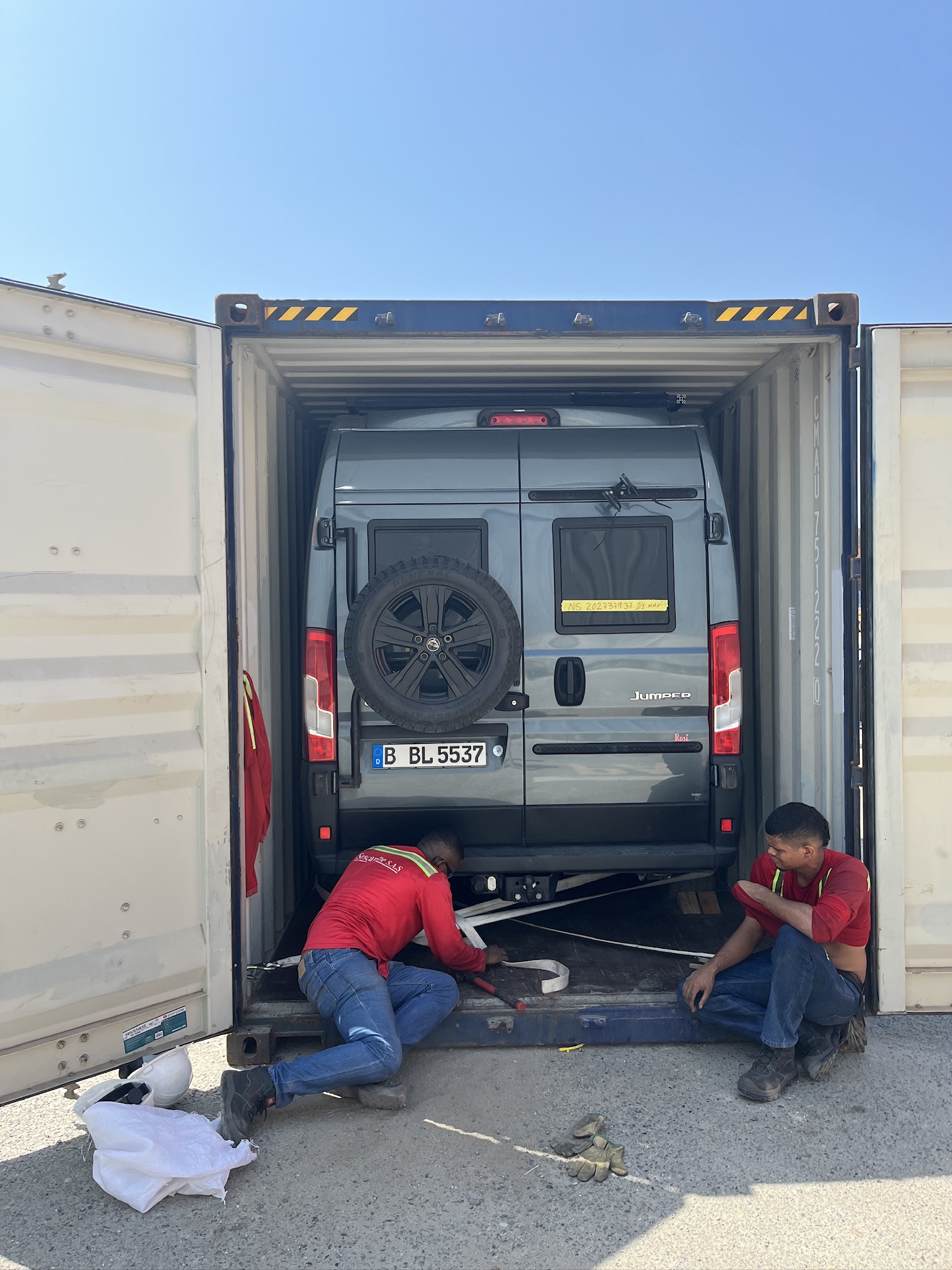 Another day later we were picked up to load the vans in a container on the harbour area where they were parked. First we had to pass drug control, which was a single police office without a dog that wanted to look in the majority (but not all) boxes of each of the vehicles. If we really would have planned to smuggle anything, these controls would have not been any problem at all. So we passed the “drug test” and than „just“ had to load the vans in the container. When we saw the container it seemed incredibly small. We both asked if it really is the bigger „high cube“ container, which was assured by the harbour workers. The van from the Swiss brothers was way smaller that Rosi, but had a huge roof box, which made it nearly as tall as our van. They drove in the Container first, and it fitted perfectly by one or two centimetres. At this point I became increasingly nervous and already started to let air out of the wheels of Rosi. When a harbour worker drove Rosi into the container veeeeryy slowly the first part barely fit in, but it worked out. The highest point were the two roof windows and the first one fit. But the second one became a problem. Rosi was a few centimetres too high. So we let out more air of the wheels and with four grown men standing on the rear fender of Rosi we managed to fit into the container. Inside it was not a problem, because the container is higher on the inside. Only the entrance to the container was the challenge. Two guys tied up the cars inside and climbed through the side window, and the rear doors of Rosi out of the container. I was covered in sweat, because of the temperature in the container and because I was scared that Rosi might not fit, but in the end she did fit and I was incredibly happy to see the sealed container in front of me.